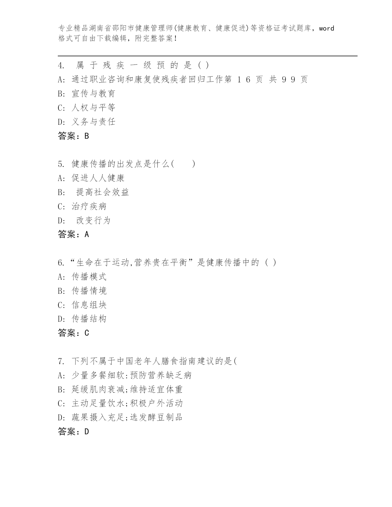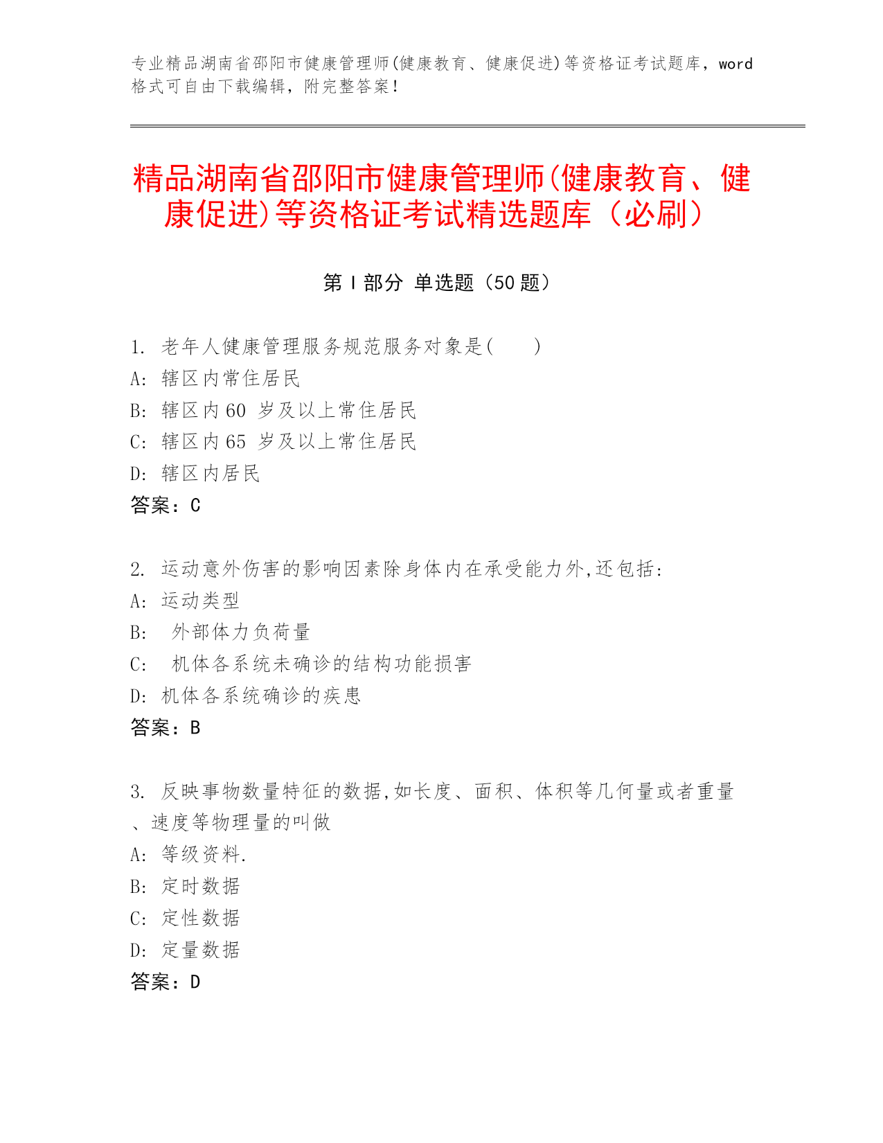 精品湖南省邵阳市健康管理师(健康教育、健康促进)等资格证考试精选题库(必刷).docx