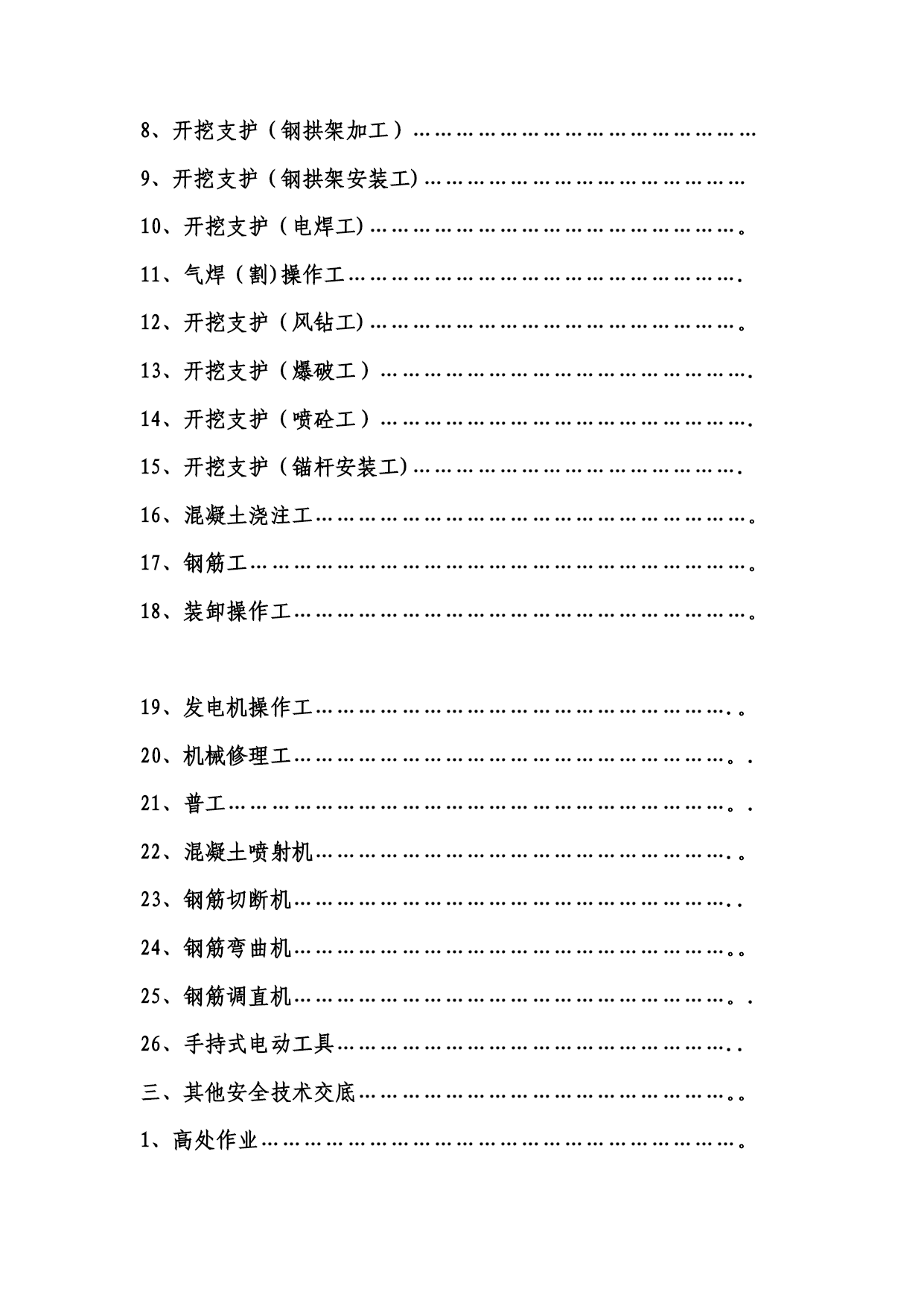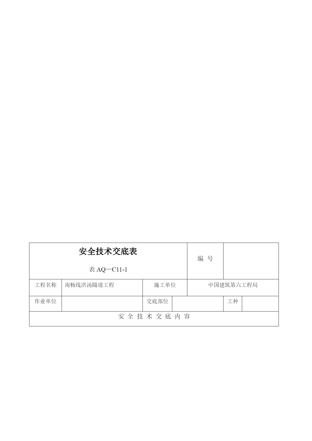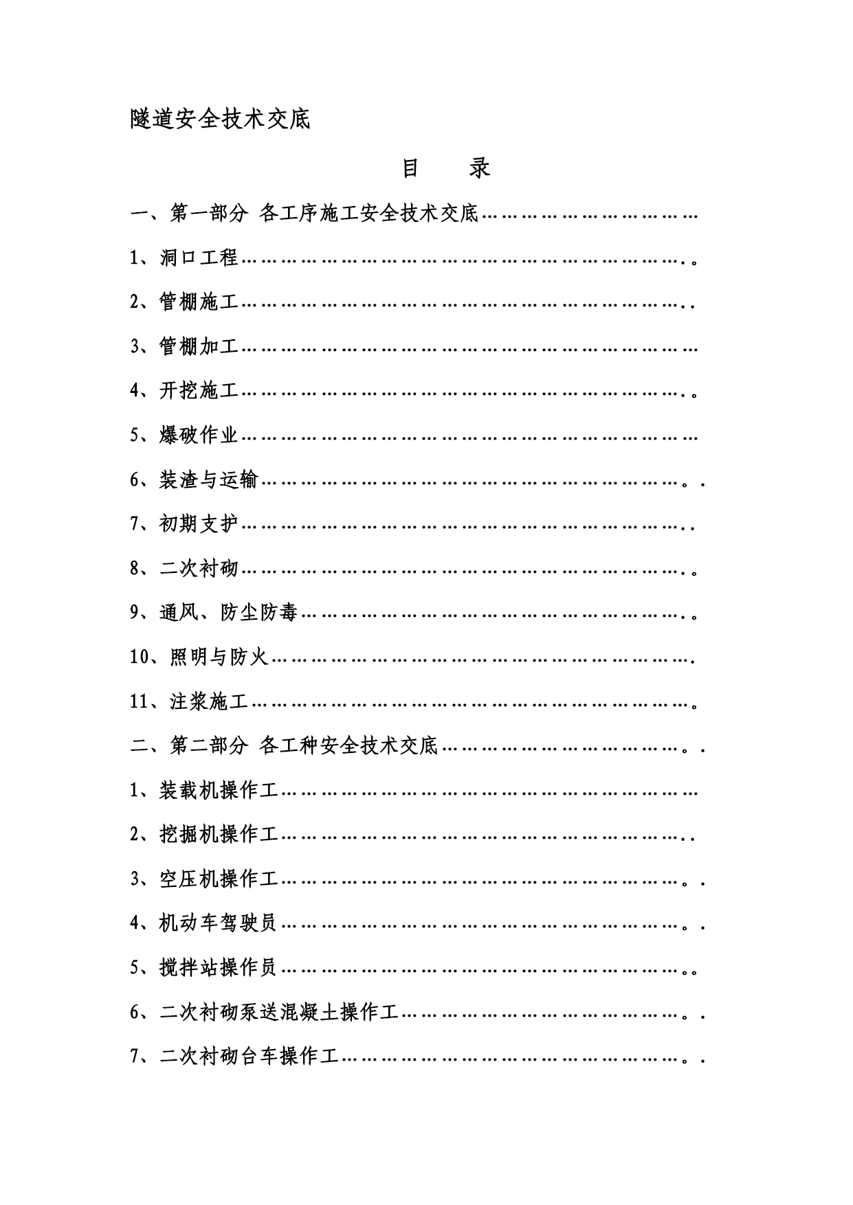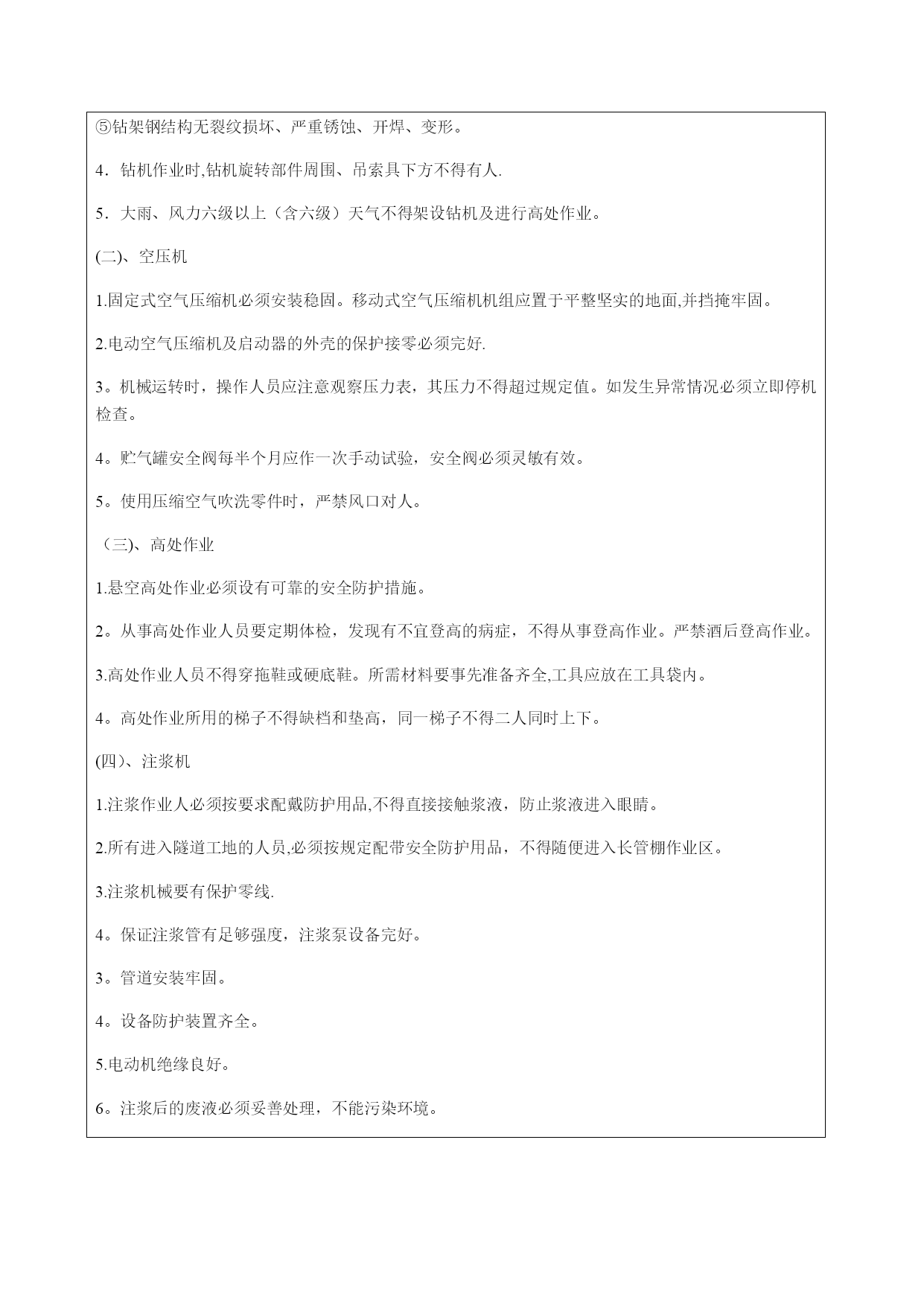 隧道施工安全技术交底实用文档(实用文档,可以直接使用,可编辑优秀版资料,欢迎下载)隧道安全技术交底目录一、第一部分各工序施工安全技术交底……………………………1、洞口工程………………………………………………………….。2、管棚施工…………………………………………………………..3、管棚加工……………………………………………………………4、开挖施工………………………………………………………….。5、爆破作业……………………………………………………………6、装渣与运输………………………………………………………。.7、初期支护…………………………………………………………..8、二次衬砌………………………………………………………….。9、通风、防尘防毒………………………………………………….。10、照明与防火……………………………………………………….11、注浆施工…………………………………………………………。二、第二部分各工种安全技术交底………………………………。.1、装载机操作工………………………………………………………2、挖掘机操作工……………………………………………………..3、空压机操作工……………………………………………………。.4、机动车驾驶员……………………………………………………。.5、搅拌站操作员……………………………………………………。。6、二次衬砌泵送混凝土操作工……………………………………。.7、二次衬砌台车操作工……………………………………………。.8、开挖支护(钢拱架加工)…………………………………………9、开挖支护(钢拱架安装工)………………………………………10、开挖支护(电焊工)……………………………………………。11、气焊(割)操作工……………………………………………….12、开挖支护(风钻工)……………………………………………。13、开挖支护(爆破工)…………………………………………….14、开挖支护(喷砼工)…………………………………………….15、开挖支护(锚杆安装工)……………………………………….16、混凝土浇注工……………………………………………………。17、钢筋工……………………………………………………………。18、装卸操作工………………………………………………………。19、发电机操作工………………………………………………….。20、机械修理工……………………………………………………。.21、普工……………………………………………………………。.22、混凝土喷射机………………………………………………….。23、钢筋切断机……………………………………………………..24、钢筋弯曲机……………………………………………………。。25、钢筋调直机……………………………………………………。.26、手持式电动工具………………………………………………..三、其他安全技术交底……………………………………………。。1、高处作业…………………………………………………………。2、不良地质与特殊岩土段施工……………………………………3、临时设施环水保…………………………………………………4、自然资源环水保…………………………………………………。5、隧道瓦斯监测…………………………………………………….6、隧道供电………………………………………………………….7、隧道供水…………………………………………………………。8、隧道施工综合安全交底…………………………………………安全技术交底表表AQ-C11-1编号工程名称南杨线洪汤隧道工程施工单位中国建筑第六工程局作业单位交底部位工种安全技术交底内容一、交底内容:1、洞口工程安全技术交底二、安全内容:1、洞口工程施工应符合下列规定:(1)洞口的路基及边、仰坡断面应自上而下开挖,一次将土石方工程做完,开挖人员不得上下重叠作业。(2)边、仰坡以上山坡松动危石应在开挖前清除干净;施工中应经常检查,发现松动危石必须立即清除。2、爆破后应在清除边仰坡上的松动石块后,方可继续施工。地质不良时,边、仰坡应采取加固措施。3、隧道门及端墙施工应符合下列规定:(1)砌体工程脚手架、工作平台应搭设牢固,并设有扶手、栏杆。脚手架不得防碍车辆通行。(2)起拱线以上的端墙施工时应设安全网,防止人员、工具和材料坠落.(3)起吊材料时机下严禁车辆和人员通行。针对性交底:交底人姓名职务交底时间接受交底人负责人职务接受交底时间接受交底人签名安全技术交底表表AQ—C11-1编号工程名称南杨线洪汤隧道工程施工单位中国建筑第六工程局作业单位交底部位工种安全技术