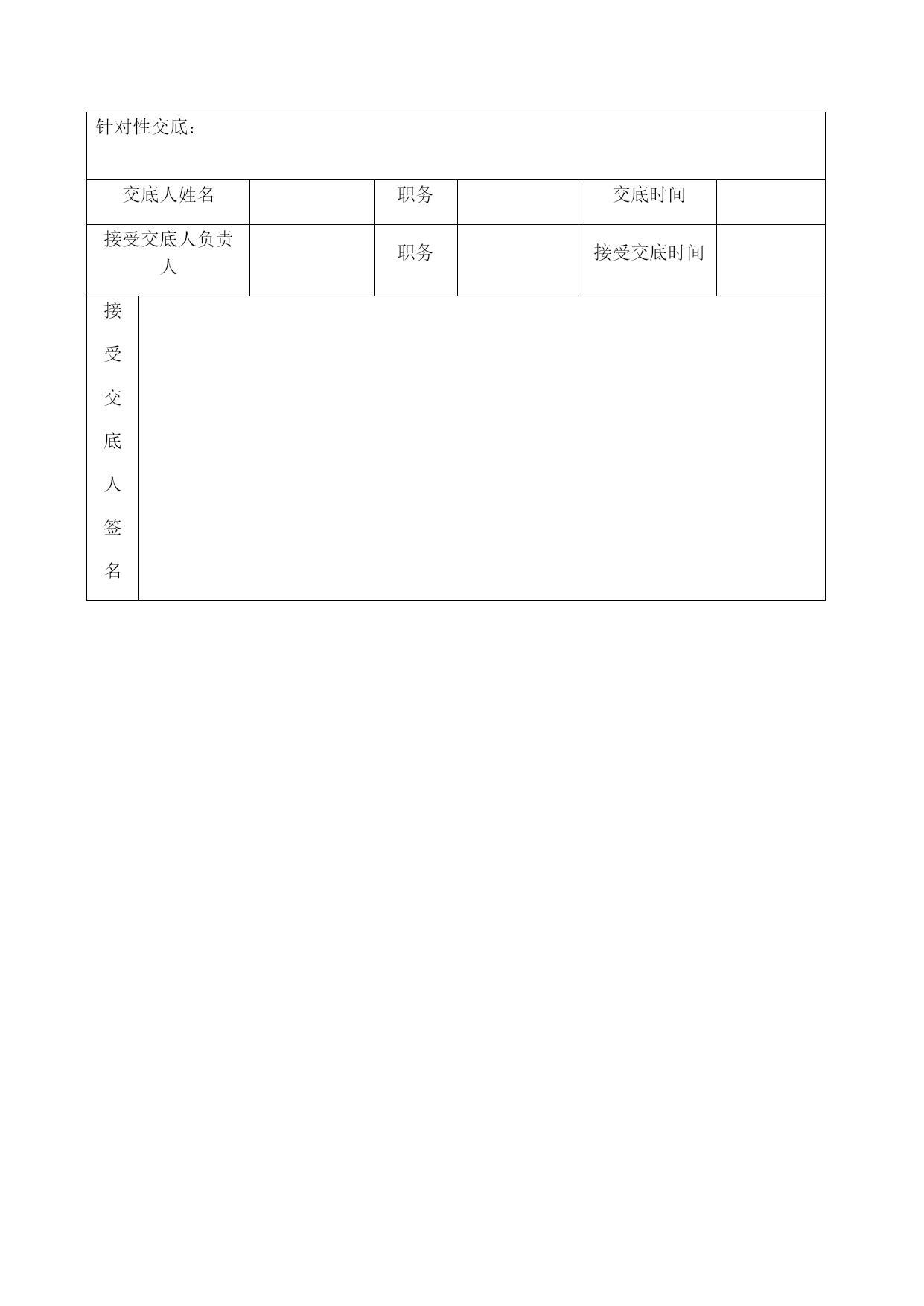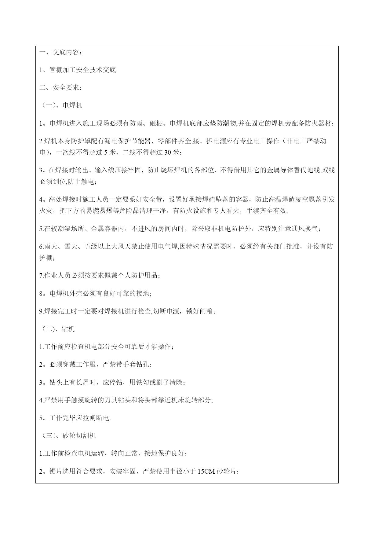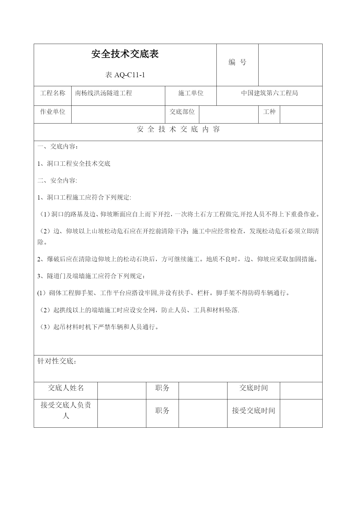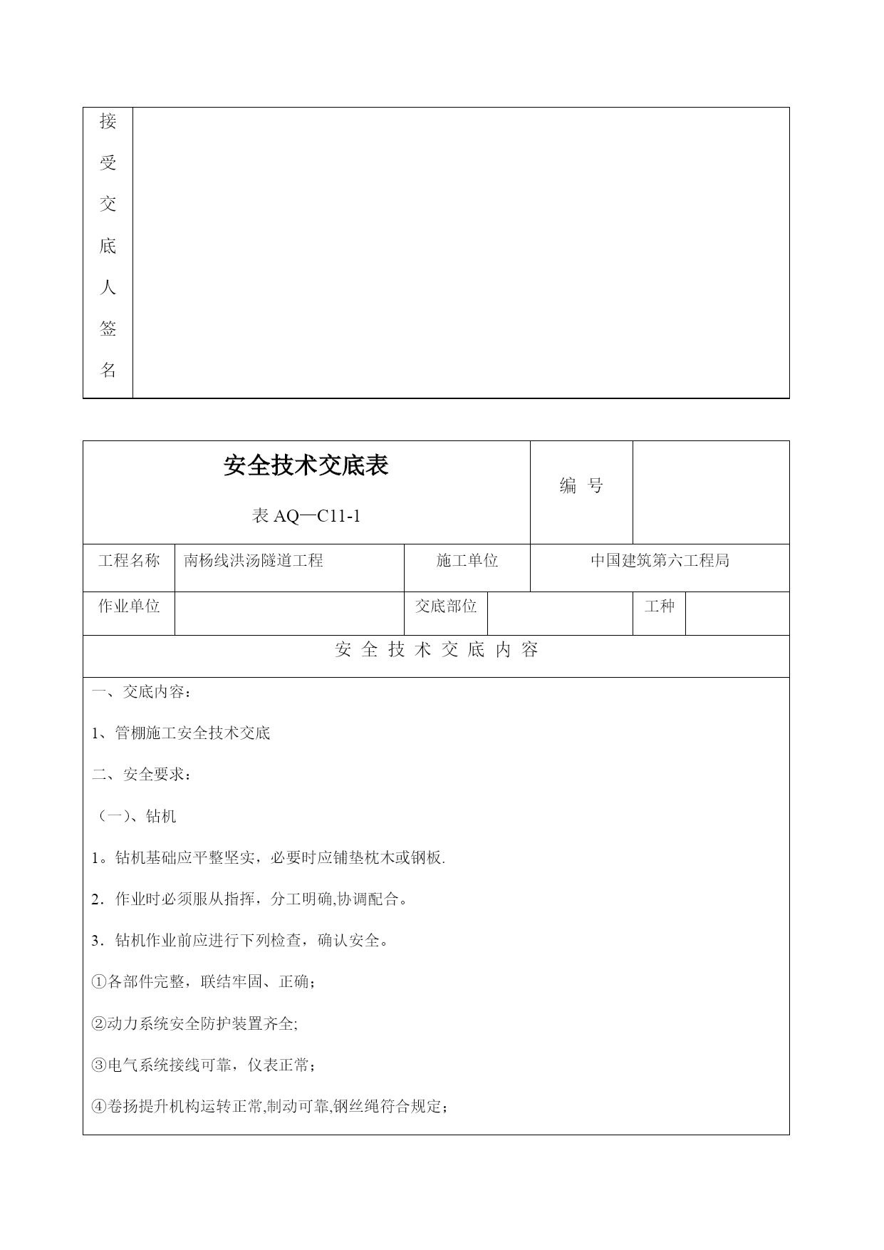 隧道施工安全技术交底实用文档(实用文档,可以直接使用,可编辑优秀版资料,欢迎下载)隧道安全技术交底目录一、第一部分各工序施工安全技术交底……………………………1、洞口工程………………………………………………………….。2、管棚施工…………………………………………………………..3、管棚加工……………………………………………………………4、开挖施工………………………………………………………….。5、爆破作业……………………………………………………………6、装渣与运输………………………………………………………。.7、初期支护…………………………………………………………..8、二次衬砌………………………………………………………….。9、通风、防尘防毒………………………………………………….。10、照明与防火……………………………………………………….11、注浆施工…………………………………………………………。二、第二部分各工种安全技术交底………………………………。.1、装载机操作工………………………………………………………2、挖掘机操作工……………………………………………………..3、空压机操作工……………………………………………………。.4、机动车驾驶员……………………………………………………。.5、搅拌站操作员……………………………………………………。。6、二次衬砌泵送混凝土操作工……………………………………。.7、二次衬砌台车操作工……………………………………………。.8、开挖支护(钢拱架加工)…………………………………………9、开挖支护(钢拱架安装工)………………………………………10、开挖支护(电焊工)……………………………………………。11、气焊(割)操作工……………………………………………….12、开挖支护(风钻工)……………………………………………。13、开挖支护(爆破工)…………………………………………….14、开挖支护(喷砼工)…………………………………………….15、开挖支护(锚杆安装工)……………………………………….16、混凝土浇注工……………………………………………………。17、钢筋工……………………………………………………………。18、装卸操作工………………………………………………………。19、发电机操作工………………………………………………….。20、机械修理工……………………………………………………。.21、普工……………………………………………………………。.22、混凝土喷射机………………………………………………….。23、钢筋切断机……………………………………………………..24、钢筋弯曲机……………………………………………………。。25、钢筋调直机……………………………………………………。.26、手持式电动工具………………………………………………..三、其他安全技术交底……………………………………………。。1、高处作业…………………………………………………………。2、不良地质与特殊岩土段施工……………………………………3、临时设施环水保…………………………………………………4、自然资源环水保…………………………………………………。5、隧道瓦斯监测…………………………………………………….6、隧道供电………………………………………………………….7、隧道供水…………………………………………………………。8、隧道施工综合安全交底…………………………………………安全技术交底表表AQ-C11-1编号工程名称南杨线洪汤隧道工程施工单位中国建筑第六工程局作业单位交底部位工种安全技术交底内容一、交底内容:1、洞口工程安全技术交底二、安全内容:1、洞口工程施工应符合下列规定:(1)洞口的路基及边、仰坡断面应自上而下开挖,一次将土石方工程做完,开挖人员不得上下重叠作业。(2)边、仰坡以上山坡松动危石应在开挖前清除干净;施工中应经常检查,发现松动危石必须立即清除。2、爆破后应在清除边仰坡上的松动石块后,方可继续施工。地质不良时,边、仰坡应采取加固措施。3、隧道门及端墙施工应符合下列规定:(1)砌体工程脚手架、工作平台应搭设牢固,并设有扶手、栏杆。脚手架不得防碍车辆通行。(2)起拱线以上的端墙施工时应设安全网,防止人员、工具和材料坠落.(3)起吊材料时机下严禁车辆和人员通行。针对性交底:交底人姓名职务交底时间接受交底人负责人职务接受交底时间接受交底人签名安全技术交底表表AQ—C11-1编号工程名称南杨线洪汤隧道工程施工单位中国建筑第六工程局作业单位交底部位工种安全技术