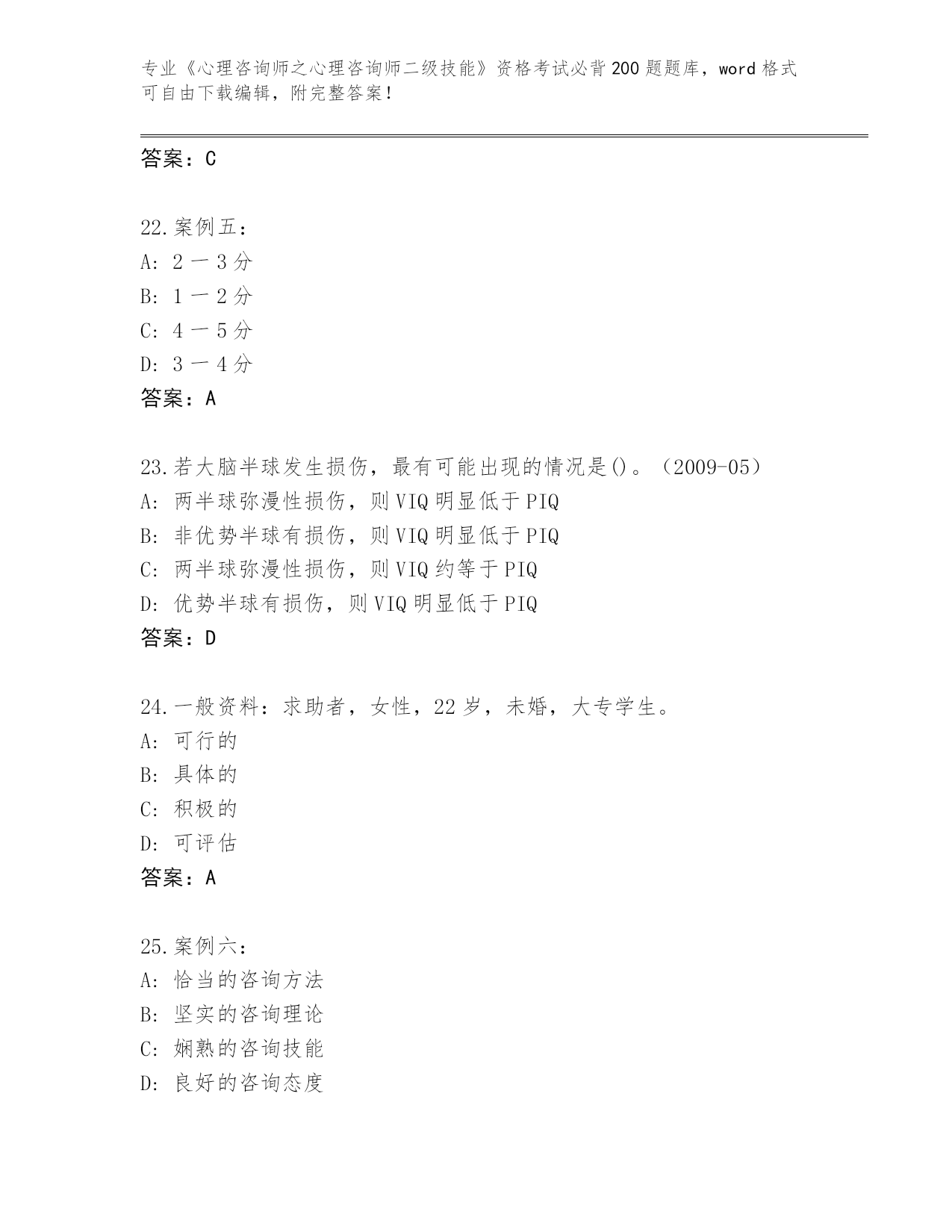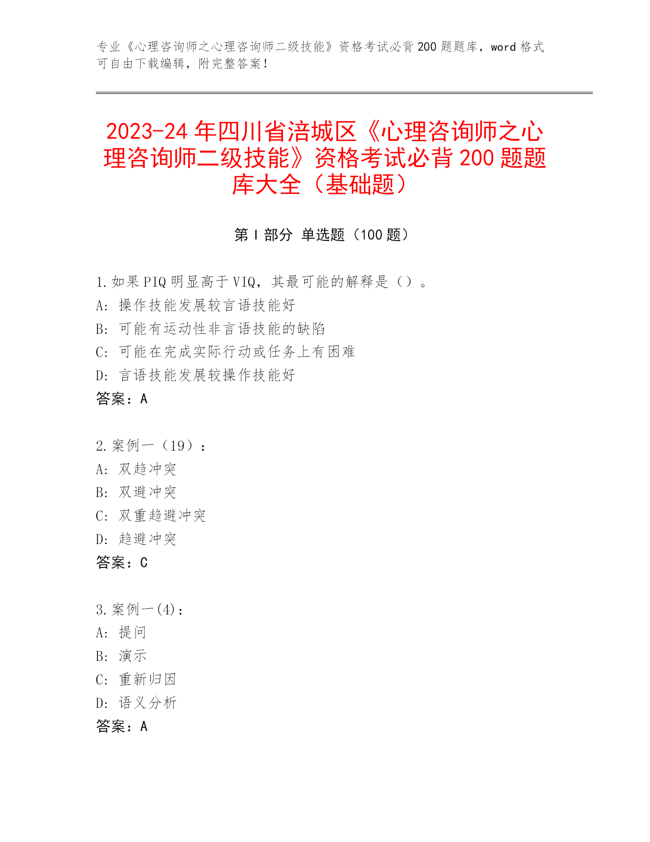 2023-24年四川省涪城区《心理咨询师之心理咨询师二级技能》资格考试必背200题题库大全(基础题)