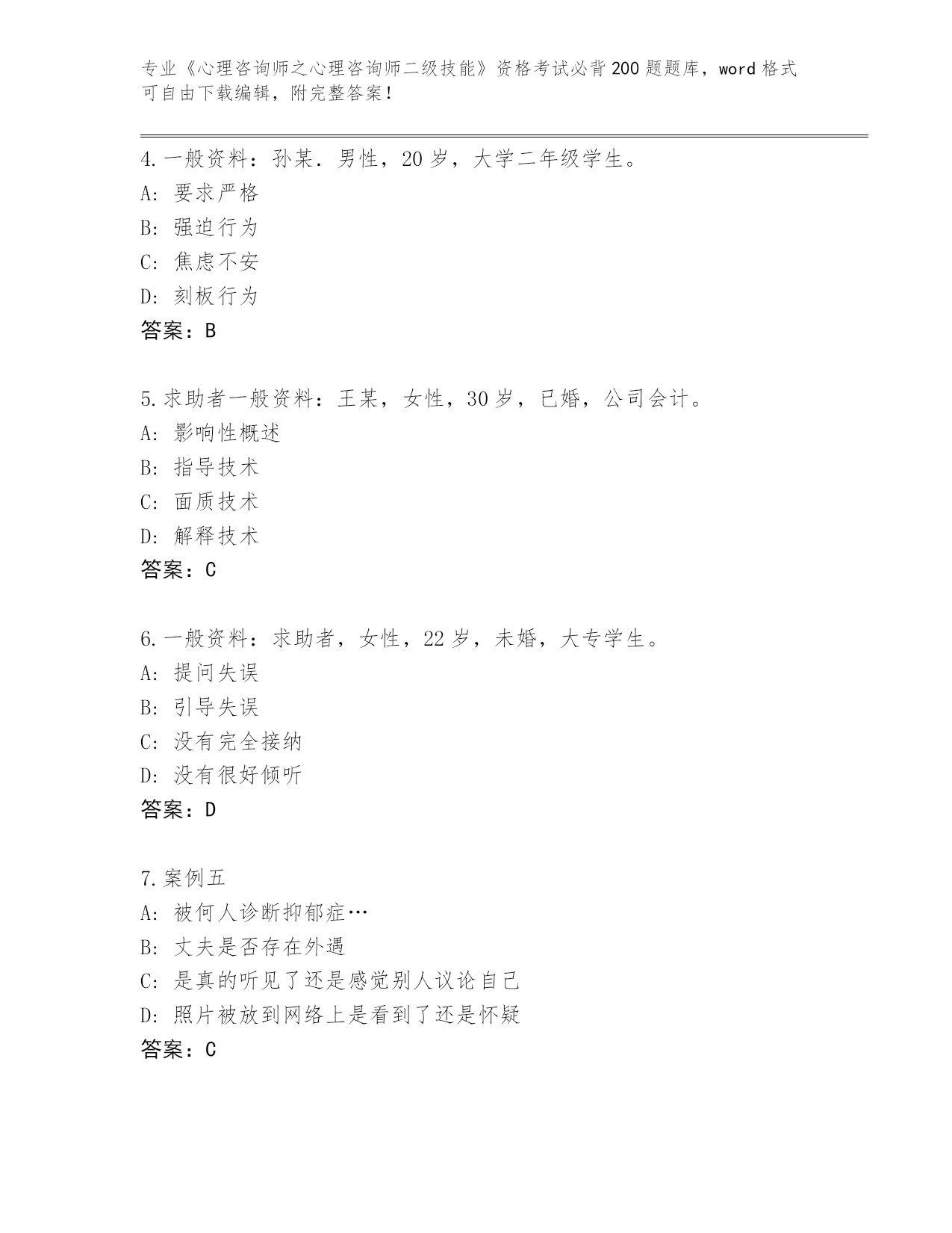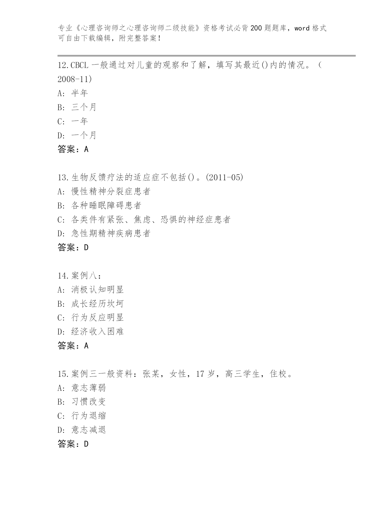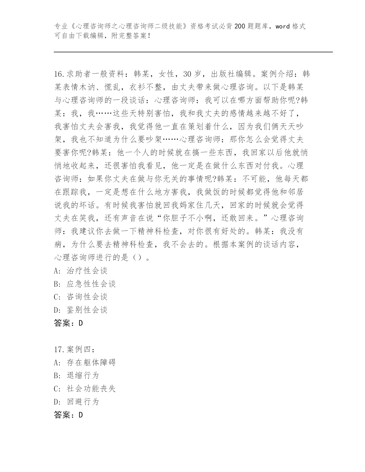 四川省涪城区《心理咨询师之心理咨询师二级技能》资格考试必背200题真题题库及答案(基础+提升)