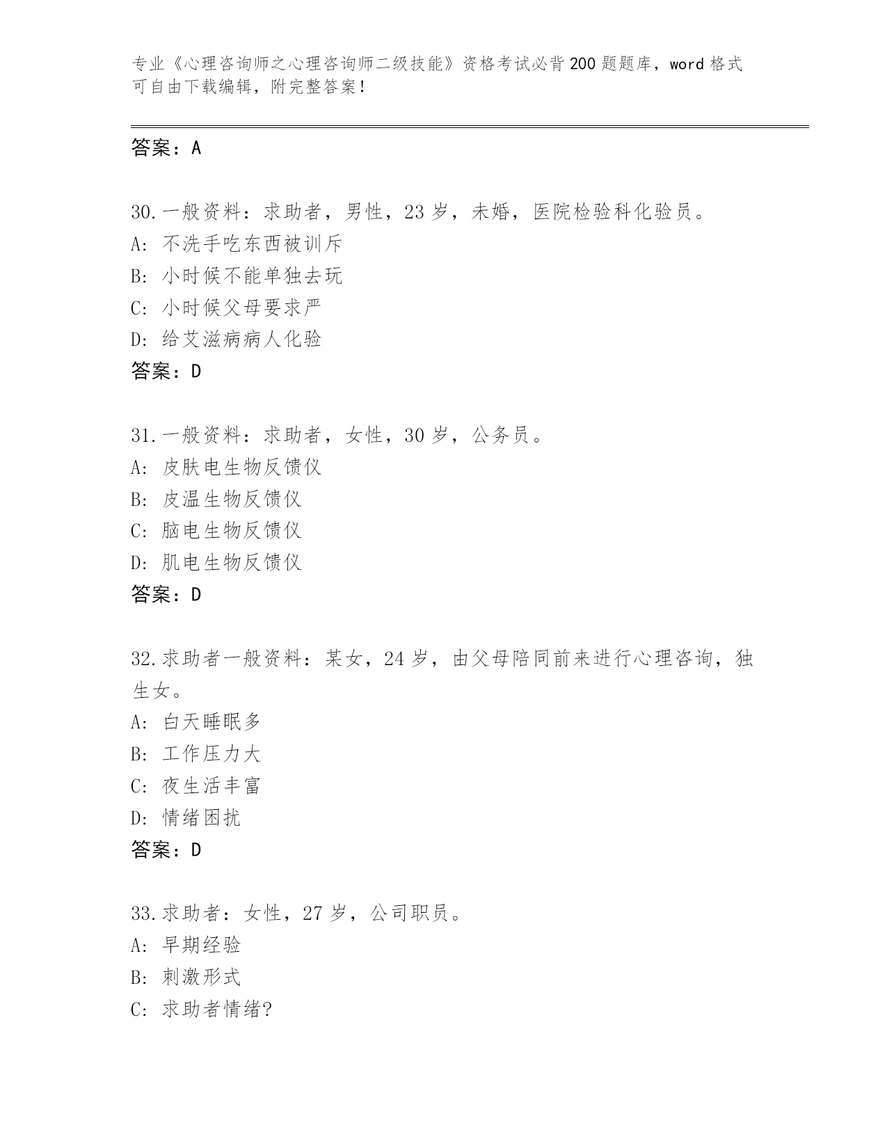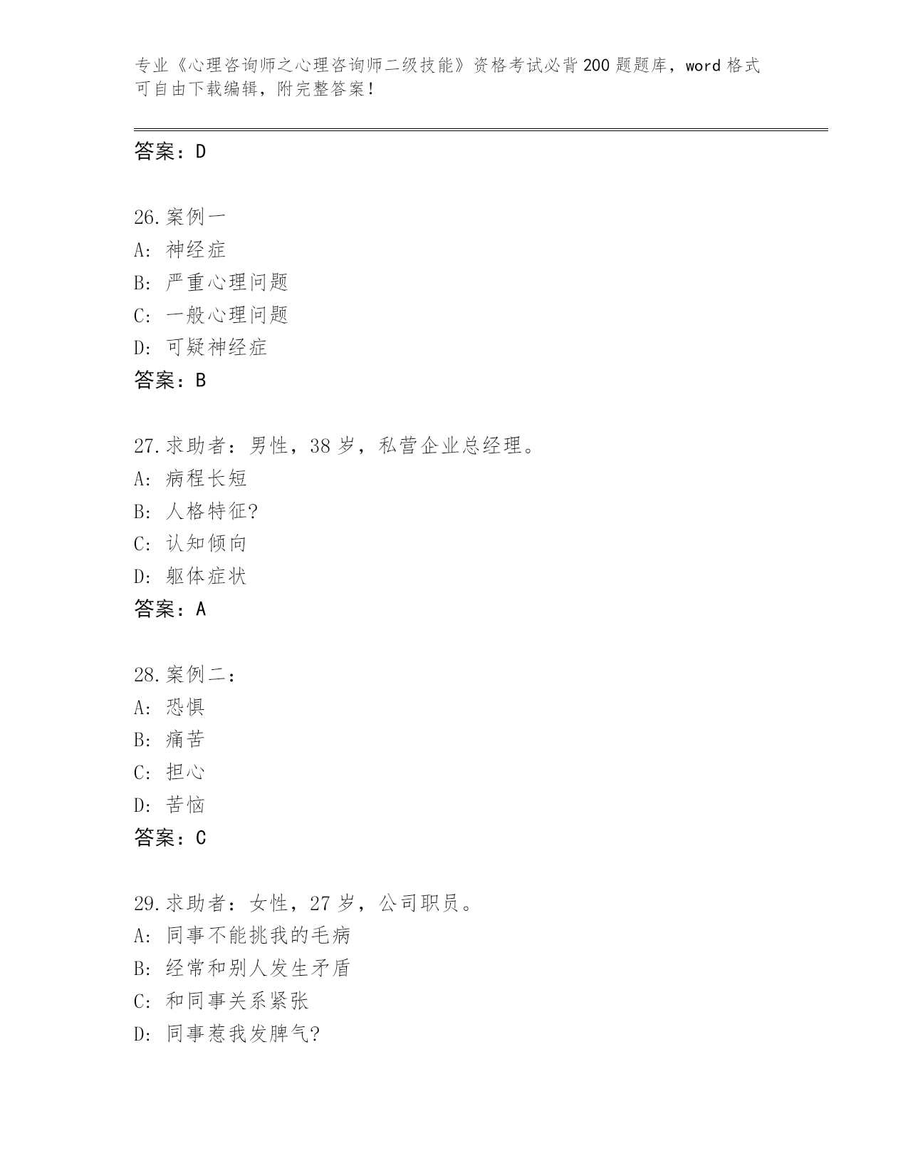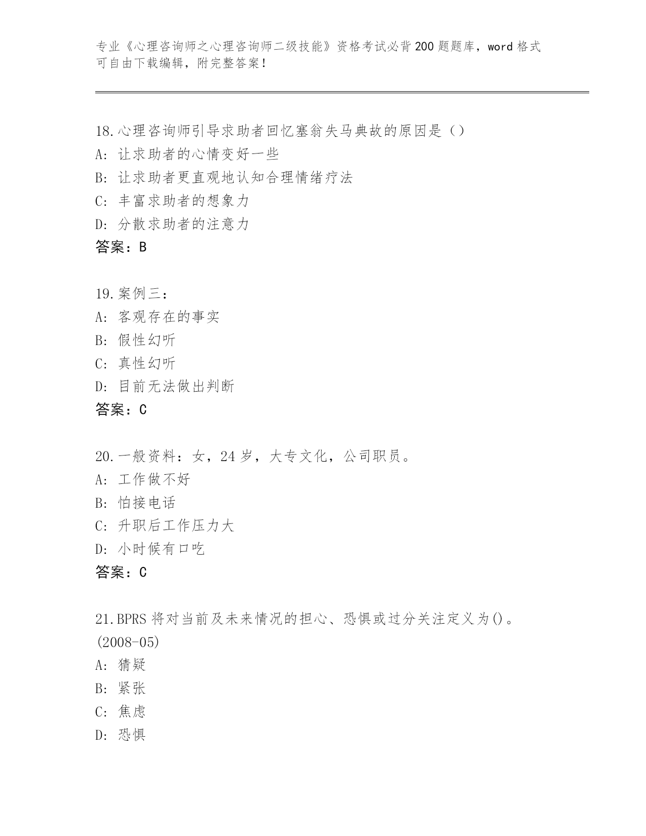 四川省涪城区《心理咨询师之心理咨询师二级技能》资格考试必背200题真题题库及答案(基础+提升)