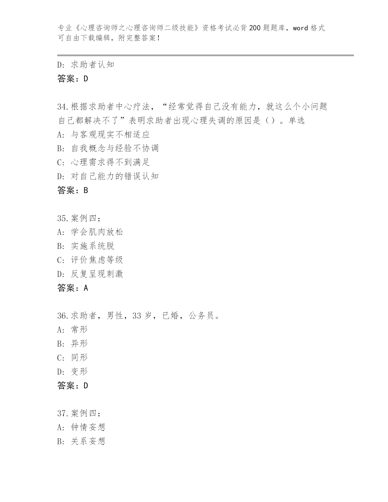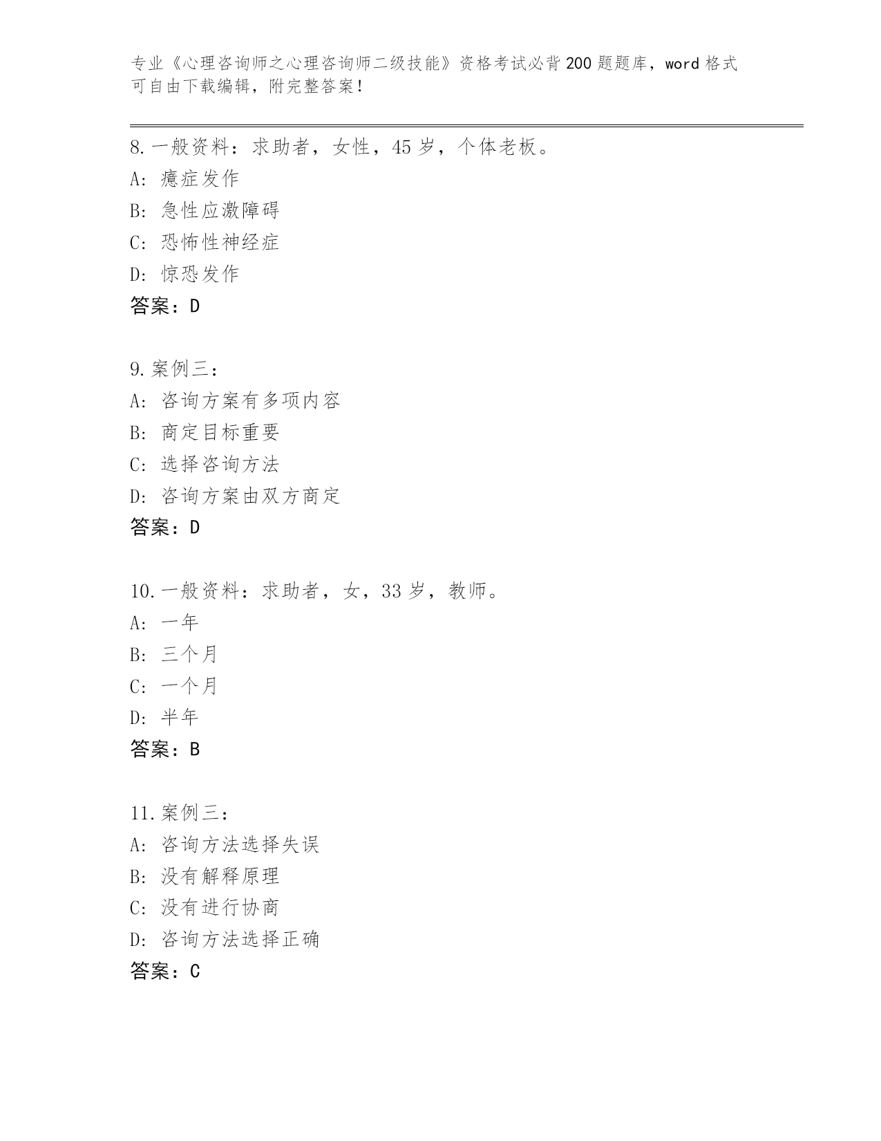 四川省涪城区2024年《心理咨询师之心理咨询师二级技能》资格考试必背200题及答案(网校专用)