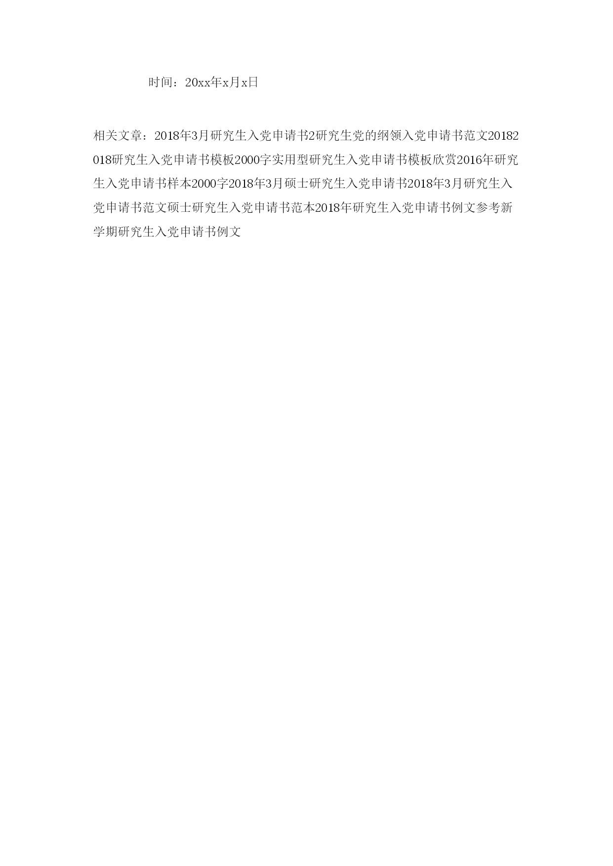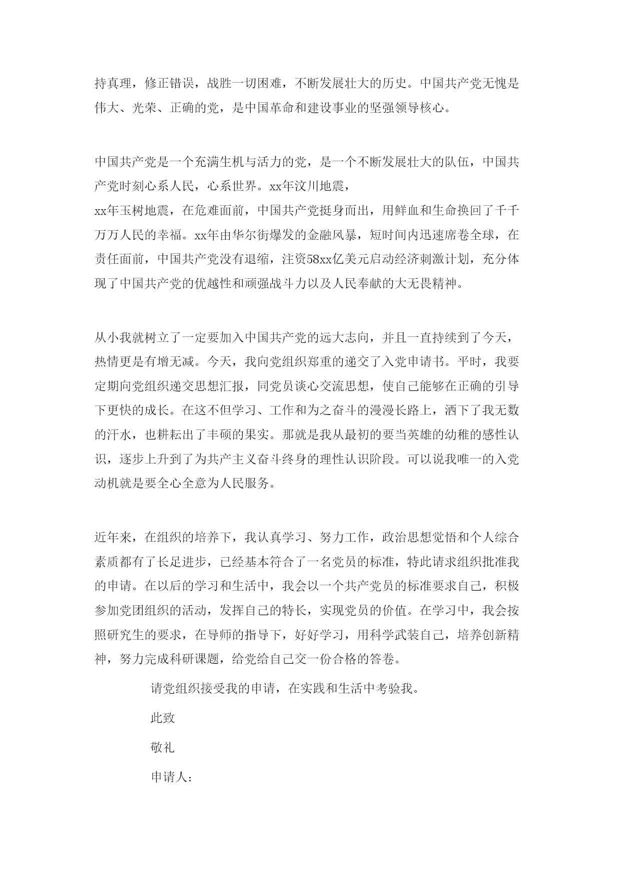 20XX年研究生入党申请书800字在学识上,研究生比大部分人更胜一筹,但是大家千万不可以就此停下进步的脚步哦!入党是大家追求思想进步的一种方式,下文为大家介绍研究生入党申请书800字,让我们一起来看看具体内容吧!敬爱的党组织:您好!我是一名医学院研究生,现读二年级,我志愿加入中国共产党,拥护党的纲领,遵守党的章程,履行党员义务,执行党的决定,严守党的纪律,保守党的秘密,对党忠诚,积极工作,为共产主义奋斗终身,随时准备为党和人民牺牲一切,永不叛党。中国共产党是中国工人阶级的先锋队,是中国各族人民利益的忠实代表,是中国社会主义事业的领导核心。党的最终目标是实现共产主义的社会制度。中国共产党以马列主义、毛泽东思想、邓小平理论作为自己的行动指南。自1921年建党至今,我们的党已经走过了近xx年光荣的斗争道路。这xx年,中国共产党从小到大、从弱到强、从幼稚到成熟,不断发展壮大。从建党之初的50多名党员,逐步发展到今天这一个拥有xx千万党员的执政党。并在长期的革命过程中,先后形成了分别以毛泽东、邓小平、xx为核心的三代党中央领导集体。正如江总书记所说:“党领导全国各族人民为中国社会主义进步和发展做了三件大事:第一件是完成了反帝反封建的新民主主义革命任务,结束了中国半封建、半殖民地的历史;第二件是消灭了剥削制度和剥削阶级,确立了社会主义制度;第三件是开辟建设有中国特色的社会主义道路,逐步实现社会主义现代化,这件大事现在继续在做。”党的辉煌历史,是中国共产党为民族解放和人民幸福,前赴后继,英勇奋斗的历史;是马克思主义普遍原理同中国革命和建设的具体实践相结合的历史;是坚持真理,修正错误,战胜一切困难,不断发展壮大的历史。中国共产党无愧是伟大、光荣、正确的党,是中国革命和建设事业的坚强领导核心。中国共产党是一个充满生机与活力的党,是一个不断发展壮大的队伍,中国共产党时刻心系人民,心系世界。xx年汶川地震,xx年玉树地震,在危难面前,中国共产党挺身而出,用鲜血和生命换回了千千万万人民的幸福。xx年由华尔街爆发的金融风暴,短时间内迅速席卷全球,在责任面前,中国共产党没有退缩,注资58xx亿美元启动经济刺激计划,充分体现了中国共产党的优越性和顽强战斗力以及人民奉献的大无畏精神。从小我就树立了一定要加入中国共产党的远大志向,并且一直持续到了今天,热情更是有增无减。今天,我向党组织郑重的递交了入党申请书。平时,我要定期向党组织递交思想汇报,同党员谈心交流思想,使自己能够在正确的引导下更快的成长。在这不但学习、工作和为之奋斗的漫漫长路上,洒下了我无数的汗水,也耕耘出了丰硕的果实。那就是我从最初的要当英雄的幼稚的感性认识,逐步上升到了为共产主义奋斗终身的理性认识阶段。可以说我唯一的入党动机就是要全心全意为人民服务。近年来,在组织的培养下,我认真学习、努力工作,政治思想觉悟和个人综合素质都有了长足进步,已经基本符合了一名党员的标准,特此请求组织批准我的申请。在以后的学习和生活中,我会以一个共产党员的标准要求自己,积极参加党团组织的活动,发挥自己的特长,实现党员的价值。在学习中,我会按照研究生的要求,在导师的指导下,好好学习,用科学武装自己,培养创新精神,努力完成科研课题,给党给自己交一份合格的答卷。请党组织接受我的申请,在实践和生活中考验我。此致敬礼申请人:时间:20xx年x月x日相关文章:2018年3月研究生入党申请书2研究生党的纲领入党申请书范文20182018研究生入党申请书模板2000字实用型研究生入党申请书模板欣赏2016年研究生入党申请书样本2000字2018年3月硕士研究生入党申请书2018年3月研究生入党申请书范文硕士研究生入党申请书范本2018年研究生入党申请书例文参考新学期研究生入党申请书例文