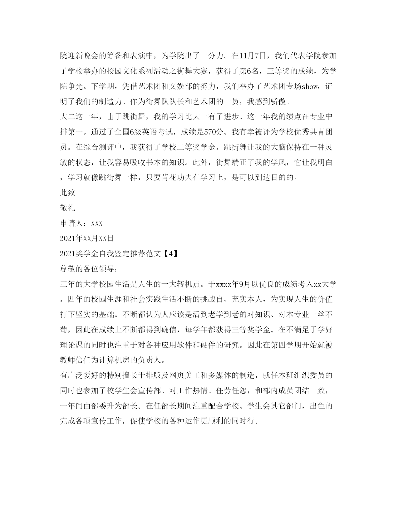 2021奖学金自我鉴定参考推荐范文2021奖学金自我鉴定推荐范文【1】籍贯在贵州省遵义县永乐镇花台村高坎组14号一个偏僻的小山村里。家里共计四口人,哥哥就读于陕西科技学院。做事先做人,人不立,事不成。在我大学生活中,我不断用一颗真诚的心,换来教师和同学的信任。两年来,我遇到过不到困难,受过不少挫折,尽管如此,我们不断都乐观向上,不为眼前的困难所吓倒,相信我们的今后一定会特别美妙!在教师的协助下,我学到了许多东西,也成长了许多。感谢教师以及我的同学不断以来对我在生活上的关心与照顾。我不断以一个积极乐观、坚强自立、自强奋进、热心奉献的精神状态生活着,不断以一个关心社会、参与公益、效劳同学的大学生的标准要求本人,不断以一个严于律己、高度负责、勤俭朴素、艰辛奋斗的标准来要求本人。“自强不息,奋斗不止”,现将我在近两年来的大学思想。学习。生活。品行。情况以及获得的成绩汇报如下:文大二,短短的一年,却经历了特别多特别多。曾试着改变也曾迷茫的找不到了自我。不能说我走的特别好,但我想说我走的难忘。这难忘里包含着付出,包含着艰辛,包含着思索,包含着信念,包含着奉献,包含着报答,包含的特别多特别多。鲁迅先生曾说过:时间就像海绵里的水,只要愿意挤总是会有的。关于学习我想说确实实是这句话。而且还有一句话确实是:我总是把别人喝咖啡的时间用来学习,而应该属于我课外学习的时间我却用来自立了。因此整个大二走过来我感受特别累,但也特别充实。不过我给本人定的目的并没有完全实现,欣慰的同时也有点遗憾。现在我又为本人定了新的目的,我会用努力来实现它!通过了党组织对我的考验,在大二第二个学期里我特别荣幸的成为一名预备党员,这关于我是一件特别有人生意义的事情。入党不断以来是我的一个人生目的,总希望本人能早日成为一名党员。入党一方面是对我确实信,另一方面也让我更明晰地认识了本人。在今后我会用一名党员的标准来要求本人,关心四周的同学。班集体的活动我都要求本人积极地参加,不断以来我都是一个集体荣誉感特别强的人。可能与南北文化差异有关,有时候我不能特别好地融入到同学们之中,但我也在不断在努力地尝试着融入。现在和同学们的关系也好了特别多,我比往常更欢乐了。大二,我一步一个脚印地走过来了,每个脚印都踩的特别深特别深。尽管满身的疲惫,但回望走过的路,我仍然心胸着欢乐本人近一年以来,热爱祖国,关心国家大事,拥护党的各项方针政策,认真学习“三个代表”重要思想,遵守校纪校规,严于律己,宽以待人,尊敬师长,团结同学,热爱集体,平易近人。积极参与学校及社会的各项活动,努力培养本身的创新精神与实践才能。对本专业充满热情,学习勤奋,谦虚请教,成绩优良。缺乏是参与体育锻炼不够积极,学习成绩需进一步提高。我不断以提高本身的综合素养为目的,以自我的全面开展为努力方向。今后我一定发扬成绩,克服缺乏,逐步提高学习才能和分析处理征询题的才能,加强与别人的合作精神,培养协调组织和治理才能,争取获得更大进步,顺利迎接新的挑战,成为适应社会的新时代高素养人才。此致敬礼申请人:XXX2021年XX月XX日2021奖学金自我鉴定推荐范文【2】尊敬的各位领导:回首大三这一年来的大学生活,有渴望、有追求、有成功也有失败,我孜孜不倦,执着探求,百般锻炼,逐步成为了一个能适应社会要求的新时代大学生,并为以后的工作打下坚实的根底。且我相信:用心就一定能赢得精彩!在班里,我做到热爱班集体,团结同学,积极参加班级活动,如班里的兴趣运动会和联谊活动等,增进了同学间的友谊。这一年,我担任班里的文娱委员。大二这一年,由于跳街舞,我的学习比大一有了进步。这一年我的绩点在专业中排第一。通过了全国6级英语考试,成绩是570分。我有幸被评为学校优秀共青团员。在综合测评中,我获得了学校二等奖学金。跳街舞让我的大脑保持在一种灵敏的状态,让我容易吸收书本的知识。此外,街舞端正了我的学风,它让我明白,学习就像跳街舞一样,只要肯花功夫在学习上,是可以到达目的的。四年的大学生活,使本人的知识水平、思想境地、工作才能等方面都迈上了一个新的台阶。在这立即挥手辞别美妙大学生活,踏上社会征途的时候,我整军待发,将以饱满的热情、坚决的决心、高度的责任感投入到新的生活环境中,去迎接新的挑战,攀登新的顶峰。此致敬礼申请人:XXX2021年XX月XX日2021奖学金自我鉴定推荐范文【3】尊敬的各位领导:光阴荏苒,岁月如梳。转眼间,大二一年就过去了。回首这一年的生活,可以用四个字概括——充实欢乐。在班里,我做到热爱班集体,团结同学,积极参加班级活动,如班里的兴趣运动会和联谊活动等,增进了同学间的友谊。这一年,我担任班里的文娱委员。这一年,我在学院学生会艺术团的街舞队担任队长一职。主要工作是治理队伍,排舞,训练队员和筹