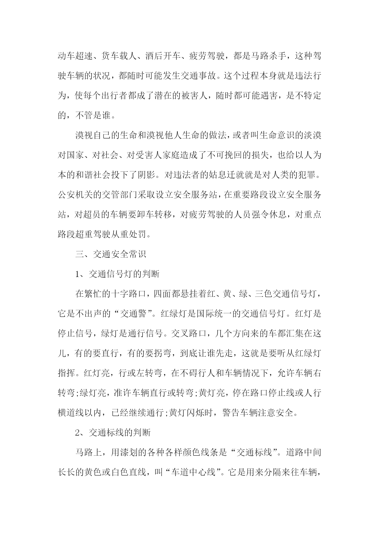 交通安全教育活动总结交通安全教育活动总结1我们希望,有更多的市民来关注交通安全,反思以往的行路驾车的陋习,认真审视并改正不文明的’交通习惯,把宝贵生命从无情的车祸中解救出来,尊重人的生存价值和生存权利!对于那些漠视自己生命和漠视他人生命,对国家、对社会、对受害人家庭造成不可挽回损失的做法,无论赔偿多少钱也终究无法挽回最宝贵生命,同时也给以人为本的和谐社会投下了阴影,这样的事情是永远无法原谅的。一、节日介绍随着经济的快速增长,城市规模的不断扩大,城市交通供需矛盾也日益突出。交通拥堵问题凸显,交通事故频发已成为社会的主要公害。每年的4月30日是“全国交通安全反思日”。“交通安全,人人有责”,让我们从点滴做起,教给孩子们必要的交通安全常识。尊重生命,让“马路杀手”销声匿迹。二、社会影响交通违法行为危害超过战争,中国公安部办公厅副主任、新闻发言人武和平痛斥交通违法行为,20xx年死于车轮下的无辜生命已经达到了10万人,不亚于甚至超过一场惨烈的战争。良好的`交通秩序是靠依法严管出来的,为了广大人民群众的生命财产负责,必须严管重罚才能遏制当前群死群伤交通事故上升的势头,这不仅是交通管理实践,同时也被世界发达国家交通管理实践所证实。客运车超员、机动车超速、货车载人、酒后开车、疲劳驾驶,都是马路杀手,这种驾驶车辆的状况,都随时可能发生交通事故。这个过程本身就是违法行为,使每个出行者都成了潜在的被害人,随时都可能遇害,是不特定的,不管是谁。漠视自己的生命和漠视他人生命的做法,或者叫生命意识的淡漠对国家、对社会、对受害人家庭造成了不可挽回的损失,也给以人为本的和谐社会投下了阴影。对违法者的姑息迁就就是对人类的犯罪。公安机关的交管部门采取设立安全服务站,在重要路段设立安全服务站,对超员的车辆要卸车转移,对疲劳驾驶的人员强令休息,对重点路段超重驾驶从重处罚。三、交通安全常识1、交通信号灯的判断在繁忙的十字路口,四面都悬挂着红、黄、绿、三色交通信号灯,它是不出声的“交通警”。红绿灯是国际统一的交通信号灯。红灯是停止信号,绿灯是通行信号。交叉路口,几个方向来的车都汇集在这儿,有的要直行,有的要拐弯,到底让谁先走,这就是要听从红绿灯指挥。红灯亮,行或左转弯,在不碍行人和车辆情况下,允许车辆右转弯;绿灯亮,准许车辆直行或转弯;黄灯亮,停在路口停止线或人行横道线以内,已经继续通行;黄灯闪烁时,警告车辆注意安全。2、交通标线的判断马路上,用漆划的各种各样颜色线条是“交通标线”。道路中间长长的黄色或白色直线,叫“车道中心线”。它是用来分隔来往车辆,使它们互不干扰。中心线两侧的白色虚线,叫“车道分界线”,它规定机动车在机动车道上行驶。非机动车在非机动车道上行驶。在路口四周有一根白线是“停止线”。红灯亮时,各种车辆应该停在这条线内。马路上用白色平等线像斑马纹那样的线条组成的长廊就是“人行横道线”。行人在这里过马路比较安全。3、如何安全走路如果我们不注意交通安全,走路也闯祸。因此,我们上学读书、放学回家、节假日外出时,走在人来车往的交通繁忙的道路上,要遵守交通规则,增强自我保护意识。我们走路要走在人行道上。在没有人行道的地方,应靠道路右边行走。走路时,思想要集中,不要东张西望,不能一边走一边玩耍,不能一边走路一边看书,不能三五成群并排行走,不要乱马路,更不能追赶车辆嬉戏打闹。更不要在马路上踢球、溜冰、放风筝、做游戏。一旦被来往车辆撞倒,后果非常严重。交通安全教育活动总结2随着经济的持续快速发展,车辆和道路交通流量大幅度增长,人车路矛盾日益突出,涉及中小学生交通事故不断增多。为加强对学生的安全教育工作,县交警大队开展了“交通安全建校园(进校园)”活动。对此,我校非常重视,决定在全校开展“交通安全月”活动。一、加强领导,积极配合。我校积极配合县交警大队,迅速成立活动领导小组,由副校长王兴八任组长,负责活动的开展,县交警大队由叶建军队长负责。二、积极宣传,营造气氛。1、我们召开全体师生大会,进行了动员宣传,使全体师生全面接受了一次交通安全知识教育。2、每个班、每个办公室均发放了交通安全进校园宣传函,进行张贴学习,学校在橱窗等醒目处予以张贴。3、悬挂了“遵守交通规则,创建平安校园”横幅,营造良好的氛围。三、深入扎实地开展学生交通安全知识宣传活动。1、组织师生观看交通安全教育展版和碟片。县交警大队派人送来30余张展牌和碟片进行了展播,我校组织师生认真观看了图片的碟片,一幅幅惨烈的景象、一双双绝望有眼睛,苦诉着“车祸猛于虎”。一幅幅卡通漫画,告诉我们如何遵守交通规则。交通标志图,告诉我们交通语言。另外,县交警大队的李琦同于20xx年11月21日为全体师生作了“珍惜生命,平安出行”的安全知识讲座,告诉我们如何遵守《道路交通安全法》