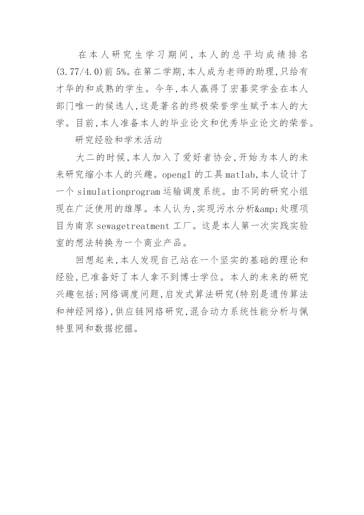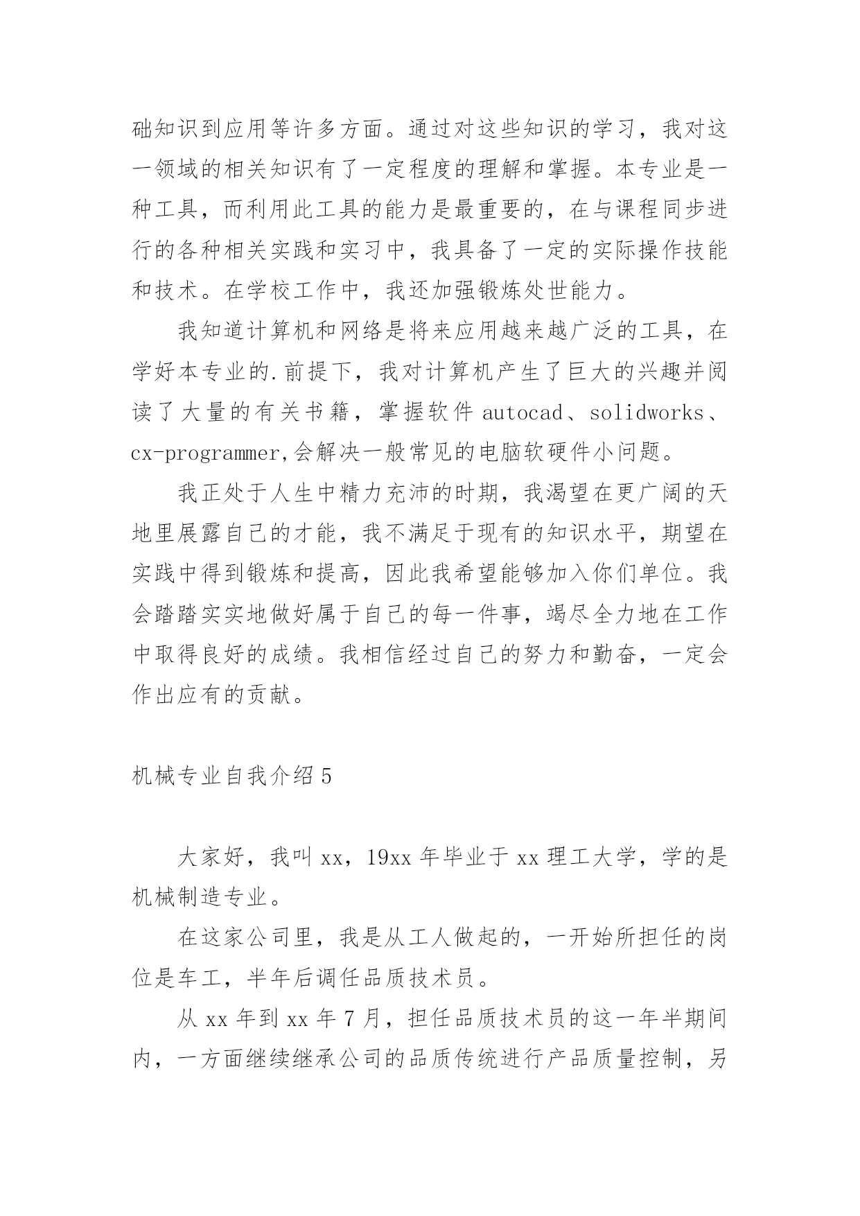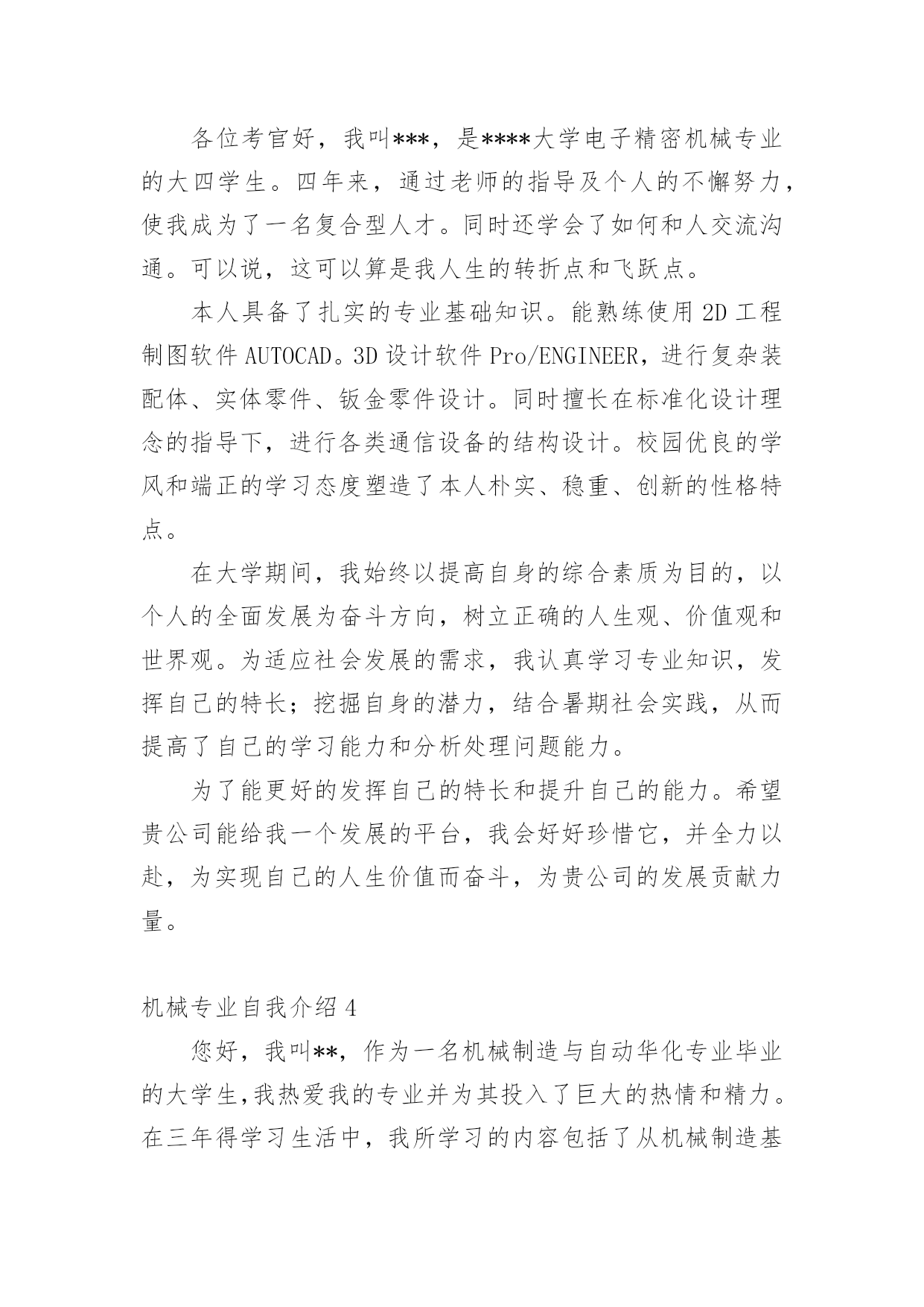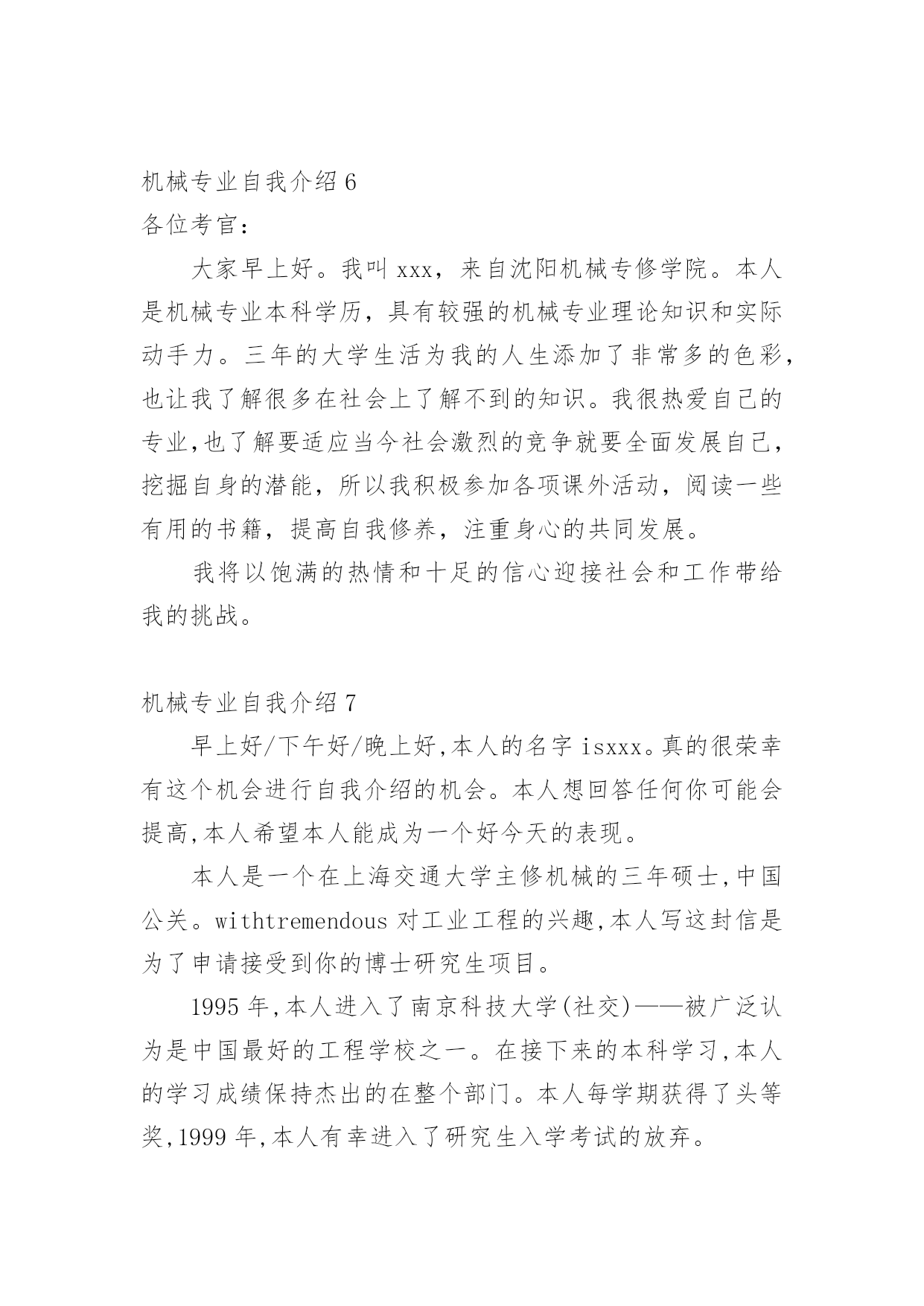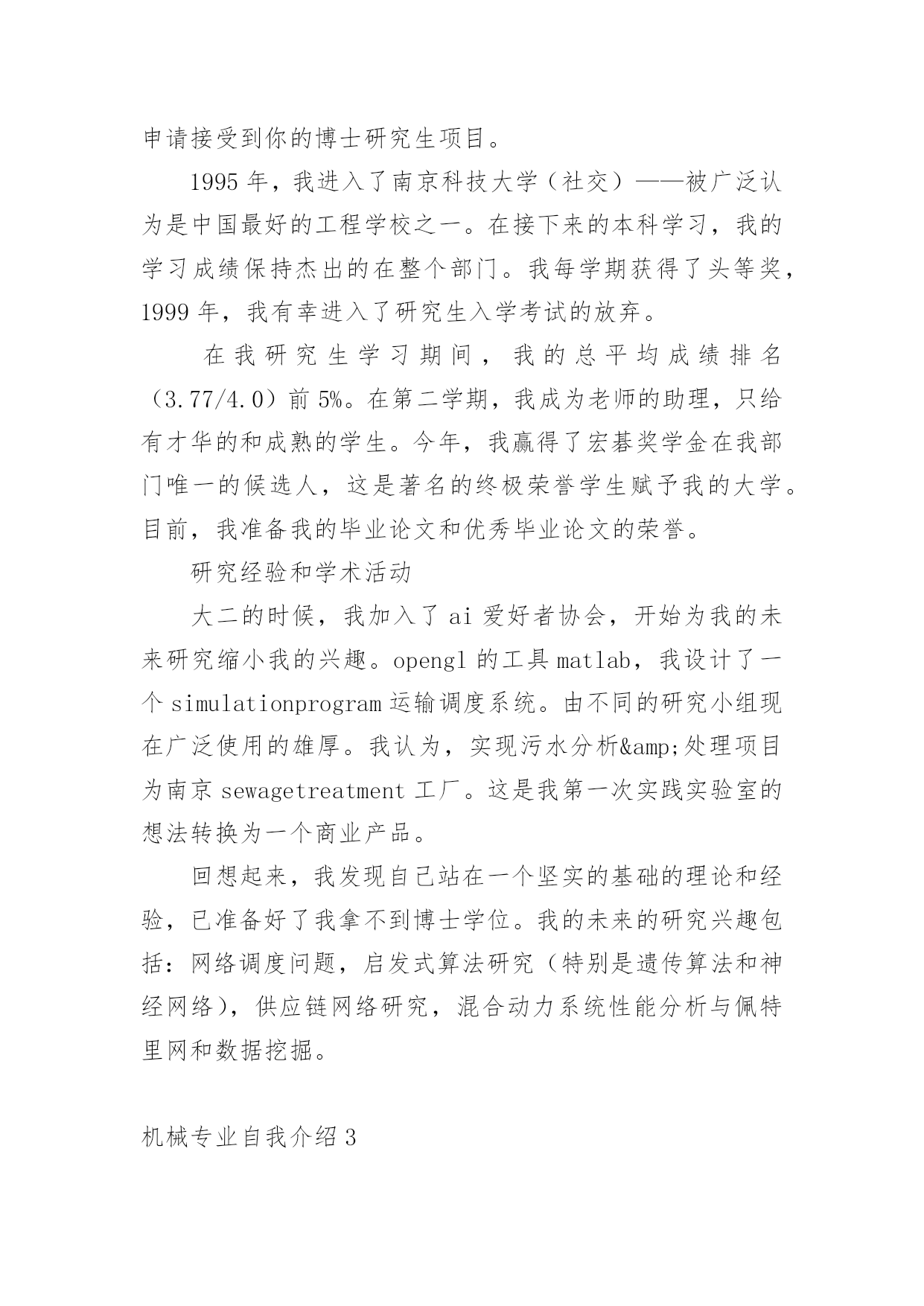 机械专业自我介绍机械专业自我介绍当来到的一个陌生的地方时,时常需要我们进行一个自我介绍,通过自我介绍可以得到他人的认识。如何编写一段个性的自我介绍?下面是小编为大家收集的机械专业自我介绍,仅供参考,希望能够帮助到大家。机械专业自我介绍1各位考官大家早上好。我叫xxx,来自xx大学。本人是机械专业本科学历,具有较强的机械专业理论知识和实际动手力。三年的大学生活为我的人生添加了非常多的色彩,也让我了解很多在社会上了解不到的知识。我很热爱自己的专业,也了解要适应当今社会激烈的竞争就要全面发展自己,挖掘自身的潜能,所以我积极参加各项课外活动,阅读一些有用的书籍,提高自我修养,注重身心的共同发展。我将以饱满的热情和十足的信心迎接社会和工作带给我的挑战。机械专业自我介绍2早上好/下午好/晚上好,我的名字xx。真的很荣幸有这个机会进行自我介绍的机会。我想回答任何你可能会提高,我希望我能成为一个好今天的表现。我是一个在上海交通大学主修机械的三年硕士,中国公关。withtremendous对工业工程的兴趣,我写这封信是为了申请接受到你的博士研究生项目。1995年,我进入了南京科技大学(社交)——被广泛认为是中国最好的工程学校之一。在接下来的本科学习,我的学习成绩保持杰出的在整个部门。我每学期获得了头等奖,1999年,我有幸进入了研究生入学考试的放弃。在我研究生学习期间,我的总平均成绩排名(3.77/4.0)前5%。在第二学期,我成为老师的助理,只给有才华的和成熟的学生。今年,我赢得了宏碁奖学金在我部门唯一的候选人,这是著名的终极荣誉学生赋予我的大学。目前,我准备我的毕业论文和优秀毕业论文的荣誉。研究经验和学术活动大二的时候,我加入了ai爱好者协会,开始为我的未来研究缩小我的兴趣。opengl的工具matlab,我设计了一个simulationprogram运输调度系统。由不同的研究小组现在广泛使用的雄厚。我认为,实现污水分析&处理项目为南京sewagetreatment工厂。这是我第一次实践实验室的想法转换为一个商业产品。回想起来,我发现自己站在一个坚实的基础的理论和经验,已准备好了我拿不到博士学位。我的未来的研究兴趣包括:网络调度问题,启发式算法研究(特别是遗传算法和神经网络),供应链网络研究,混合动力系统性能分析与佩特里网和数据挖掘。机械专业自我介绍3各位考官好,我叫***,是****大学电子精密机械专业的大四学生。四年来,通过老师的指导及个人的不懈努力,使我成为了一名复合型人才。同时还学会了如何和人交流沟通。可以说,这可以算是我人生的转折点和飞跃点。本人具备了扎实的专业基础知识。能熟练使用2D工程制图软件AUTOCAD。3D设计软件Pro/ENGINEER,进行复杂装配体、实体零件、钣金零件设计。同时擅长在标准化设计理念的指导下,进行各类通信设备的结构设计。校园优良的学风和端正的学习态度塑造了本人朴实、稳重、创新的性格特点。在大学期间,我始终以提高自身的综合素质为目的,以个人的全面发展为奋斗方向,树立正确的人生观、价值观和世界观。为适应社会发展的需求,我认真学习专业知识,发挥自己的特长;挖掘自身的潜力,结合暑期社会实践,从而提高了自己的学习能力和分析处理问题能力。为了能更好的发挥自己的特长和提升自己的能力。希望贵公司能给我一个发展的平台,我会好好珍惜它,并全力以赴,为实现自己的人生价值而奋斗,为贵公司的发展贡献力量。机械专业自我介绍4您好,我叫**,作为一名机械制造与自动华化专业毕业的大学生,我热爱我的专业并为其投入了巨大的热情和精力。在三年得学习生活中,我所学习的内容包括了从机械制造基础知识到应用等许多方面。通过对这些知识的学习,我对这一领域的相关知识有了一定程度的理解和掌握。本专业是一种工具,而利用此工具的能力是最重要的,在与课程同步进行的各种相关实践和实习中,我具备了一定的实际操作技能和技术。在学校工作中,我还加强锻炼处世能力。我知道计算机和网络是将来应用越来越广泛的工具,在学好本专业的.前提下,我对计算机产生了巨大的兴趣并阅读了大量的有关书籍,掌握软件autocad、solidworks、cx-programmer,会解决一般常见的电脑软硬件小问题。我正处于人生中精力充沛的时期,我渴望在更广阔的天地里展露自己的才能,我不满足于现有的知识水平,期望在实践中得到锻炼和提高,因此我希望能够加入你们单位。我会踏踏实实地做好属于自己的每一件事,竭尽全力地在工作中取得良好的成绩。我相信经过自己的努力和勤奋,一定会作出应有的贡献。机械专业自我介绍5大家好,我叫xx,19xx年毕业于xx理工大学,学的是机械制造专业。在这家公司里,我是从工人做起的,一开始所担任的岗位是车工,半年后调任品质技术员。从xx年到xx年7月,担任品质技术员的这