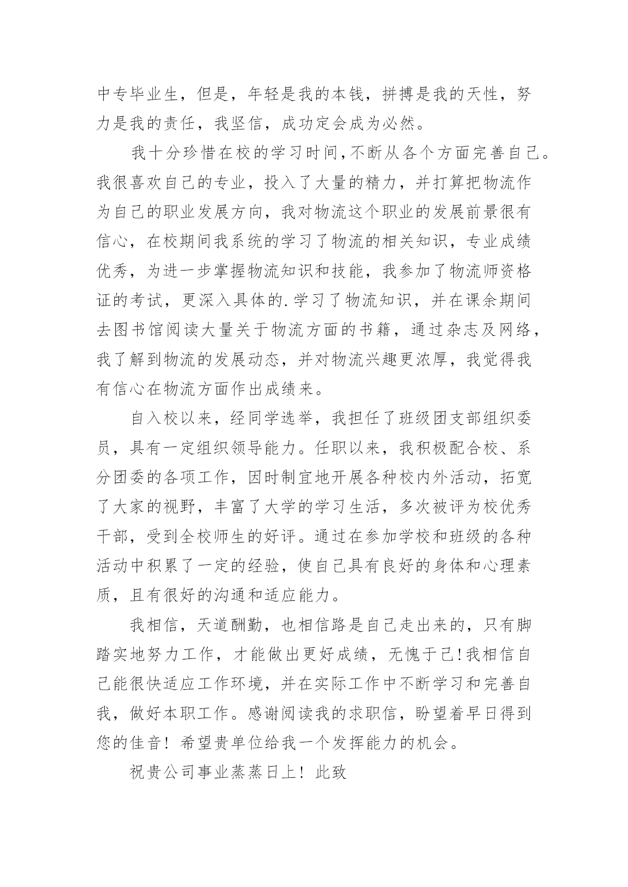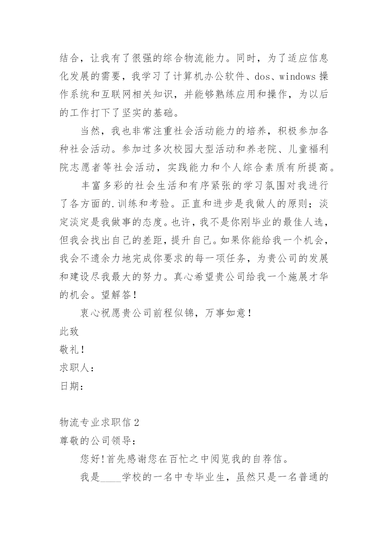 物流专业求职信1物流专业求职信2篇(推荐)日子如同白驹过隙,找工作的黄金时间马上就要到来,这时候需要提前写好求职信了哦。千万不能认为求职信随便应付就可以喔,下面是小编帮大家整理的物流专业求职信,供大家参考借鉴,希望可以帮助到有需要的朋友。物流专业求职信1各位领导:您好!当你打开这一页时,你为我打开了成功的第一扇门。谢谢你在我即将踏上人生的另一段新旅程时给了我一个宝贵的机会。希望能帮你找到满意的人才。因为热爱物流,所以当初选择了物流专业。现在,四年的大学生活即将结束,人生的旅程又迈出了一步——走出校园,踏入社会。从现在开始,我将面对新的开始,迎接新的挑战。在大学四年的学习生涯中,我注重培养个人素质,提高个人能力,努力把自己培养成现代市场经济所需要的复合型人才。四年来,我努力学习,刻苦学习,成绩优异,获得了学校层面的智育奖学金。通过专业课的学习,掌握了物流方面的听、说、读、写、译能力;物流课老师,曾经在高二上过一节课,得到了学校老师的高度赞扬,专业学习和实践相结合,让我有了很强的综合物流能力。同时,为了适应信息化发展的需要,我学习了计算机办公软件、dos、windows操作系统和互联网相关知识,并能够熟练应用和操作,为以后的工作打下了坚实的基础。当然,我也非常注重社会活动能力的培养,积极参加各种社会活动。参加过多次校园大型活动和养老院、儿童福利院志愿者等社会活动,实践能力和个人综合素质有所提高。丰富多彩的社会生活和有序紧张的学习氛围对我进行了各方面的.训练和考验。正直和进步是我做人的原则;淡定淡定是我做事的态度。也许,我不是你刚毕业的最佳人选,但我会找出自己的差距,提升自己。如果你能给我一个机会,我会不遗余力地完成你要求的每一项任务,为贵公司的发展和建设尽我最大的努力。真心希望贵公司给我一个施展才华的机会。望解答!衷心祝愿贵公司前程似锦,万事如意!此致敬礼!求职人:日期:物流专业求职信2尊敬的公司领导:您好!首先感谢您在百忙之中阅览我的自荐信。我是____学校的一名中专毕业生,虽然只是一名普通的中专毕业生,但是,年轻是我的本钱,拼搏是我的天性,努力是我的责任,我坚信,成功定会成为必然。我十分珍惜在校的学习时间,不断从各个方面完善自己。我很喜欢自己的专业,投入了大量的精力,并打算把物流作为自己的职业发展方向,我对物流这个职业的发展前景很有信心,在校期间我系统的学习了物流的相关知识,专业成绩优秀,为进一步掌握物流知识和技能,我参加了物流师资格证的考试,更深入具体的.学习了物流知识,并在课余期间去图书馆阅读大量关于物流方面的书籍,通过杂志及网络,我了解到物流的发展动态,并对物流兴趣更浓厚,我觉得我有信心在物流方面作出成绩来。自入校以来,经同学选举,我担任了班级团支部组织委员,具有一定组织领导能力。任职以来,我积极配合校、系分团委的各项工作,因时制宜地开展各种校内外活动,拓宽了大家的视野,丰富了大学的学习生活,多次被评为校优秀干部,受到全校师生的好评。通过在参加学校和班级的各种活动中积累了一定的经验,使自己具有良好的身体和心理素质,且有很好的沟通和适应能力。我相信,天道酬勤,也相信路是自己走出来的,只有脚踏实地努力工作,才能做出更好成绩,无愧于己!我相信自己能很快适应工作环境,并在实际工作中不断学习和完善自我,做好本职工作。感谢阅读我的求职信,盼望着早日得到您的佳音!希望贵单位给我一个发挥能力的机会。祝贵公司事业蒸蒸日上!此致敬礼____x______年x月