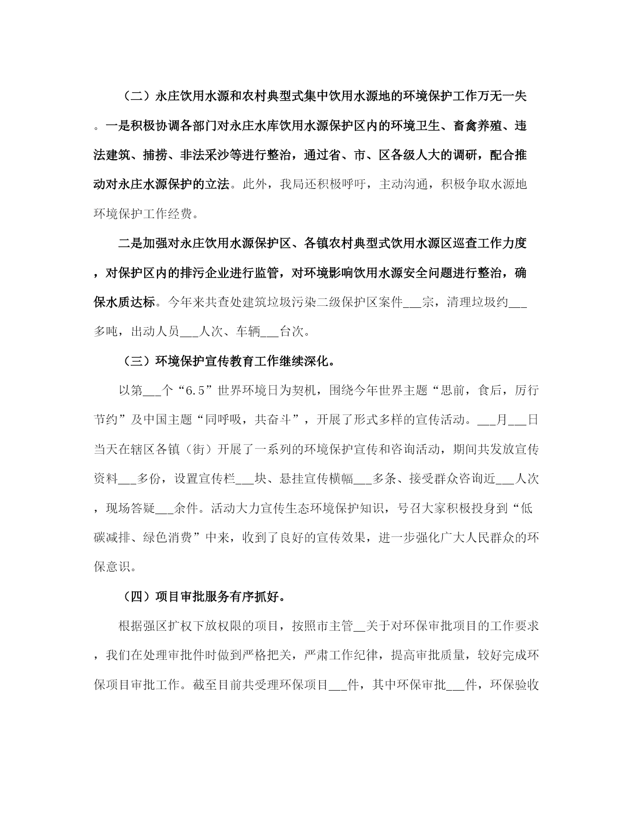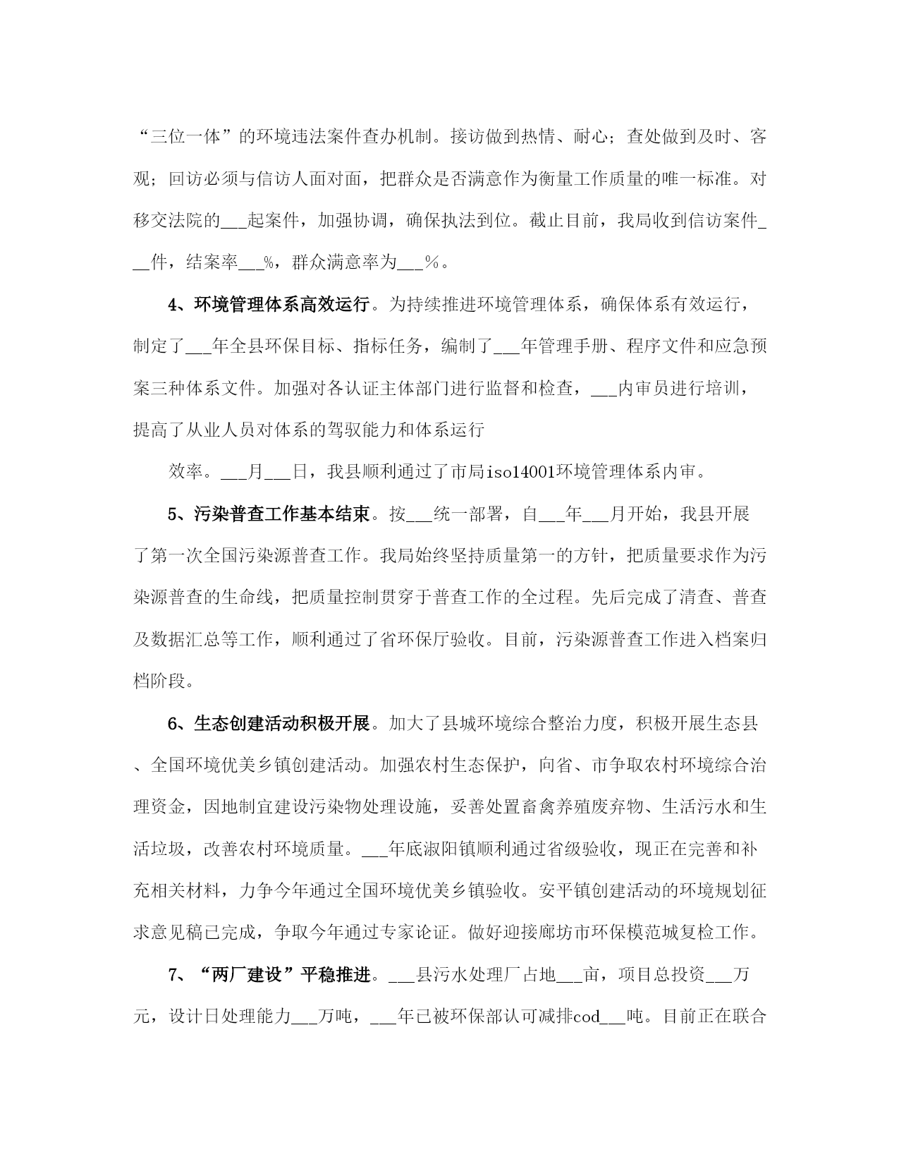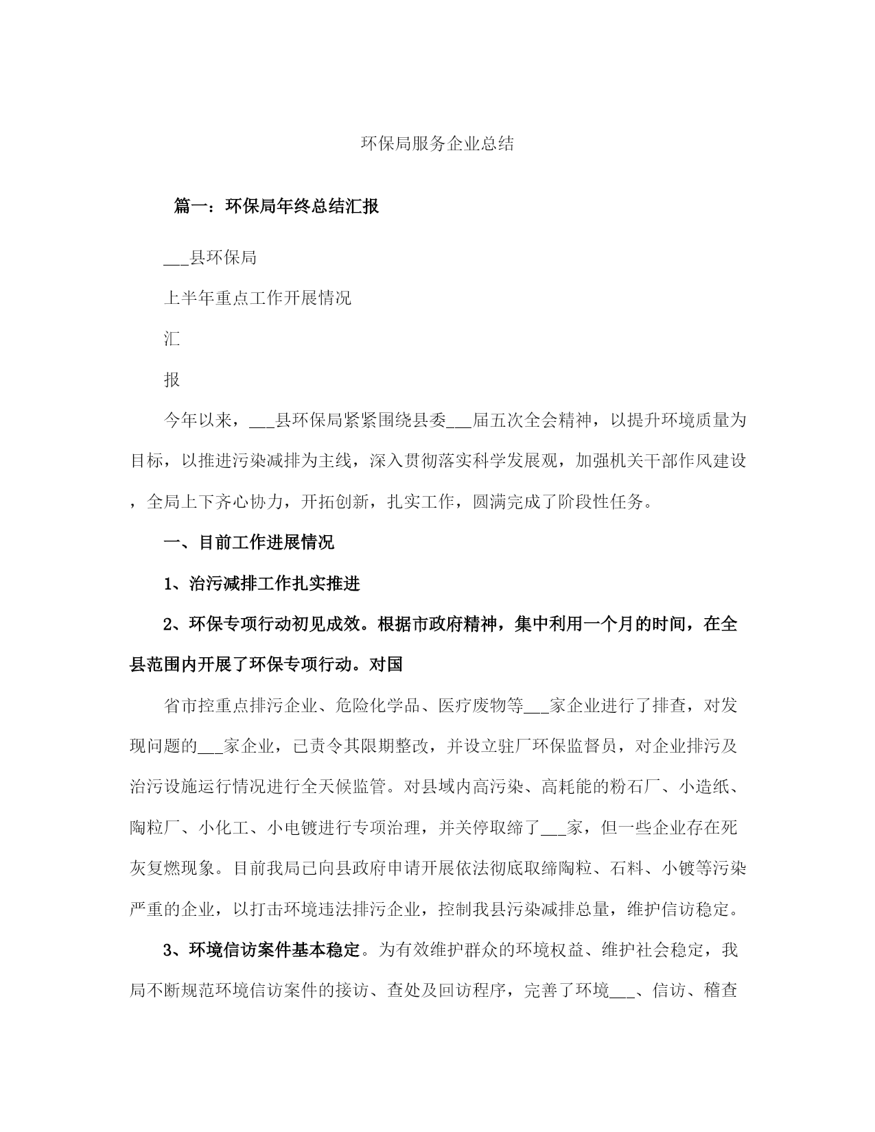 环保局服务企业总结(完整版)文档资料可直接使用,可编辑,欢迎下载环保局服务企业总结篇一:环保局年终总结汇报___县环保局上半年重点工作开展情况汇报今年以来,___县环保局紧紧围绕县委___届五次全会精神,以提升环境质量为目标,以推进污染减排为主线,深入贯彻落实科学发展观,加强机关干部作风建设,全局上下齐心协力,开拓创新,扎实工作,圆满完成了阶段性任务。一、目前工作进展情况1、治污减排工作扎实推进2、环保专项行动初见成效。根据市政府精神,集中利用一个月的时间,在全县范围内开展了环保专项行动。对国省市控重点排污企业、危险化学品、医疗废物等___家企业进行了排查,对发现问题的___家企业,已责令其限期整改,并设立驻厂环保监督员,对企业排污及治污设施运行情况进行全天候监管。对县域内高污染、高耗能的粉石厂、小造纸、陶粒厂、小化工、小电镀进行专项治理,并关停取缔了___家,但一些企业存在死灰复燃现象。目前我局已向县政府申请开展依法彻底取缔陶粒、石料、小镀等污染严重的企业,以打击环境违法排污企业,控制我县污染减排总量,维护信访稳定。3、环境信访案件基本稳定。为有效维护群众的环境权益、维护社会稳定,我局不断规范环境信访案件的接访、查处及回访程序,完善了环境___、信访、稽查“三位一体”的环境违法案件查办机制。接访做到热情、耐心;查处做到及时、客观;回访必须与信访人面对面,把群众是否满意作为衡量工作质量的唯一标准。对移交法院的___起案件,加强协调,确保执法到位。截止目前,我局收到信访案件___件,结案率___%,群众满意率为___%。4、环境管理体系高效运行。为持续推进环境管理体系,确保体系有效运行,制定了___年全县环保目标、指标任务,编制了___年管理手册、程序文件和应急预案三种体系文件。加强对各认证主体部门进行监督和检查,___内审员进行培训,提高了从业人员对体系的驾驭能力和体系运行效率。___月___日,我县顺利通过了市局iso14001环境管理体系内审。5、污染普查工作基本结束。按___统一部署,自___年___月开始,我县开展了第一次全国污染源普查工作。我局始终坚持质量第一的方针,把质量要求作为污染源普查的生命线,把质量控制贯穿于普查工作的全过程。先后完成了清查、普查及数据汇总等工作,顺利通过了省环保厅验收。目前,污染源普查工作进入档案归档阶段。6、生态创建活动积极开展。加大了县城环境综合整治力度,积极开展生态县、全国环境优美乡镇创建活动。加强农村生态保护,向省、市争取农村环境综合治理资金,因地制宜建设污染物处理设施,妥善处置畜禽养殖废弃物、生活污水和生活垃圾,改善农村环境质量。___年底淑阳镇顺利通过省级验收,现正在完善和补充相关材料,力争今年通过全国环境优美乡镇验收。安平镇创建活动的环境规划征求意见稿已完成,争取今年通过专家论证。做好迎接廊坊市环保模范城复检工作。7、“两厂建设”平稳推进。___县污水处理厂占地___亩,项目总投资___万元,设计日处理能力___万吨,___年已被环保部认可减排cod___吨。目前正在联合综合执法局,对全县污水排水量、排水浓度进行摸底调查,完善污水收集管网,确保___县污水处理厂___月底前正常运行,___经济技术开发区污水处理厂开工建设。同时,加快城区第二垃圾填埋场建设进度。我县日垃圾产生量达___余吨,全部由清洁工人运往万辛村北侧垃圾填埋场,该填埋场未达到垃圾填埋规范化标准要求。目前选址在安头屯镇规划建设县城第二垃圾填埋场。项目占地___亩,总投资___万元,年内即可建成投入使用。8、为企服务意识明显提高。通过开展领导干部作风建设年活动,全体干部职工的服务企业意识有了明显的增强,干部职工的政治觉悟和业务能力有了显著的提高。我局大力服务全县经济建设,做好项目服务,对符合产业政策的项目审批要尽量快批,积极协助企业办理省级、市级环保审批手续,确保不因环保手续问题延误项目进程。对新上项目实行动态(范本)管理,深入一线了解项目进展情况,随时提醒企业做好环评、“三同时”验收等相关工作,努力提高项目管理水平。今年上半年,我局共审批建设项目___个,县级审批的环境影响登记表、备案表随到随办,环境___报告表由原来的___日缩减为___个工作日,___由原来的___日缩减为___个工作日,为企业节省了时间,得到企业的一致好评。二、存在问题1、环保能力建设有待提高。一是通过深入学习实践科学发展观,开展干部作风建设年活动,发现干部职工在执法能力、业务水平等方面还不够强,环保队伍整体素质需进一步加强。二是基础能力建设薄弱。近几年,随着环保部门不断壮大,出现办公用房紧张、执法车辆不足,___缺位、监测设备不先进等问题,与当前环境管理的要求不相适应。2、环保经费不足。一是