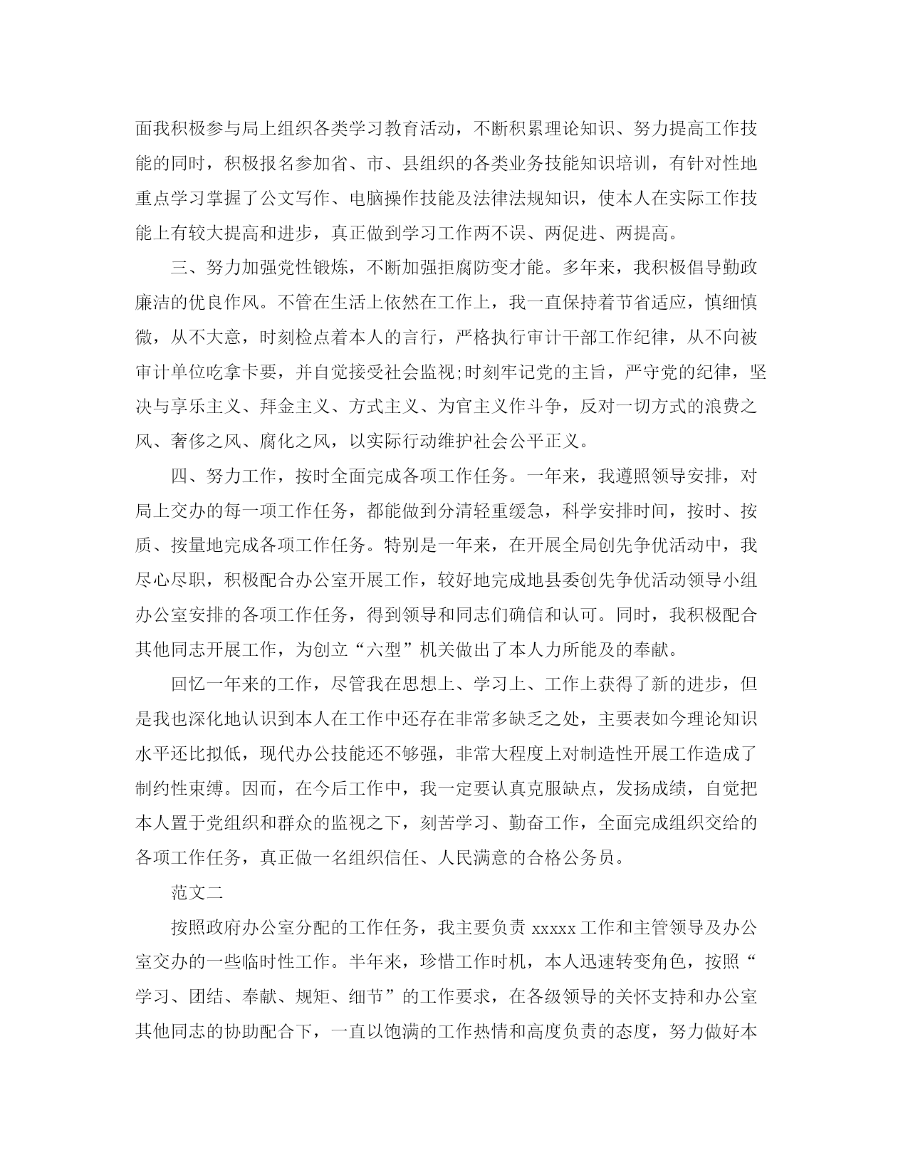 公务员的自我参考总结范文范文一一年来,在局领导班子的正确领导下,在同志们的大力支持协助下,我一直坚持把学习建立具有中国特色社会主义创新理论作为提高本身政治素养的主要途径,认真学习和领会邓小平理论、“xxxx”重要思想及科学开展观深化内涵,全面理解掌握了党的xx届三中、四中、五中全会精神及加强党的执政才能建立等方面的严重理论知识,不断提高本身政策理论水平,以加强本身在实际工作中发觉咨询题、分析咨询题、处理咨询题的才能。与此同时,我积极参与全县创先争优活动及局上组织的各类学习教育活动,主动分析查找本人在思想认识、工作作风等方面存在的缺乏和咨询题,认真开展批判与自我批判,解放思想,转变观念,积极整改,力务实效,从根本上改变以往自由散漫、思想保守、爱发牢骚等不良适应,真正做到大事讲原则,小事讲风格,使本人的党性和人品得到非常好锻炼。通过不懈努力,较好地完成了局上交办的各项工作任务,现将XX年个人工作总结如下:一、内强素养,外树形象。一年来,我一直坚持马列主义立场和观点,纯熟掌握科学开展观的方法论,灵敏应用辩证唯物主义与历史唯物主义去分析和发觉处理工作中遇到的新情况、新咨询题,明辨是非,坚持真理,坚持用正确的世界观、人生观、价值观指导本人的学习、工作和生活实践,在思想上积极构筑抵御一切腐朽思想侵蚀的巩固道德防线,全面提升本身综合素养。自觉服从组织工作安排,严格恪守工作纪律,顾大局、识大体,克己奉公,按章办事,作风正派,团结同志,从不计较个人得失。在实际工作中,一直坚持以人民群众根本利益为本的思想道路,一切从实际出发,讲实话,办实事,务实效,真抓实干,真正按照人民群众的意愿依法履行好本人的职责,积极参与各种方式的社会救助实践活动,以实际行动兑现本人作为一名构建社会主义和谐社会的坚决拥护者、执政为民的实践者、遵纪守法的倡导者的庄严承诺。二、强化理论和业务学习,不断提高本身综合素养。在实际工作中,我一直坚持把理论学习作为提高本身综合素养的最有效途径抓实抓好,抓出成效。一方面我积极参与局上组织各类学习教育活动,不断积累理论知识、努力提高工作技能的同时,积极报名参加省、市、县组织的各类业务技能知识培训,有针对性地重点学习掌握了公文写作、电脑操作技能及法律法规知识,使本人在实际工作技能上有较大提高和进步,真正做到学习工作两不误、两促进、两提高。三、努力加强党性锻炼,不断加强拒腐防变才能。多年来,我积极倡导勤政廉洁的优良作风。不管在生活上依然在工作上,我一直保持着节省适应,慎细慎微,从不大意,时刻检点着本人的言行,严格执行审计干部工作纪律,从不向被审计单位吃拿卡要,并自觉接受社会监视;时刻牢记党的主旨,严守党的纪律,坚决与享乐主义、拜金主义、方式主义、为官主义作斗争,反对一切方式的浪费之风、奢侈之风、腐化之风,以实际行动维护社会公平正义。四、努力工作,按时全面完成各项工作任务。一年来,我遵照领导安排,对局上交办的每一项工作任务,都能做到分清轻重缓急,科学安排时间,按时、按质、按量地完成各项工作任务。特别是一年来,在开展全局创先争优活动中,我尽心尽职,积极配合办公室开展工作,较好地完成地县委创先争优活动领导小组办公室安排的各项工作任务,得到领导和同志们确信和认可。同时,我积极配合其他同志开展工作,为创立“六型”机关做出了本人力所能及的奉献。回忆一年来的工作,尽管我在思想上、学习上、工作上获得了新的进步,但是我也深化地认识到本人在工作中还存在非常多缺乏之处,主要表如今理论知识水平还比拟低,现代办公技能还不够强,非常大程度上对制造性开展工作造成了制约性束缚。因而,在今后工作中,我一定要认真克服缺点,发扬成绩,自觉把本人置于党组织和群众的监视之下,刻苦学习、勤奋工作,全面完成组织交给的各项工作任务,真正做一名组织信任、人民满意的合格公务员。范文二按照政府办公室分配的工作任务,我主要负责xxxxx工作和主管领导及办公室交办的一些临时性工作。半年来,珍惜工作时机,本人迅速转变角色,按照“学习、团结、奉献、规矩、细节”的工作要求,在各级领导的关怀支持和办公室其他同志的协助配合下,一直以饱满的工作热情和高度负责的态度,努力做好本职工作,圆满完成了领导和办公室交办的各项工作任务,得到了领导和同志们的一致好评。现将半年来学习工作情况简要总结如下:一、注重学习,加强素养,努力提高工作水平面对崭新的工作环境,面对日益繁重的工作任务,本人坚持把学习贯穿于工作生活的一直,努力提高本身素养,加强驾驭工作的才能。一是认真学习政治理论知识,提高理论水平和主旨认识。在积极参加单位集体学习的同时,坚持每晚抽出一小时,系统地学习党的三代领导核心的理论著述和会议报告,特别是县委九届三次、四次全会精神,深化领会其精神本质,并撰写体会文章3篇,读书笔记1万余字。二是研究业务