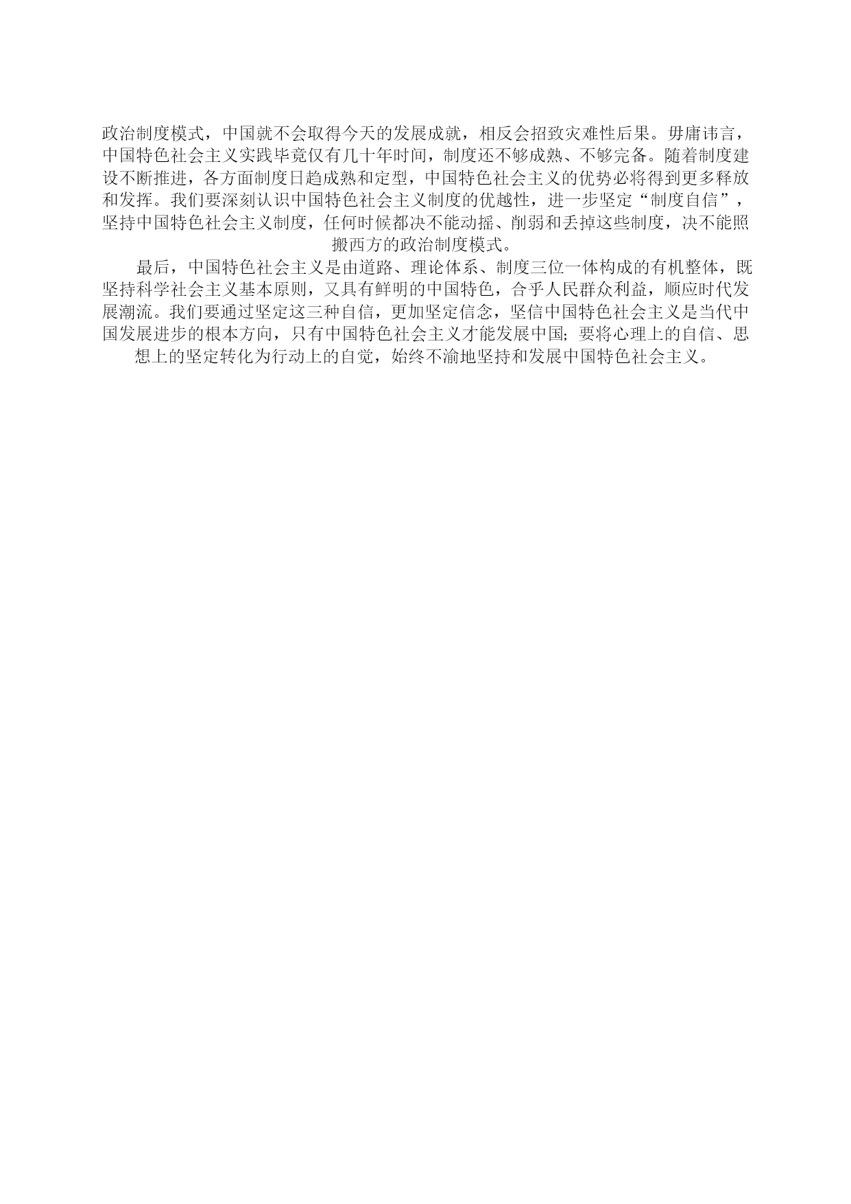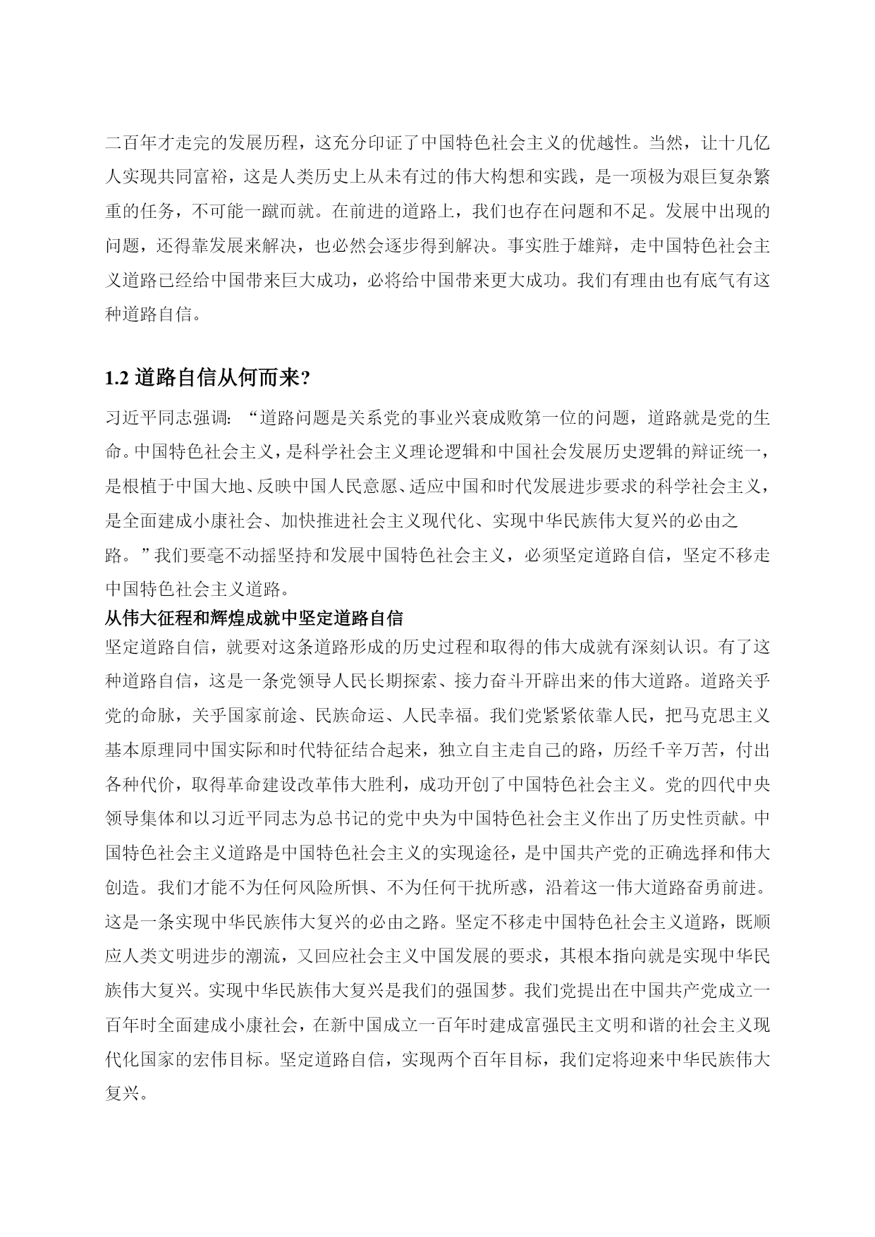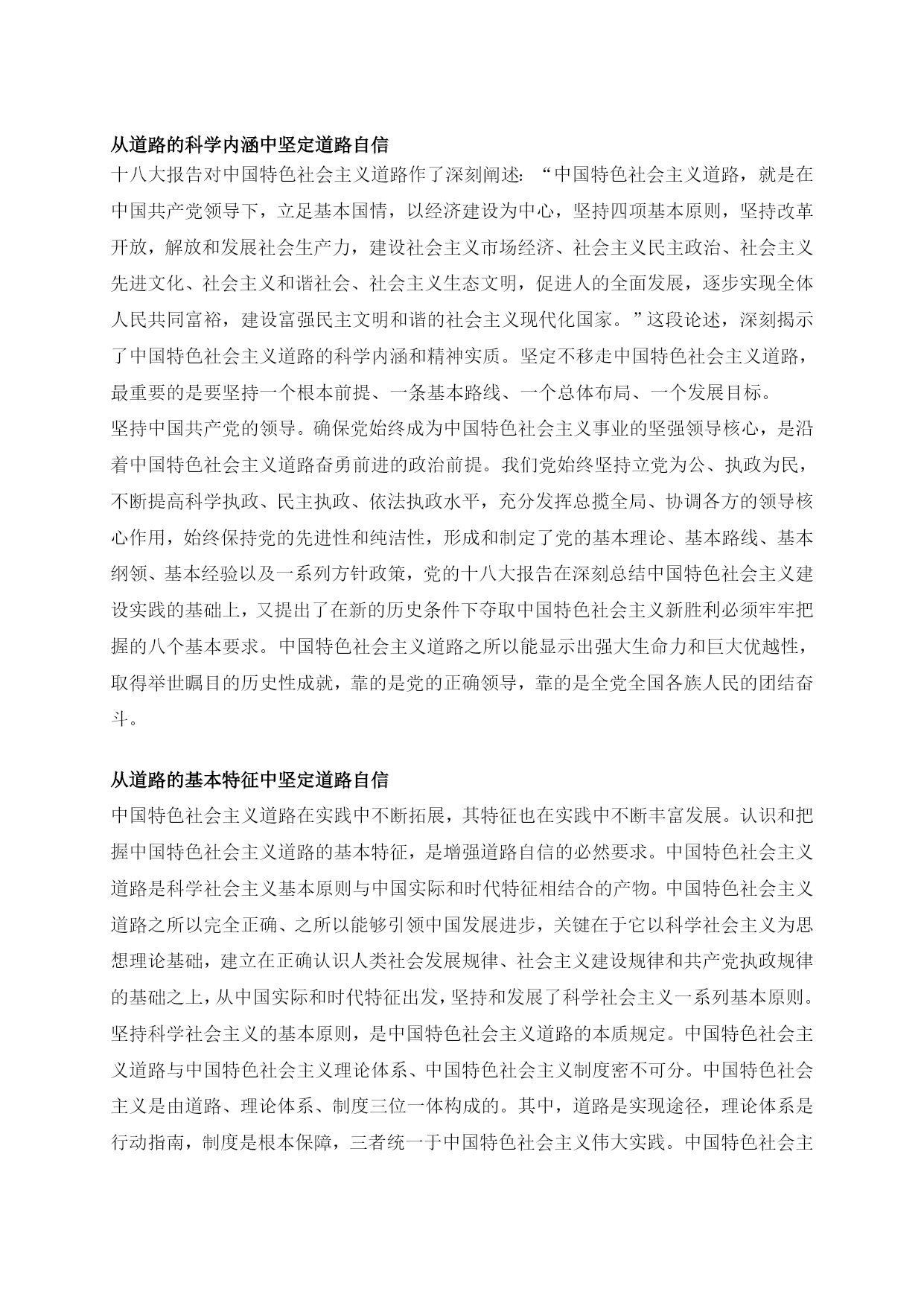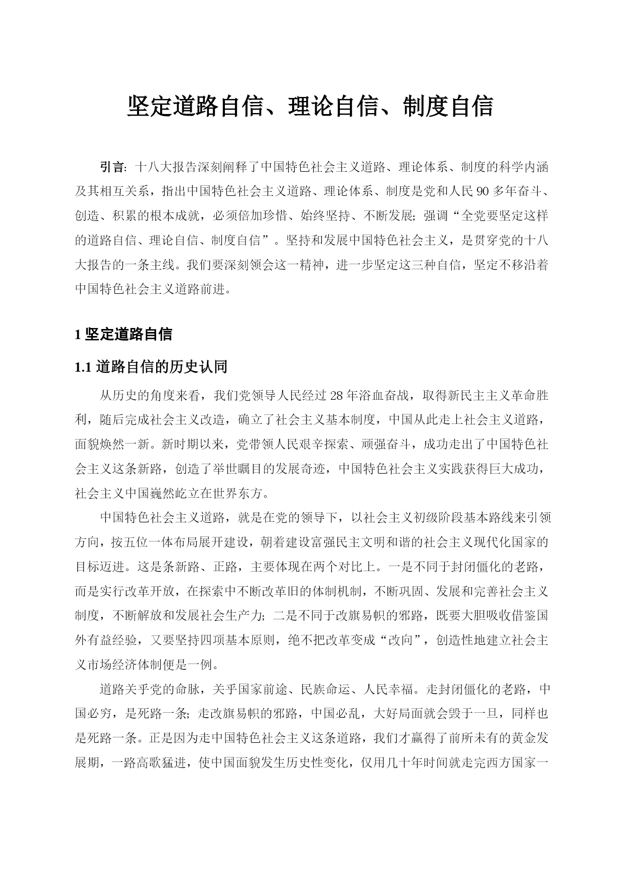 坚定道路自信理论自信制度自信最新文档(可以直接使用,可编辑最新文档,欢迎下载)坚定道路自信、理论自信、制度自信引言:十八大报告深刻阐释了中国特色社会主义道路、理论体系、制度的科学内涵及其相互关系,指出中国特色社会主义道路、理论体系、制度是党和人民90多年奋斗、创造、积累的根本成就,必须倍加珍惜、始终坚持、不断发展;强调“全党要坚定这样的道路自信、理论自信、制度自信”。坚持和发展中国特色社会主义,是贯穿党的十八大报告的一条主线。我们要深刻领会这一精神,进一步坚定这三种自信,坚定不移沿着中国特色社会主义道路前进。1坚定道路自信1.1道路自信的历史认同从历史的角度来看,我们党领导人民经过28年浴血奋战,取得新民主主义革命胜利,随后完成社会主义改造,确立了社会主义基本制度,中国从此走上社会主义道路,面貌焕然一新。新时期以来,党带领人民艰辛探索、顽强奋斗,成功走出了中国特色社会主义这条新路,创造了举世瞩目的发展奇迹,中国特色社会主义实践获得巨大成功,社会主义中国巍然屹立在世界东方。中国特色社会主义道路,就是在党的领导下,以社会主义初级阶段基本路线来引领方向,按五位一体布局展开建设,朝着建设富强民主文明和谐的社会主义现代化国家的目标迈进。这是条新路、正路,主要体现在两个对比上。一是不同于封闭僵化的老路,而是实行改革开放,在探索中不断改革旧的体制机制,不断巩固、发展和完善社会主义制度,不断解放和发展社会生产力;二是不同于改旗易帜的邪路,既要大胆吸收借鉴国外有益经验,又要坚持四项基本原则,绝不把改革变成“改向”,创造性地建立社会主义市场经济体制便是一例。道路关乎党的命脉,关乎国家前途、民族命运、人民幸福。走封闭僵化的老路,中国必穷,是死路一条;走改旗易帜的邪路,中国必乱,大好局面就会毁于一旦,同样也是死路一条。正是因为走中国特色社会主义这条道路,我们才赢得了前所未有的黄金发展期,一路高歌猛进,使中国面貌发生历史性变化,仅用几十年时间就走完西方国家一二百年才走完的发展历程,这充分印证了中国特色社会主义的优越性。当然,让十几亿人实现共同富裕,这是人类历史上从未有过的伟大构想和实践,是一项极为艰巨复杂繁重的任务,不可能一蹴而就。在前进的道路上,我们也存在问题和不足。发展中出现的问题,还得靠发展来解决,也必然会逐步得到解决。事实胜于雄辩,走中国特色社会主义道路已经给中国带来巨大成功,必将给中国带来更大成功。我们有理由也有底气有这种道路自信。1.2道路自信从何而来?习近平同志强调:“道路问题是关系党的事业兴衰成败第一位的问题,道路就是党的生命。中国特色社会主义,是科学社会主义理论逻辑和中国社会发展历史逻辑的辩证统一,是根植于中国大地、反映中国人民意愿、适应中国和时代发展进步要求的科学社会主义,是全面建成小康社会、加快推进社会主义现代化、实现中华民族伟大复兴的必由之路。”我们要毫不动摇坚持和发展中国特色社会主义,必须坚定道路自信,坚定不移走中国特色社会主义道路。从伟大征程和辉煌成就中坚定道路自信坚定道路自信,就要对这条道路形成的历史过程和取得的伟大成就有深刻认识。有了这种道路自信,这是一条党领导人民长期探索、接力奋斗开辟出来的伟大道路。道路关乎党的命脉,关乎国家前途、民族命运、人民幸福。我们党紧紧依靠人民,把马克思主义基本原理同中国实际和时代特征结合起来,独立自主走自己的路,历经千辛万苦,付出各种代价,取得革命建设改革伟大胜利,成功开创了中国特色社会主义。党的四代中央领导集体和以习近平同志为总书记的党中央为中国特色社会主义作出了历史性贡献。中国特色社会主义道路是中国特色社会主义的实现途径,是中国共产党的正确选择和伟大创造。我们才能不为任何风险所惧、不为任何干扰所惑,沿着这一伟大道路奋勇前进。这是一条实现中华民族伟大复兴的必由之路。坚定不移走中国特色社会主义道路,既顺应人类文明进步的潮流,又回应社会主义中国发展的要求,其根本指向就是实现中华民族伟大复兴。实现中华民族伟大复兴是我们的强国梦。我们党提出在中国共产党成立一百年时全面建成小康社会,在新中国成立一百年时建成富强民主文明和谐的社会主义现代化国家的宏伟目标。坚定道路自信,实现两个百年目标,我们定将迎来中华民族伟大复兴。从道路的科学内涵中坚定道路自信十八大报告对中国特色社会主义道路作了深刻阐述:“中国特色社会主义道路,就是在中国共产党领导下,立足基本国情,以经济建设为中心,坚持四项基本原则,坚持改革开放,解放和发展社会生产力,建设社会主义市场经济、社会主义民主政治、社会主义先进文化、社会主义和谐社会、社会主义生态文明,促进人的全面发展,逐步实现全体人民共同富裕,建设富强民主文明和谐的社会主义现代化国家。”这段论述,深刻揭示了中国特色社会主义道路的科学内涵和精神实质。坚定不移走