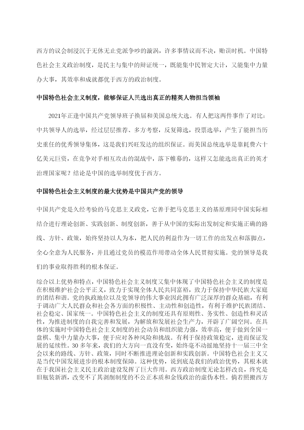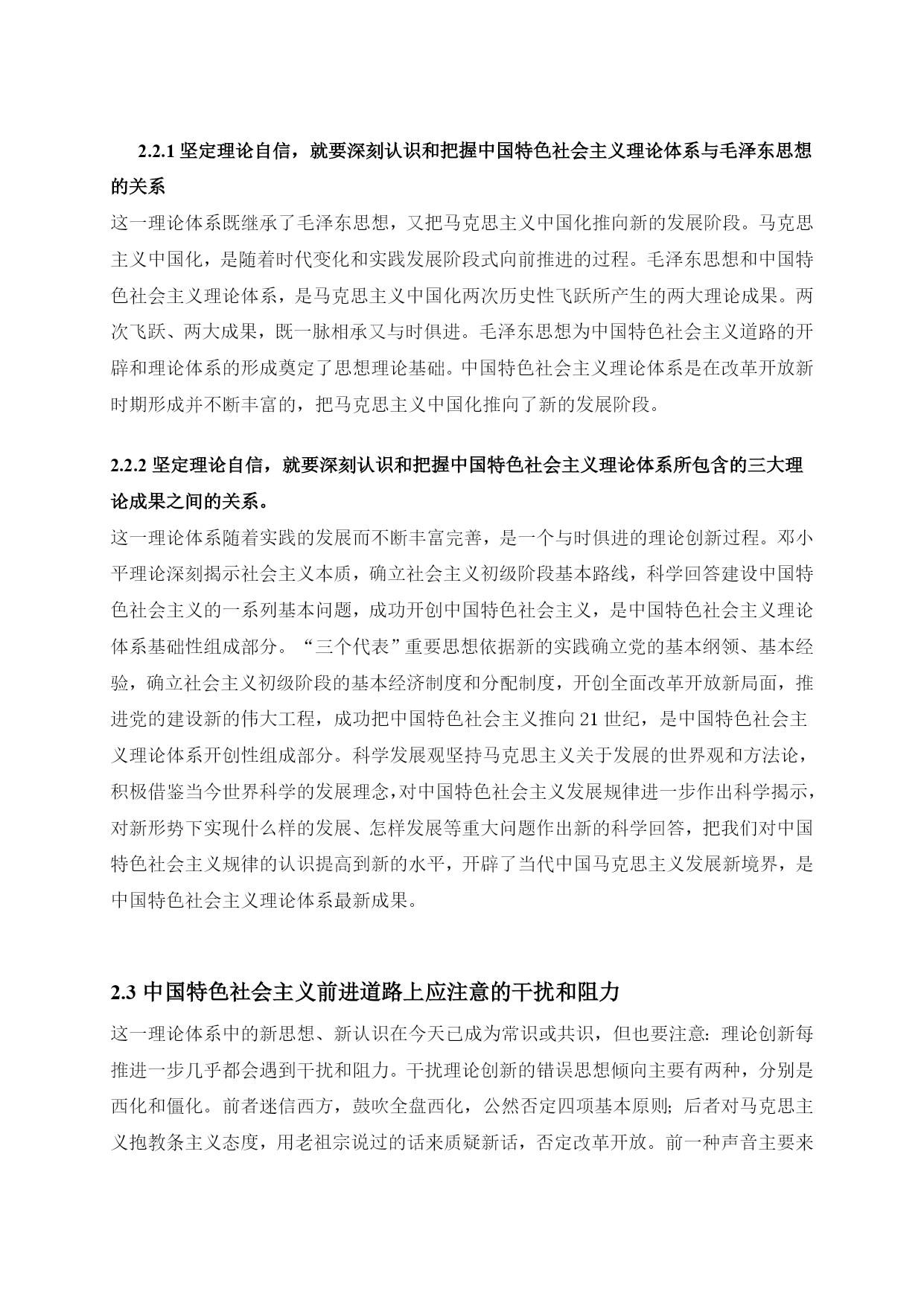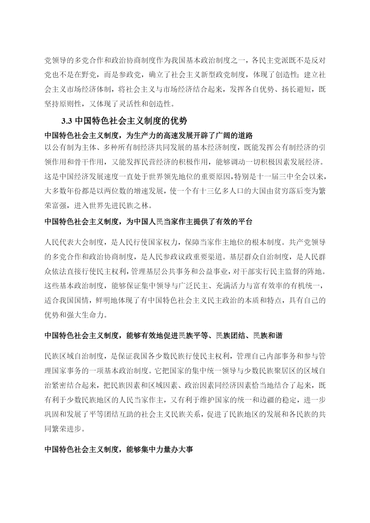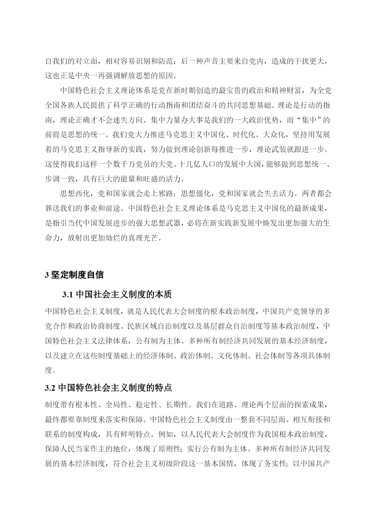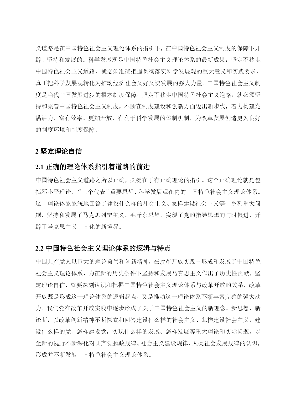 坚定道路自信理论自信制度自信最新文档(可以直接使用,可编辑最新文档,欢迎下载)坚定道路自信、理论自信、制度自信引言:十八大报告深刻阐释了中国特色社会主义道路、理论体系、制度的科学内涵及其相互关系,指出中国特色社会主义道路、理论体系、制度是党和人民90多年奋斗、创造、积累的根本成就,必须倍加珍惜、始终坚持、不断发展;强调“全党要坚定这样的道路自信、理论自信、制度自信”。坚持和发展中国特色社会主义,是贯穿党的十八大报告的一条主线。我们要深刻领会这一精神,进一步坚定这三种自信,坚定不移沿着中国特色社会主义道路前进。1坚定道路自信1.1道路自信的历史认同从历史的角度来看,我们党领导人民经过28年浴血奋战,取得新民主主义革命胜利,随后完成社会主义改造,确立了社会主义基本制度,中国从此走上社会主义道路,面貌焕然一新。新时期以来,党带领人民艰辛探索、顽强奋斗,成功走出了中国特色社会主义这条新路,创造了举世瞩目的发展奇迹,中国特色社会主义实践获得巨大成功,社会主义中国巍然屹立在世界东方。中国特色社会主义道路,就是在党的领导下,以社会主义初级阶段基本路线来引领方向,按五位一体布局展开建设,朝着建设富强民主文明和谐的社会主义现代化国家的目标迈进。这是条新路、正路,主要体现在两个对比上。一是不同于封闭僵化的老路,而是实行改革开放,在探索中不断改革旧的体制机制,不断巩固、发展和完善社会主义制度,不断解放和发展社会生产力;二是不同于改旗易帜的邪路,既要大胆吸收借鉴国外有益经验,又要坚持四项基本原则,绝不把改革变成“改向”,创造性地建立社会主义市场经济体制便是一例。道路关乎党的命脉,关乎国家前途、民族命运、人民幸福。走封闭僵化的老路,中国必穷,是死路一条;走改旗易帜的邪路,中国必乱,大好局面就会毁于一旦,同样也是死路一条。正是因为走中国特色社会主义这条道路,我们才赢得了前所未有的黄金发展期,一路高歌猛进,使中国面貌发生历史性变化,仅用几十年时间就走完西方国家一二百年才走完的发展历程,这充分印证了中国特色社会主义的优越性。当然,让十几亿人实现共同富裕,这是人类历史上从未有过的伟大构想和实践,是一项极为艰巨复杂繁重的任务,不可能一蹴而就。在前进的道路上,我们也存在问题和不足。发展中出现的问题,还得靠发展来解决,也必然会逐步得到解决。事实胜于雄辩,走中国特色社会主义道路已经给中国带来巨大成功,必将给中国带来更大成功。我们有理由也有底气有这种道路自信。1.2道路自信从何而来?习近平同志强调:“道路问题是关系党的事业兴衰成败第一位的问题,道路就是党的生命。中国特色社会主义,是科学社会主义理论逻辑和中国社会发展历史逻辑的辩证统一,是根植于中国大地、反映中国人民意愿、适应中国和时代发展进步要求的科学社会主义,是全面建成小康社会、加快推进社会主义现代化、实现中华民族伟大复兴的必由之路。”我们要毫不动摇坚持和发展中国特色社会主义,必须坚定道路自信,坚定不移走中国特色社会主义道路。从伟大征程和辉煌成就中坚定道路自信坚定道路自信,就要对这条道路形成的历史过程和取得的伟大成就有深刻认识。有了这种道路自信,这是一条党领导人民长期探索、接力奋斗开辟出来的伟大道路。道路关乎党的命脉,关乎国家前途、民族命运、人民幸福。我们党紧紧依靠人民,把马克思主义基本原理同中国实际和时代特征结合起来,独立自主走自己的路,历经千辛万苦,付出各种代价,取得革命建设改革伟大胜利,成功开创了中国特色社会主义。党的四代中央领导集体和以习近平同志为总书记的党中央为中国特色社会主义作出了历史性贡献。中国特色社会主义道路是中国特色社会主义的实现途径,是中国共产党的正确选择和伟大创造。我们才能不为任何风险所惧、不为任何干扰所惑,沿着这一伟大道路奋勇前进。这是一条实现中华民族伟大复兴的必由之路。坚定不移走中国特色社会主义道路,既顺应人类文明进步的潮流,又回应社会主义中国发展的要求,其根本指向就是实现中华民族伟大复兴。实现中华民族伟大复兴是我们的强国梦。我们党提出在中国共产党成立一百年时全面建成小康社会,在新中国成立一百年时建成富强民主文明和谐的社会主义现代化国家的宏伟目标。坚定道路自信,实现两个百年目标,我们定将迎来中华民族伟大复兴。从道路的科学内涵中坚定道路自信十八大报告对中国特色社会主义道路作了深刻阐述:“中国特色社会主义道路,就是在中国共产党领导下,立足基本国情,以经济建设为中心,坚持四项基本原则,坚持改革开放,解放和发展社会生产力,建设社会主义市场经济、社会主义民主政治、社会主义先进文化、社会主义和谐社会、社会主义生态文明,促进人的全面发展,逐步实现全体人民共同富裕,建设富强民主文明和谐的社会主义现代化国家。”这段论述,深刻揭示了中国特色社会主义道路的科学内涵和精神实质。坚定不移走