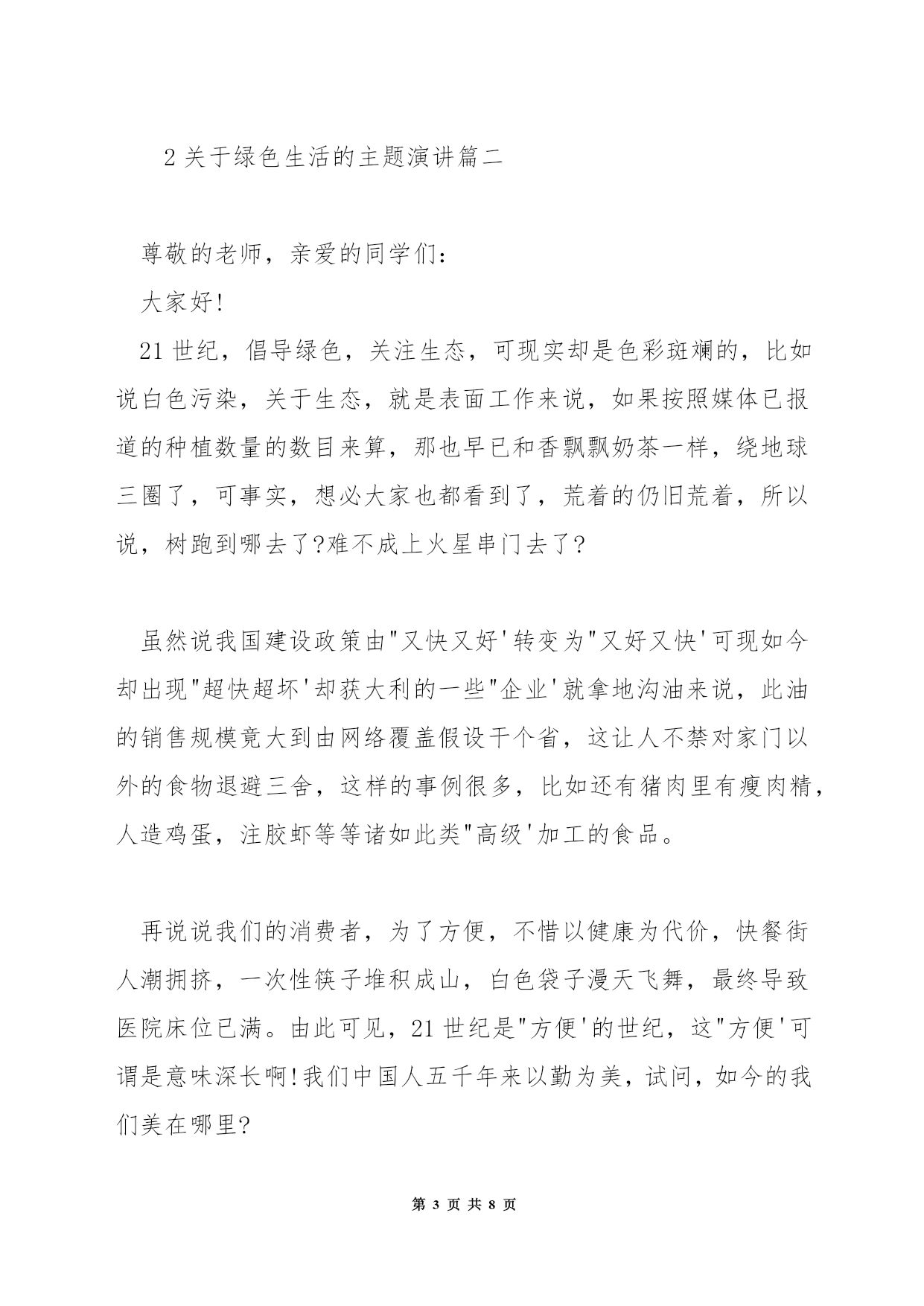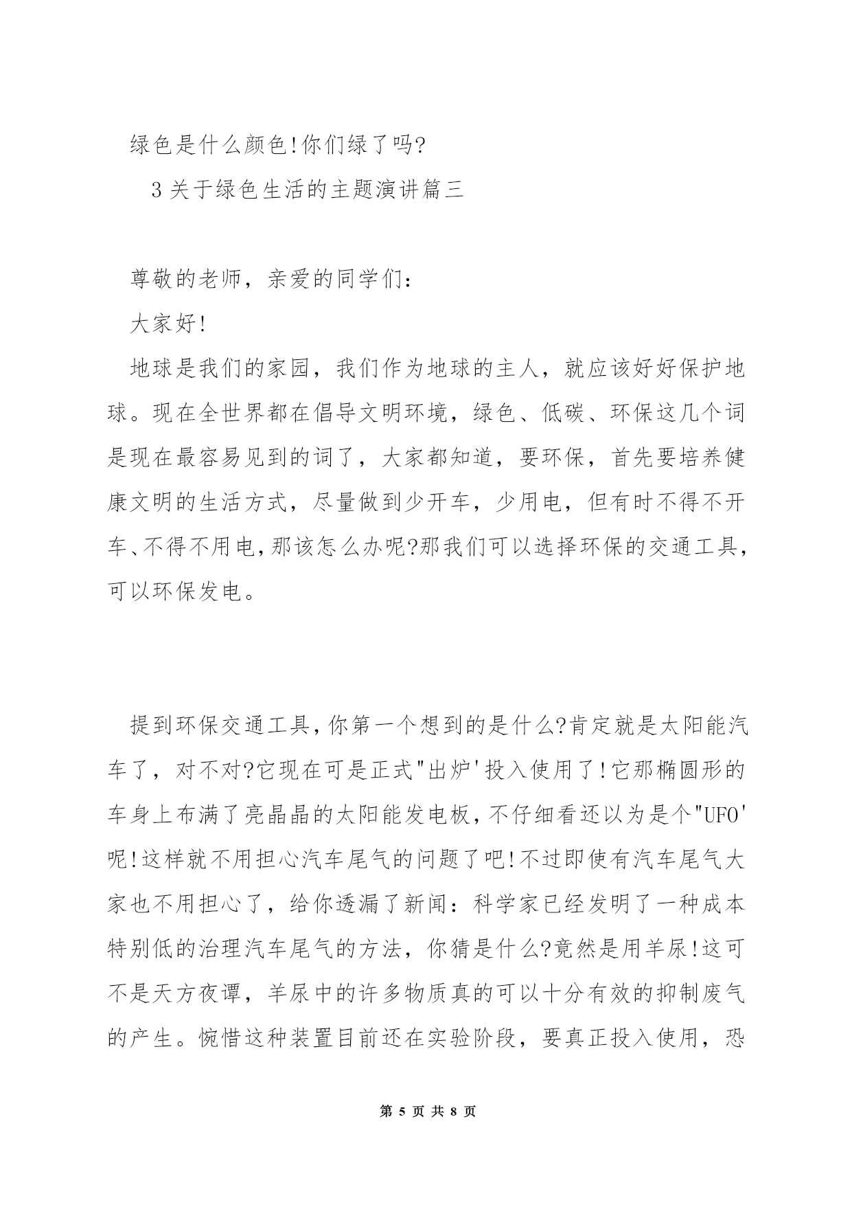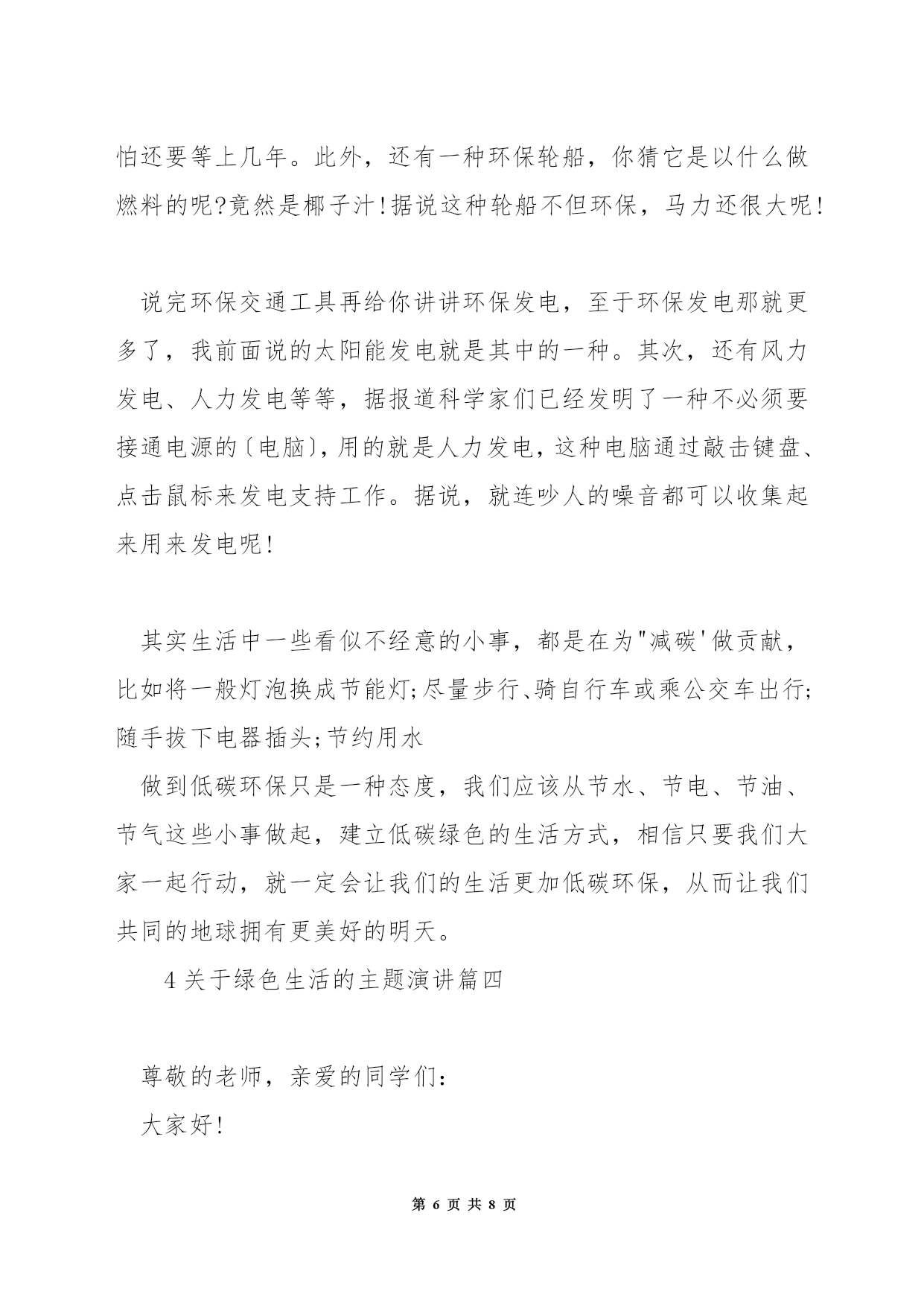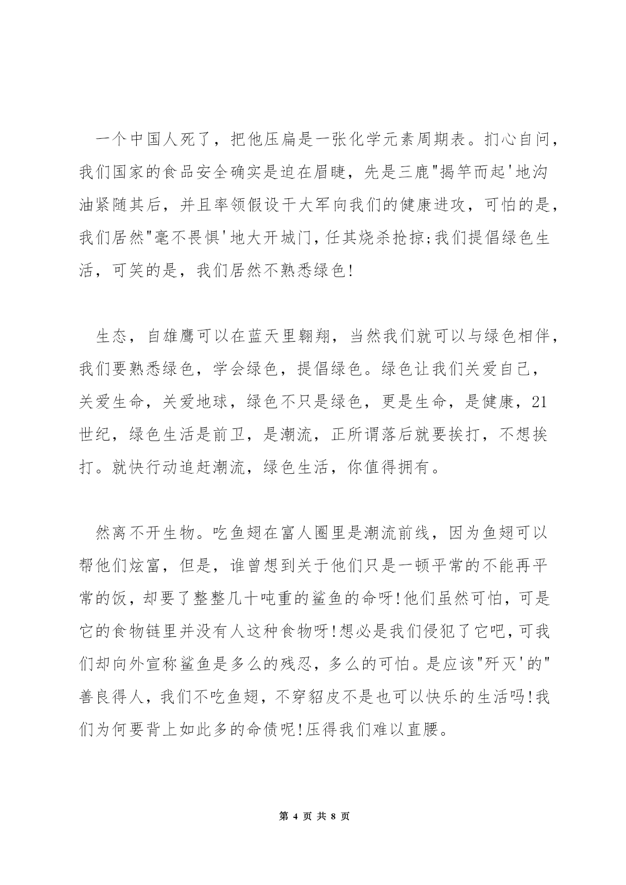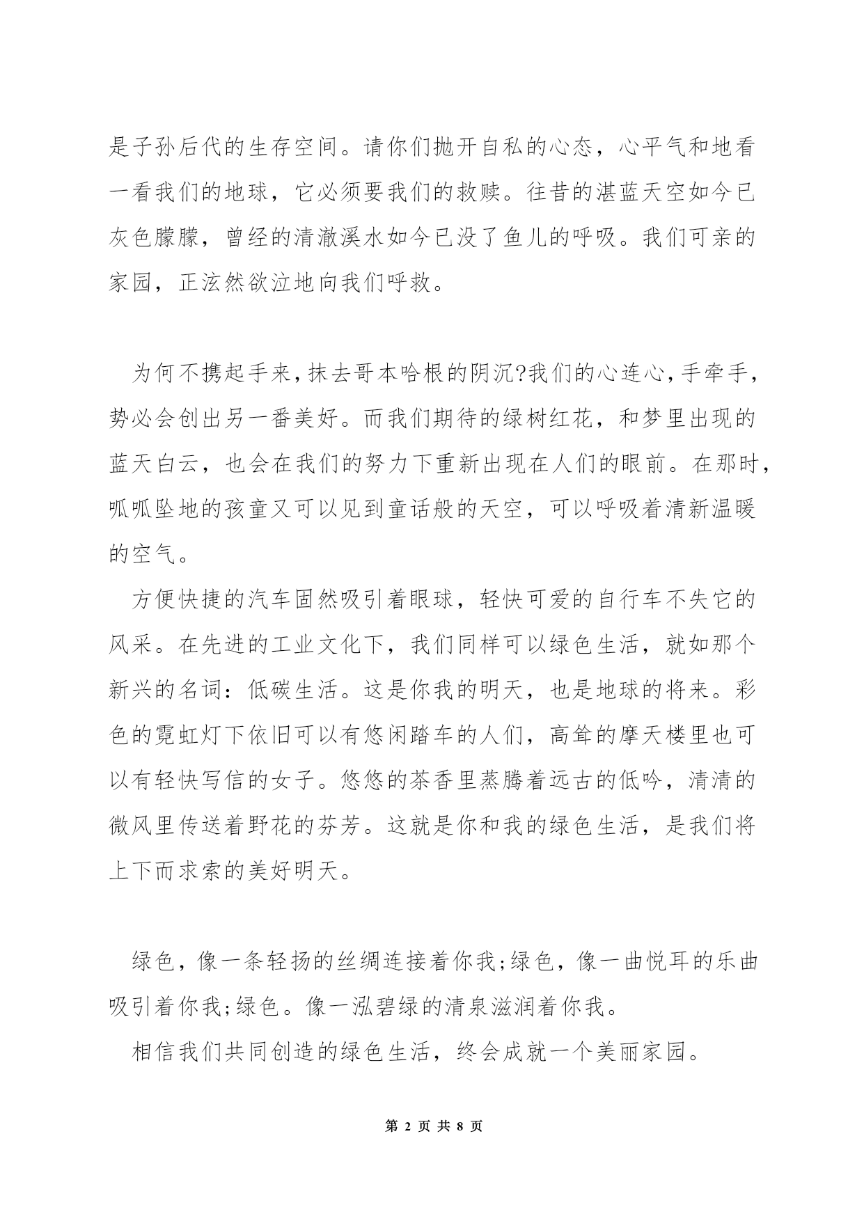 第PAGE\*MERGEFORMAT8页共NUMPAGES\*MERGEFORMAT8页关于绿色生活的主题演讲绿色生活!什么是绿色生活?就是环保、低碳的生活,我的生活就是围绕低碳、环保而进行的。下面是我为您整理的关于绿色生活的主题演讲,希望对你有所帮助。尊敬的老师,亲爱的同学们:大家好!我看见这茂盛而繁盛的绿树,如此清脆欲滴;我闻着这城市里的雨后天气,如此新鲜香甜;我走在霓虹闪烁的街道,如此快乐悠闲。梭罗说:"我闻声这远古的风,飒飒地吹过我的树林。'很多时候,我们是向往那种亲近自然,拥抱绿色的生活的。我们总羡慕海子的悠然自得,在心里说从明天起面朝大海春暖花开,何不从今天起就做个快乐的养马人?让你的气息与小甲虫息息相通,让每一次云卷云舒都分享你的快乐和悒郁。就像苏子说的:"惟江上之清风,与山间之明月,取之无禁,用之不竭'拥抱清泉溪水,临赏春花秋月,岂不快哉?哥本哈根的聒噪与对立无不暴露了现代人戴着的假面。在他们斤斤计较,一减再减条约上的排碳量目标,殊不知他们减少的正是子孙后代的生存空间。请你们抛开自私的心态,心平气和地看一看我们的地球,它必须要我们的救赎。往昔的湛蓝天空如今已灰色朦朦,曾经的清澈溪水如今已没了鱼儿的呼吸。我们可亲的家园,正泫然欲泣地向我们呼救。为何不携起手来,抹去哥本哈根的阴沉?我们的心连心,手牵手,势必会创出另一番美好。而我们期待的绿树红花,和梦里出现的蓝天白云,也会在我们的努力下重新出现在人们的眼前。在那时,呱呱坠地的孩童又可以见到童话般的天空,可以呼吸着清新温暖的空气。方便快捷的汽车固然吸引着眼球,轻快可爱的自行车不失它的风采。在先进的工业文化下,我们同样可以绿色生活,就如那个新兴的名词:低碳生活。这是你我的明天,也是地球的将来。彩色的霓虹灯下依旧可以有悠闲踏车的人们,高耸的摩天楼里也可以有轻快写信的女子。悠悠的茶香里蒸腾着远古的低吟,清清的微风里传送着野花的芬芳。这就是你和我的绿色生活,是我们将上下而求索的美好明天。绿色,像一条轻扬的丝绸连接着你我;绿色,像一曲悦耳的乐曲吸引着你我;绿色。像一泓碧绿的清泉滋润着你我。相信我们共同创造的绿色生活,终会成就一个美丽家园。2关于绿色生活的主题演讲篇二尊敬的老师,亲爱的同学们:大家好!21世纪,倡导绿色,关注生态,可现实却是色彩斑斓的,比如说白色污染,关于生态,就是表面工作来说,如果按照媒体已报道的种植数量的数目来算,那也早已和香飘飘奶茶一样,绕地球三圈了,可事实,想必大家也都看到了,荒着的仍旧荒着,所以说,树跑到哪去了?难不成上火星串门去了?虽然说我国建设政策由"又快又好'转变为"又好又快'可现如今却出现"超快超坏'却获大利的一些"企业'就拿地沟油来说,此油的销售规模竟大到由网络覆盖假设干个省,这让人不禁对家门以外的食物退避三舍,这样的事例很多,比如还有猪肉里有瘦肉精,人造鸡蛋,注胶虾等等诸如此类"高级'加工的食品。再说说我们的消费者,为了方便,不惜以健康为代价,快餐街人潮拥挤,一次性筷子堆积成山,白色袋子漫天飞舞,最终导致医院床位已满。由此可见,21世纪是"方便'的世纪,这"方便'可谓是意味深长啊!我们中国人五千年来以勤为美,试问,如今的我们美在哪里?一个中国人死了,把他压扁是一张化学元素周期表。扪心自问,我们国家的食品安全确实是迫在眉睫,先是三鹿"揭竿而起'地沟油紧随其后,并且率领假设干大军向我们的健康进攻,可怕的是,我们居然"毫不畏惧'地大开城门,任其烧杀抢掠;我们提倡绿色生活,可笑的是,我们居然不熟悉绿色!生态,自雄鹰可以在蓝天里翱翔,当然我们就可以与绿色相伴,我们要熟悉绿色,学会绿色,提倡绿色。绿色让我们关爱自己,关爱生命,关爱地球,绿色不只是绿色,更是生命,是健康,21世纪,绿色生活是前卫,是潮流,正所谓落后就要挨打,不想挨打。就快行动追赶潮流,绿色生活,你值得拥有。然离不开生物。吃鱼翅在富人圈里是潮流前线,因为鱼翅可以帮他们炫富,但是,谁曾想到关于他们只是一顿平常的不能再平常的饭,却要了整整几十吨重的鲨鱼的命呀!他们虽然可怕,可是它的食物链里并没有人这种食物呀!想必是我们侵犯了它吧,可我们却向外宣称鲨鱼是多么的残忍,多么的可怕。是应该"歼灭'的"善良得人,我们不吃鱼翅,不穿貂皮不是也可以快乐的生活吗!我们为何要背上如此多的命债呢!压得我们难以直腰。绿色是什么颜色!你们绿了吗?3关于绿色生活的主题演讲篇三尊敬的老师,亲爱的同学们:大家好!地球是我们的家园,我们作为地球的主人,就应该好好保护地球。现在全世界都在倡导文明环境,绿色、低碳、环保这几个词是现在最容易见到的词了,大家都知道,要环保,首先要培养健康文明的生活方式,尽量做到少开车,少用电,但有时不得不开车、不得不用电,那该怎么办呢?那我们可以选择环保的交通工具,可以环保