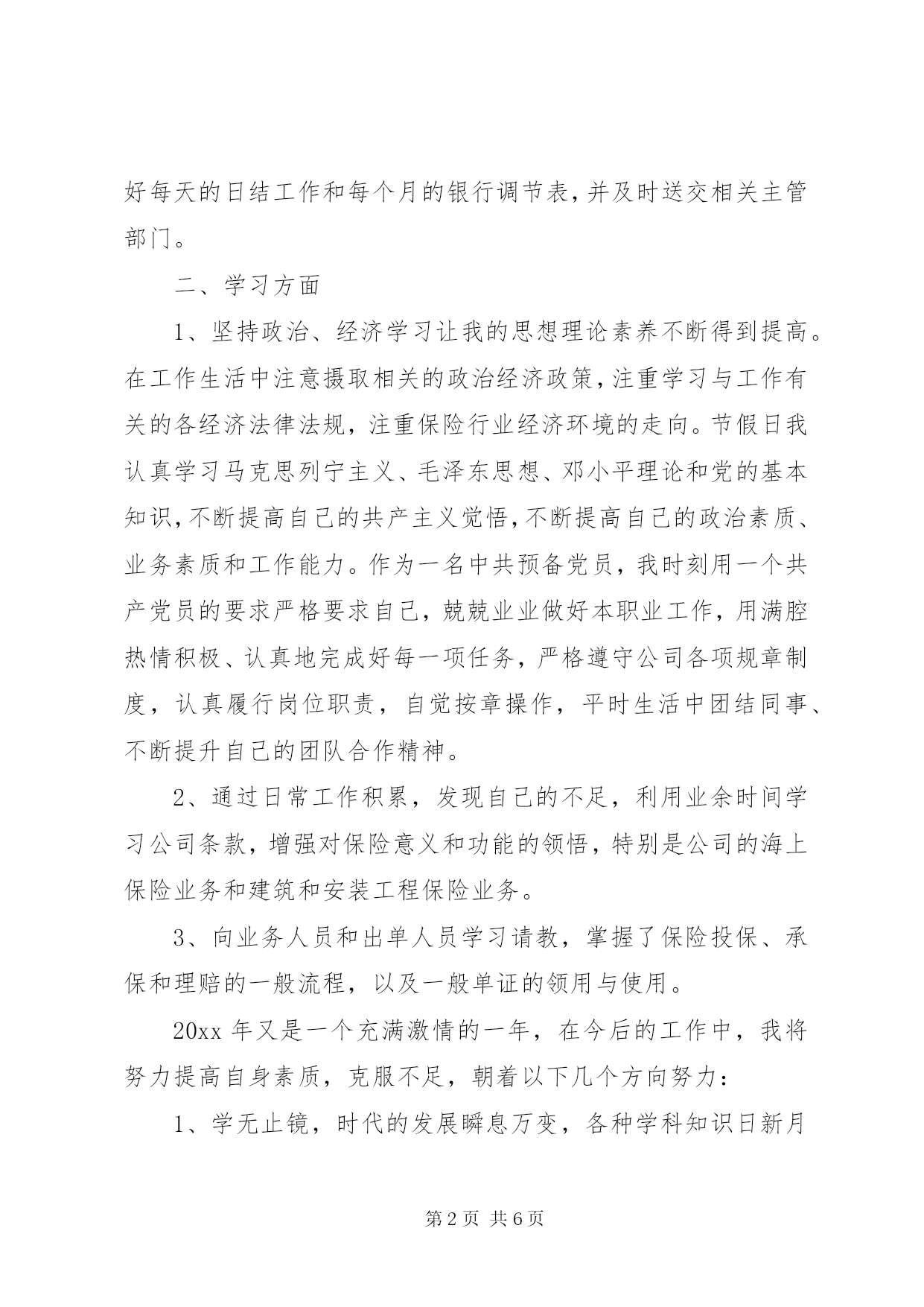 第PAGE\*Arabic\*MERGEFORMAT6页共NUMPAGES\*MERGEFORMAT6页保险年度个人工作总结毕业后从校园走出的那刻起,我怀着对保险的一份热忱与喜爱,带着我对保险的理论认识,走进了中国人民财产保险公司红桥支公司,通过这几个月的工作和学习,让我进一步接触到了保险,接触到了社会,将自己的理论知识付诸于实践,挑战了自己的工作能力和学习能力。在此我感谢这段时间公司领导对我的悉心教导和同事对我的及时帮助,让我用不懈的努力在实实在在的工作实践中换回了充实的社会经验和在校园课堂里无法学到的很多知识。总结起来,有以下几个方面:一、工作方面1、作为公司出纳,负责公司取赔款期间,我在收付、反映、监督三个方面尽到了应尽的职责,真正做到了每笔赔款无差错,给客户提供了最好的服务,维护了公司的形象。2、坚持财务手续,严格审核算(发票上必须有经手人、验收人、审批人签字方可报账),对不符手续的发票不付款。3、换岗担任公司核算员后,积极与银行相关部门联系,井然有序地完成了公司收和付两方面款项的及时进出账。4、整理历史未解决的款项明细,并积极向分公司相关部门请教,在他们的积极帮组和指导下共同完成了未达账项的清理。5、积极配合领导工作,及时检查每日当日的财务凭证,做好每天的日结工作和每个月的银行调节表,并及时送交相关主管部门。二、学习方面1、坚持政治、经济学习让我的思想理论素养不断得到提高。在工作生活中注意摄取相关的政治经济政策,注重学习与工作有关的各经济法律法规,注重保险行业经济环境的走向。节假日我认真学习马克思列宁主义、毛泽东思想、邓小平理论和党的基本知识,不断提高自己的共产主义觉悟,不断提高自己的政治素质、业务素质和工作能力。作为一名中共预备党员,我时刻用一个共产党员的要求严格要求自己,兢兢业业做好本职业工作,用满腔热情积极、认真地完成好每一项任务,严格遵守公司各项规章制度,认真履行岗位职责,自觉按章操作,平时生活中团结同事、不断提升自己的团队合作精神。2、通过日常工作积累,发现自己的不足,利用业余时间学习公司条款,增强对保险意义和功能的领悟,特别是公司的海上保险业务和建筑和安装工程保险业务。3、向业务人员和出单人员学习请教,掌握了保险投保、承保和理赔的一般流程,以及一般单证的领用与使用。20xx年又是一个充满激情的一年,在今后的工作中,我将努力提高自身素质,克服不足,朝着以下几个方向努力:1、学无止镜,时代的发展瞬息万变,各种学科知识日新月异。我将坚持不懈地努力学习各种保险知识,并用于指导实践工作。2、业精于勤而荒于嬉,在以后的工作中不断学习业务知识,通过多看、多学、多练来不断的提高自己的各项业务技能。3、不断锻炼自己的胆识和毅力,提高自己解决实际问题的能力,并在工作过程中慢慢克服急躁情绪,积极、热情、细致地的对待每一项工作。4、多做业务,提高自己的业务能力,为公司的经营发展多做一份贡献5、积极参加公司组织的每项活动,提高自己的沟通能力,更希望能参加公司组织的每次培训。作为中国人民财产保险公司的一份子,关注公司的发展更是自己的一份责任,对于公司明年的发展,我想谈谈我的想法:一、在竞争中求生存,在竞争中促发展面对保险业激烈的竞争形势,面对外部竞争所带来的业务压力,保持沉着冷静,客观面对现实情况寻求对策,与竞争对手们展开了一场品牌战、服务战,是我们值得考虑并值得去做的事情。我的考虑有以下几点:1、深入老客户企业,在客户企业中聘请信息员、联络员,并从其他保险企业抢挖业务尖子加盟我司,赢得回流业务,使其他保险公司的工作处于被动状态。2、服务更加人性化、亲密化。面对企业单位,公司经理室成员年初就对各大系统骨干企业实行划块包干,进行了多次回访,请他们对我司工作提出意见和建议,这一举措势必会得到了企业的充分肯定,让他们认为公司领导主动登门是人保财险的优质服务的充分体现,使客户对我司更加信任。面对个人业务,业务员也可以回访,平时保持联系。他们有什么需求,可上门拜访服务。3、要求所有中层干部走出办公室,对所有中小企业必须亲自上门拜访,对所有新保客户必须当面解释条款并承诺服务项目,与企业进行不断的联络,实行零距离接触,只要客户需要必须随叫随到,提供各方面服务。4、公司有新产品推出时,可以采取产品说明会的方式去吸引客户,真正作到与客户交流接触。这一点是公司推出投资型产品times;times;times;三代给我的启发,我有幸去中国人寿的产品说明会,觉得我们有必要跟寿险公司学习,做到真正的抓住客户。二、狠抓理赔和防灾防损质量的提高公司从狠抓第一现场的查勘率入手,坚持实事求是、迅速、及时、准确、合理的原则。只要接到报案,无论事故大小,无论白天黑夜,始终坚持赶到第一现场,掌握第一手资料,严格按照快速赔付流程,为客户提供力所能及
