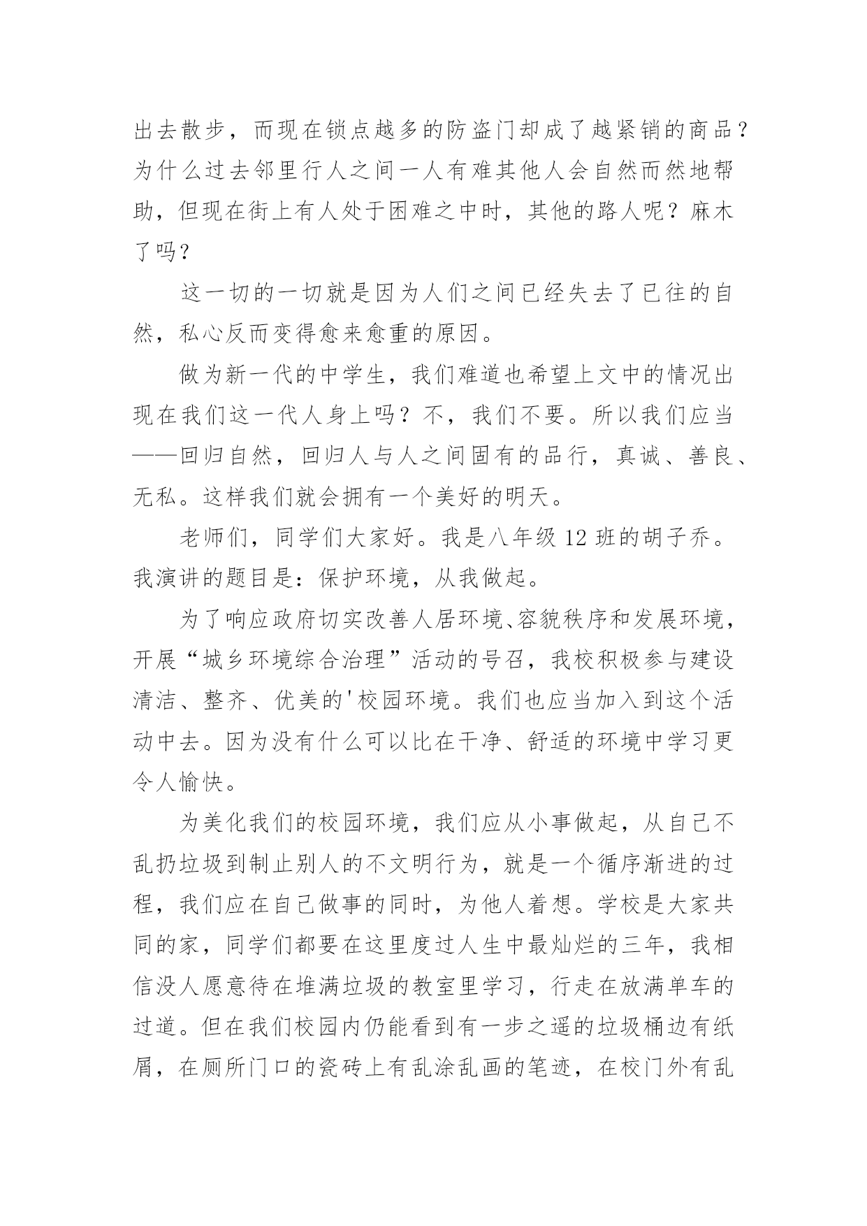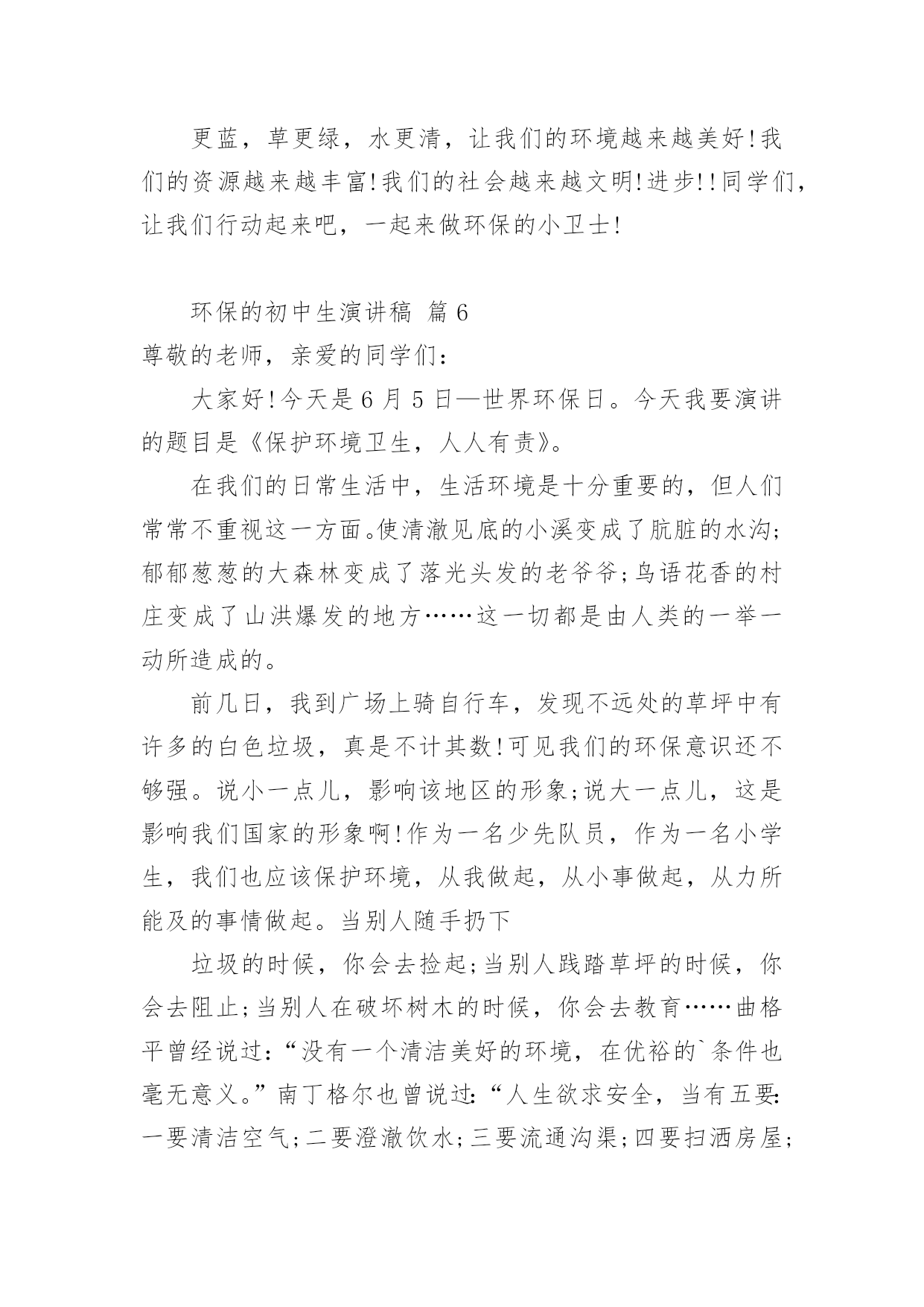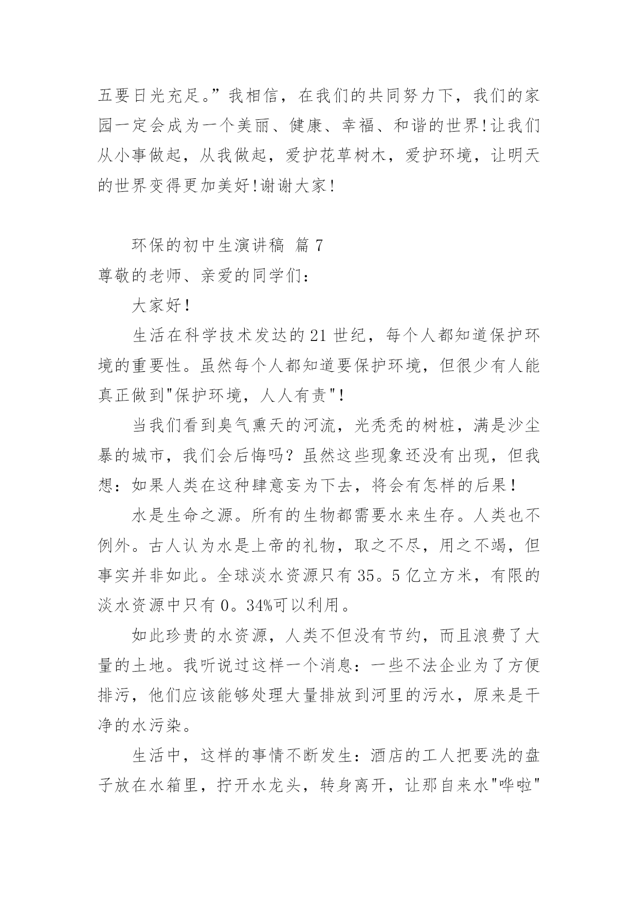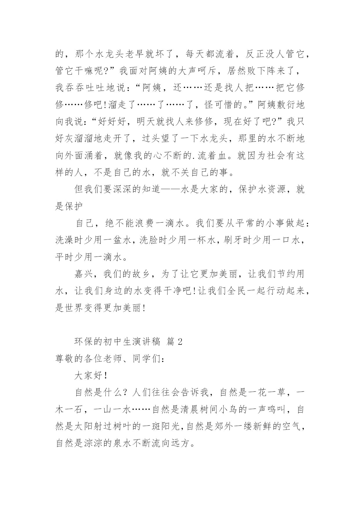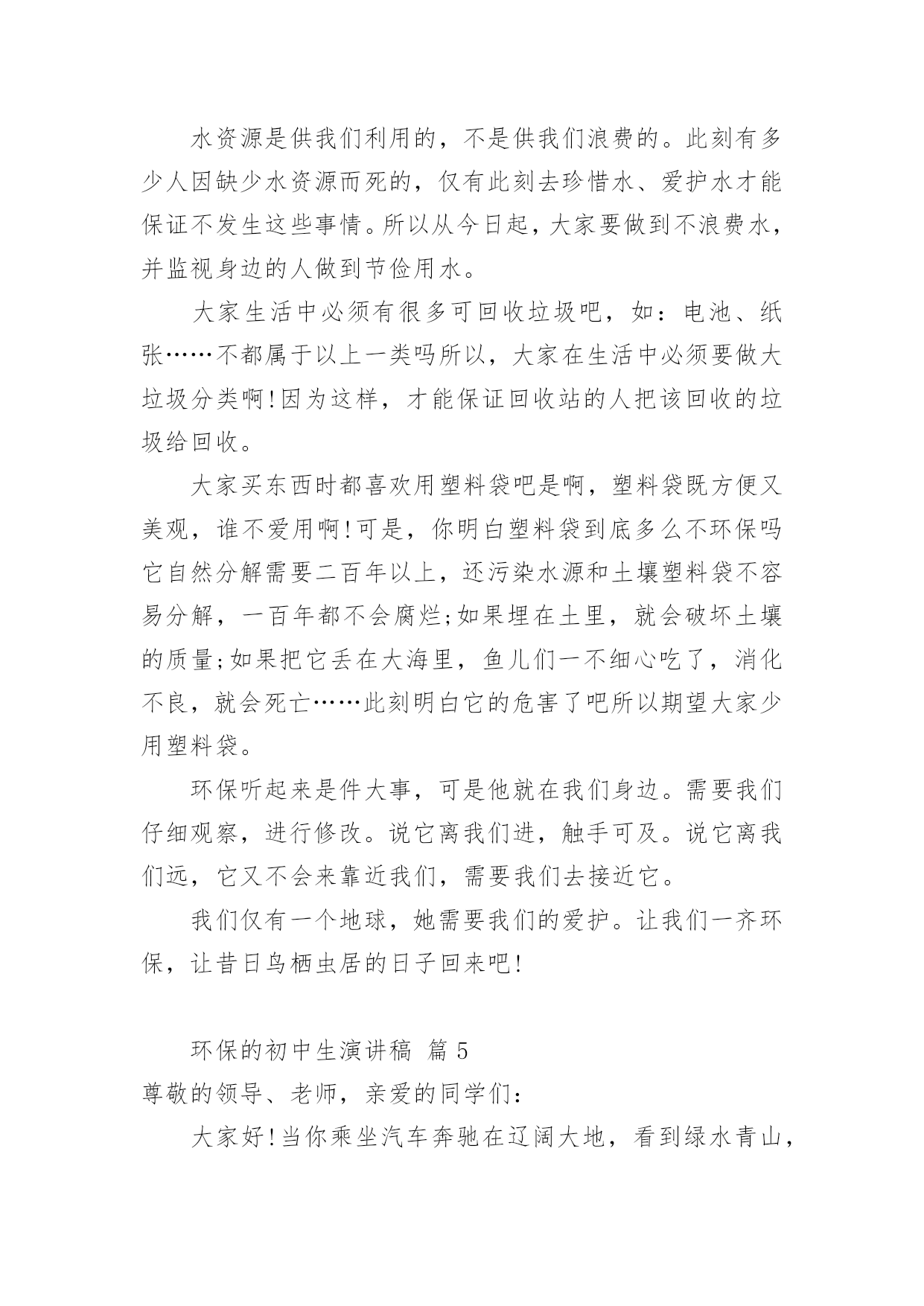 环保的初中生演讲稿演讲稿的写法比较灵活,可以根据会议的内容、一件事事后的感想、需要等情况而有所区别。在学习、工作生活中,在很多情况下我们需要用到演讲稿,相信写演讲稿是一个让许多人都头痛的问题,以下是小编精心整理的环保的初中生演讲稿,供大家参考借鉴,希望可以帮助到有需要的朋友。环保的初中生演讲稿篇1亲爱的老师、同学们:我虽然从小生在嘉兴,长在嘉兴,但被称为“鱼米之乡”、“江南水乡”的嘉兴的水去散发着令人作呕的难闻气味。水,占地表面积75%,但真正能喝的水又有多少?谁是我们的“母亲”,但我们多少次狠心的伤害了我们的“母亲”?水,为我们提供了宝贵的资源,但我们却身在福中不知福,大肆地浪费水,谁真正的做到国节约用水?有一次,我和妈妈去菜场买菜,到厕所洗手时发现了厕所里的水龙头,一直在“滴答滴答”地滴着水,好像断了线的珠子,无情的流着。我实在看不下去,找到保洁员阿姨,疑惑地问她:“阿姨,这个水龙头好像坏了,您找人来修修吧!”阿姨不屑一顾地说:“小孩子家家管那么多闲事干嘛?”我委屈地说:“可它在浪费水呀!水是有限的,浪费多了就要没了,您赶紧找人来修修吧!”阿姨不耐烦地说:“这是公家的水,又不是你家的,那个水龙头老早就坏了,每天都流着,反正没人管它,管它干嘛呢?”我面对阿姨的大声呵斥,居然败下阵来了,我吞吞吐吐地说:“阿姨,还……还是找人把……把它修修……修吧!溜走了……了……了,怪可惜的。”阿姨敷衍地向我说:“好好好,明天就找人来修修,现在好了吧?”我只好灰溜溜地走开了,过头望了一下水龙头,那里的水不断地向外面涌着,就像我的心不断的.流着血。就因为社会有这样的人,不是自己的水,就不关自己的事。但我们要深深的知道——水是大家的,保护水资源,就是保护自己,绝不能浪费一滴水。我们要从平常的小事做起:洗澡时少用一盆水,洗脸时少用一杯水,刷牙时少用一口水,平时少用一滴水。嘉兴,我们的故乡,为了让它更加美丽,让我们节约用水,让我们身边的水变得干净吧!让我们全民一起行动起来,是世界变得更加美丽!环保的初中生演讲稿篇2尊敬的各位老师、同学们:大家好!自然是什么?人们往往会告诉我,自然是一花一草,一木一石,一山一水……自然是清晨树间小鸟的一声鸣叫,自然是太阳射过树叶的一斑阳光,自然是郊外一缕新鲜的空气,自然是淙淙的泉水不断流向远方。难道说,自然只是环境自然这一小部分吗?答案当然是否定的,在现代社会中,人们对自然的要求往往不仅仅控制在环境自然中,而是对自然有了新的认识与要求。现代社会中的自然,已经是一个人做事、讲话或事情发展的一种状态,只有这种状态把握的好了,我们才会在将来的工作岗位上站稳脚跟。中国有句话叫“顺其自然”,我们所倡导、所要求的事物也是如此,按自己本来的、本所固有的发展方式而发展下来,而不是在无限多的外力促进下,在无数的要求之下,被迫形成的。在过去的社会里,人与人之间相处无疑是十分自然的,人们之间相互关心帮助,无论是贞观之治,康乾盛世还是解放后的社会主义改造时期都是如此,人与人以诚相待,人敬我一尺,我敬人一丈,因此,才会有“远亲不如近邻”等等话语流传下来。但随着社会不断地发展、进步,人们的价值观似乎起了变化,不能否认,有一部分人已经成为了“拜金主义者”,这样,他们就可以丢弃人性上的自然,而去无休止地为自己牟取钱财,因为在他们眼中,金钱是至高无上的。这一点,我们年轻人可能不太能明白,但上年纪的人往往就会问,为什么现代人与人之间相处得如此浮华,并没有实质的东西?为什么人与人之间是那么虚伪?为什么一个人总是像在防着其他的人。这些也并不难发现,过去人们为什么可以晚上不锁门就出去散步,而现在锁点越多的防盗门却成了越紧销的商品?为什么过去邻里行人之间一人有难其他人会自然而然地帮助,但现在街上有人处于困难之中时,其他的路人呢?麻木了吗?这一切的一切就是因为人们之间已经失去了已往的自然,私心反而变得愈来愈重的原因。做为新一代的中学生,我们难道也希望上文中的情况出现在我们这一代人身上吗?不,我们不要。所以我们应当——回归自然,回归人与人之间固有的品行,真诚、善良、无私。这样我们就会拥有一个美好的明天。老师们,同学们大家好。我是八年级12班的胡子乔。我演讲的题目是:保护环境,从我做起。为了响应政府切实改善人居环境、容貌秩序和发展环境,开展“城乡环境综合治理”活动的号召,我校积极参与建设清洁、整齐、优美的'校园环境。我们也应当加入到这个活动中去。因为没有什么可以比在干净、舒适的环境中学习更令人愉快。为美化我们的校园环境,我们应从小事做起,从自己不乱扔垃圾到制止别人的不文明行为,就是一个循序渐进的过程,我们应在自己做事的同时,为他人着想。学校是大家共同的家,同学们都要在这里度过人生中最灿烂的三年,我相信没人愿意待在堆满垃圾的教室里学习,行走在放满单车的过道。但在我们