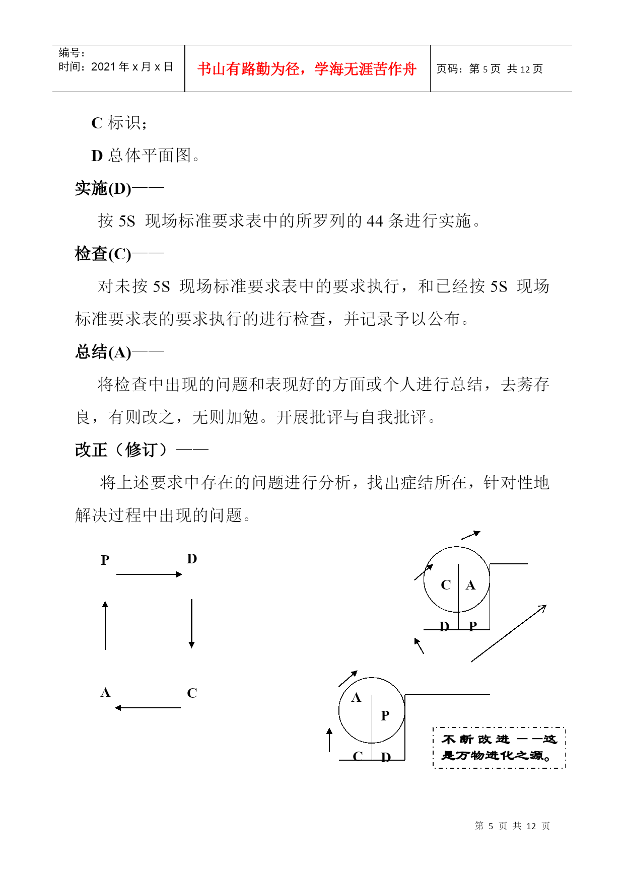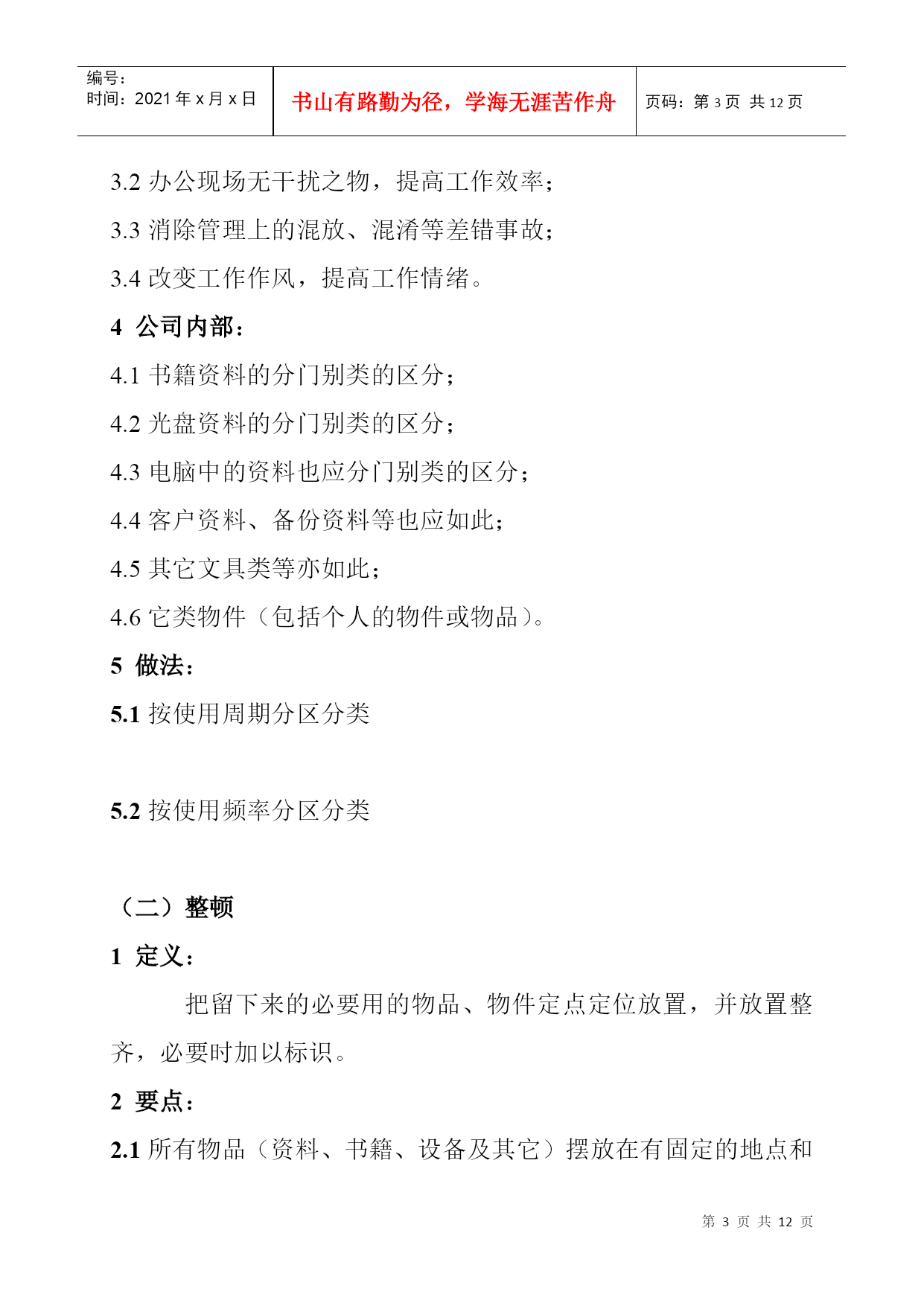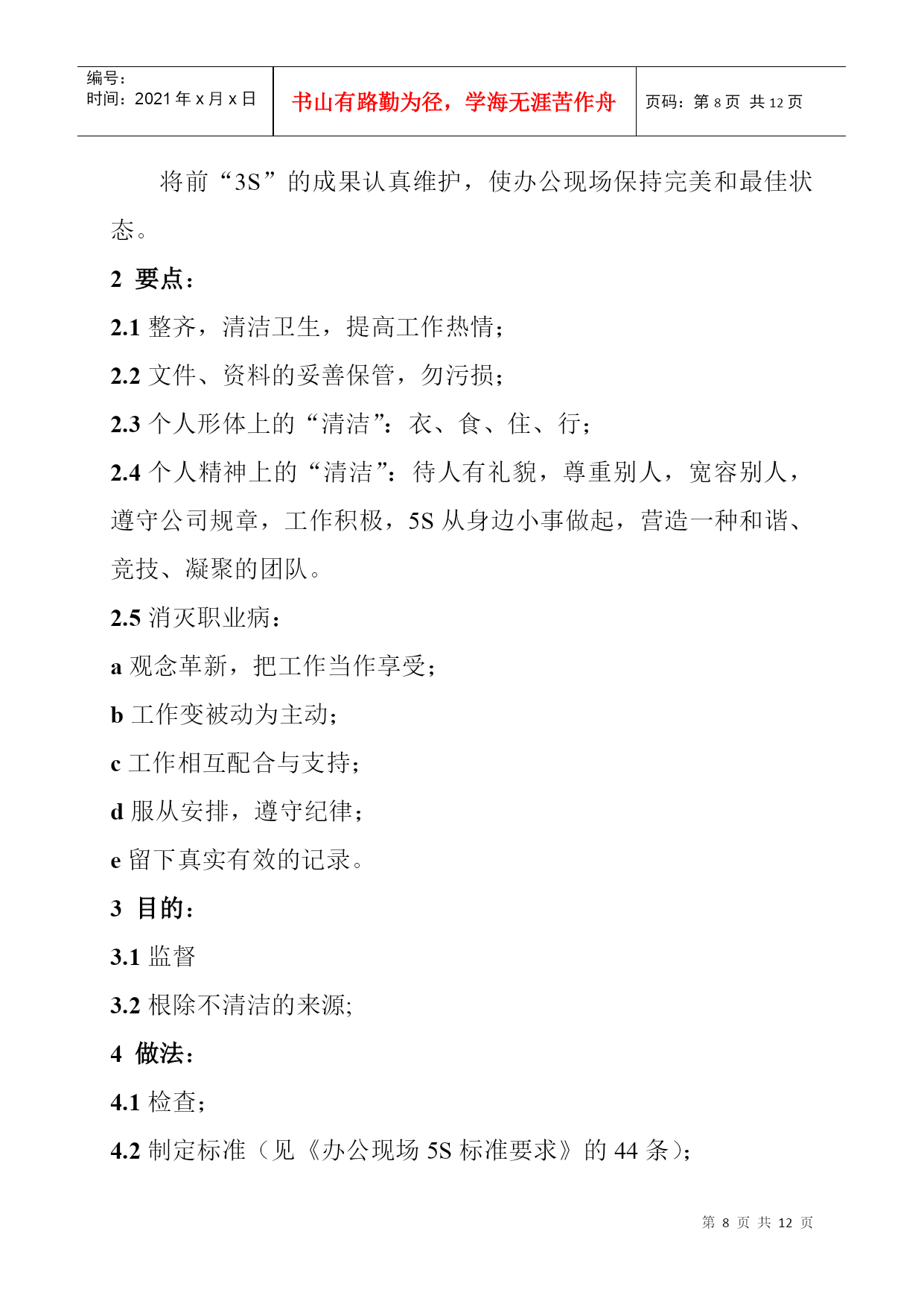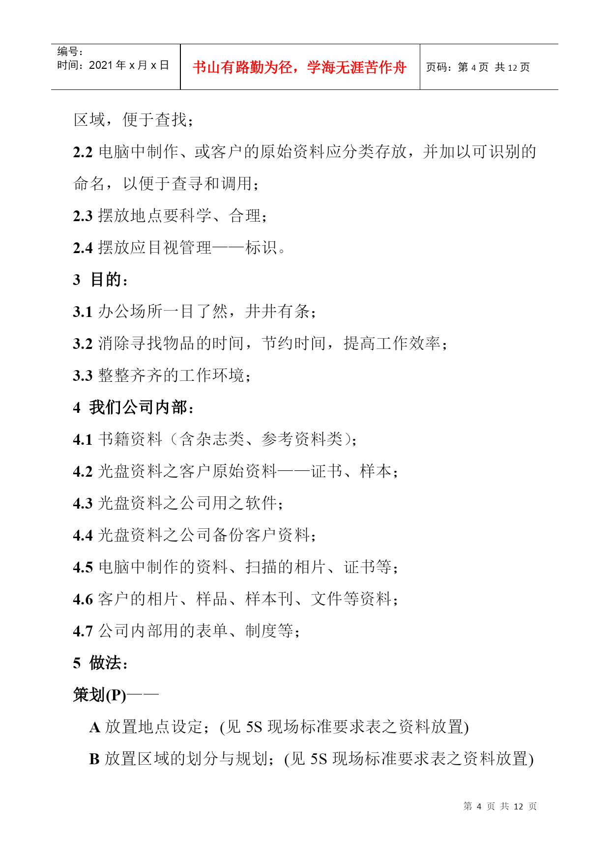 编号:时间:2021年x月x日书山有路勤为径,学海无涯苦作舟页码:第PAGE12页共NUMPAGES12页第PAGE\*MERGEFORMAT12页共NUMPAGES\*MERGEFORMAT12页“5S”活动的理论与实务研讨讲义主研讨人:赵舰航第一章5S活动概述一5S的含义5S是指整理(Seiri)、整顿(Seito)、清扫(Seizo)、清洁(Seimitsu)和素养(Shitsuke)这5个词的缩写。因这个5个词在日语中罗马拼音的第一个字母均是“S”开头,故简称为“5S”。二5S的起源5S早起源于日本,开始为3S,即整理、整顿、清扫。它相当于我国企业(公司)所开展的文明生产活动。三5S的推广现在很多人又有6S、7S、8S,可能以后还会有9S、10S等。6S=5S+Safety(安全)。7S=6S+Systematize(制度化)。8S=7S+Standardize(标准化)。四5S的对象即指——办公现场的“环境”。对办公现场环境进行综合考虑,再制订出相应的计划措施与标准,从而达到规范化管理。五5S的核心是——养成习惯,并形成习惯化——素养。六就我们公司来说,5S——指办公室所有横向的和纵向的空间,包括:地面(工作间、会客厅、走廊、卫生间等)、办公桌、电脑(主机、显示器、鼠标、线束等)、打印机、扫描仪、资料柜、中转柜架、文件架和文具筒等;也包括电脑中的资料,个人的记录稿、个人的形体,个人的精神、及工作流程、管理流程等。第二章5S活动的内容(上)(一)整理1定义:把工作办公场所中的所有物品区分为有必要的和不必要的,所有没有必要的都要清除或放在其它地方。2要点:2.1对办公现场的摆放现状和停滞不前的现状进行分类,区分什么是现场需要的,什么是现场不需要的。2.2对办公现场不需要的物件、物品,要坚决清理出办公现场;2.3对办公现场的各个死角,都要彻底搜寻和清理,达到办公现场无不用之物。2.4对不能再使用的(报废的)物件,也应区分并加以处置。3目的:3.1改善和增加办公所用的空间,改善和增加电脑中的空间;3.2办公现场无干扰之物,提高工作效率;3.3消除管理上的混放、混淆等差错事故;3.4改变工作作风,提高工作情绪。4公司内部:4.1书籍资料的分门别类的区分;4.2光盘资料的分门别类的区分;4.3电脑中的资料也应分门别类的区分;4.4客户资料、备份资料等也应如此;4.5其它文具类等亦如此;4.6它类物件(包括个人的物件或物品)。5做法:5.1按使用周期分区分类5.2按使用频率分区分类(二)整顿1定义:把留下来的必要用的物品、物件定点定位放置,并放置整齐,必要时加以标识。2要点:2.1所有物品(资料、书籍、设备及其它)摆放在有固定的地点和区域,便于查找;2.2电脑中制作、或客户的原始资料应分类存放,并加以可识别的命名,以便于查寻和调用;2.3摆放地点要科学、合理;2.4摆放应目视管理——标识。3目的:3.1办公场所一目了然,井井有条;3.2消除寻找物品的时间,节约时间,提高工作效率;3.3整整齐齐的工作环境;4我们公司内部:4.1书籍资料(含杂志类、参考资料类);4.2光盘资料之客户原始资料——证书、样本;4.3光盘资料之公司用之软件;4.4光盘资料之公司备份客户资料;4.5电脑中制作的资料、扫描的相片、证书等;4.6客户的相片、样品、样本刊、文件等资料;4.7公司内部用的表单、制度等;5做法:策划(P)——A放置地点设定;(见5S现场标准要求表之资料放置)B放置区域的划分与规划;(见5S现场标准要求表之资料放置)C标识;D总体平面图。实施(D)——按5S现场标准要求表中的所罗列的44条进行实施。检查(C)——对未按5S现场标准要求表中的要求执行,和已经按5S现场标准要求表的要求执行的进行检查,并记录予以公布。总结(A)——将检查中出现的问题和表现好的方面或个人进行总结,去莠存良,有则改之,无则加勉。开展批评与自我批评。改正(修订)——将上述要求中存在的问题进行分析,找出症结所在,针对性地解决过程中出现的问题。DPACDPACAP不断改进——这是万物进化之源。CD(上述操作是完全引用现代企业管理理念之PDCA循环运作系统)。第三章5S活动的内容(下)(三)清扫1定义:将办公场所中公共的部分、自己的部分,工作所用的设备,附属设备等清理干净,并保持其干净与亮丽。(注:含横向的空间和纵向的空间——第一章的第六条)2要点:2.1公共区域的卫生打扫,在外请的钟点工;2.2每周三下午下班后应进