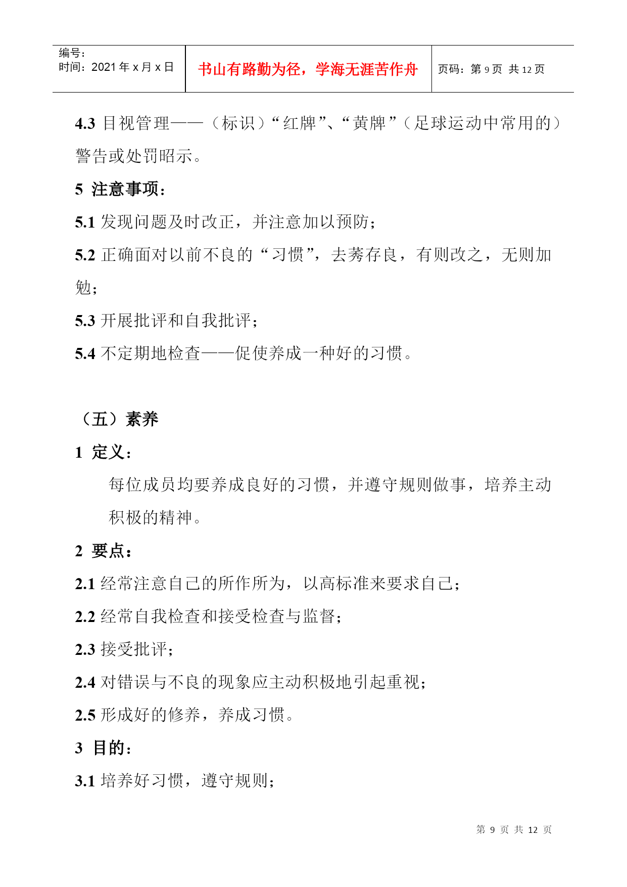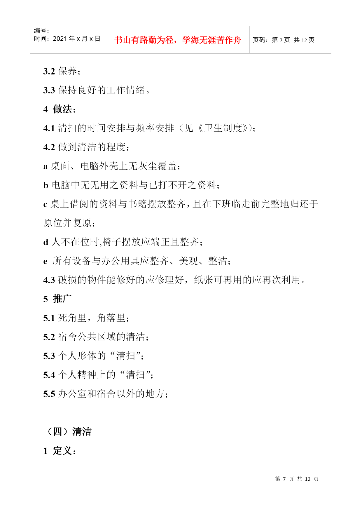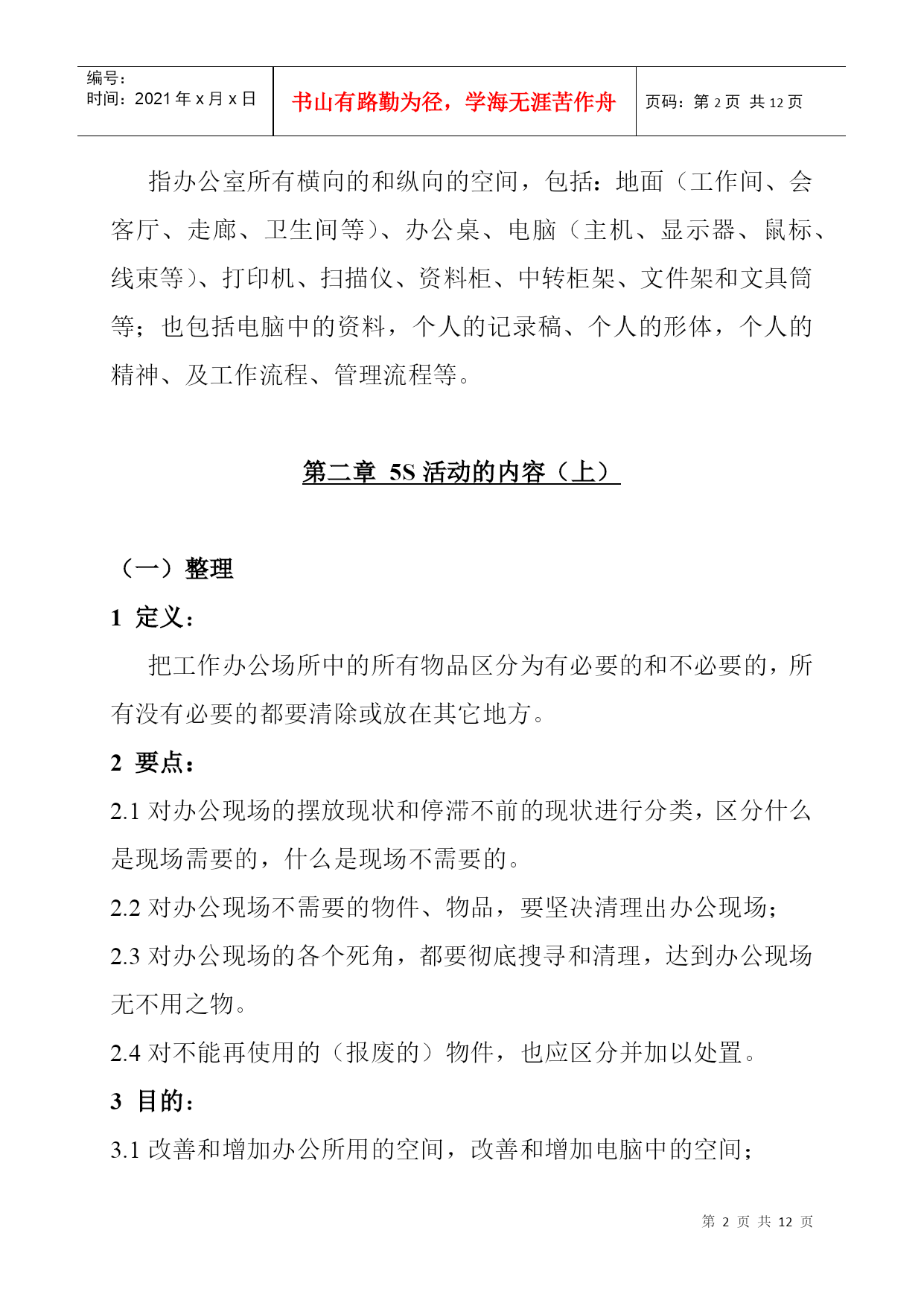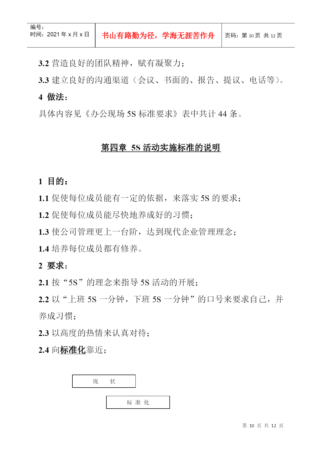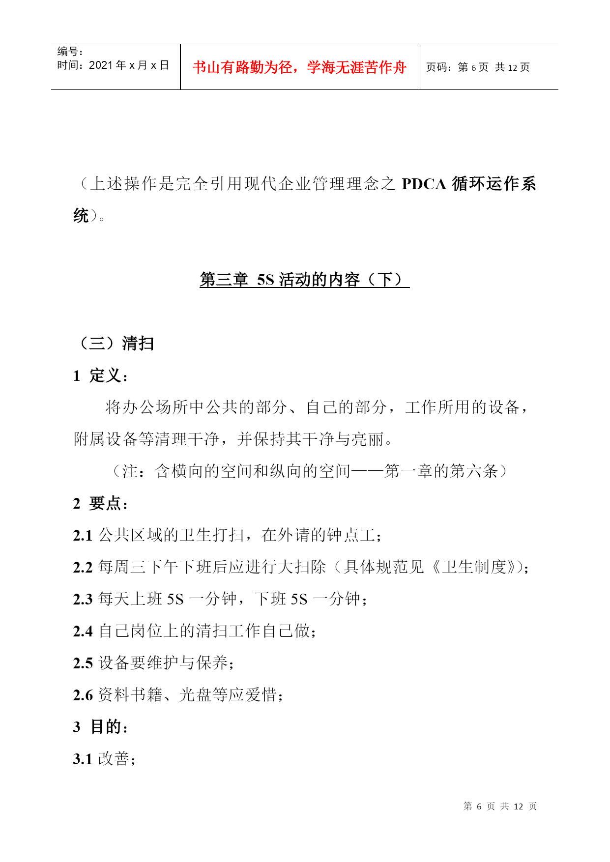 编号:时间:2021年x月x日书山有路勤为径,学海无涯苦作舟页码:第PAGE12页共NUMPAGES12页第PAGE\*MERGEFORMAT12页共NUMPAGES\*MERGEFORMAT12页“5S”活动的理论与实务研讨讲义主研讨人:赵舰航第一章5S活动概述一5S的含义5S是指整理(Seiri)、整顿(Seito)、清扫(Seizo)、清洁(Seimitsu)和素养(Shitsuke)这5个词的缩写。因这个5个词在日语中罗马拼音的第一个字母均是“S”开头,故简称为“5S”。二5S的起源5S早起源于日本,开始为3S,即整理、整顿、清扫。它相当于我国企业(公司)所开展的文明生产活动。三5S的推广现在很多人又有6S、7S、8S,可能以后还会有9S、10S等。6S=5S+Safety(安全)。7S=6S+Systematize(制度化)。8S=7S+Standardize(标准化)。四5S的对象即指——办公现场的“环境”。对办公现场环境进行综合考虑,再制订出相应的计划措施与标准,从而达到规范化管理。五5S的核心是——养成习惯,并形成习惯化——素养。六就我们公司来说,5S——指办公室所有横向的和纵向的空间,包括:地面(工作间、会客厅、走廊、卫生间等)、办公桌、电脑(主机、显示器、鼠标、线束等)、打印机、扫描仪、资料柜、中转柜架、文件架和文具筒等;也包括电脑中的资料,个人的记录稿、个人的形体,个人的精神、及工作流程、管理流程等。第二章5S活动的内容(上)(一)整理1定义:把工作办公场所中的所有物品区分为有必要的和不必要的,所有没有必要的都要清除或放在其它地方。2要点:2.1对办公现场的摆放现状和停滞不前的现状进行分类,区分什么是现场需要的,什么是现场不需要的。2.2对办公现场不需要的物件、物品,要坚决清理出办公现场;2.3对办公现场的各个死角,都要彻底搜寻和清理,达到办公现场无不用之物。2.4对不能再使用的(报废的)物件,也应区分并加以处置。3目的:3.1改善和增加办公所用的空间,改善和增加电脑中的空间;3.2办公现场无干扰之物,提高工作效率;3.3消除管理上的混放、混淆等差错事故;3.4改变工作作风,提高工作情绪。4公司内部:4.1书籍资料的分门别类的区分;4.2光盘资料的分门别类的区分;4.3电脑中的资料也应分门别类的区分;4.4客户资料、备份资料等也应如此;4.5其它文具类等亦如此;4.6它类物件(包括个人的物件或物品)。5做法:5.1按使用周期分区分类5.2按使用频率分区分类(二)整顿1定义:把留下来的必要用的物品、物件定点定位放置,并放置整齐,必要时加以标识。2要点:2.1所有物品(资料、书籍、设备及其它)摆放在有固定的地点和区域,便于查找;2.2电脑中制作、或客户的原始资料应分类存放,并加以可识别的命名,以便于查寻和调用;2.3摆放地点要科学、合理;2.4摆放应目视管理——标识。3目的:3.1办公场所一目了然,井井有条;3.2消除寻找物品的时间,节约时间,提高工作效率;3.3整整齐齐的工作环境;4我们公司内部:4.1书籍资料(含杂志类、参考资料类);4.2光盘资料之客户原始资料——证书、样本;4.3光盘资料之公司用之软件;4.4光盘资料之公司备份客户资料;4.5电脑中制作的资料、扫描的相片、证书等;4.6客户的相片、样品、样本刊、文件等资料;4.7公司内部用的表单、制度等;5做法:策划(P)——A放置地点设定;(见5S现场标准要求表之资料放置)B放置区域的划分与规划;(见5S现场标准要求表之资料放置)C标识;D总体平面图。实施(D)——按5S现场标准要求表中的所罗列的44条进行实施。检查(C)——对未按5S现场标准要求表中的要求执行,和已经按5S现场标准要求表的要求执行的进行检查,并记录予以公布。总结(A)——将检查中出现的问题和表现好的方面或个人进行总结,去莠存良,有则改之,无则加勉。开展批评与自我批评。改正(修订)——将上述要求中存在的问题进行分析,找出症结所在,针对性地解决过程中出现的问题。DPACDPACAP不断改进——这是万物进化之源。CD(上述操作是完全引用现代企业管理理念之PDCA循环运作系统)。第三章5S活动的内容(下)(三)清扫1定义:将办公场所中公共的部分、自己的部分,工作所用的设备,附属设备等清理干净,并保持其干净与亮丽。(注:含横向的空间和纵向的空间——第一章的第六条)2要点:2.1公共区域的卫生打扫,在外请的钟点工;2.2每周三下午下班后应进