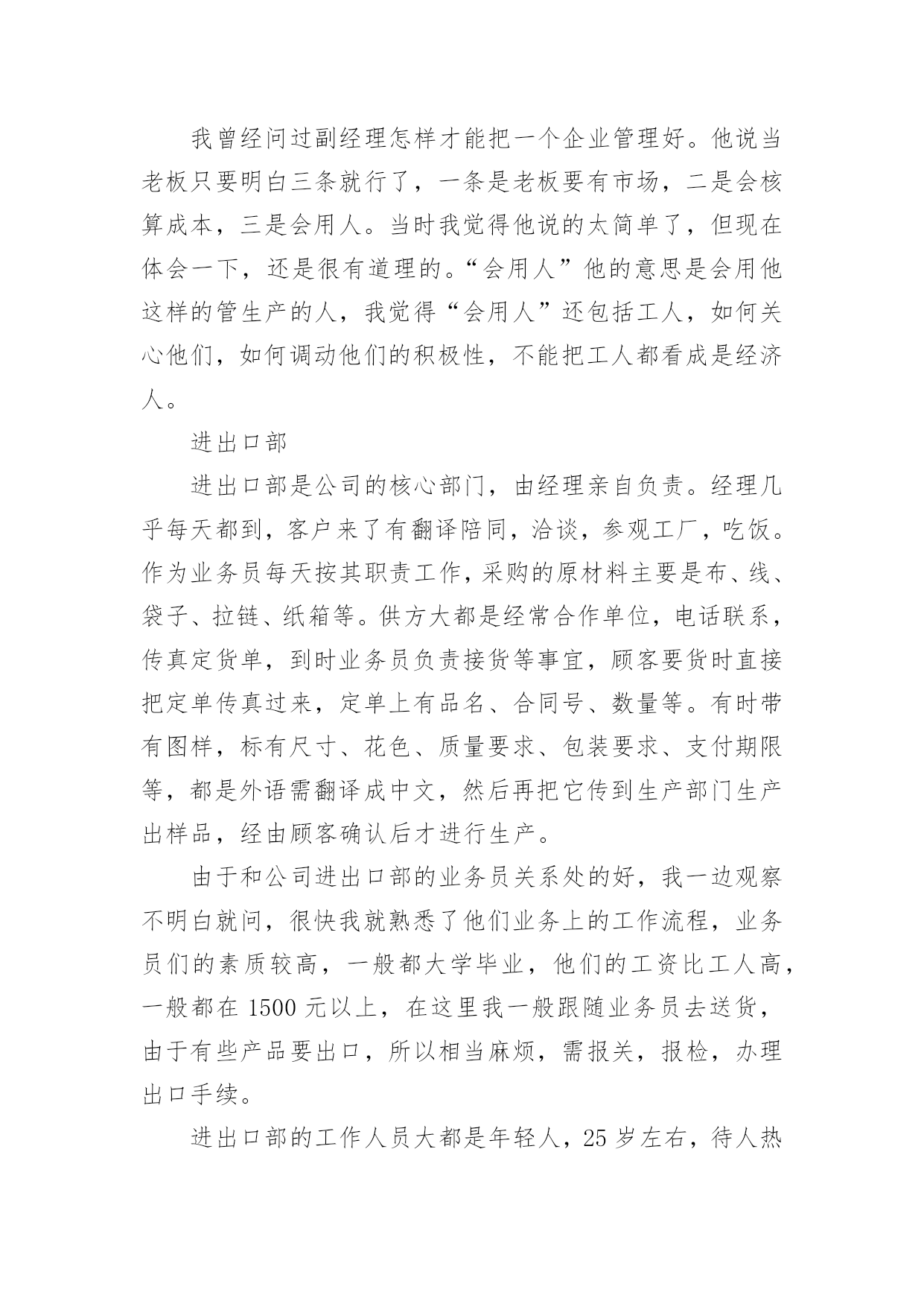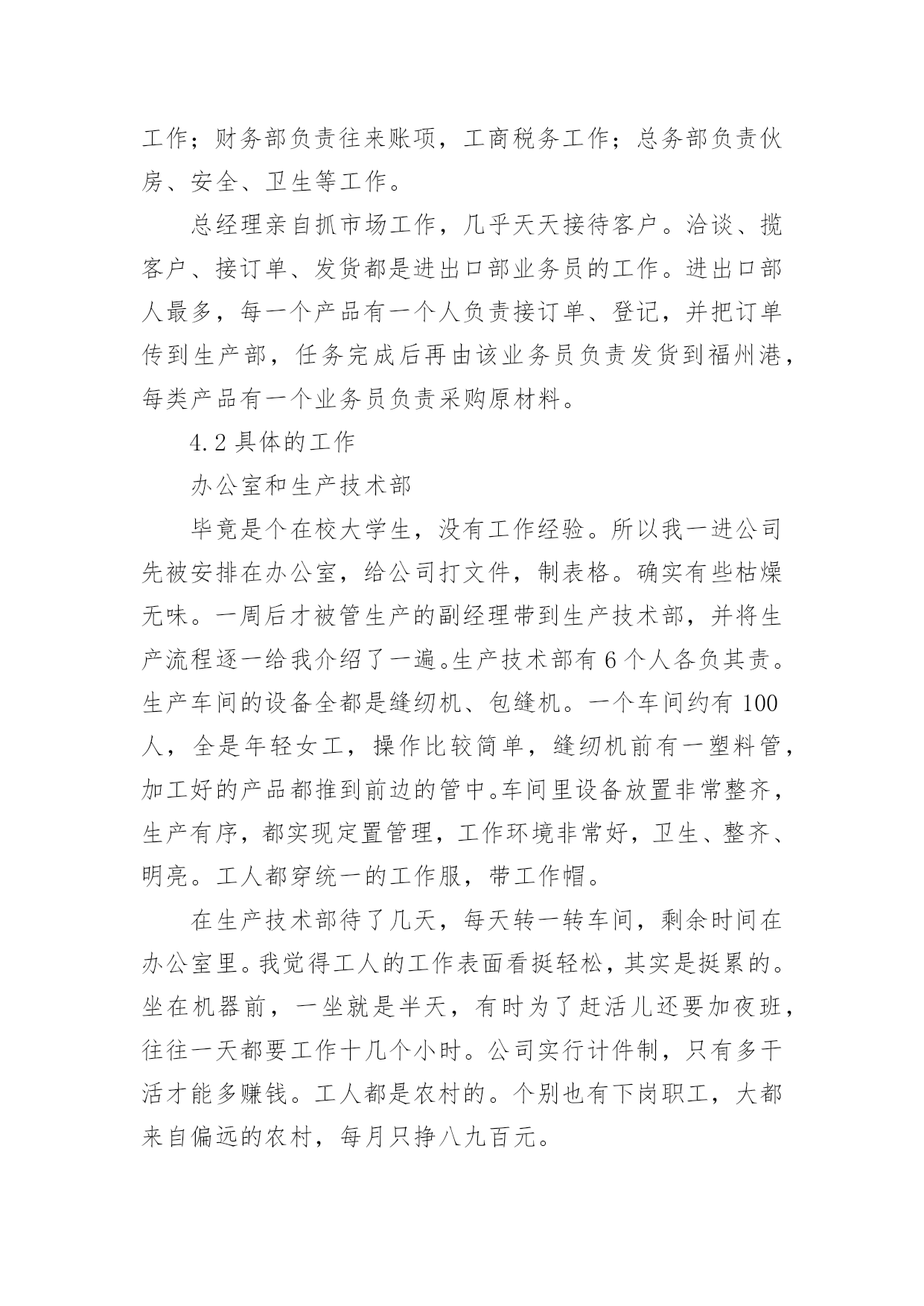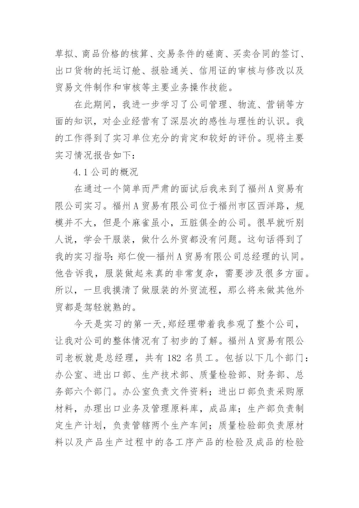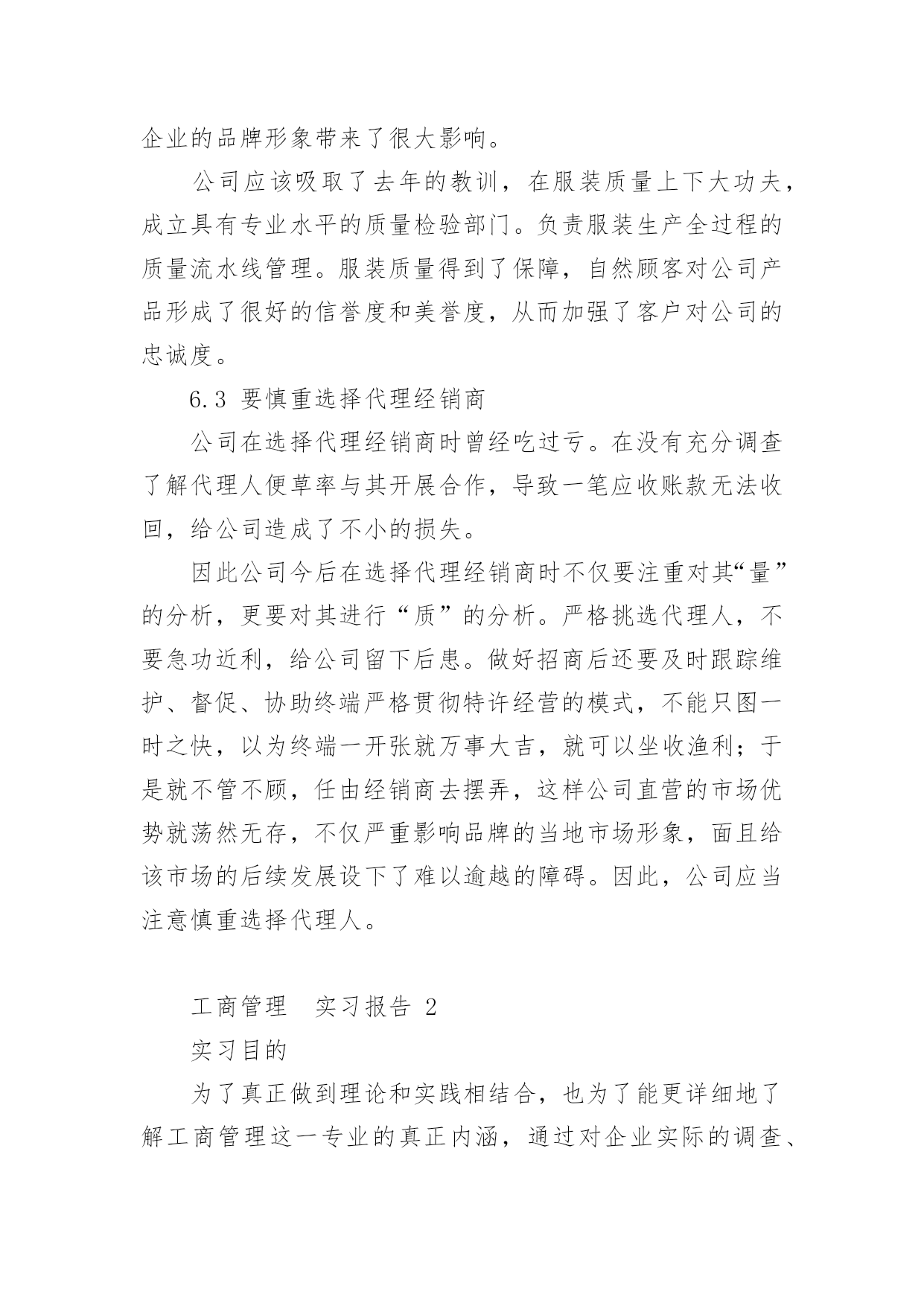 工商管理实习报告工商管理实习报告(通用8篇)在当下这个社会中,需要使用报告的情况越来越多,我们在写报告的时候要注意逻辑的合理性。一听到写报告就拖延症懒癌齐复发?下面是小编为大家整理的工商管理专业实习报告,希望能够帮助到大家。工商管理实习报告11实习目的为了真正做到理论和实践相结合,也为了能更详细地了解工商管理这一专业的真正内涵,通过对企业实际的调查、研究,熟悉外贸实务的具体操作程序,增强感性认识,初步培养学生理论联系实际的能力和分析问题与解决问题的能力。真正做到融会贯通,切实达到实习的目的。2实习时间xx年xx月xx日3实习单位福州A贸易有限公司4实习内容实习期间,我的岗位是管理培训生。我了解到了这个岗位的职责,工作内容,并参与策划了公司的各项活动,并提出了自己的想法。根据相关的各种贸易法律与惯例,结合实际情况,以贸易的基本过程为主线,针对贸易中业务函电的草拟、商品价格的核算、交易条件的磋商、买卖合同的签订、出口货物的托运订舱、报验通关、信用证的审核与修改以及贸易文件制作和审核等主要业务操作技能。在此期间,我进一步学习了公司管理、物流、营销等方面的知识,对企业经营有了深层次的感性与理性的认识。我的工作得到了实习单位充分的肯定和较好的评价。现将主要实习情况报告如下:4.1公司的概况在通过一个简单而严肃的面试后我来到了福州A贸易有限公司实习。福州A贸易有限公司位于福州市区西洋路,规模并不大,但是个麻雀虽小,五脏俱全的公司。很早就听别人说,学会干服装,做什么外贸都没有问题。这句话得到了我的实习指导:郑仁俊—福州A贸易有限公司总经理的认同。他告诉我,服装做起来真的非常复杂,需要涉及很多方面。所以,一旦我摸清了做服装的外贸流程,那么将来做其他外贸都是驾轻就熟的。今天是实习的第一天,郑经理带着我参观了整个公司,让我对公司的整体情况有了初步的了解。福州A贸易有限公司老板就是总经理,共有182名员工。包括以下几个部门:办公室、进出口部、生产技术部、质量检验部、财务部、总务部六个部门。办公室负责文件资料;进出口部负责采购原材料,办理出口业务及管理原料库,成品库;生产部负责制定生产计划,负责管辖两个生产车间;质量检验部负责原材料以及产品生产过程中的各工序产品的检验及成品的检验工作;财务部负责往来账项,工商税务工作;总务部负责伙房、安全、卫生等工作。总经理亲自抓市场工作,几乎天天接待客户。洽谈、揽客户、接订单、发货都是进出口部业务员的工作。进出口部人最多,每一个产品有一个人负责接订单、登记,并把订单传到生产部,任务完成后再由该业务员负责发货到福州港,每类产品有一个业务员负责采购原材料。4.2具体的工作办公室和生产技术部毕竟是个在校大学生,没有工作经验。所以我一进公司先被安排在办公室,给公司打文件,制表格。确实有些枯燥无味。一周后才被管生产的副经理带到生产技术部,并将生产流程逐一给我介绍了一遍。生产技术部有6个人各负其责。生产车间的设备全都是缝纫机、包缝机。一个车间约有100人,全是年轻女工,操作比较简单,缝纫机前有一塑料管,加工好的产品都推到前边的管中。车间里设备放置非常整齐,生产有序,都实现定置管理,工作环境非常好,卫生、整齐、明亮。工人都穿统一的工作服,带工作帽。在生产技术部待了几天,每天转一转车间,剩余时间在办公室里。我觉得工人的工作表面看挺轻松,其实是挺累的。坐在机器前,一坐就是半天,有时为了赶活儿还要加夜班,往往一天都要工作十几个小时。公司实行计件制,只有多干活才能多赚钱。工人都是农村的。个别也有下岗职工,大都来自偏远的农村,每月只挣八九百元。我曾经问过副经理怎样才能把一个企业管理好。他说当老板只要明白三条就行了,一条是老板要有市场,二是会核算成本,三是会用人。当时我觉得他说的太简单了,但现在体会一下,还是很有道理的。“会用人”他的意思是会用他这样的管生产的人,我觉得“会用人”还包括工人,如何关心他们,如何调动他们的积极性,不能把工人都看成是经济人。进出口部进出口部是公司的核心部门,由经理亲自负责。经理几乎每天都到,客户来了有翻译陪同,洽谈,参观工厂,吃饭。作为业务员每天按其职责工作,采购的原材料主要是布、线、袋子、拉链、纸箱等。供方大都是经常合作单位,电话联系,传真定货单,到时业务员负责接货等事宜,顾客要货时直接把定单传真过来,定单上有品名、合同号、数量等。有时带有图样,标有尺寸、花色、质量要求、包装要求、支付期限等,都是外语需翻译成中文,然后再把它传到生产部门生产出样品,经由顾客确认后才进行生产。由于和公司进出口部的业务员关系处的好,我一边观察不明白就问,很快我就熟悉了他们业务上的工作流程,业务员们的素质较高,一般都大学毕业,他们的工资比工人高,一般都在1500元以上,在这里我一般跟随业务员去送货,由于有些产品要出口,所以相当麻烦