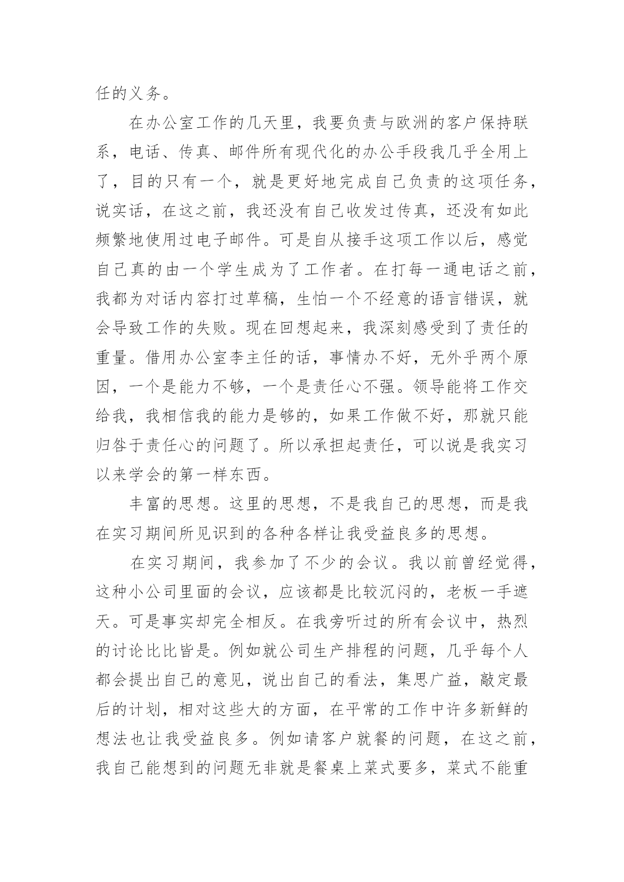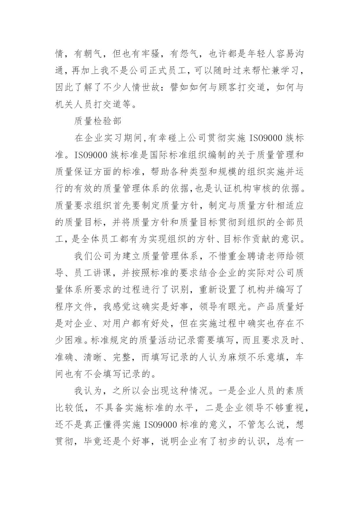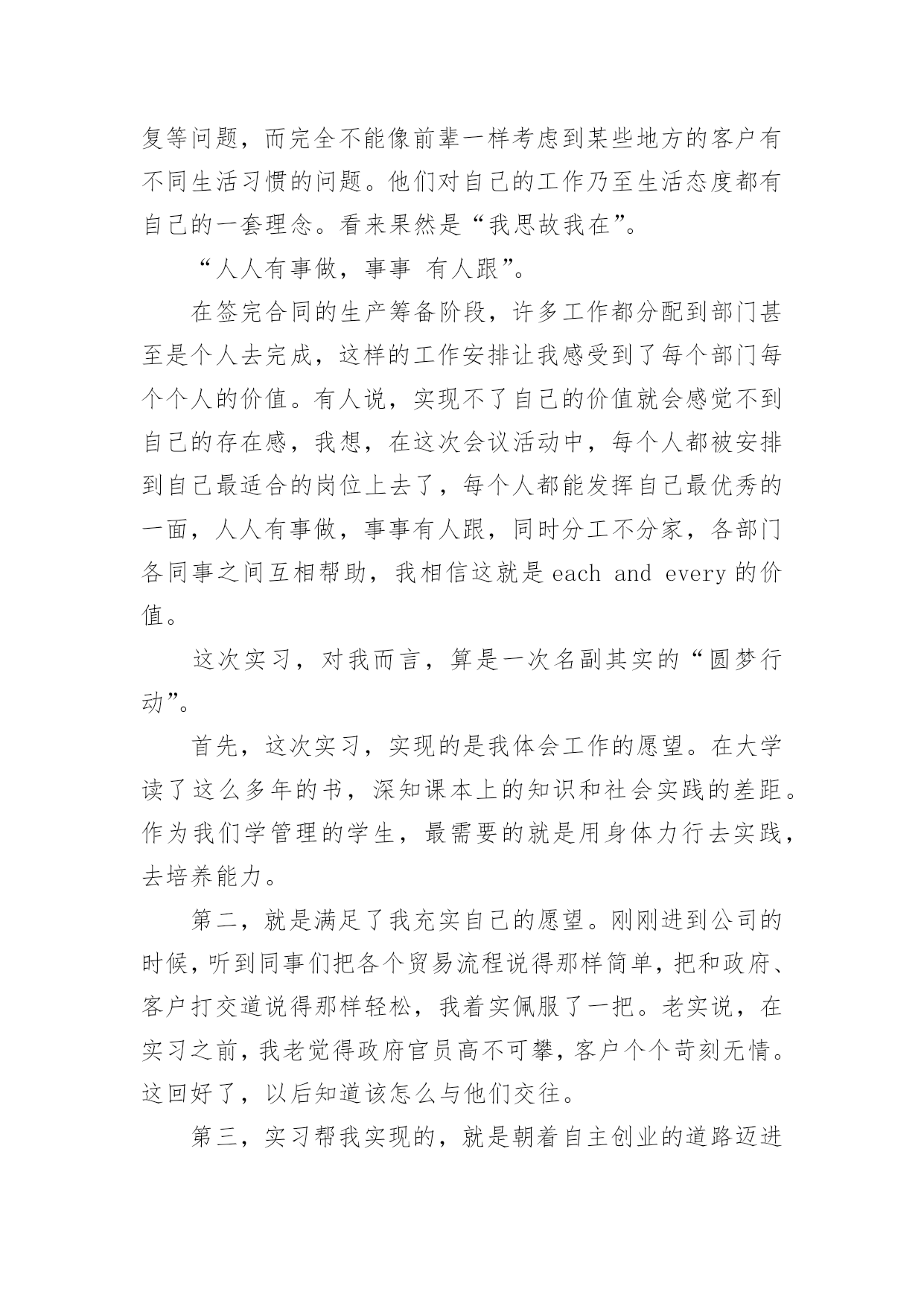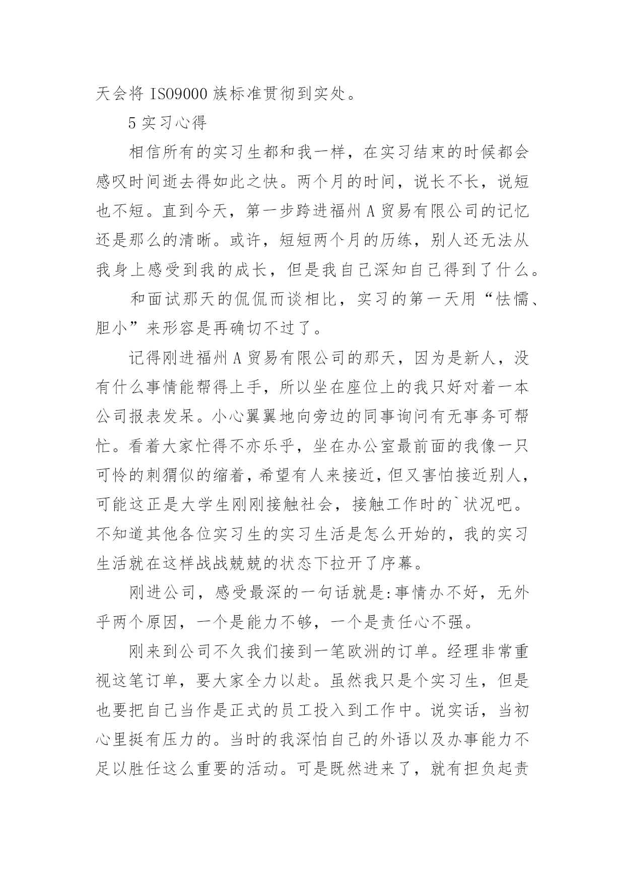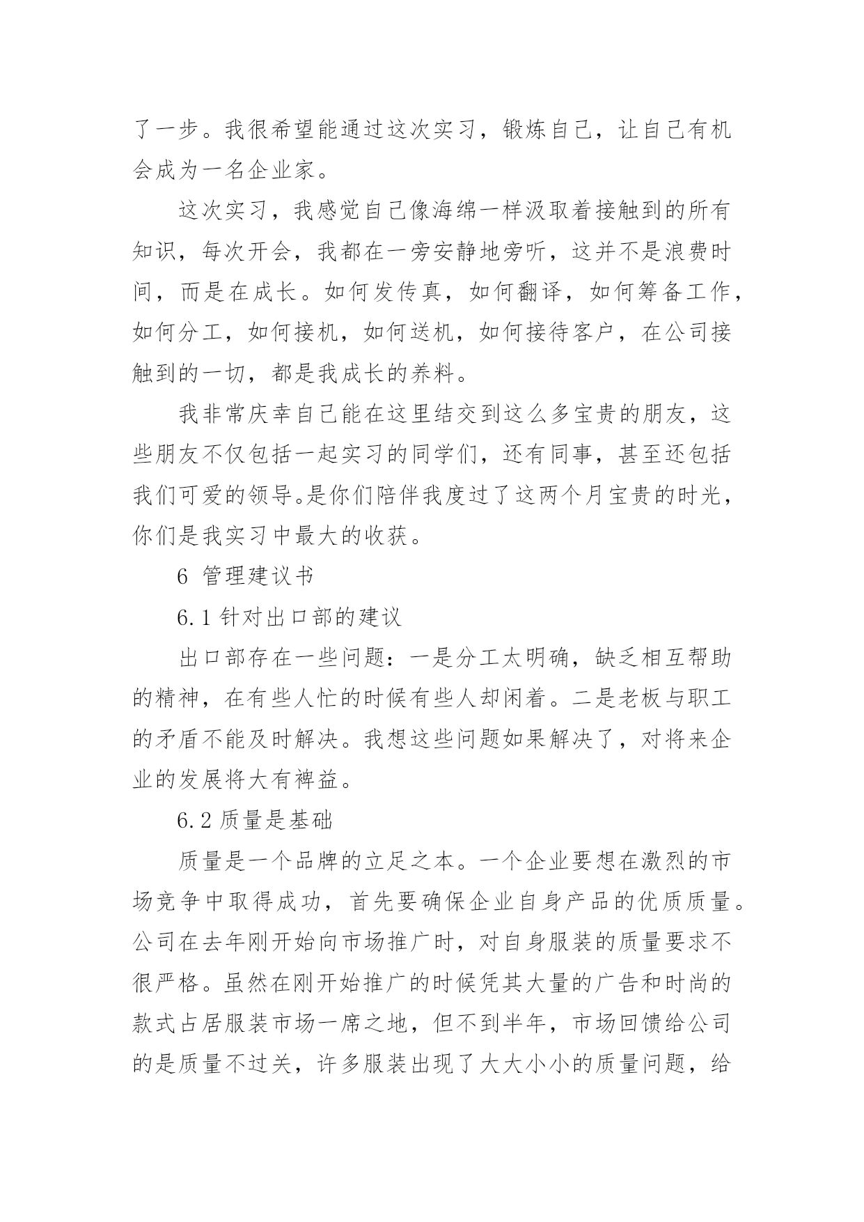 工商管理实习报告工商管理实习报告(通用8篇)在当下这个社会中,需要使用报告的情况越来越多,我们在写报告的时候要注意逻辑的合理性。一听到写报告就拖延症懒癌齐复发?下面是小编为大家整理的工商管理专业实习报告,希望能够帮助到大家。工商管理实习报告11实习目的为了真正做到理论和实践相结合,也为了能更详细地了解工商管理这一专业的真正内涵,通过对企业实际的调查、研究,熟悉外贸实务的具体操作程序,增强感性认识,初步培养学生理论联系实际的能力和分析问题与解决问题的能力。真正做到融会贯通,切实达到实习的目的。2实习时间xx年xx月xx日3实习单位福州A贸易有限公司4实习内容实习期间,我的岗位是管理培训生。我了解到了这个岗位的职责,工作内容,并参与策划了公司的各项活动,并提出了自己的想法。根据相关的各种贸易法律与惯例,结合实际情况,以贸易的基本过程为主线,针对贸易中业务函电的草拟、商品价格的核算、交易条件的磋商、买卖合同的签订、出口货物的托运订舱、报验通关、信用证的审核与修改以及贸易文件制作和审核等主要业务操作技能。在此期间,我进一步学习了公司管理、物流、营销等方面的知识,对企业经营有了深层次的感性与理性的认识。我的工作得到了实习单位充分的肯定和较好的评价。现将主要实习情况报告如下:4.1公司的概况在通过一个简单而严肃的面试后我来到了福州A贸易有限公司实习。福州A贸易有限公司位于福州市区西洋路,规模并不大,但是个麻雀虽小,五脏俱全的公司。很早就听别人说,学会干服装,做什么外贸都没有问题。这句话得到了我的实习指导:郑仁俊—福州A贸易有限公司总经理的认同。他告诉我,服装做起来真的非常复杂,需要涉及很多方面。所以,一旦我摸清了做服装的外贸流程,那么将来做其他外贸都是驾轻就熟的。今天是实习的第一天,郑经理带着我参观了整个公司,让我对公司的整体情况有了初步的了解。福州A贸易有限公司老板就是总经理,共有182名员工。包括以下几个部门:办公室、进出口部、生产技术部、质量检验部、财务部、总务部六个部门。办公室负责文件资料;进出口部负责采购原材料,办理出口业务及管理原料库,成品库;生产部负责制定生产计划,负责管辖两个生产车间;质量检验部负责原材料以及产品生产过程中的各工序产品的检验及成品的检验工作;财务部负责往来账项,工商税务工作;总务部负责伙房、安全、卫生等工作。总经理亲自抓市场工作,几乎天天接待客户。洽谈、揽客户、接订单、发货都是进出口部业务员的工作。进出口部人最多,每一个产品有一个人负责接订单、登记,并把订单传到生产部,任务完成后再由该业务员负责发货到福州港,每类产品有一个业务员负责采购原材料。4.2具体的工作办公室和生产技术部毕竟是个在校大学生,没有工作经验。所以我一进公司先被安排在办公室,给公司打文件,制表格。确实有些枯燥无味。一周后才被管生产的副经理带到生产技术部,并将生产流程逐一给我介绍了一遍。生产技术部有6个人各负其责。生产车间的设备全都是缝纫机、包缝机。一个车间约有100人,全是年轻女工,操作比较简单,缝纫机前有一塑料管,加工好的产品都推到前边的管中。车间里设备放置非常整齐,生产有序,都实现定置管理,工作环境非常好,卫生、整齐、明亮。工人都穿统一的工作服,带工作帽。在生产技术部待了几天,每天转一转车间,剩余时间在办公室里。我觉得工人的工作表面看挺轻松,其实是挺累的。坐在机器前,一坐就是半天,有时为了赶活儿还要加夜班,往往一天都要工作十几个小时。公司实行计件制,只有多干活才能多赚钱。工人都是农村的。个别也有下岗职工,大都来自偏远的农村,每月只挣八九百元。我曾经问过副经理怎样才能把一个企业管理好。他说当老板只要明白三条就行了,一条是老板要有市场,二是会核算成本,三是会用人。当时我觉得他说的太简单了,但现在体会一下,还是很有道理的。“会用人”他的意思是会用他这样的管生产的人,我觉得“会用人”还包括工人,如何关心他们,如何调动他们的积极性,不能把工人都看成是经济人。进出口部进出口部是公司的核心部门,由经理亲自负责。经理几乎每天都到,客户来了有翻译陪同,洽谈,参观工厂,吃饭。作为业务员每天按其职责工作,采购的原材料主要是布、线、袋子、拉链、纸箱等。供方大都是经常合作单位,电话联系,传真定货单,到时业务员负责接货等事宜,顾客要货时直接把定单传真过来,定单上有品名、合同号、数量等。有时带有图样,标有尺寸、花色、质量要求、包装要求、支付期限等,都是外语需翻译成中文,然后再把它传到生产部门生产出样品,经由顾客确认后才进行生产。由于和公司进出口部的业务员关系处的好,我一边观察不明白就问,很快我就熟悉了他们业务上的工作流程,业务员们的素质较高,一般都大学毕业,他们的工资比工人高,一般都在1500元以上,在这里我一般跟随业务员去送货,由于有些产品要出口,所以相当麻烦