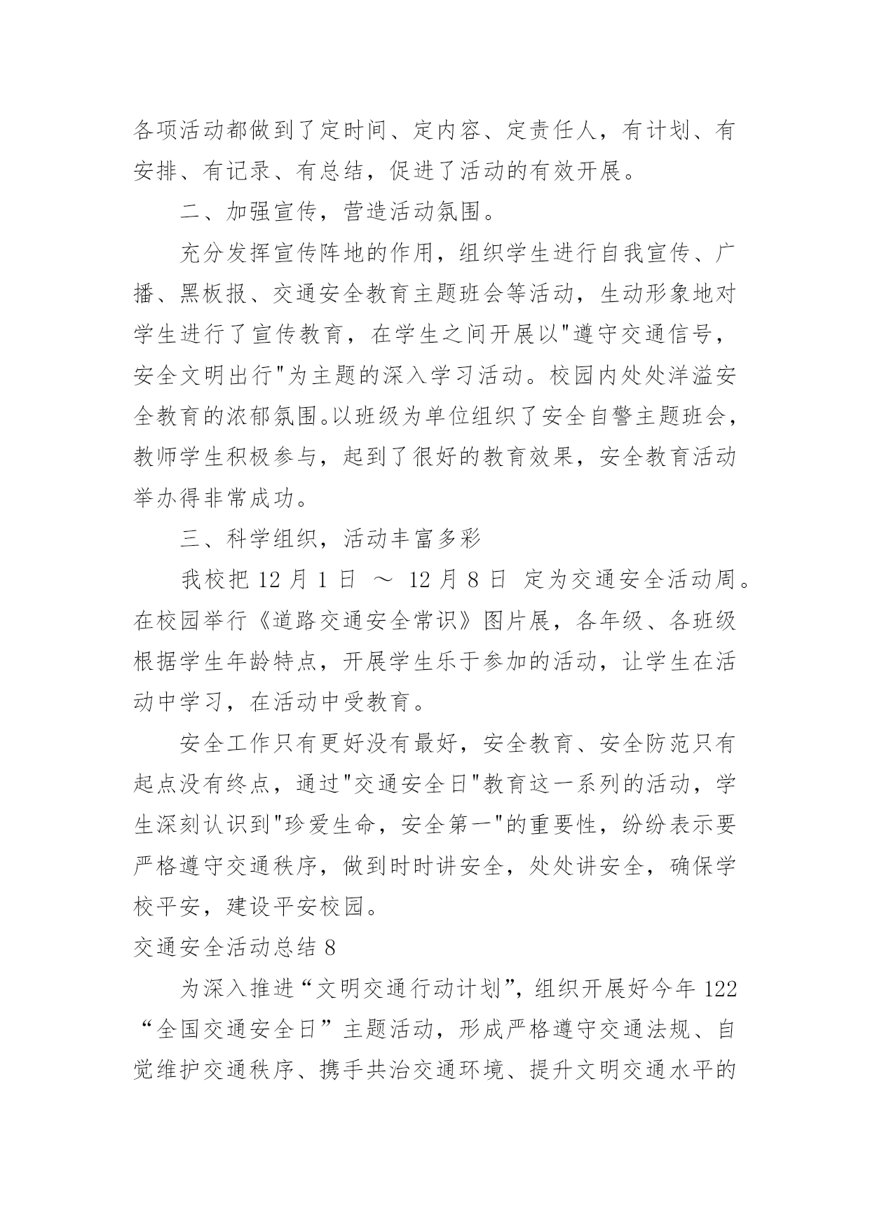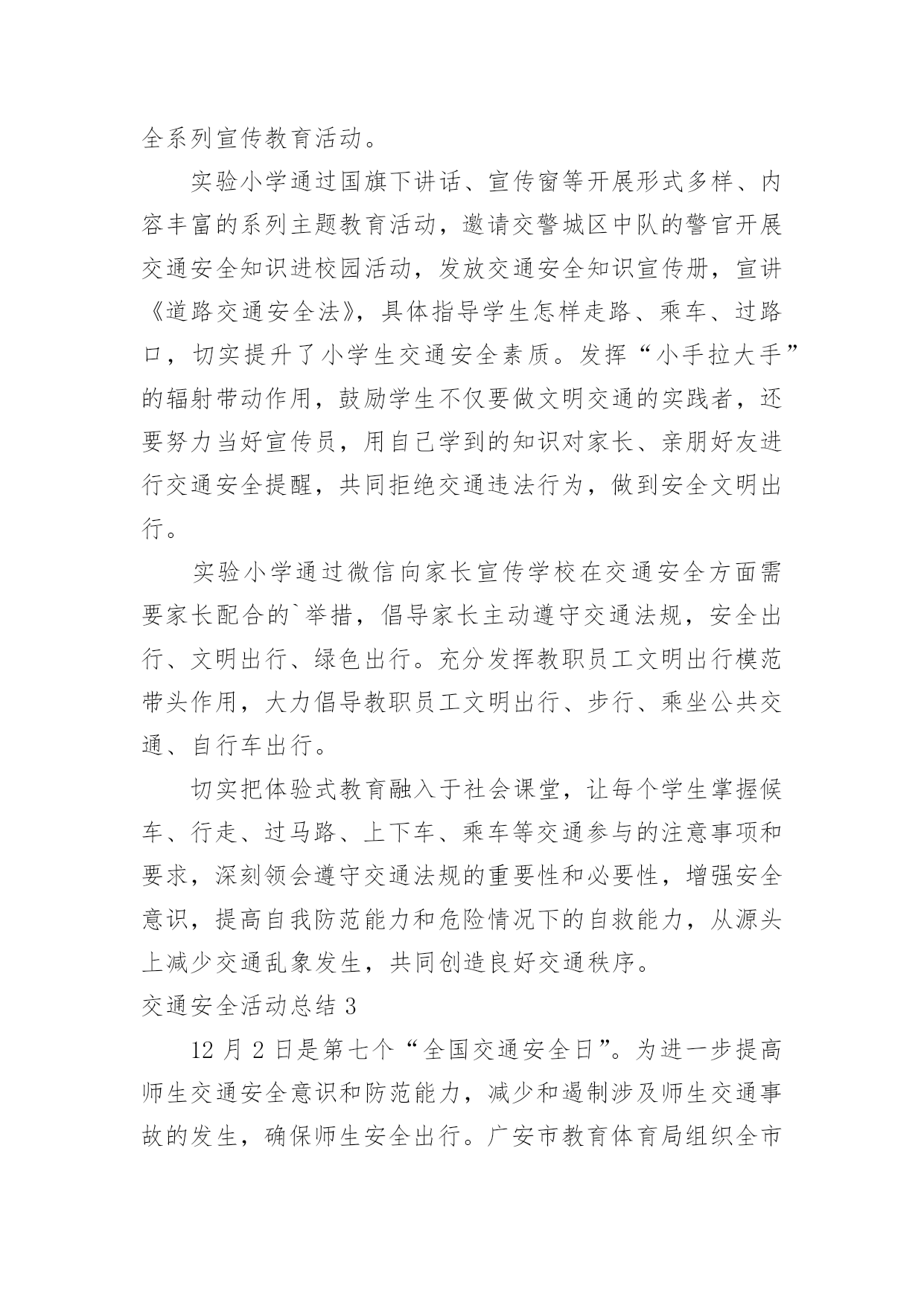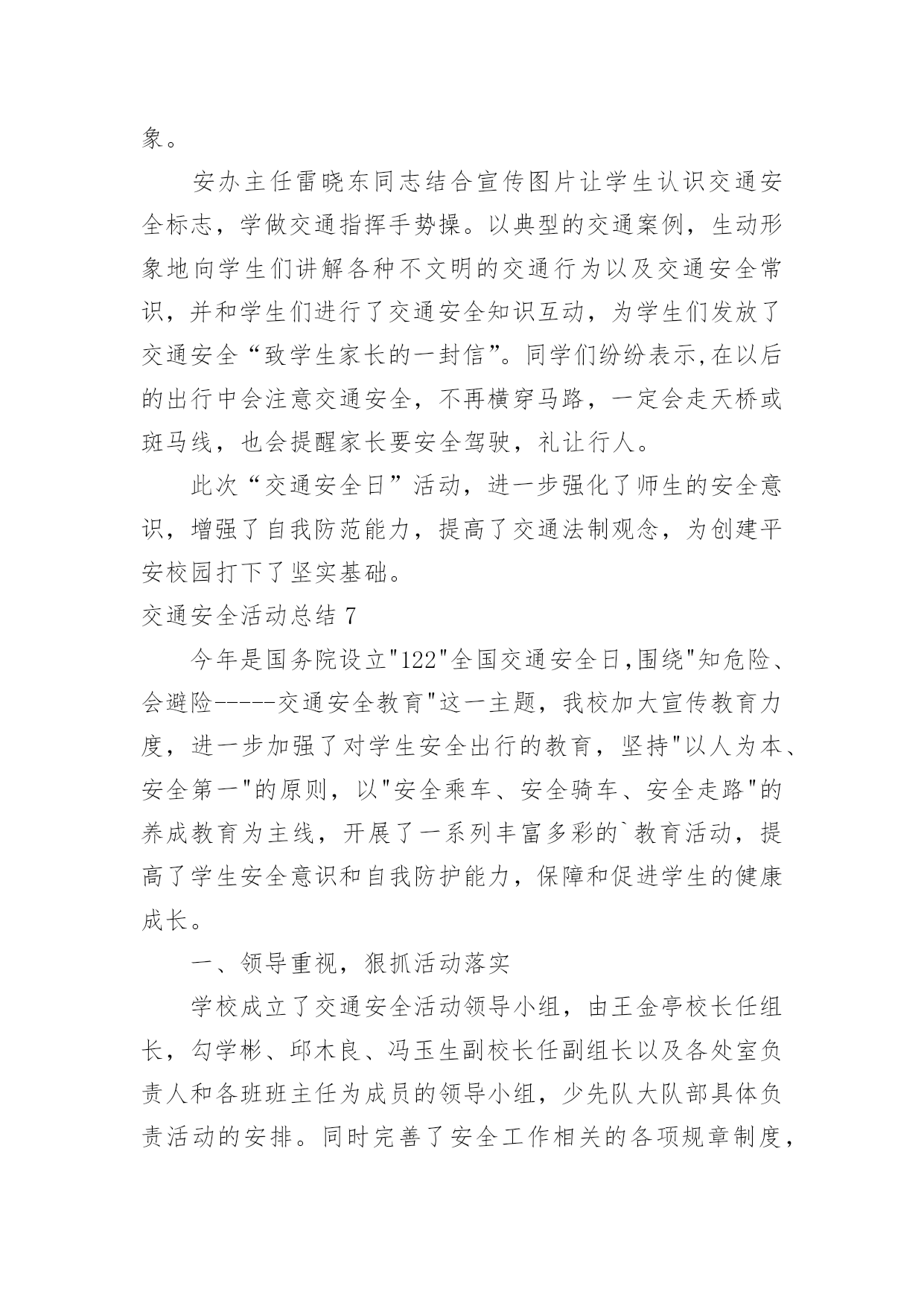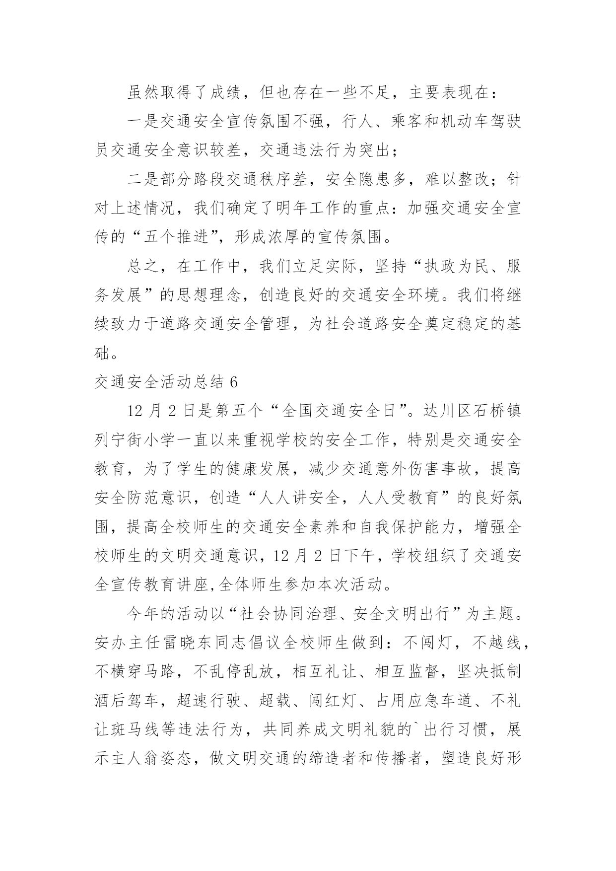 交通安全活动总结交通安全活动总结(15篇)总结是在一段时间内对学习和工作生活等表现加以总结和概括的一种书面材料,写总结有利于我们学习和工作能力的提高,因此好好准备一份总结吧。那么总结应该包括什么内容呢?下面是小编帮大家整理的交通安全活动总结,仅供参考,欢迎大家阅读。交通安全活动总结120xx年12月2日按照“122”交通安全日主题活动的通知精神,开展形式多样的教育活动,加大了交通安全的宣传力度,增强了全体学生的交通安全观念,牢固树立了“抵制七类违法安全文明出行”的思想。现把活动总结如下:一、统一思想,落实交通安全日主题活动责任。我校成立“学校交通安全日活动领导小组”,负责组织和安排学校的交通安全教育工作,把学生的交通安全列入重要的议事日程。提出开展活动的方案;在教职工会议上部署工作,开展全校性的教育活动。二、强势宣传,切实增强交通安全意识。精心组织开展交通安全知识的'宣传教育活动。(一)校外,亲身感受,培养学生的自护能力。为开展交通安全日实践活动,锻炼学生的实际能力,组织德岗学生外出“交通安全日在行动”活动,学生外出维护校外主要交通道路秩序,感受交通存在的潜在危险,身临其境,让学生感受“抵制七类违法安全文明出行”的重要性。同时,签订安全责任书,让学生掌握了有关交通安全法规常识,对维护学校秩序,疏导交通,宣传交通法规起到了积极而有效的作用。(二)校内,轰轰烈烈开展学生交通交通安全知识宣传活动。1、交通安全知识教育课。我们利用班会课,专门设置“交通安全知识”为内容的课程,备好课,上好课,使全校师生受教育率达100%,实现了交通安全教育进学校的目的,交通安全知识讲座使全体学生深受教育。2、组织学生观看《珍爱生命,安全第一》交通安全宣传片,通过电影中一些场景感染学生,并通过写观后感提升安全意识。此外,我们网络搜索有关交通安全的图片资料、电影片,并将交通安全有关的道路交通法律、法规、交通标志牌和事故案例图片等展板,在学校电子白板内进行展览。3、利用各种载体,广泛开展“文通安全日”活动。具体做好以下工作:在学校电子白板上宣传“122”交通安全日和它的主题,各班黑板报出“交通安全专版”进行宣传;校园都设置了交通安全教育标语和宣传画;进行题为“抵制七类违法安全文明出行”征文比赛;学习活动取得显著成效。4、加强对学校师生自行车、电瓶车、摩托车、汽车的管理,严禁学生骑车,教育教师严格做到“安全行车、规范停车”,通过教育、检查等形式制约师生遵守交通法规以及校纪校规。5、将《致学生家长的一封信》下发至学生,每生人手一份等形式,对家长进行交通安全教育。要求家长配合学校对子女进行必要的走路和行车安全提醒,要严格遵守交通法规,并决不乘坐“黑车”和超员的车,并要求家长接送孩子上下学或出行时遵守交通法规,保障孩子安全,这样,不仅提高了学生的交通安全意识,而且辐射到家长,规范了家长的交通行为。通过交通安全日活动的开展,交通安全意识已深入人心,老师、学生和家长都深有感触。学生了解了交通安全常识,提高了遵守交通法规意识。安全走路,安全乘车,安全骑车己成为学生们的自觉行动。开展此活动以来,我校的交通安全工作到位,没有发生交通安全事故。通过交通安全日主题活动的开展,广大家长对孩子的在校学习感到放心,同时,社会对学校的满意程度有了较大提高。可以说,我们开展的特色活动富有针对性和实效性,对学校各项工作起了支撑和推动作用,成为学校德育工作的支点和杠杆。交通安全活动总结2为进一步加强交通安全宣传教育,不断提升小学生交通安全防范意识,养成文明交通行为习惯,有效预防和减少涉及学生的道路交通事故,倡导绿色低碳出行方式,营造文明礼让、和谐顺畅的交通环境,近日,实验小学开展了交通安全系列宣传教育活动。实验小学通过国旗下讲话、宣传窗等开展形式多样、内容丰富的系列主题教育活动,邀请交警城区中队的警官开展交通安全知识进校园活动,发放交通安全知识宣传册,宣讲《道路交通安全法》,具体指导学生怎样走路、乘车、过路口,切实提升了小学生交通安全素质。发挥“小手拉大手”的辐射带动作用,鼓励学生不仅要做文明交通的实践者,还要努力当好宣传员,用自己学到的知识对家长、亲朋好友进行交通安全提醒,共同拒绝交通违法行为,做到安全文明出行。实验小学通过微信向家长宣传学校在交通安全方面需要家长配合的`举措,倡导家长主动遵守交通法规,安全出行、文明出行、绿色出行。充分发挥教职员工文明出行模范带头作用,大力倡导教职员工文明出行、步行、乘坐公共交通、自行车出行。切实把体验式教育融入于社会课堂,让每个学生掌握候车、行走、过马路、上下车、乘车等交通参与的注意事项和要求,深刻领会遵守交通法规的重要性和必要性,增强安全意识,提高自我防范能力和危险情况下的自救能力,从源头上减少交通乱象发生,共同创造良好交通秩序。交通安全活动总结31