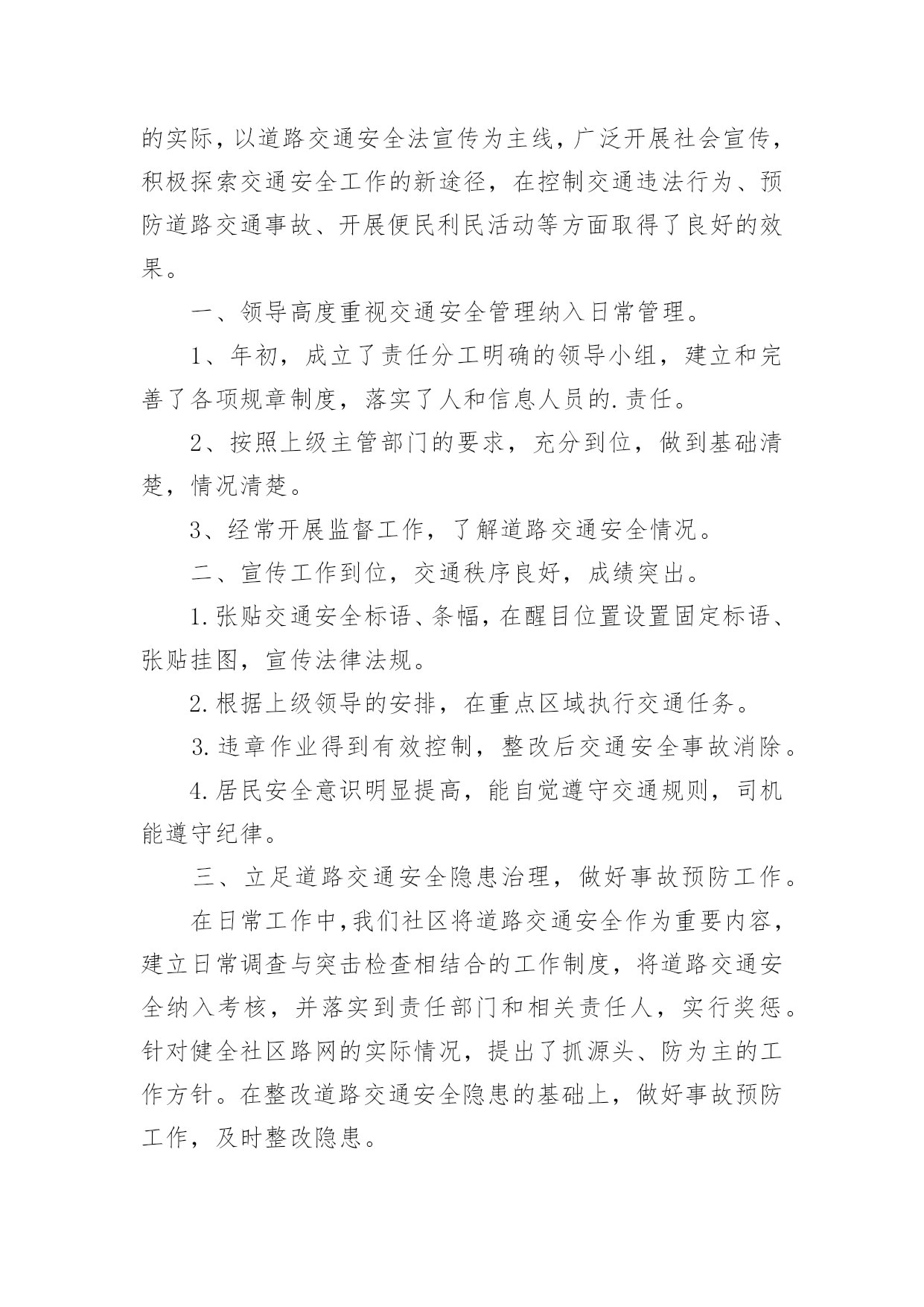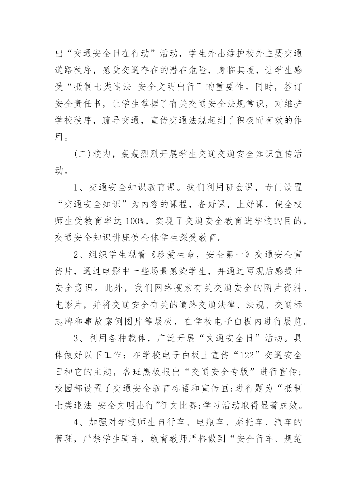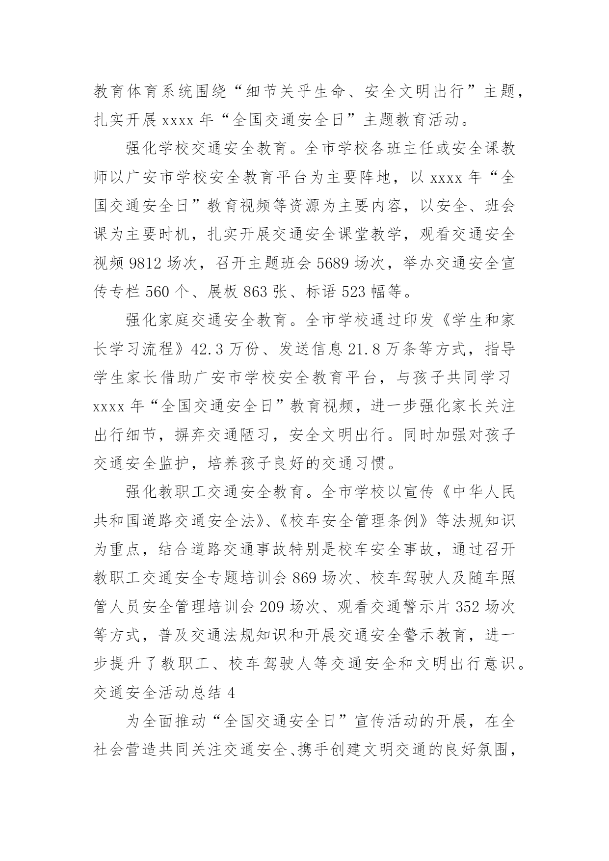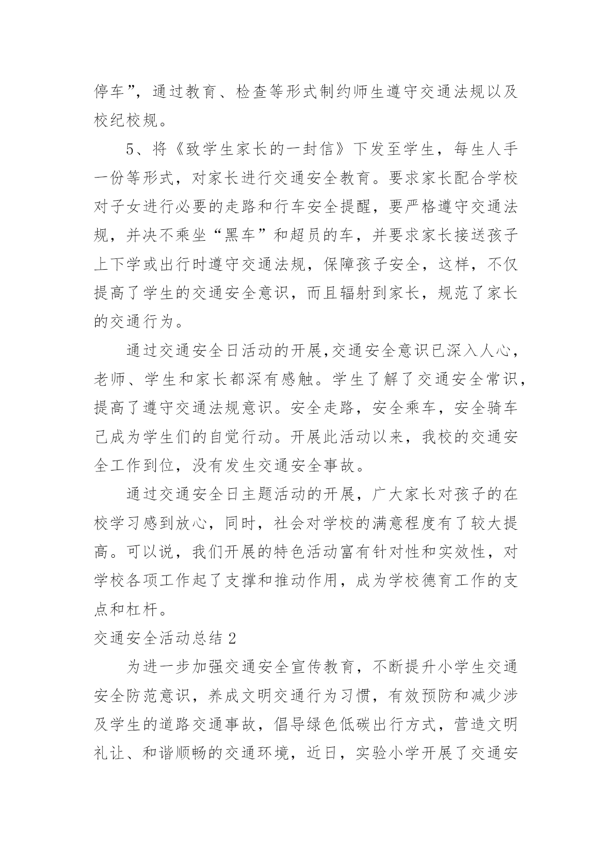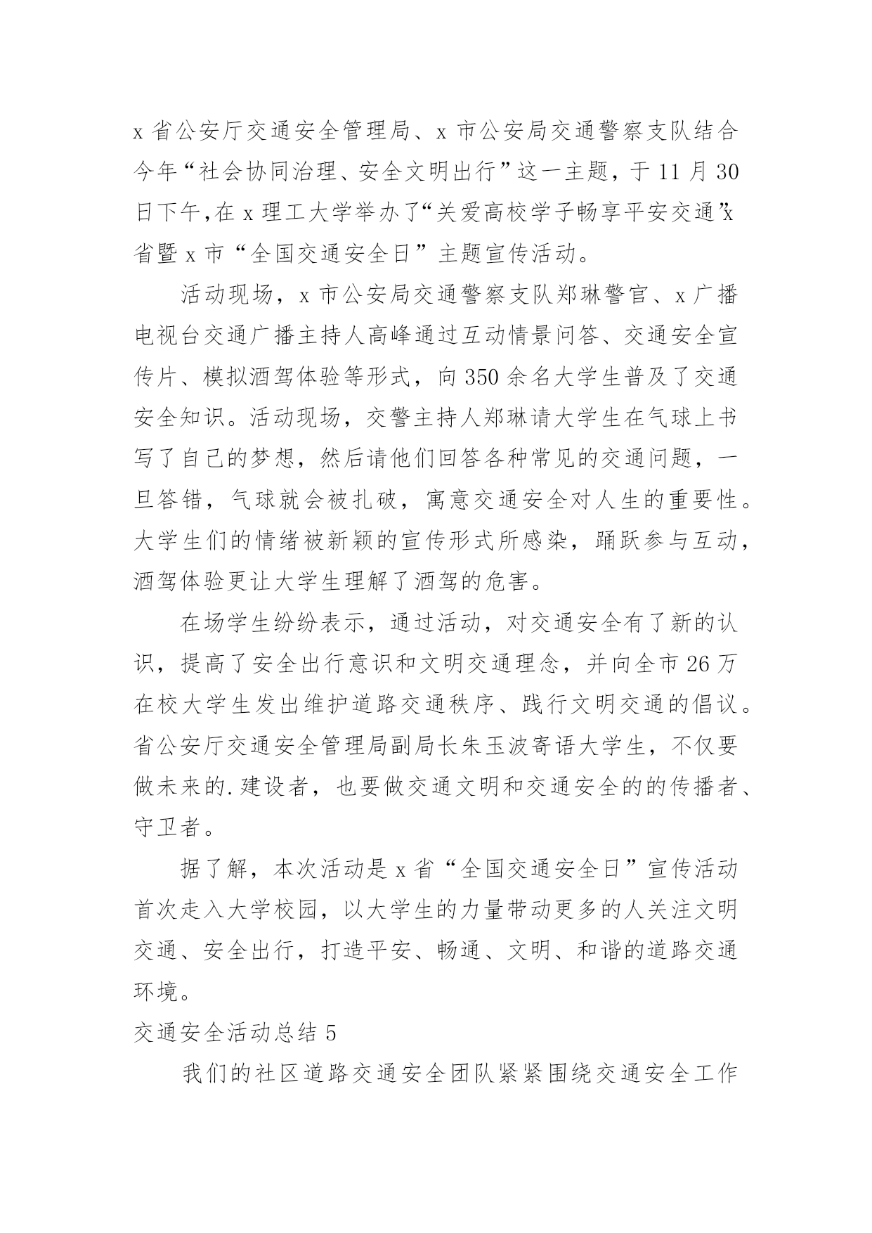 交通安全活动总结交通安全活动总结(15篇)总结是在一段时间内对学习和工作生活等表现加以总结和概括的一种书面材料,写总结有利于我们学习和工作能力的提高,因此好好准备一份总结吧。那么总结应该包括什么内容呢?下面是小编帮大家整理的交通安全活动总结,仅供参考,欢迎大家阅读。交通安全活动总结120xx年12月2日按照“122”交通安全日主题活动的通知精神,开展形式多样的教育活动,加大了交通安全的宣传力度,增强了全体学生的交通安全观念,牢固树立了“抵制七类违法安全文明出行”的思想。现把活动总结如下:一、统一思想,落实交通安全日主题活动责任。我校成立“学校交通安全日活动领导小组”,负责组织和安排学校的交通安全教育工作,把学生的交通安全列入重要的议事日程。提出开展活动的方案;在教职工会议上部署工作,开展全校性的教育活动。二、强势宣传,切实增强交通安全意识。精心组织开展交通安全知识的'宣传教育活动。(一)校外,亲身感受,培养学生的自护能力。为开展交通安全日实践活动,锻炼学生的实际能力,组织德岗学生外出“交通安全日在行动”活动,学生外出维护校外主要交通道路秩序,感受交通存在的潜在危险,身临其境,让学生感受“抵制七类违法安全文明出行”的重要性。同时,签订安全责任书,让学生掌握了有关交通安全法规常识,对维护学校秩序,疏导交通,宣传交通法规起到了积极而有效的作用。(二)校内,轰轰烈烈开展学生交通交通安全知识宣传活动。1、交通安全知识教育课。我们利用班会课,专门设置“交通安全知识”为内容的课程,备好课,上好课,使全校师生受教育率达100%,实现了交通安全教育进学校的目的,交通安全知识讲座使全体学生深受教育。2、组织学生观看《珍爱生命,安全第一》交通安全宣传片,通过电影中一些场景感染学生,并通过写观后感提升安全意识。此外,我们网络搜索有关交通安全的图片资料、电影片,并将交通安全有关的道路交通法律、法规、交通标志牌和事故案例图片等展板,在学校电子白板内进行展览。3、利用各种载体,广泛开展“文通安全日”活动。具体做好以下工作:在学校电子白板上宣传“122”交通安全日和它的主题,各班黑板报出“交通安全专版”进行宣传;校园都设置了交通安全教育标语和宣传画;进行题为“抵制七类违法安全文明出行”征文比赛;学习活动取得显著成效。4、加强对学校师生自行车、电瓶车、摩托车、汽车的管理,严禁学生骑车,教育教师严格做到“安全行车、规范停车”,通过教育、检查等形式制约师生遵守交通法规以及校纪校规。5、将《致学生家长的一封信》下发至学生,每生人手一份等形式,对家长进行交通安全教育。要求家长配合学校对子女进行必要的走路和行车安全提醒,要严格遵守交通法规,并决不乘坐“黑车”和超员的车,并要求家长接送孩子上下学或出行时遵守交通法规,保障孩子安全,这样,不仅提高了学生的交通安全意识,而且辐射到家长,规范了家长的交通行为。通过交通安全日活动的开展,交通安全意识已深入人心,老师、学生和家长都深有感触。学生了解了交通安全常识,提高了遵守交通法规意识。安全走路,安全乘车,安全骑车己成为学生们的自觉行动。开展此活动以来,我校的交通安全工作到位,没有发生交通安全事故。通过交通安全日主题活动的开展,广大家长对孩子的在校学习感到放心,同时,社会对学校的满意程度有了较大提高。可以说,我们开展的特色活动富有针对性和实效性,对学校各项工作起了支撑和推动作用,成为学校德育工作的支点和杠杆。交通安全活动总结2为进一步加强交通安全宣传教育,不断提升小学生交通安全防范意识,养成文明交通行为习惯,有效预防和减少涉及学生的道路交通事故,倡导绿色低碳出行方式,营造文明礼让、和谐顺畅的交通环境,近日,实验小学开展了交通安全系列宣传教育活动。实验小学通过国旗下讲话、宣传窗等开展形式多样、内容丰富的系列主题教育活动,邀请交警城区中队的警官开展交通安全知识进校园活动,发放交通安全知识宣传册,宣讲《道路交通安全法》,具体指导学生怎样走路、乘车、过路口,切实提升了小学生交通安全素质。发挥“小手拉大手”的辐射带动作用,鼓励学生不仅要做文明交通的实践者,还要努力当好宣传员,用自己学到的知识对家长、亲朋好友进行交通安全提醒,共同拒绝交通违法行为,做到安全文明出行。实验小学通过微信向家长宣传学校在交通安全方面需要家长配合的`举措,倡导家长主动遵守交通法规,安全出行、文明出行、绿色出行。充分发挥教职员工文明出行模范带头作用,大力倡导教职员工文明出行、步行、乘坐公共交通、自行车出行。切实把体验式教育融入于社会课堂,让每个学生掌握候车、行走、过马路、上下车、乘车等交通参与的注意事项和要求,深刻领会遵守交通法规的重要性和必要性,增强安全意识,提高自我防范能力和危险情况下的自救能力,从源头上减少交通乱象发生,共同创造良好交通秩序。交通安全活动总结31