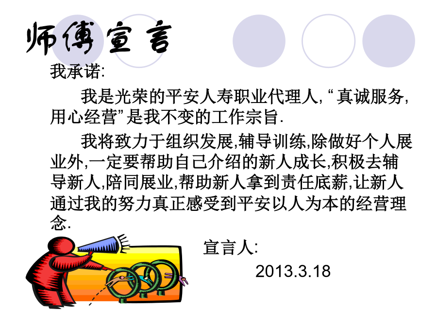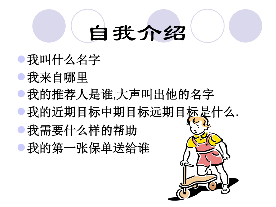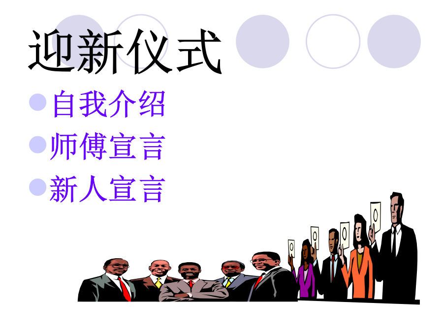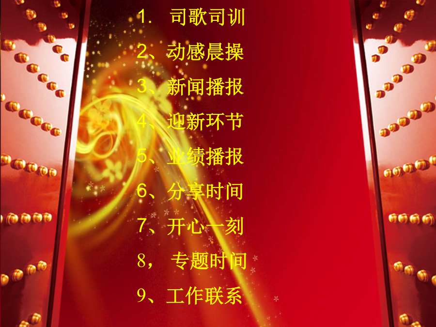 保险公司迎新会热烈欢迎新伙伴的加盟请大家调整好自己的手机调整好自己的心情启动会马上开始。。。。。。早会流程1.司歌司训2、动感晨操3、新闻播报4、迎新环节5、业绩播报6、分享时间7、开心一刻8,专题时间9、工作联系最炫民族风迎新仪式我叫什么名字我来自哪里我的推荐人是谁,大声叫出他的名字我的近期目标中期目标远期目标是什么.我需要什么样的帮助我的第一张保单送给谁师傅宣言新人宣言师傅领进门修行在个人衷心祝愿:刚入司的新伙伴能圆梦泰康,实现理想!信息播报中国铁路总公司今日正式挂牌昨日明星精彩分享专题时间近期行事历开开心心上班快快乐乐挣钱