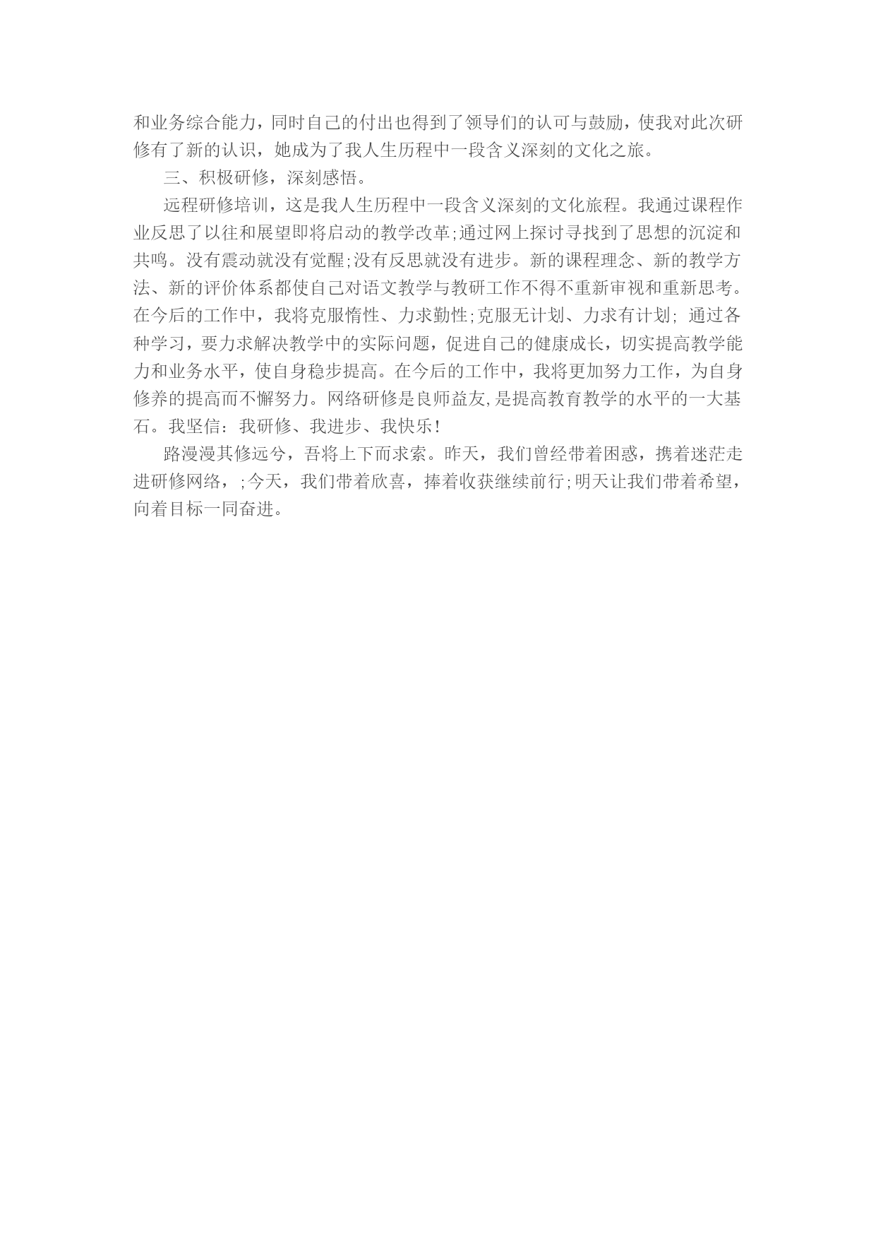 新中小学组幼儿教育组工作研修总结时光如水,匆匆太匆匆,从十月我们相逢在网络平台,已经几个月了,回忆这段远程研修的日子,感慨颇多。在这片属于我们的天空里,我体验着远程研修的耳目一新,我聆听了各位专家学者们的精彩阐释和真知灼见,倾听了各位老师的亲切点评,在线研讨领略了各位同仁激烈的讨论,倾听一线教师的无数心声,同时也让我有幸结识了许许多多的同行,领略了他们的风采。在网络研修的日子里,每天观看视频、阅读文本、完成作业、撰写反思、发表评论、浏览简报……所有的这些已成为我每天生活的一部分。研修让我真正意识到自己的渺小与孤陋寡闻,意识到了自己如同井底之蛙。同时,远程教育研修也激发了我对教育事业更加真实的爱恋。远程研修为我们一线教师的交流搭建了一个很好的平台,在这里我们可以畅所欲言,解惑释疑。今年我有幸参加远程培训,有幸聆听各位专家讲座让我感慨颇深,受益匪浅。在这段学习生活中,我每天累并快乐着……因为,我收获了知识,更收获了友情。通过研修,我全面提升了自己的基本素养和业务综合能力,对于个人今后的发展起到了积极的促进作用,对教育教学工作也有了一种新的理解。一、转变思想,更新观念。我积极投身网络研修的学习当中,切实做到了三个自觉:自觉参加上级组织的网络学习培训,自觉参加讨论,自觉上交作业。通过研修,使我明确了现代教育的本质,明确课改对于教师提出了什么样的素质要求。我通过深入学习,从而明确了作为一名教师必须不断的提高自己,充实自己,具有丰富的知识含量,扎实的教学基本功,否则就要被时代所淘汰,增强了自身学习的紧迫性,危机感和责任感,树立了“以学生发展为本”的教育思想,不断进行教学观念的更新,教学行为和学生的学习方式也有了根本性的改变。二、勤勤恳恳,积极研修在研修过程中,我坚持每天进行网上学习,认真观看各个专题视频录象,通过学习解决了我在实际教学中遇到的很多疑难问题,使自己在道德修养、教育理念、教学方法等各方面有了很大的提升,驾驭课堂、把握教材、交流沟通、教学设计、班级管理、教学反思的技能也有了很大的提高,同时更新了教育理论,丰富了教学经验,为今后从事语文教学和班级管理工作,进一步提高课堂教学效率打下了良好的基矗同时也结识了许多优秀的教师,开阔了视野,充实了自己。具体做到了以下几点:1、积极认真的观看视频学习,到目前为止在线学习时间近几个月,并且在观看视频的时候积极提出自己的问题。2、认真独立完成必修作业,选修作业和校本作业多篇,认真评判,积极评论,按时主动参加在线研讨。我勤勤恳恳的研修学习,不仅提高了自己基本素养和业务综合能力,同时自己的付出也得到了领导们的认可与鼓励,使我对此次研修有了新的认识,她成为了我人生历程中一段含义深刻的文化之旅。三、积极研修,深刻感悟。远程研修培训,这是我人生历程中一段含义深刻的文化旅程。我通过课程作业反思了以往和展望即将启动的教学改革;通过网上探讨寻找到了思想的沉淀和共鸣。没有震动就没有觉醒;没有反思就没有进步。新的课程理念、新的教学方法、新的评价体系都使自己对语文教学与教研工作不得不重新审视和重新思考。在今后的工作中,我将克服惰性、力求勤性;克服无计划、力求有计划;通过各种学习,要力求解决教学中的实际问题,促进自己的健康成长,切实提高教学能力和业务水平,使自身稳步提高。在今后的工作中,我将更加努力工作,为自身修养的提高而不懈努力。网络研修是良师益友,是提高教育教学的水平的一大基石。我坚信:我研修、我进步、我快乐!路漫漫其修远兮,吾将上下而求索。昨天,我们曾经带着困惑,携着迷茫走进研修网络,;今天,我们带着欣喜,捧着收获继续前行;明天让我们带着希望,向着目标一同奋进。