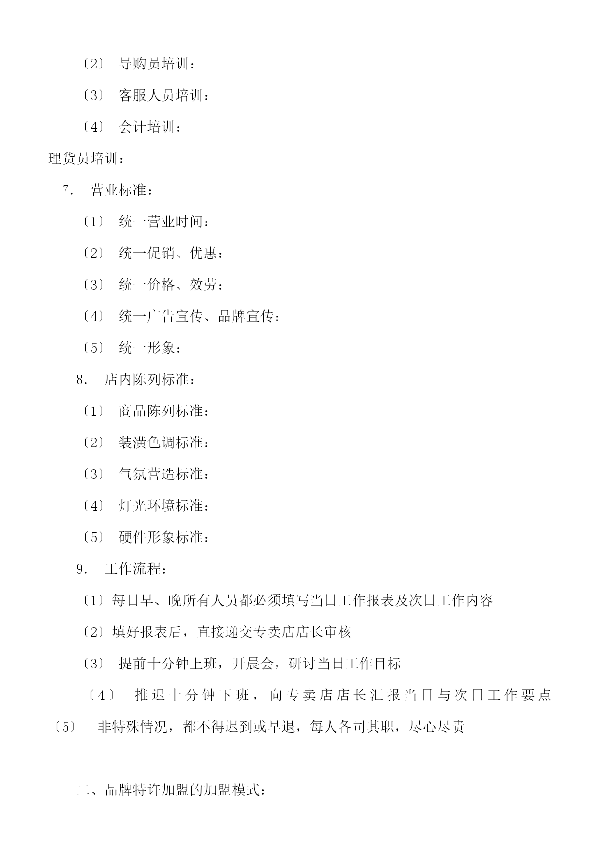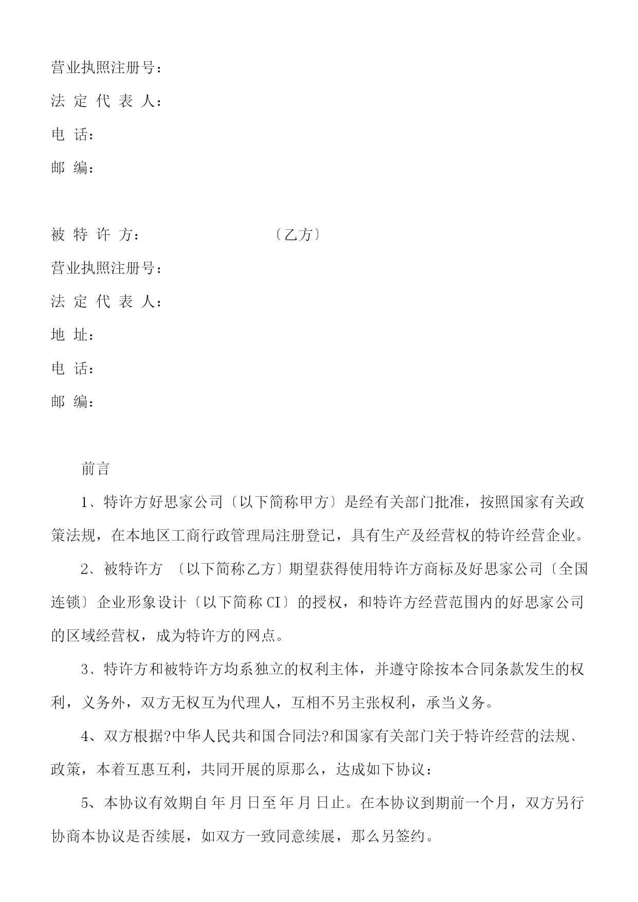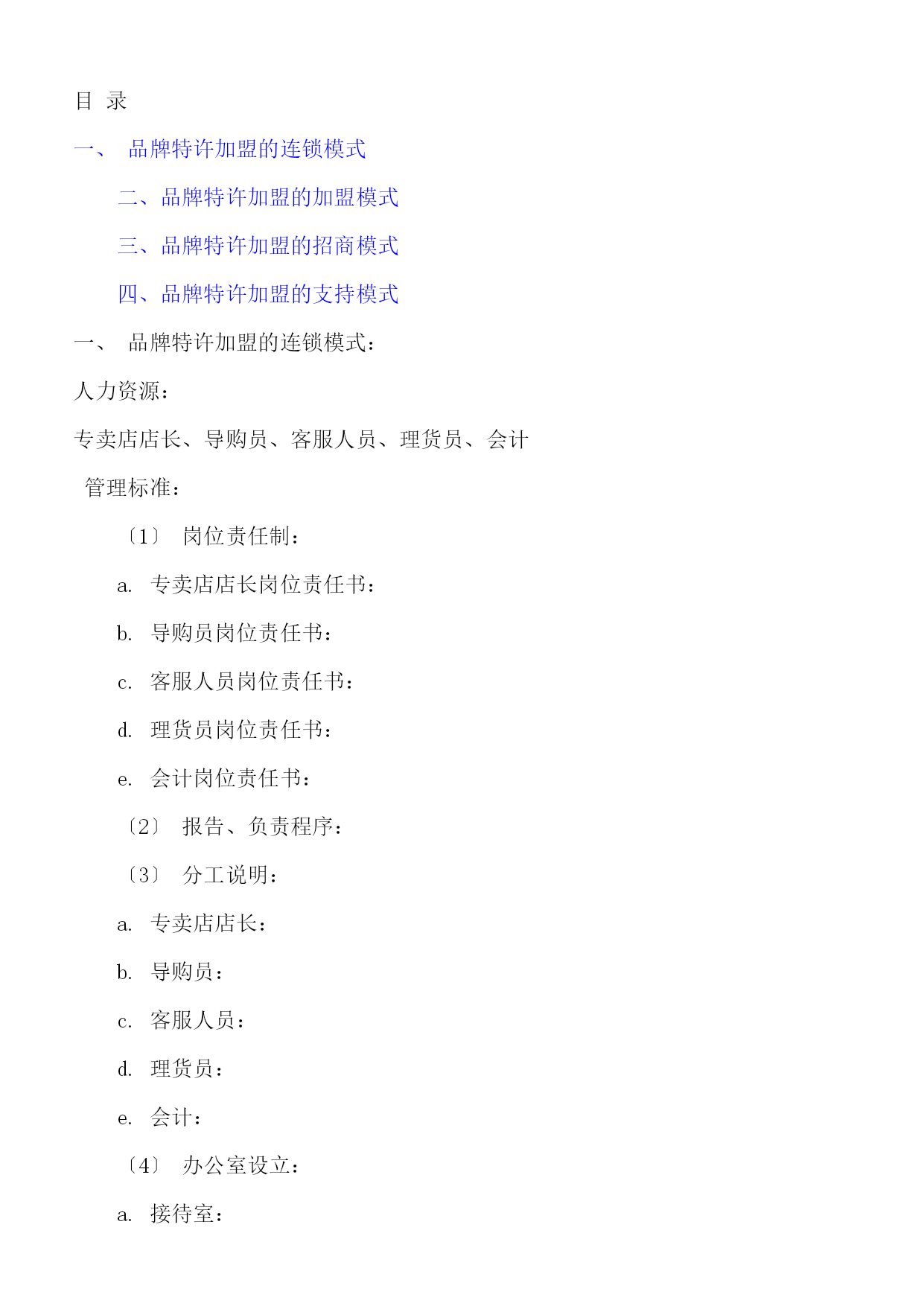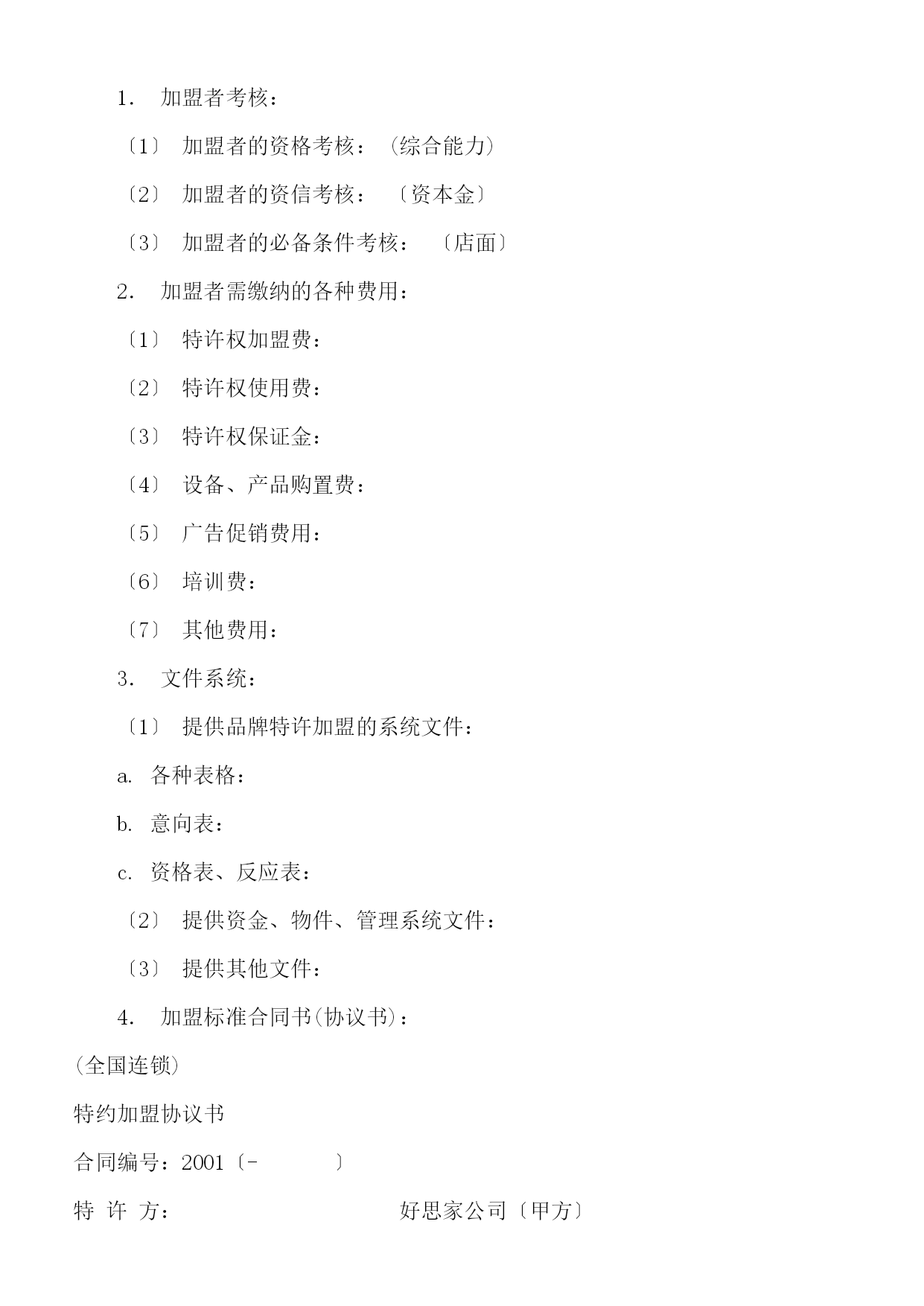 连锁加盟全程策划案1420925735【完整版】(文档可以直接使用,也可根据实际需要修订后使用,可编辑放心下载)目录一、品牌特许加盟的连锁模式"二、品牌特许加盟的加盟模式三、品牌特许加盟的招商模式四、品牌特许加盟的支持模式一、品牌特许加盟的连锁模式:人力资源:专卖店店长、导购员、客服人员、理货员、会计管理标准:〔1〕岗位责任制:a.专卖店店长岗位责任书:b.导购员岗位责任书:c.客服人员岗位责任书:d.理货员岗位责任书:e.会计岗位责任书:〔2〕报告、负责程序:〔3〕分工说明:a.专卖店店长:b.导购员:c.客服人员:d.理货员:e.会计:〔4〕办公室设立:a.接待室:b.库房:3.行为标准:〔1〕服饰标准:a.外衣:b.鞋袜:〔2〕接待标准:a.尊重你身边的每一个人:b.事先拟定每日工作方案:c.举止言谈以客户为中心:d.待人接物热情周到:e.言出必行、信用第一:4.语言标准:〔1〕用语:〔2〕招呼用语:〔3〕道别用语:〔4〕接待用语:〔5〕效劳用语:5.效劳标准:〔1〕做好充分准备:〔2〕待客热情周到:〔3〕凡事有问必答:〔4〕言辞礼貌标准:6.培训标准:〔1〕专卖店店长培训:〔2〕导购员培训:〔3〕客服人员培训:〔4〕会计培训:理货员培训:7.营业标准:〔1〕统一营业时间:〔2〕统一促销、优惠:〔3〕统一价格、效劳:〔4〕统一广告宣传、品牌宣传:〔5〕统一形象:8.店内陈列标准:〔1〕商品陈列标准:〔2〕装潢色调标准:〔3〕气氛营造标准:〔4〕灯光环境标准:〔5〕硬件形象标准:9.工作流程:〔1〕每日早、晚所有人员都必须填写当日工作报表及次日工作内容〔2〕填好报表后,直接递交专卖店店长审核〔3〕提前十分钟上班,开晨会,研讨当日工作目标〔4〕推迟十分钟下班,向专卖店店长汇报当日与次日工作要点〔5〕非特殊情况,都不得迟到或早退,每人各司其职,尽心尽责二、品牌特许加盟的加盟模式:1.加盟者考核:〔1〕加盟者的资格考核:(综合能力)〔2〕加盟者的资信考核:〔资本金〕〔3〕加盟者的必备条件考核:〔店面〕2.加盟者需缴纳的各种费用:〔1〕特许权加盟费:〔2〕特许权使用费:〔3〕特许权保证金:〔4〕设备、产品购置费:〔5〕广告促销费用:〔6〕培训费:〔7〕其他费用:3.文件系统:〔1〕提供品牌特许加盟的系统文件:a.各种表格:b.意向表:c.资格表、反应表:〔2〕提供资金、物件、管理系统文件:〔3〕提供其他文件:4.加盟标准合同书(协议书):(全国连锁)特约加盟协议书合同编号:2001〔-〕特许方:好思家公司〔甲方〕营业执照注册号:法定代表人:电话:邮编:被特许方:〔乙方〕营业执照注册号:法定代表人:地址:电话:邮编:前言1﹑特许方好思家公司〔以下简称甲方〕是经有关部门批准,按照国家有关政策法规,在本地区工商行政管理局注册登记,具有生产及经营权的特许经营企业。2﹑被特许方〔以下简称乙方〕期望获得使用特许方商标及好思家公司〔全国连锁〕企业形象设计〔以下简称CI〕的授权,和特许方经营范围内的好思家公司的区域经营权,成为特许方的网点。3﹑特许方和被特许方均系独立的权利主体,并遵守除按本合同条款发生的权利,义务外,双方无权互为代理人,互相不另主张权利,承当义务。4、双方根据?中华人民共和国合同法?和国家有关部门关于特许经营的法规﹑政策,本着互惠互利,共同开展的原那么,达成如下协议:5、本协议有效期自年月日至年月日止。在本协议到期前一个月,双方另行协商本协议是否续展,如双方一致同意续展,那么另签约。第一条特许权的授予1-1甲乙双方签约之日起一周内,乙方经甲方认可后,即可成为特约加盟店。1-2在乙方履行1-1条款的根底上,甲方即将好思家公司〔全国连锁〕的区域特许经营权交给乙方;并在一周内将好思家公司〔全国连锁〕企业形象设计全套资料交给乙方。1-3乙方负责按甲方提供的效果图及施工图进行加盟店的装修,并使用甲方指定的经营设备。第二条特许权的取消2-1假设乙方无故不履行其应尽根本义务,甲方可取消乙方的被特许权。2-2乙方申请破产、被宣布破产、解散、被撤销或终止、停止经营者。第三条经营区域3-1本协议所指的经营区域为。特约经营权及相关权利仅限于合同所述之区域,不得在其他区域进行经营。第四条特许方的根本权利4-1为确保好思家公司企业形象设计的统一性及产品,效劳质量的一致性,按甲方的开展规划,甲方有权利对乙方的经营活动进行监督和指导。4-2加盟店的零售价及打折幅度或效劳标准由甲方统一制定,推广产品及特价货品由甲方另行定价。4-3甲方有权对申请升级为独家经营加盟店的特约加盟店进行评估、考核,甲方拥有最终的决定权。4-4合同期内,如乙方不履行本合同约定之责任条款及严重侵害甲方权益,甲方有权即时以书