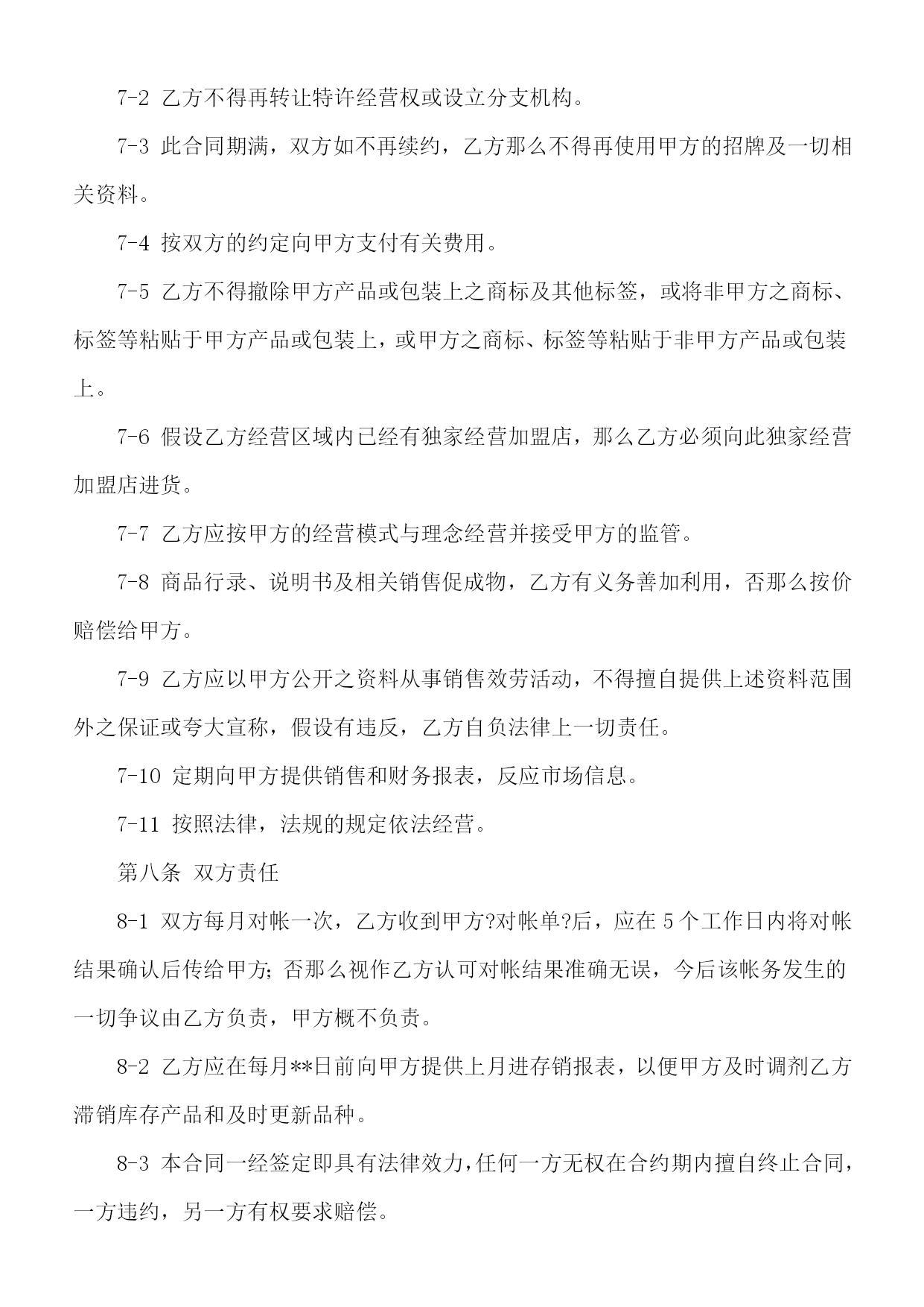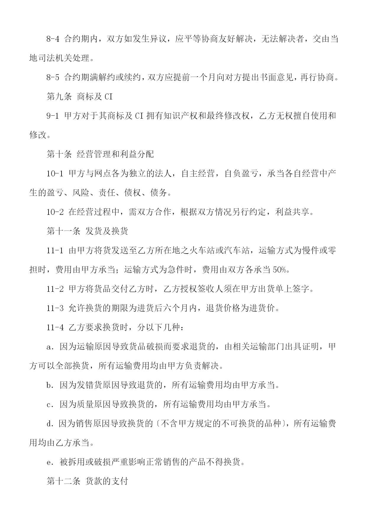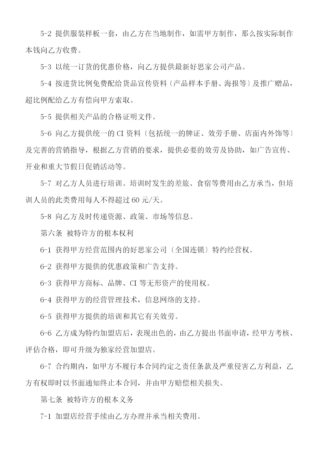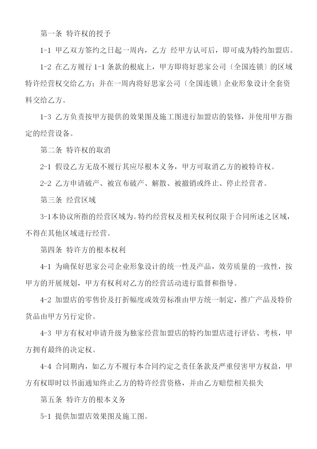 连锁加盟全程策划案1420925735【完整版】(文档可以直接使用,也可根据实际需要修订后使用,可编辑放心下载)目录一、品牌特许加盟的连锁模式"二、品牌特许加盟的加盟模式三、品牌特许加盟的招商模式四、品牌特许加盟的支持模式一、品牌特许加盟的连锁模式:人力资源:专卖店店长、导购员、客服人员、理货员、会计管理标准:〔1〕岗位责任制:a.专卖店店长岗位责任书:b.导购员岗位责任书:c.客服人员岗位责任书:d.理货员岗位责任书:e.会计岗位责任书:〔2〕报告、负责程序:〔3〕分工说明:a.专卖店店长:b.导购员:c.客服人员:d.理货员:e.会计:〔4〕办公室设立:a.接待室:b.库房:3.行为标准:〔1〕服饰标准:a.外衣:b.鞋袜:〔2〕接待标准:a.尊重你身边的每一个人:b.事先拟定每日工作方案:c.举止言谈以客户为中心:d.待人接物热情周到:e.言出必行、信用第一:4.语言标准:〔1〕用语:〔2〕招呼用语:〔3〕道别用语:〔4〕接待用语:〔5〕效劳用语:5.效劳标准:〔1〕做好充分准备:〔2〕待客热情周到:〔3〕凡事有问必答:〔4〕言辞礼貌标准:6.培训标准:〔1〕专卖店店长培训:〔2〕导购员培训:〔3〕客服人员培训:〔4〕会计培训:理货员培训:7.营业标准:〔1〕统一营业时间:〔2〕统一促销、优惠:〔3〕统一价格、效劳:〔4〕统一广告宣传、品牌宣传:〔5〕统一形象:8.店内陈列标准:〔1〕商品陈列标准:〔2〕装潢色调标准:〔3〕气氛营造标准:〔4〕灯光环境标准:〔5〕硬件形象标准:9.工作流程:〔1〕每日早、晚所有人员都必须填写当日工作报表及次日工作内容〔2〕填好报表后,直接递交专卖店店长审核〔3〕提前十分钟上班,开晨会,研讨当日工作目标〔4〕推迟十分钟下班,向专卖店店长汇报当日与次日工作要点〔5〕非特殊情况,都不得迟到或早退,每人各司其职,尽心尽责二、品牌特许加盟的加盟模式:1.加盟者考核:〔1〕加盟者的资格考核:(综合能力)〔2〕加盟者的资信考核:〔资本金〕〔3〕加盟者的必备条件考核:〔店面〕2.加盟者需缴纳的各种费用:〔1〕特许权加盟费:〔2〕特许权使用费:〔3〕特许权保证金:〔4〕设备、产品购置费:〔5〕广告促销费用:〔6〕培训费:〔7〕其他费用:3.文件系统:〔1〕提供品牌特许加盟的系统文件:a.各种表格:b.意向表:c.资格表、反应表:〔2〕提供资金、物件、管理系统文件:〔3〕提供其他文件:4.加盟标准合同书(协议书):(全国连锁)特约加盟协议书合同编号:2001〔-〕特许方:好思家公司〔甲方〕营业执照注册号:法定代表人:电话:邮编:被特许方:〔乙方〕营业执照注册号:法定代表人:地址:电话:邮编:前言1﹑特许方好思家公司〔以下简称甲方〕是经有关部门批准,按照国家有关政策法规,在本地区工商行政管理局注册登记,具有生产及经营权的特许经营企业。2﹑被特许方〔以下简称乙方〕期望获得使用特许方商标及好思家公司〔全国连锁〕企业形象设计〔以下简称CI〕的授权,和特许方经营范围内的好思家公司的区域经营权,成为特许方的网点。3﹑特许方和被特许方均系独立的权利主体,并遵守除按本合同条款发生的权利,义务外,双方无权互为代理人,互相不另主张权利,承当义务。4、双方根据?中华人民共和国合同法?和国家有关部门关于特许经营的法规﹑政策,本着互惠互利,共同开展的原那么,达成如下协议:5、本协议有效期自年月日至年月日止。在本协议到期前一个月,双方另行协商本协议是否续展,如双方一致同意续展,那么另签约。第一条特许权的授予1-1甲乙双方签约之日起一周内,乙方经甲方认可后,即可成为特约加盟店。1-2在乙方履行1-1条款的根底上,甲方即将好思家公司〔全国连锁〕的区域特许经营权交给乙方;并在一周内将好思家公司〔全国连锁〕企业形象设计全套资料交给乙方。1-3乙方负责按甲方提供的效果图及施工图进行加盟店的装修,并使用甲方指定的经营设备。第二条特许权的取消2-1假设乙方无故不履行其应尽根本义务,甲方可取消乙方的被特许权。2-2乙方申请破产、被宣布破产、解散、被撤销或终止、停止经营者。第三条经营区域3-1本协议所指的经营区域为。特约经营权及相关权利仅限于合同所述之区域,不得在其他区域进行经营。第四条特许方的根本权利4-1为确保好思家公司企业形象设计的统一性及产品,效劳质量的一致性,按甲方的开展规划,甲方有权利对乙方的经营活动进行监督和指导。4-2加盟店的零售价及打折幅度或效劳标准由甲方统一制定,推广产品及特价货品由甲方另行定价。4-3甲方有权对申请升级为独家经营加盟店的特约加盟店进行评估、考核,甲方拥有最终的决定权。4-4合同期内,如乙方不履行本合同约定之责任条款及严重侵害甲方权益,甲方有权即时以书