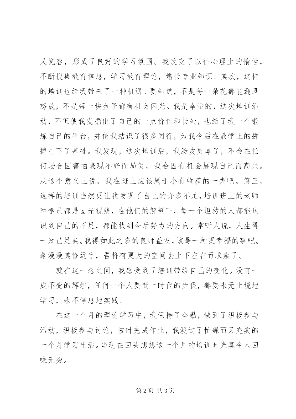 第PAGE\*Arabic\*MERGEFORMAT3页共NUMPAGES\*MERGEFORMAT3页理论培训个人工作总结(21)今年我参加了xx市为期两个月的xx工程骨干教师培训班学习。我在xx工程前一阶段的理论学习到今天也就告一段落了,总的来说,这为期一个月的理论培训内容丰富,形式多样,有各级教育专家的专题讲座,有市内一线教师的专题讲座,有学员围绕专题进行的各种论坛,也有学员的互动讨论。回首这一阶段的学习,既有观念上的洗礼,也有理论上的提高,既有知识上的积淀,也有教学技巧的增长。真是一次收获丰厚的学习,也是促进我教学上不断成长的学习啊。人的进步也许悬于一念之间,只在刹那一刻擦出的火花。从表面上看,这样的培训仿佛并不能从根本上解决什么问题,而且很辛苦。每天培训的时间很长,从早晨八点开始到下午四点半才结束,对于我们家远的老师每天来回真的很辛苦。可是给我们培训的老师大多经验丰富并有一定的理论高度。因而那点体力上的辛苦就因精神上的快乐而冲淡得毫无踪影了。问渠那得清如许,为有源头活水来。只有外界逼人的春风,清澈的流泉,飞速的火车,才能带给人本质上的革命,才能带出脱胎换骨的变化。同时对我来说这次培训,也有深远的意义。首先,它让我撞入了一种求学的氛围。不学习就要落后,不进步就得淘汰,要在教育这块土地上寻到自己的一亩三分地,学习是唯一的路。在培训班上,各位学员思维活跃,团结互助,开放而又严肃,竞争而又宽容,形成了良好的学习氛围。我改变了以往心理上的惰性,不断搜集教育信息,学习教育理论,增长专业知识。其次,这样的培训也给我带来了一种机遇。要知道,不是每一朵花都能迎风怒放,不是每一块金子都有机会闪光。我是幸运的,这次培训活动,不但使我发掘出了自己的一点价值和长处,也给了我一个锻炼自己的平台,并使我结识了很多同行,为我今后在教学上的拼搏打下了基础。我发现,这次培训后,我脸皮更厚了,不会在任何场合因害怕表现不好而局促,我会因有机会展现自己而高兴。从这个意义上说,我在班上应该属于小有收获的一类吧。第三,这样的培训当然更让我发现了自己的许多不足,培训班上的老师和学员都是x光视线,在他们的解剖下,每一个坦然的人都能认识到自己的不足,都能找到今后努力的方向。常听人说,人生得一知己足矣。我得如此之多的良师益友,该是一种更幸福的事吧。路漫漫其修远兮,吾将有更大的空间去上下左右而求索了。就在这一念之间,我感受到了培训带给自己的变化。没有一成不变的辉煌,任何一个人要赶上时代的步伐,都要永无止境地学习,永不停息地实践。在这一个月的理论学习中,我保持了全勤,做到了积极参与活动,积极参与讨论,按时完成作业,我渡过了忙碌而又充实的一个月学习生活。当现在回头想想这一个月的培训时光真令人回味无穷。其实培训只是一个手段,培训只是一个开端,对于培训给予的清泉,我要让它细水长流。我知道,骨干这一称谓带给人的不会有太多的荣誉,却有无尽的责任。悬语文教育之重任于肩,那该是何等沉重,无论将来我会不会有幸加入这一行列,我都会铭记这段骨干培训的日子,我自信,我将因此而振作精神,在教育天地中走得更宽,更远。
