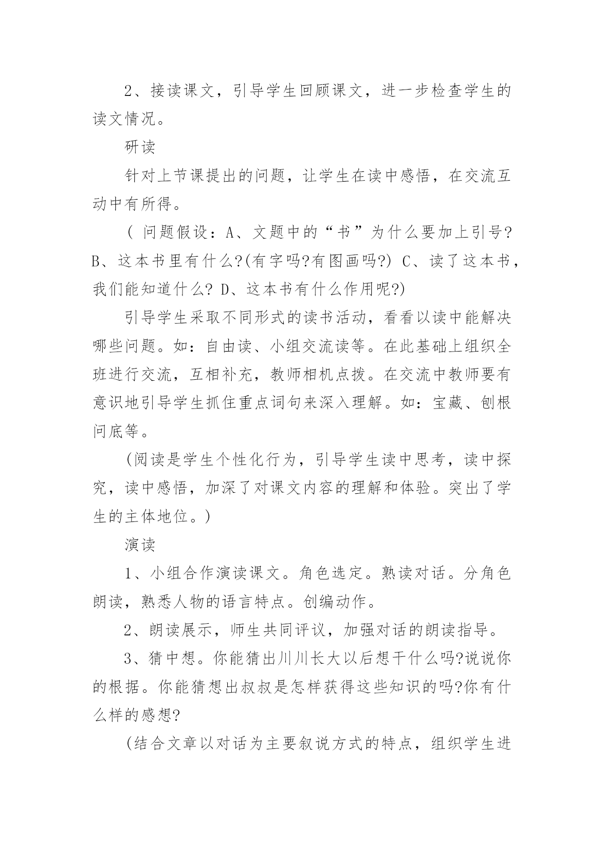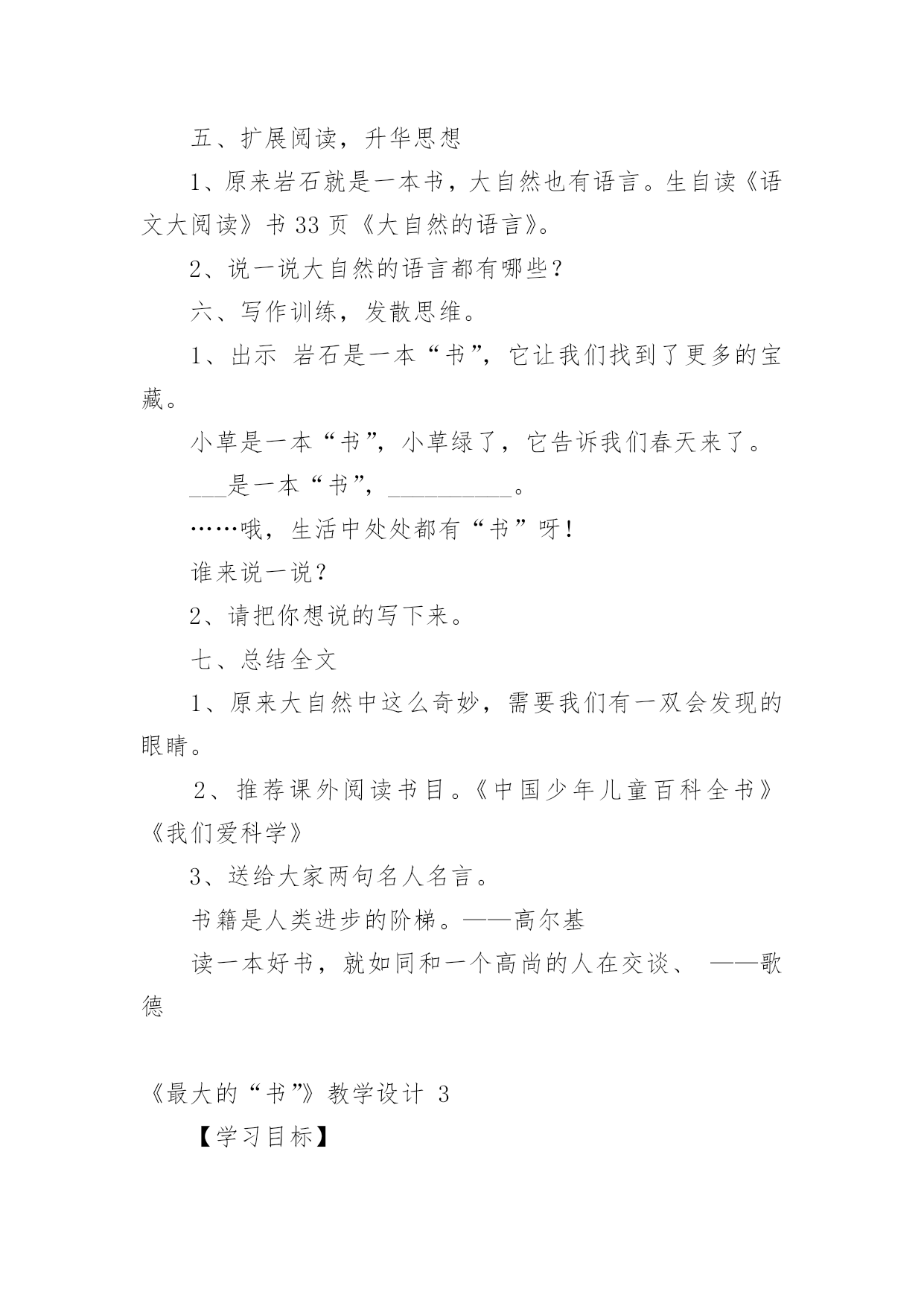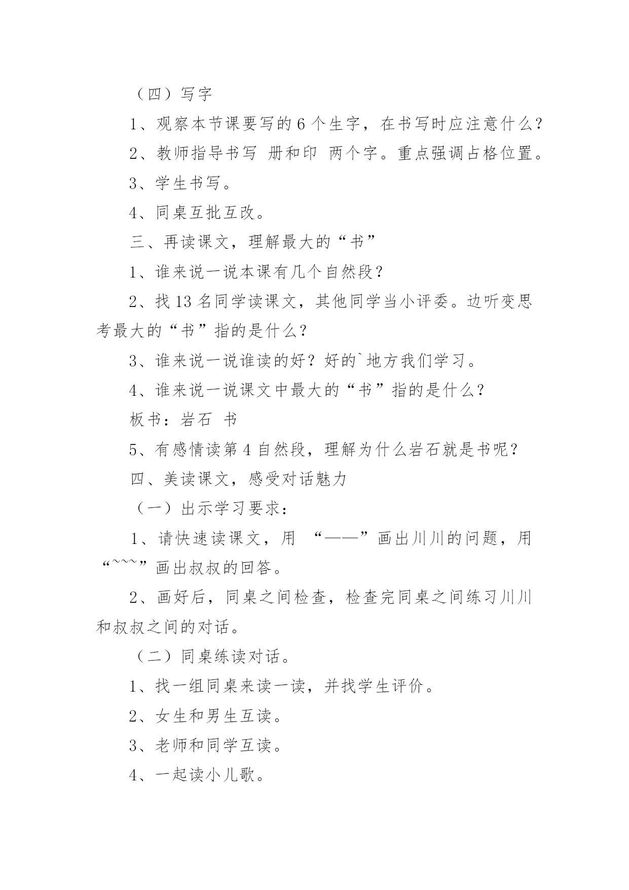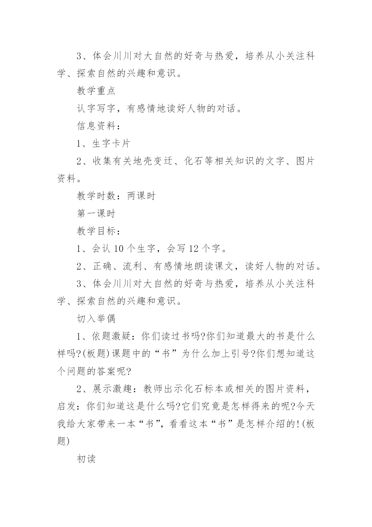 《最大的“书”》教学设计作为一名教职工,很有必要精心设计一份教学设计,教学设计是一个系统化规划教学系统的过程。优秀的教学设计都具备一些什么特点呢?下面是小编精心整理的《最大的“书”》教学设计,供大家参考借鉴,希望可以帮助到有需要的朋友。《最大的“书”》教学设计1课前透视本文记叙了爸爸与川川在爬山途中与地质勘探队员交流的所见所闻,间接地揭示了神奇的自然界是一座巨大的知识宝库。课文语言简洁,以对话贯穿全文,融地质知识于课文之中,字里行间充满儿童对大自然的好奇与热爱。通过学习培养学生从小关注科学,探索自然的意识。对小学生来讲,这篇课文的内容极富吸引力,同时以人物对话为主要叙说方式也是课文的一个显著特点。因此教学中,教师应加强对学生朗读课文的指导,特别要指导学生读好人物的对话,引导学生在对话中发现,体会,在对话的朗读中引发对自然科学知识产生浓厚的兴趣,产生研究、探索的愿望。教学目标1、会认10个生字,会写12个字。2、正确、流利、有感情地朗读课文,读好人物的对话。3、体会川川对大自然的好奇与热爱,培养从小关注科学、探索自然的兴趣和意识。教学重点认字写字,有感情地读好人物的对话。信息资料:1、生字卡片2、收集有关地壳变迁、化石等相关知识的文字、图片资料。教学时数:两课时第一课时教学目标:1、会认10个生字,会写12个字。2、正确、流利、有感情地朗读课文,读好人物的对话。3、体会川川对大自然的好奇与热爱,培养从小关注科学、探索自然的兴趣和意识。切入举偶1、依题激疑:你们读过书吗?你们知道最大的书是什么样吗?(板题)课题中的“书”为什么加上引号?你们想知道这个问题的答案呢?2、展示激趣:教师出示化石标本或相关的图片资料,启发:你们知道这是什么吗?它们究竟是怎样得来的呢?今天我给大家带来一本“书”,看看这本“书”是怎样介绍的!(板题)初读1、用自己喜欢的方式读课文,读准字音,把课文读通读顺,识字生字。出示“我会认”的内容,引导学生进行识字交流,可以采取组内交流的'形式,说说自己已经认识了哪些字,是怎样认识的?同时交流记字的方法,如熟字加偏旁、形近字换偏旁、组词语以及学生个性化的记字方法。同时把自己不懂的词语作一标记与组内的同学进行交流。2、利用生字卡片同桌互相检查识字情况。分段合作读文,互相检查读文情况。教师巡视吸收反馈。3、教师出示生字卡片,开火车读,相机引导学生交流识记重点字的方法。同时,教师强调重点字读音、字形等相关内容。如:“册”是平舌音;“质”读第四声;“岩”和“印”的声母都是“y"而不是"r";“痕”字的下面是“艮”不是“良”等。(识字能力是培养是一个循序渐进的过程,教师要有意识地去组织引导学生交流识字经验,培养学生自主识字的能力。)写字:1、出示“我会写”中的“岩、册、宝、刨、痕、质”2、引导学生从笔划、结构等方面观察这些字的特点。组织学生进行交流,教师相机强调。如:“厚”字上下都无点。“宝”字下边是“玉”不是“五一”。“印”字右边是单耳,不能写成双耳。3、“挑战难点字”。启发学生到板前书写大家认为不好写的字,师生评议。4、学生临写,教师巡视指导,同桌互相评议。展示优秀的作品。(观察、交流是写好字的一个重要前提,引导学生到板前范写难点字,激发学生写字的积极性,培养学生大胆尝试,向困难挑战的精神。相互交流与评议,促进了学生欣赏水平的提高。)质疑1、快速读文,思考:你还有什么不懂的地方吗?或者提出问题考考大家?2、组织交流,解决疑难。(这一环节,可有效地发展学生的问题意识,培养读书能力。解决学生在学习中出现的问题,及时地了解了学生对于课文内容的掌握情况。但要注意字词等方面的内容可以当场解决,其他涉及课文内容的问题,可以简略处理,为下节课作准备。)第二课时教学目标:1、巩固生字。2、分角色扮演,朗读课文。复习导入:1、听写(指读)词语:地质队员、勘探、岩石、波痕、煤炭、认真奇怪闪光透明宝藏足迹创根问底2、接读课文,引导学生回顾课文,进一步检查学生的读文情况。研读针对上节课提出的问题,让学生在读中感悟,在交流互动中有所得。(问题假设:A、文题中的“书”为什么要加上引号?B、这本书里有什么?(有字吗?有图画吗?)C、读了这本书,我们能知道什么?D、这本书有什么作用呢?)引导学生采取不同形式的读书活动,看看以读中能解决哪些问题。如:自由读、小组交流读等。在此基础上组织全班进行交流,互相补充,教师相机点拨。在交流中教师要有意识地引导学生抓住重点词句来深入理解。如:宝藏、刨根问底等。(阅读是学生个性化行为,引导学生读中思考,读中探究,读中感悟,加深了对课文内容的理解和体验。突出了学生的主体地位。)演读1、小组合作演读课文。角色选定。熟读对话。分角色朗读,熟悉人物的语言特点。创编动作。2、朗读展示,师生共同评议,加强对话的朗读指导。3、猜中想