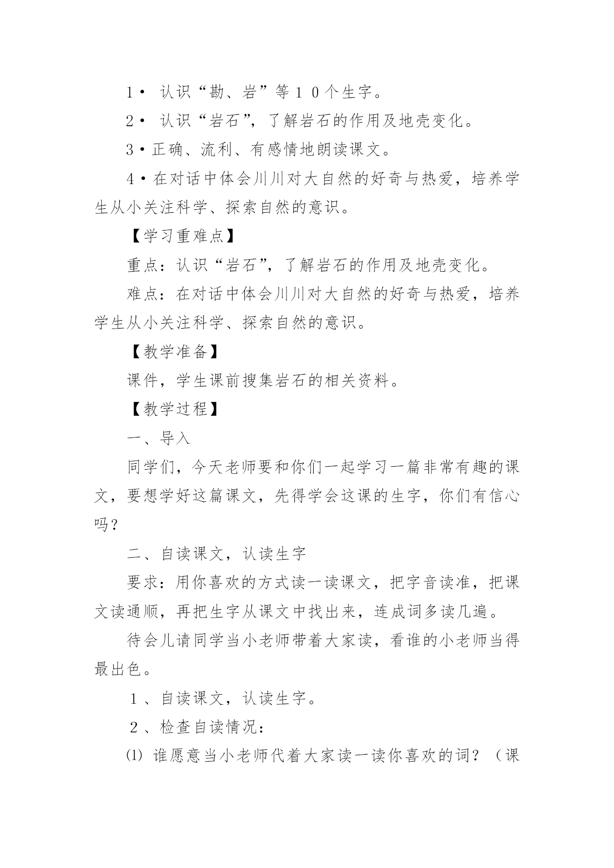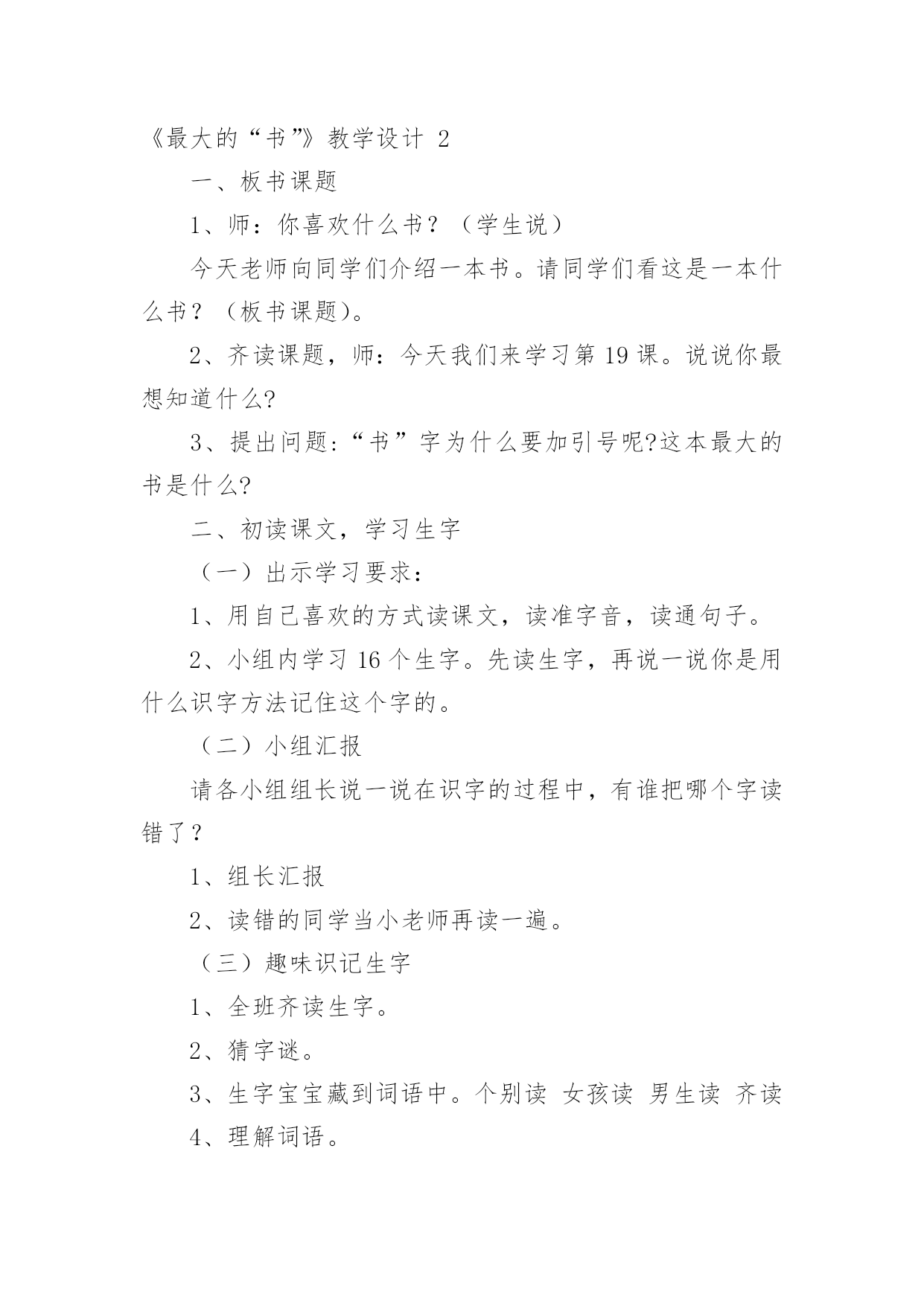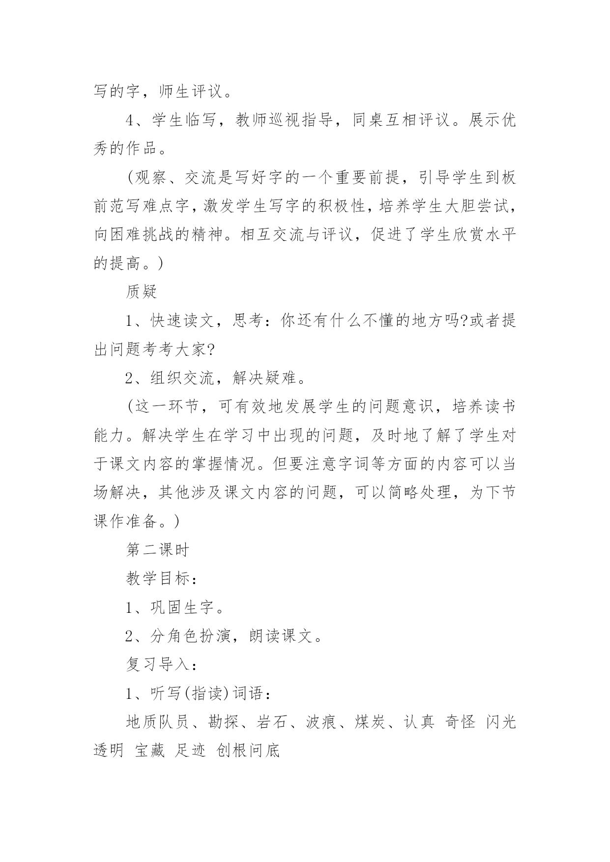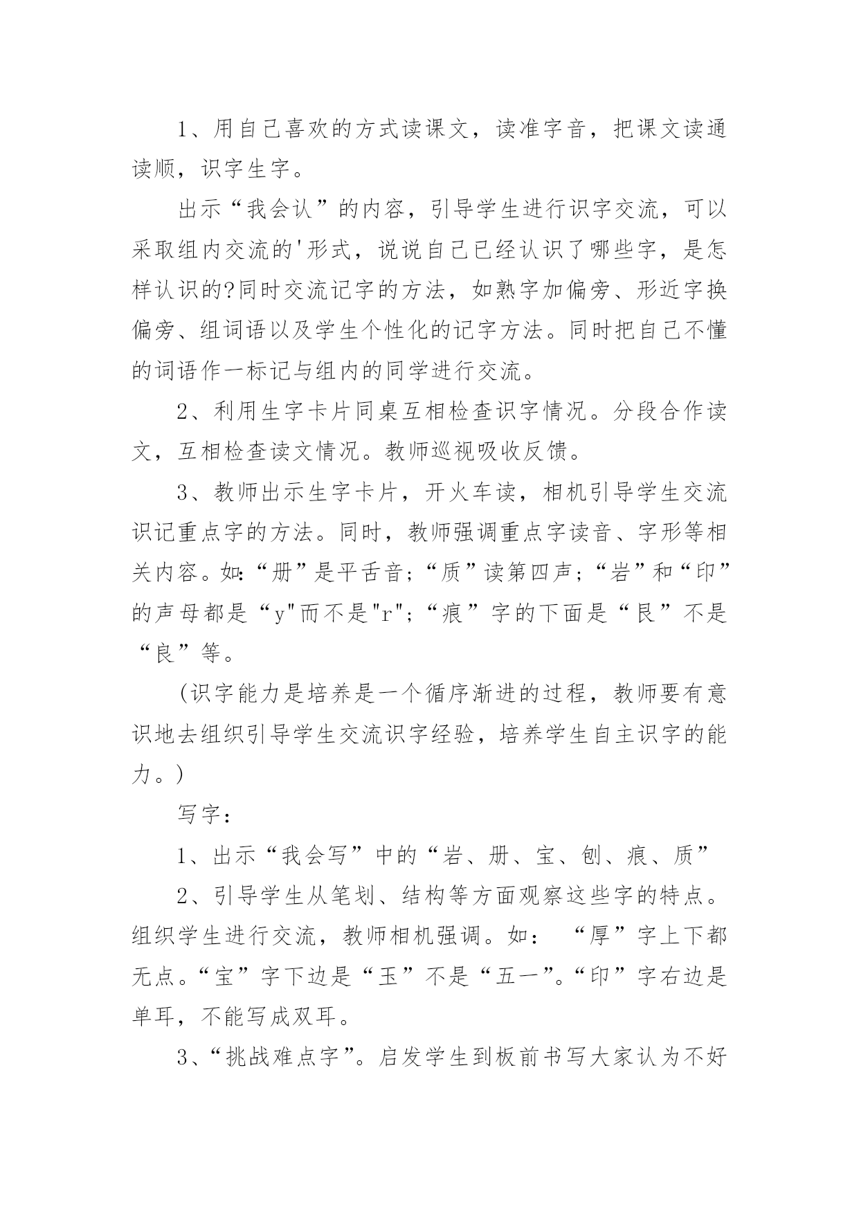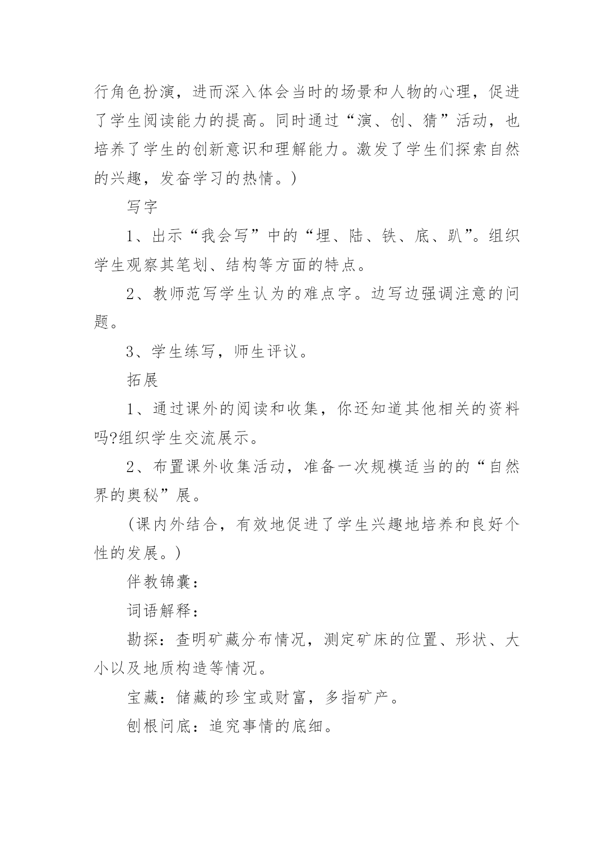 《最大的“书”》教学设计作为一名教职工,很有必要精心设计一份教学设计,教学设计是一个系统化规划教学系统的过程。优秀的教学设计都具备一些什么特点呢?下面是小编精心整理的《最大的“书”》教学设计,供大家参考借鉴,希望可以帮助到有需要的朋友。《最大的“书”》教学设计1课前透视本文记叙了爸爸与川川在爬山途中与地质勘探队员交流的所见所闻,间接地揭示了神奇的自然界是一座巨大的知识宝库。课文语言简洁,以对话贯穿全文,融地质知识于课文之中,字里行间充满儿童对大自然的好奇与热爱。通过学习培养学生从小关注科学,探索自然的意识。对小学生来讲,这篇课文的内容极富吸引力,同时以人物对话为主要叙说方式也是课文的一个显著特点。因此教学中,教师应加强对学生朗读课文的指导,特别要指导学生读好人物的对话,引导学生在对话中发现,体会,在对话的朗读中引发对自然科学知识产生浓厚的兴趣,产生研究、探索的愿望。教学目标1、会认10个生字,会写12个字。2、正确、流利、有感情地朗读课文,读好人物的对话。3、体会川川对大自然的好奇与热爱,培养从小关注科学、探索自然的兴趣和意识。教学重点认字写字,有感情地读好人物的对话。信息资料:1、生字卡片2、收集有关地壳变迁、化石等相关知识的文字、图片资料。教学时数:两课时第一课时教学目标:1、会认10个生字,会写12个字。2、正确、流利、有感情地朗读课文,读好人物的对话。3、体会川川对大自然的好奇与热爱,培养从小关注科学、探索自然的兴趣和意识。切入举偶1、依题激疑:你们读过书吗?你们知道最大的书是什么样吗?(板题)课题中的“书”为什么加上引号?你们想知道这个问题的答案呢?2、展示激趣:教师出示化石标本或相关的图片资料,启发:你们知道这是什么吗?它们究竟是怎样得来的呢?今天我给大家带来一本“书”,看看这本“书”是怎样介绍的!(板题)初读1、用自己喜欢的方式读课文,读准字音,把课文读通读顺,识字生字。出示“我会认”的内容,引导学生进行识字交流,可以采取组内交流的'形式,说说自己已经认识了哪些字,是怎样认识的?同时交流记字的方法,如熟字加偏旁、形近字换偏旁、组词语以及学生个性化的记字方法。同时把自己不懂的词语作一标记与组内的同学进行交流。2、利用生字卡片同桌互相检查识字情况。分段合作读文,互相检查读文情况。教师巡视吸收反馈。3、教师出示生字卡片,开火车读,相机引导学生交流识记重点字的方法。同时,教师强调重点字读音、字形等相关内容。如:“册”是平舌音;“质”读第四声;“岩”和“印”的声母都是“y"而不是"r";“痕”字的下面是“艮”不是“良”等。(识字能力是培养是一个循序渐进的过程,教师要有意识地去组织引导学生交流识字经验,培养学生自主识字的能力。)写字:1、出示“我会写”中的“岩、册、宝、刨、痕、质”2、引导学生从笔划、结构等方面观察这些字的特点。组织学生进行交流,教师相机强调。如:“厚”字上下都无点。“宝”字下边是“玉”不是“五一”。“印”字右边是单耳,不能写成双耳。3、“挑战难点字”。启发学生到板前书写大家认为不好写的字,师生评议。4、学生临写,教师巡视指导,同桌互相评议。展示优秀的作品。(观察、交流是写好字的一个重要前提,引导学生到板前范写难点字,激发学生写字的积极性,培养学生大胆尝试,向困难挑战的精神。相互交流与评议,促进了学生欣赏水平的提高。)质疑1、快速读文,思考:你还有什么不懂的地方吗?或者提出问题考考大家?2、组织交流,解决疑难。(这一环节,可有效地发展学生的问题意识,培养读书能力。解决学生在学习中出现的问题,及时地了解了学生对于课文内容的掌握情况。但要注意字词等方面的内容可以当场解决,其他涉及课文内容的问题,可以简略处理,为下节课作准备。)第二课时教学目标:1、巩固生字。2、分角色扮演,朗读课文。复习导入:1、听写(指读)词语:地质队员、勘探、岩石、波痕、煤炭、认真奇怪闪光透明宝藏足迹创根问底2、接读课文,引导学生回顾课文,进一步检查学生的读文情况。研读针对上节课提出的问题,让学生在读中感悟,在交流互动中有所得。(问题假设:A、文题中的“书”为什么要加上引号?B、这本书里有什么?(有字吗?有图画吗?)C、读了这本书,我们能知道什么?D、这本书有什么作用呢?)引导学生采取不同形式的读书活动,看看以读中能解决哪些问题。如:自由读、小组交流读等。在此基础上组织全班进行交流,互相补充,教师相机点拨。在交流中教师要有意识地引导学生抓住重点词句来深入理解。如:宝藏、刨根问底等。(阅读是学生个性化行为,引导学生读中思考,读中探究,读中感悟,加深了对课文内容的理解和体验。突出了学生的主体地位。)演读1、小组合作演读课文。角色选定。熟读对话。分角色朗读,熟悉人物的语言特点。创编动作。2、朗读展示,师生共同评议,加强对话的朗读指导。3、猜中想