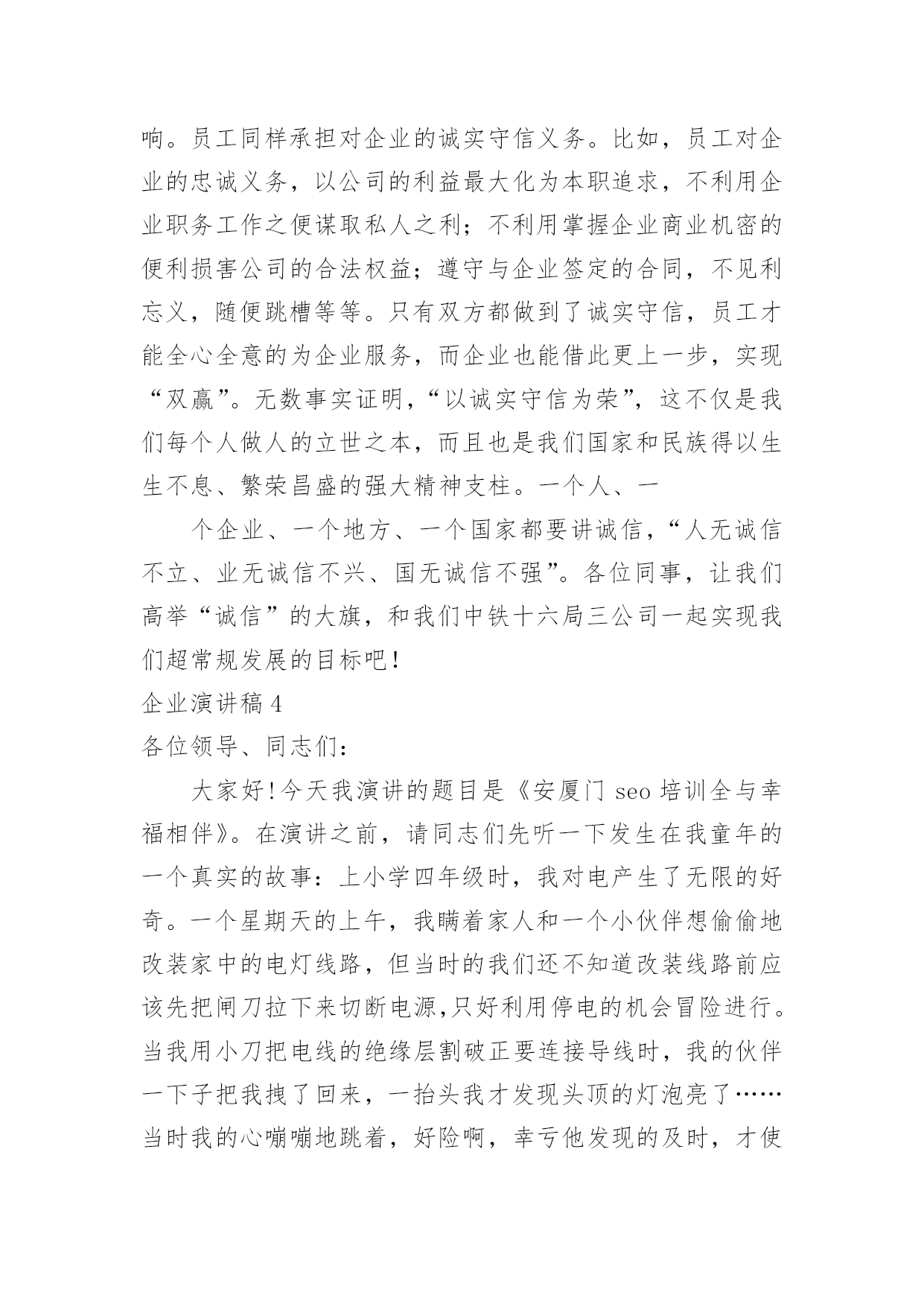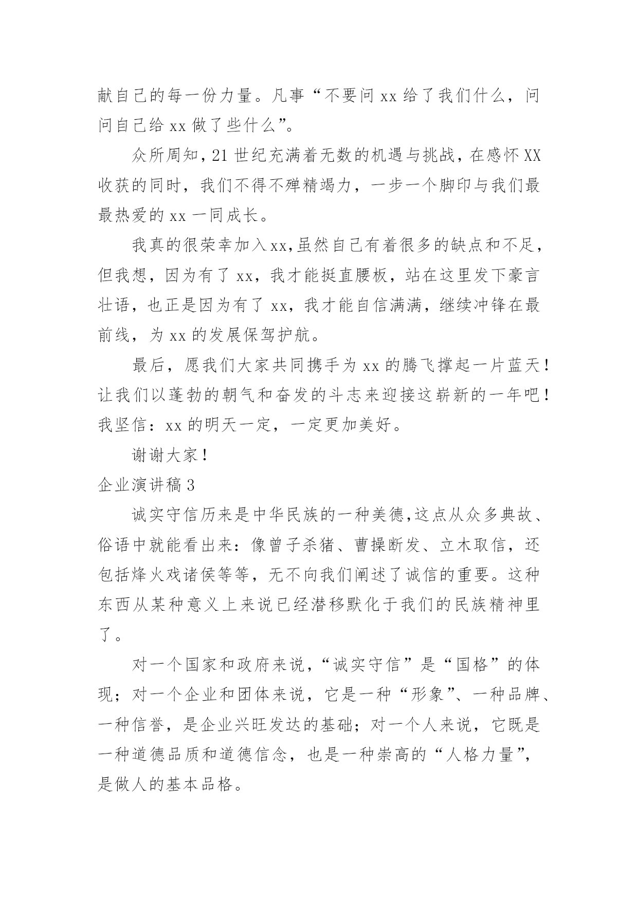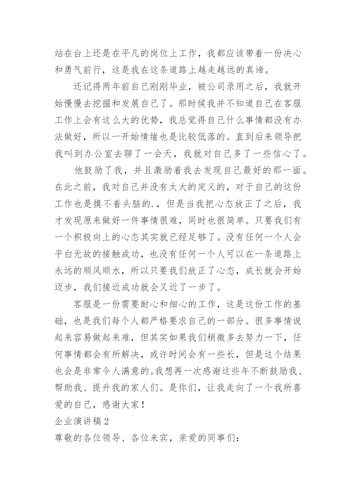 企业演讲稿企业演讲稿演讲稿以发表意见,表达观点为主,是为演讲而事先准备好的文稿。在生活中,能够利用到演讲稿的场合越来越多,来参考自己需要的演讲稿吧!下面是小编收集整理的企业演讲稿,仅供参考,大家一起来看看吧。企业演讲稿1尊敬的领导,亲爱的同事们:大家好!今天,我带着一份客服工作的荣耀站在这里。能够被这样的一份荣光环绕,是我在这份工作上最为自豪的一件事情。我知道,今天我头上所顶着的光亮,是每一位领导以及同事对我的支持和鼓励,也是大家对我之前工作的认可和肯定,我很开心在这个集体之中工作生活,也很开心在公司这个平台上发展创造,在这里,我真诚的感谢我们的公司,也真诚的感谢每一位帮助过我的家人,谢谢大家!这次在员工大会上发言我真的很紧张。因为我进入这个行业不是很久,现在就得到了这一份殊荣,我真的很激动同时也很害怕,我害怕自己会因为一点小失误而让大家失望,我也很害怕自己不够胆大,让大家看到了我不好的一面。但是这次,我还是鼓励了自己要勇敢出发,不要害怕,不管是站在台上还是在平凡的岗位上工作,我都应该带着一份决心和勇气前行,这是我在这条道路上越走越远的真谛。还记得两年前自己刚刚毕业,被公司录用之后,我就开始慢慢去挖掘和发展自己了。那时候我并不知道自己在客服工作上会有这么大的优势,我总觉得自己什么事情都没有办法做好,所以一开始情绪也是比较低落的。直到后来领导把我叫到办公室去聊了一会天,我就对自己多了一些信心了。他鼓励了我,并且激励着我去发现自己最好的那一面。在此之前,我对自己并没有太大的定义的,对于自己的这份工作也是摸不着头脑的.,但是当我把心态放正了之后,我才发现原来做好一件事情很难,同时也很简单。只要我们有一个积极向上的心态其实就已经足够了。没有任何一个人会平白无故的接触成功,也没有任何一个人可以在一条道路上永远的顺风顺水,所以只要我们放正了心态,成长就会开始迈步,我们接近成功就会又近了一步了。客服是一份需要耐心和细心的工作,这是这份工作的基础,也是我们每个人都严格要求自己的一部分。很多事情说起来容易做起来难,但其实如果我们稍微多去努力一下,任何事情都会有所解决,或许时间会有一些长,但是这个结果也会是非常令人满意的。我想再一次感谢这些年不断鼓励我、帮助我、提升我的家人们。是你们,让我走向了一个我所喜爱的自己,感谢大家!企业演讲稿2尊敬的各位领导、各位来宾,亲爱的同事们:大家晚上好!我叫xxx,作为一名xx的普通员工,此时此刻的我感到无比的高兴与自豪,在辞去旧岁迎接新春的时刻祝愿公司生意兴隆,事业亨通;并同时祝愿公司领导及全体员工身体健康,吉祥如意!言归正传,我带给大家的演讲是《我与xx同发展》。听,XX的钟声就要敲响,神州大地一派歌舞升平;看,XX的春天即将来到,xx公司一片欣欣向荣。时光荏苒,转眼间,公司已风风雨雨走过了十多个年头。xx今天的辉煌,难道不是在公司各级领导的精明指引和员工的不懈努力下,浇铸了多少汗水和泪水才换回的`硕果吗?不断锐意创新,勇创佳绩,这就是我们xx。在此,我不得不说一声:xx,我爱您!是您把来自五湖四海的我们团结在了一起,也是您教会了我们在困难面前努力拼搏与奋斗,更是您--xx让我重获新生,在不断地自我完善过程中找到了新方向,新发展,新目标!我们深深懂得,xx的每一次发展与壮大是我们每一个普通员工最大的骄傲,xx的每一次成长与进步更是我们每一个普通员工最终的梦想。我们永远相信,思想有多远,我们就有信心让xx走多远。效率上去了,我们笑了;业绩提升了,我们笑了;xx繁荣了,我们笑了!员工是xx的种子,是xx鲜活生命的传承延续;xx是员工的雨露,是员工茁壮成长的坚实臂膀。所以,站在第一条战线的我们必须要更加勤奋地工作,爱岗敬业,为xx的美好未来献计献策,为xx的加速腾飞添砖加瓦,贡献自己的每一份力量。凡事“不要问xx给了我们什么,问问自己给xx做了些什么”。众所周知,21世纪充满着无数的机遇与挑战,在感怀XX收获的同时,我们不得不殚精竭力,一步一个脚印与我们最最热爱的xx一同成长。我真的很荣幸加入xx,虽然自己有着很多的缺点和不足,但我想,因为有了xx,我才能挺直腰板,站在这里发下豪言壮语,也正是因为有了xx,我才能自信满满,继续冲锋在最前线,为xx的发展保驾护航。最后,愿我们大家共同携手为xx的腾飞撑起一片蓝天!让我们以蓬勃的朝气和奋发的斗志来迎接这崭新的一年吧!我坚信:xx的明天一定,一定更加美好。谢谢大家!企业演讲稿3诚实守信历来是中华民族的一种美德,这点从众多典故、俗语中就能看出来:像曾子杀猪、曹操断发、立木取信,还包括烽火戏诸侯等等,无不向我们阐述了诚信的重要。这种东西从某种意义上来说已经潜移默化于我们的民族精神里了。对一个国家和政府来说,“诚实守信”是“国格”的体现;对一个企业和团体来说,它是一种“形象
