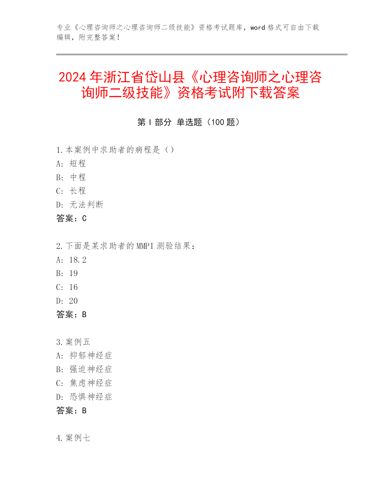 2024年浙江省岱山县《心理咨询师之心理咨询师二级技能》资格考试附下载答案