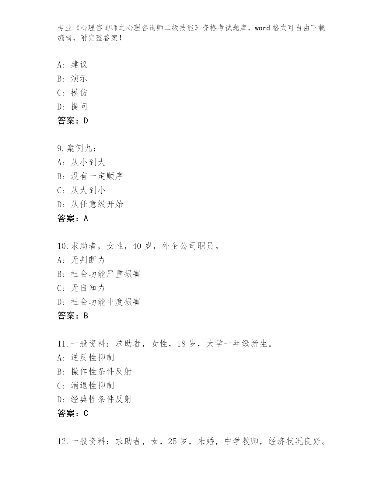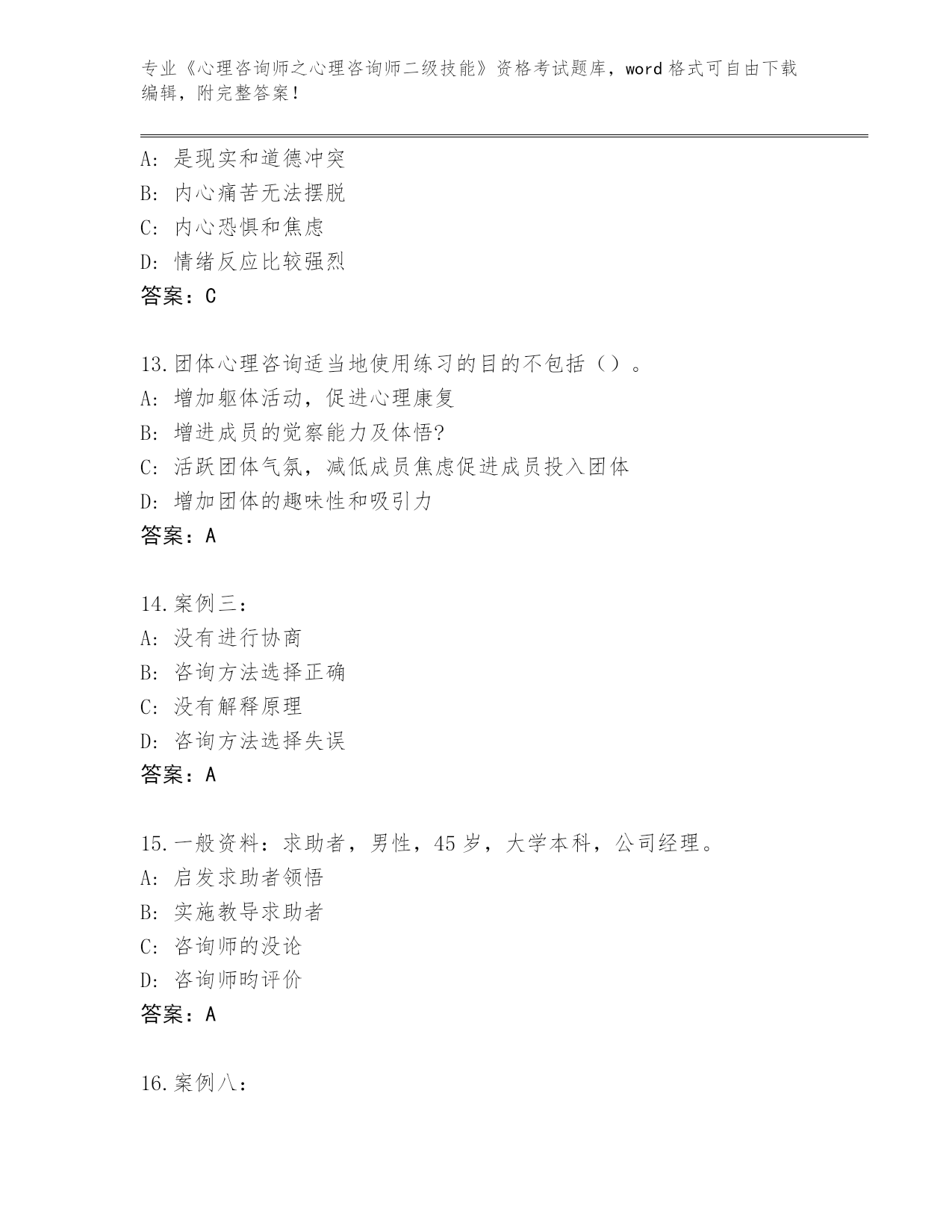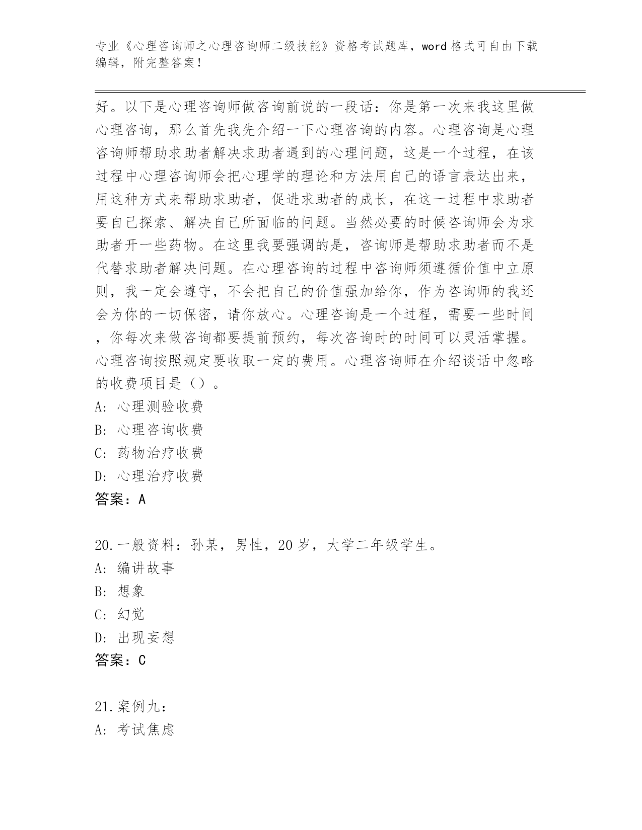 浙江省云和县2024《心理咨询师之心理咨询师二级技能》资格考试王牌题库含答案下载