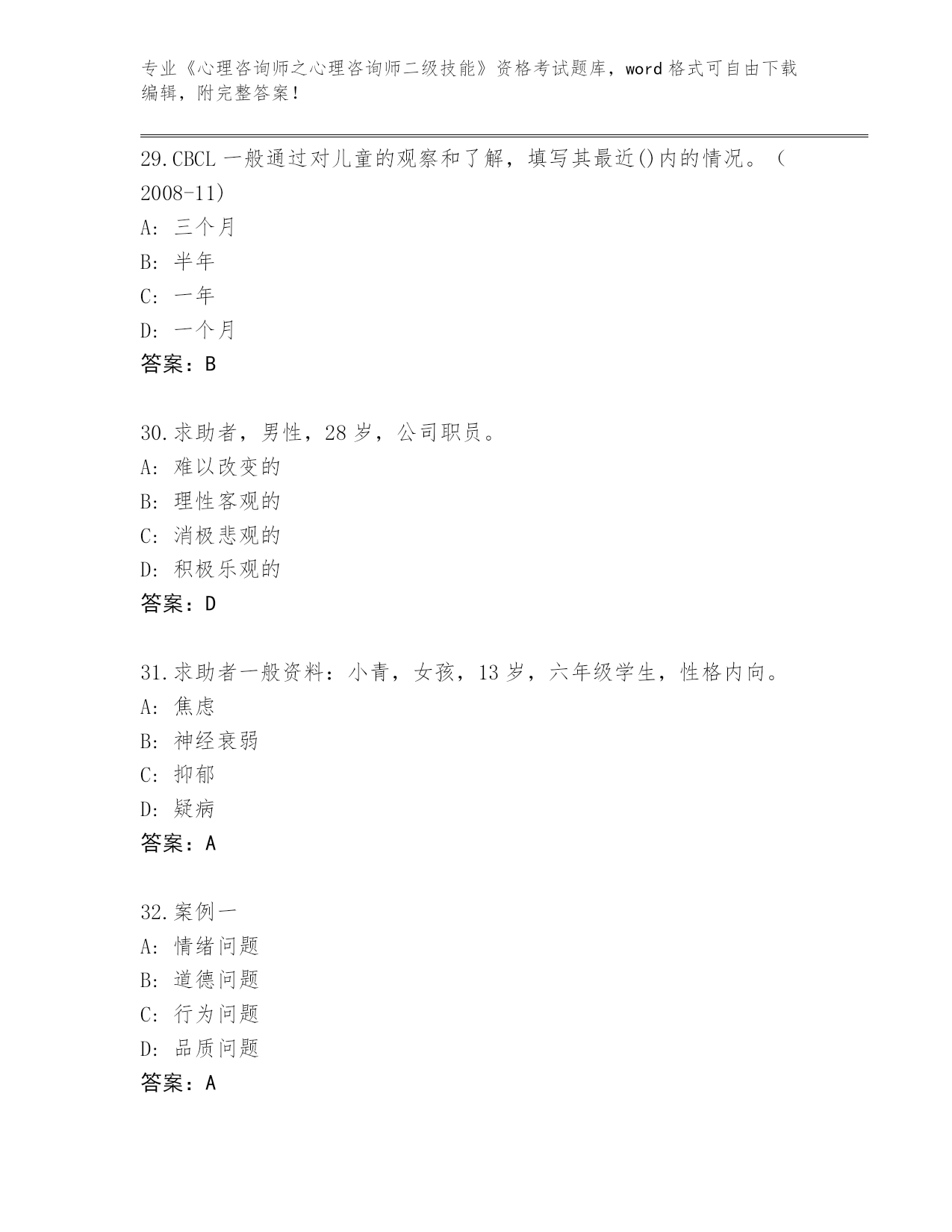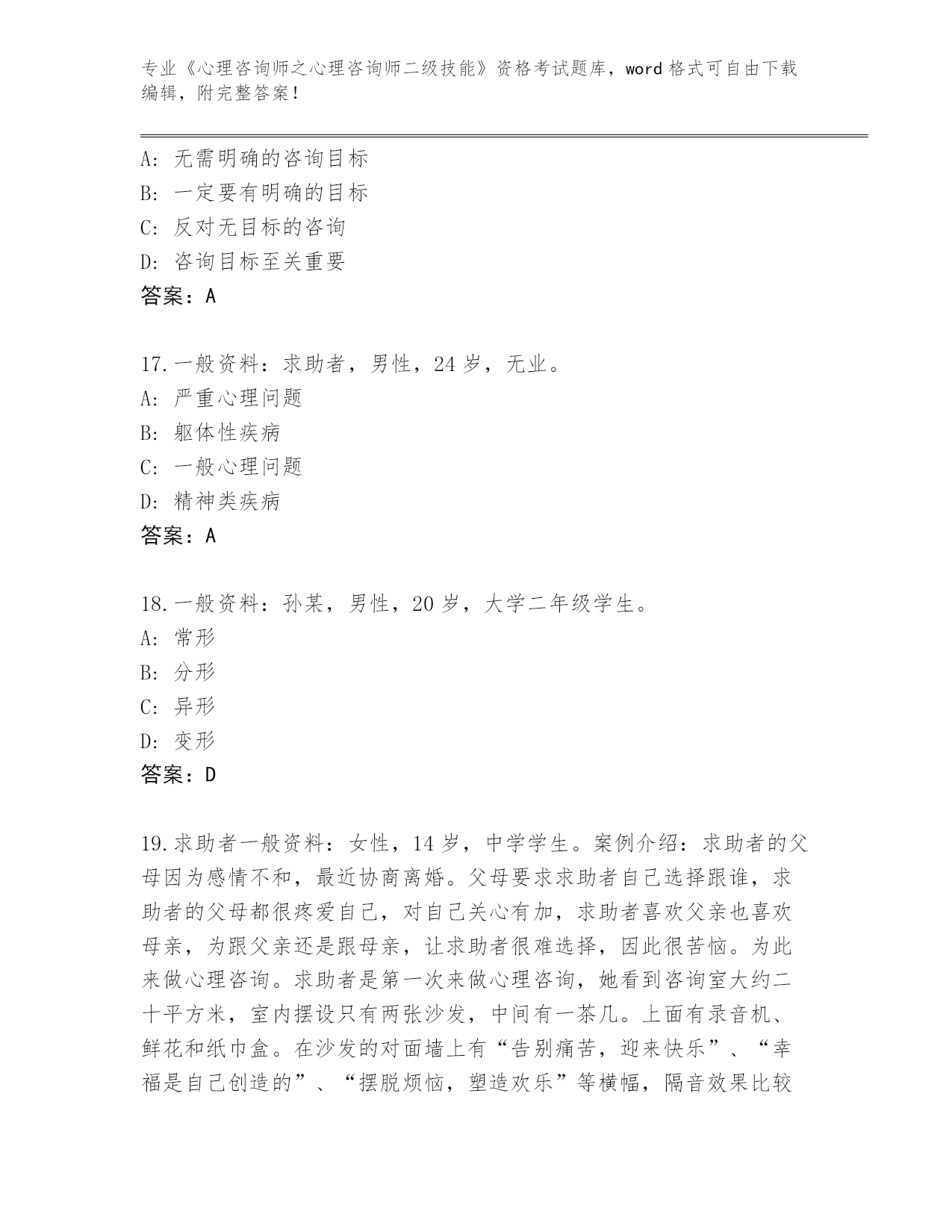 湖北省孝南区《心理咨询师之心理咨询师二级技能》考试附答案下载