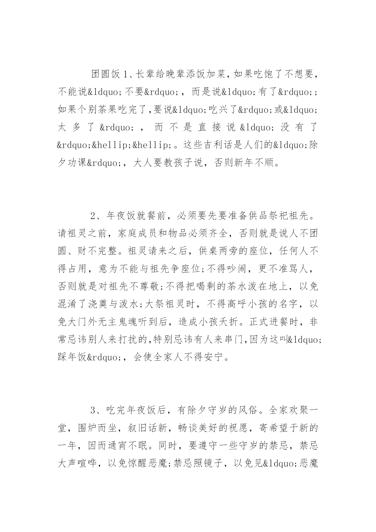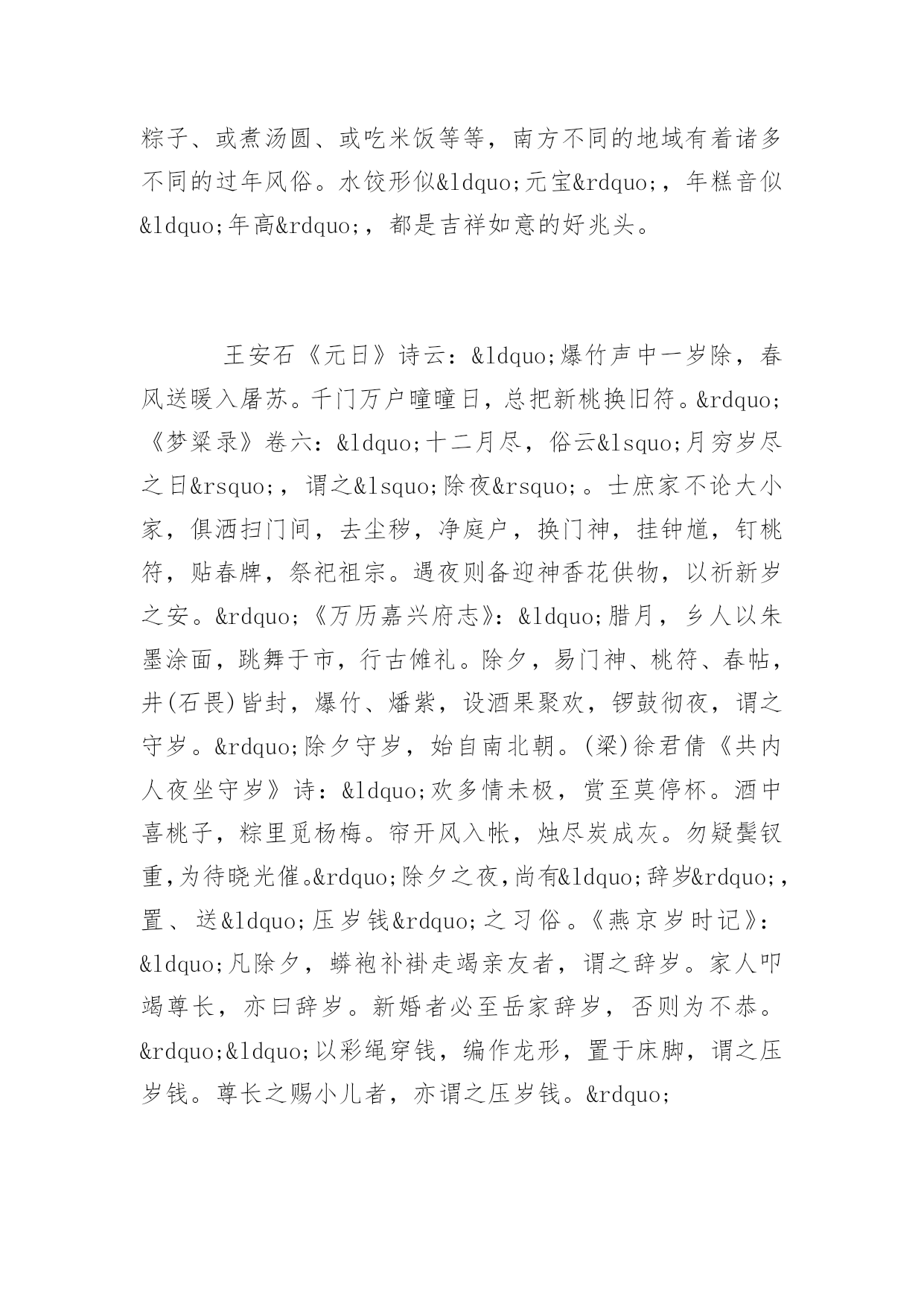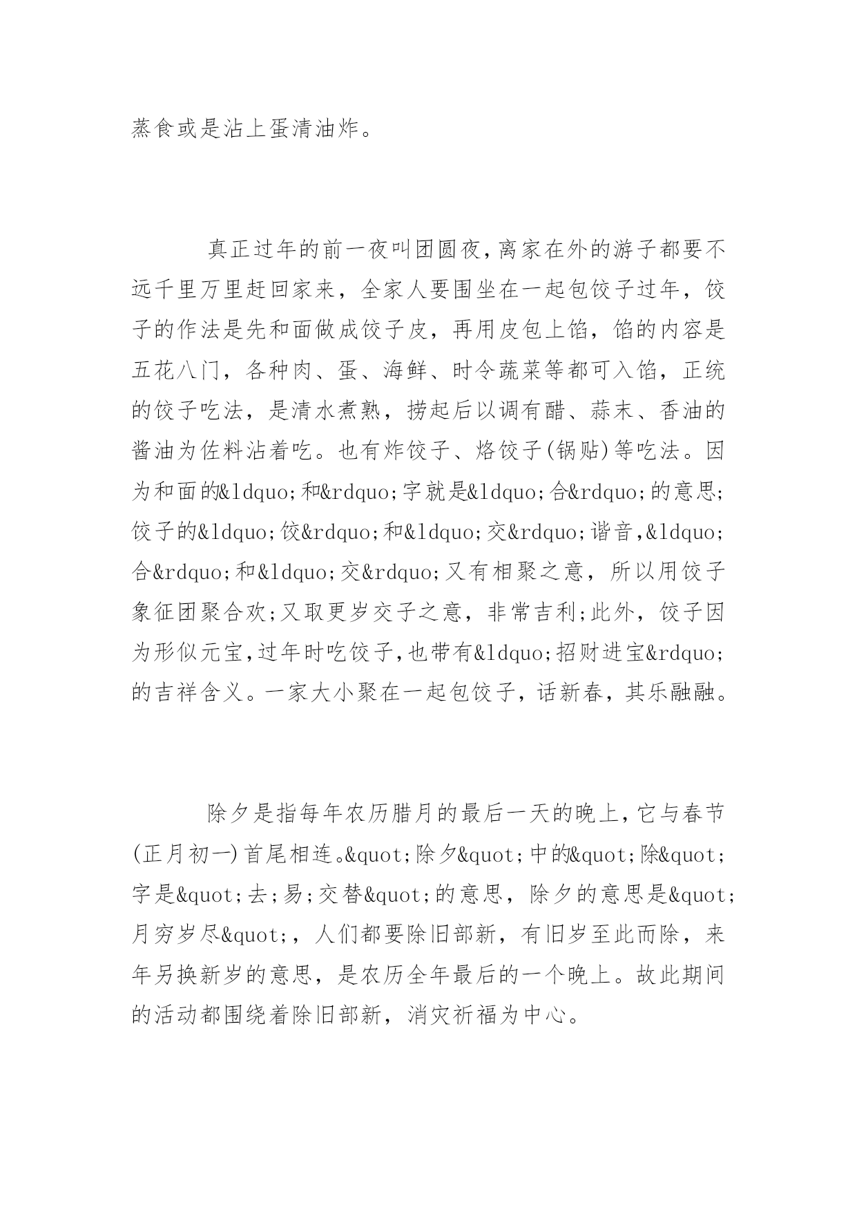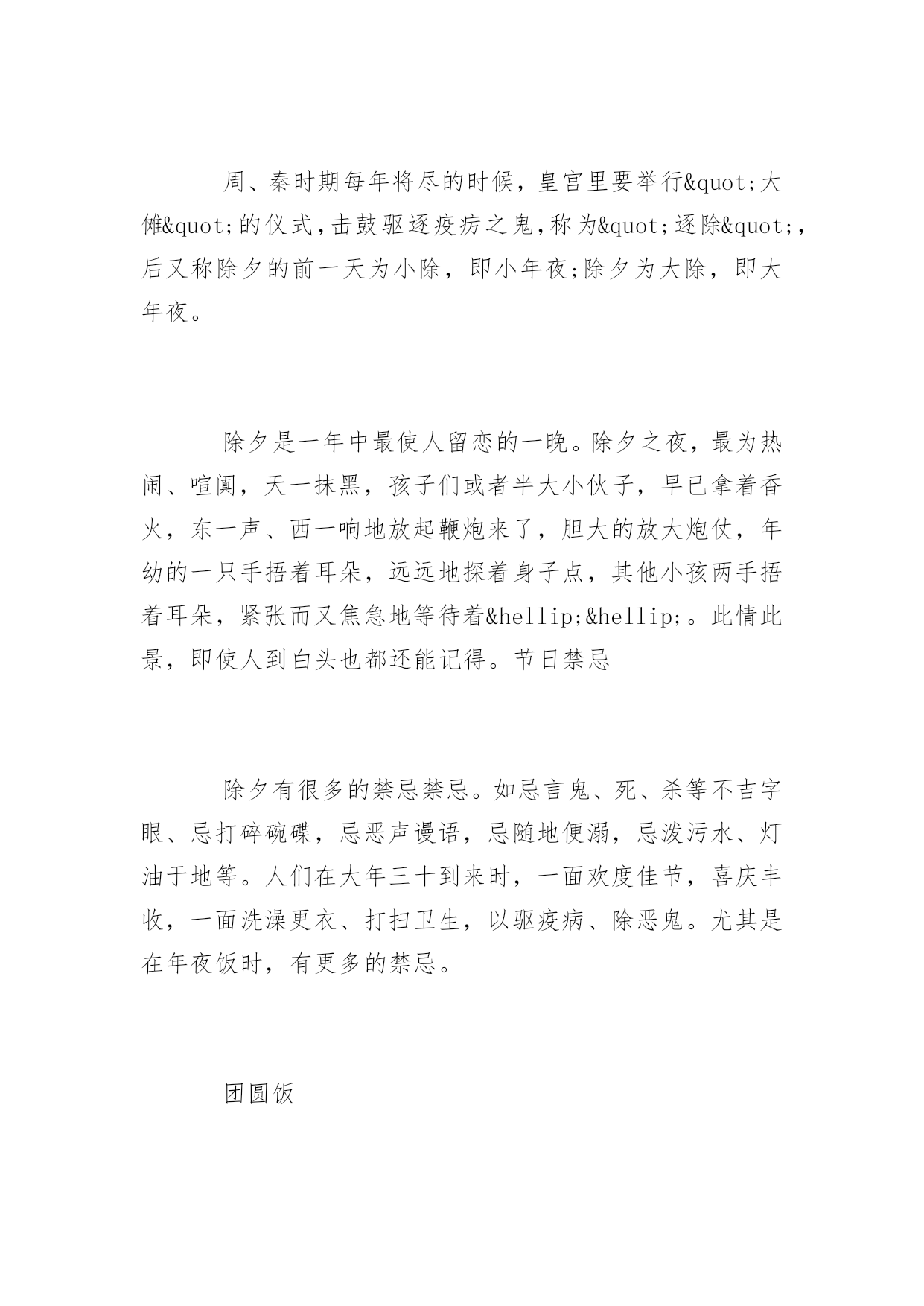 高考素材:除夕的相关传说2017年高考素材:关于除夕的相关传说大全导语:除夕,又称大年夜、除夜、岁除、大晦日,是农历一年最后一天的晚上,即春节前一天晚。农历十二月多为大月,有三十天,所以又称为大年三十、年三十、年三十晚、年三十夜。而十二月小月時为廿九日,有些地区又会改称二九暝。“除夕”中“除”字的本义是“去”,引申为“易”,即交替;“夕”字的本义是“日暮”,引申为“夜晚”。因而“除夕”便含有旧岁到次夕而除,明日即另换新...下面是小编整理的一些相关作文素材,欢迎查阅,谢谢。2017年高考素材:关于除夕的相关传说大全节日食俗在古代的农业社会里,大约自腊月初八以后,家庭主妇们就要忙着张罗过年的食品了。因为腌制腊味所需的时间较长,所以必须尽早准备,我国许多省份都有腌腊味的习俗,其中又以广东省的腊味最为著名。蒸年糕蒸年糕蒸年糕,年糕因为谐音“年高”,再加上有着变化多端的口味,几乎成了家家必备的应景食品。年糕的式样有方块状的黄、白年糕,象征着黄金、白银,寄寓新年发财的意思。年糕的口味因地而异。北京人喜食江米或黄米制成的红枣年糕、百果年糕和白年糕。河北人则喜欢在年糕中加入大枣、小红豆及绿豆等一起蒸食。山西北部在内蒙古等地,过年时习惯吃黄米粉油炸年糕,有的还包上豆沙、枣泥等馅,山东人则用黄米、红枣蒸年糕。北方的年糕以甜为主,或蒸或炸,也有人干脆沾糖吃。南方的年糕则甜咸兼具,例如苏州及宁波的年糕,以粳米制作,味道清淡。除了蒸、炸以外,还可以切片炒食或是煮汤。甜味的年糕以糯米粉加白糖、猪油、玫瑰、桂花、薄荷、素蓉等配料,做工精细,可以直接蒸食或是沾上蛋清油炸。真正过年的前一夜叫团圆夜,离家在外的游子都要不远千里万里赶回家来,全家人要围坐在一起包饺子过年,饺子的作法是先和面做成饺子皮,再用皮包上馅,馅的内容是五花八门,各种肉、蛋、海鲜、时令蔬菜等都可入馅,正统的饺子吃法,是清水煮熟,捞起后以调有醋、蒜末、香油的酱油为佐料沾着吃。也有炸饺子、烙饺子(锅贴)等吃法。因为和面的“和”字就是“合”的意思;饺子的“饺”和“交”谐音,“合”和“交”又有相聚之意,所以用饺子象征团聚合欢;又取更岁交子之意,非常吉利;此外,饺子因为形似元宝,过年时吃饺子,也带有“招财进宝”的吉祥含义。一家大小聚在一起包饺子,话新春,其乐融融。除夕是指每年农历腊月的最后一天的晚上,它与春节(正月初一)首尾相连。"除夕"中的"除"字是"去;易;交替"的意思,除夕的意思是"月穷岁尽",人们都要除旧部新,有旧岁至此而除,来年另换新岁的意思,是农历全年最后的一个晚上。故此期间的活动都围绕着除旧部新,消灾祈福为中心。周、秦时期每年将尽的时候,皇宫里要举行"大傩"的仪式,击鼓驱逐疫疠之鬼,称为"逐除",后又称除夕的前一天为小除,即小年夜;除夕为大除,即大年夜。除夕是一年中最使人留恋的一晚。除夕之夜,最为热闹、喧阗,天一抹黑,孩子们或者半大小伙子,早已拿着香火,东一声、西一响地放起鞭炮来了,胆大的放大炮仗,年幼的一只手捂着耳朵,远远地探着身子点,其他小孩两手捂着耳朵,紧张而又焦急地等待着……。此情此景,即使人到白头也都还能记得。节日禁忌除夕有很多的禁忌禁忌。如忌言鬼、死、杀等不吉字眼、忌打碎碗碟,忌恶声谩语,忌随地便溺,忌泼污水、灯油于地等。人们在大年三十到来时,一面欢度佳节,喜庆丰收,一面洗澡更衣、打扫卫生,以驱疫病、除恶鬼。尤其是在年夜饭时,有更多的禁忌。团圆饭团圆饭1、长辈给晚辈添饭加菜,如果吃饱了不想要,不能说“不要”,而是说“有了”;如果个别茶果吃完了,要说“吃兴了”或“太多了”,而不是直接说“没有了”……。这些吉利话是人们的“除夕功课”,大人要教孩子说,否则新年不顺。2、年夜饭就餐前,必须要先要准备供品祭祀祖先。请祖灵之前,家庭成员和物品必须齐全,否则就是说人不团圆、财不完整。祖灵请来之后,供桌两旁的座位,任何人不得占用,意为不能与祖先争座位;不得吵闹,更不