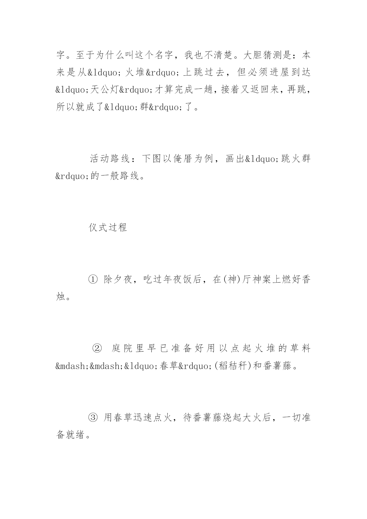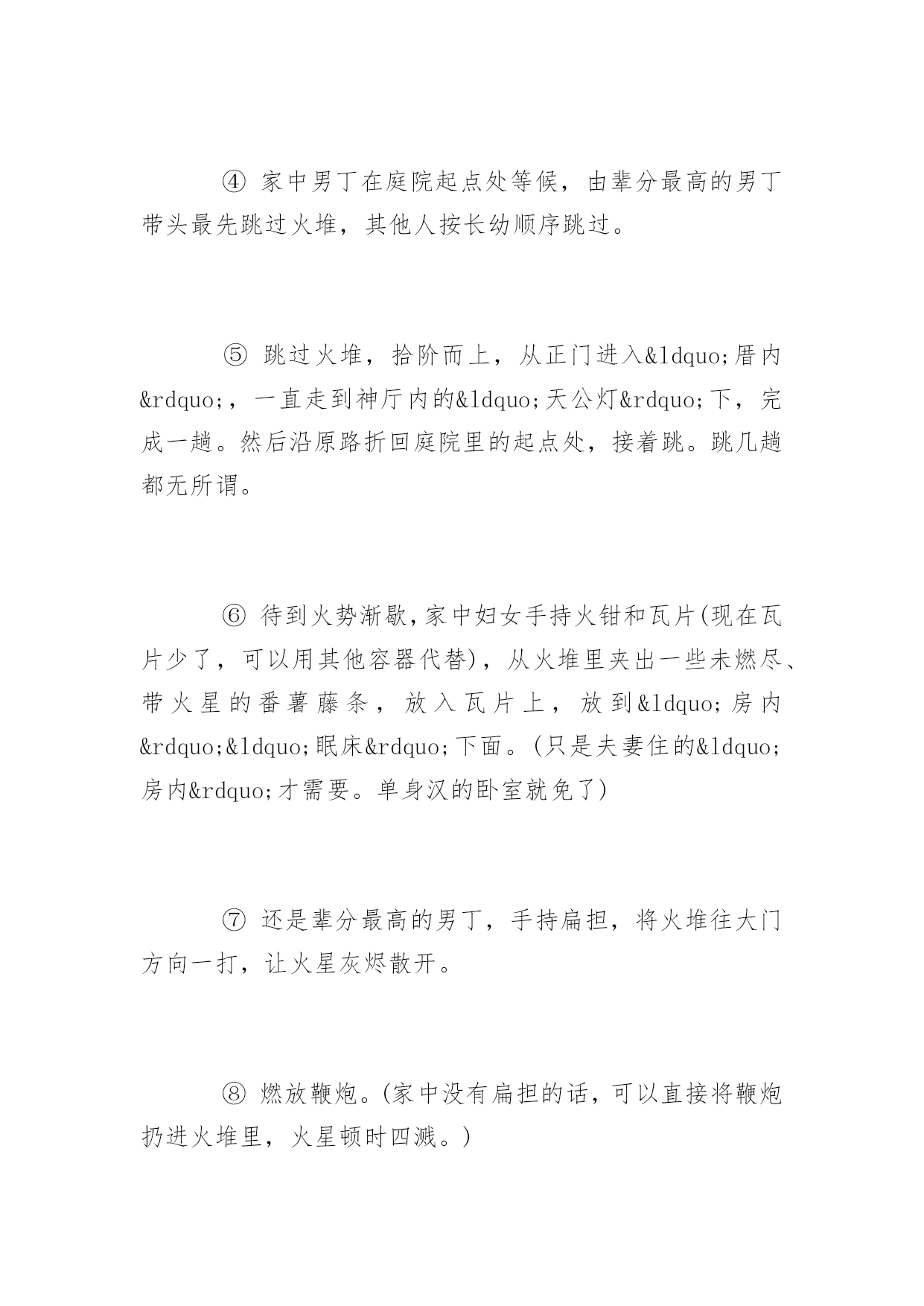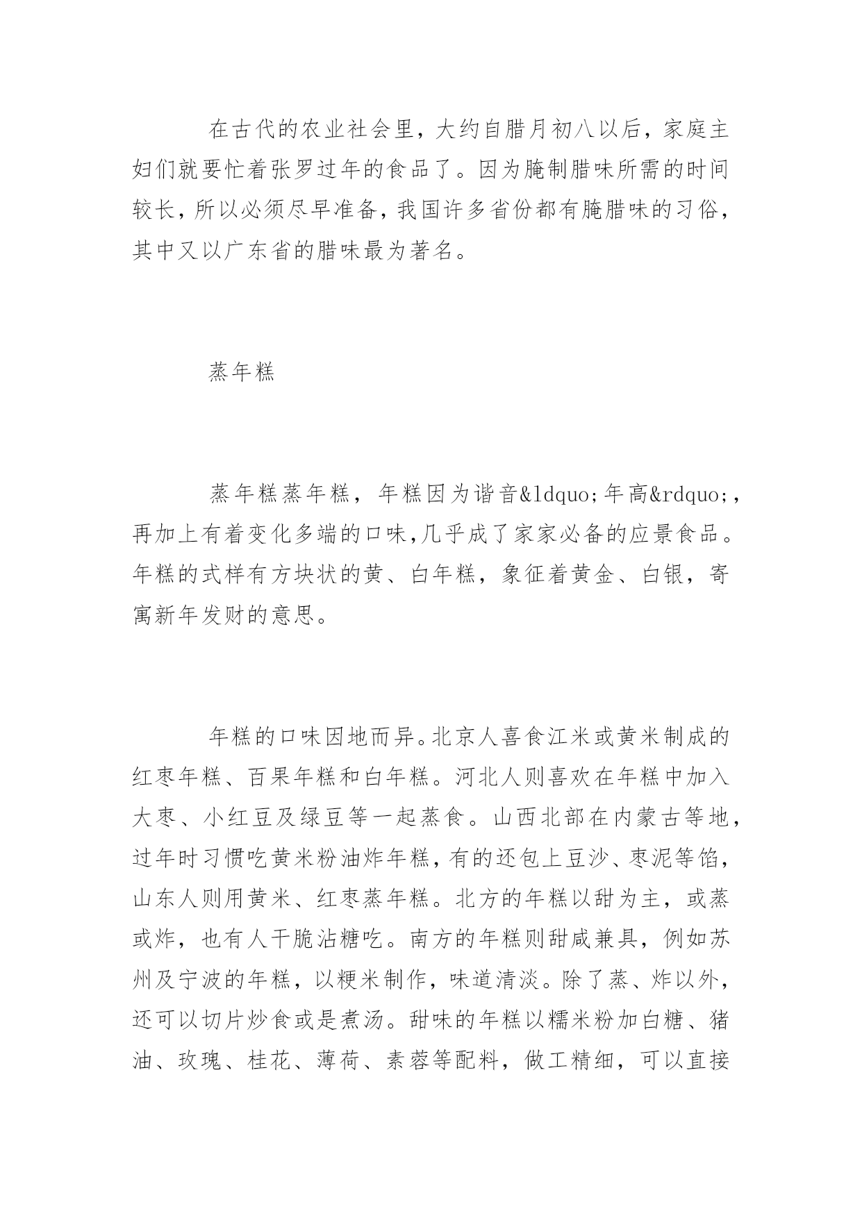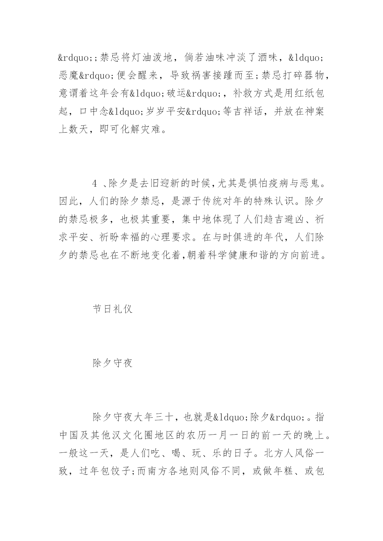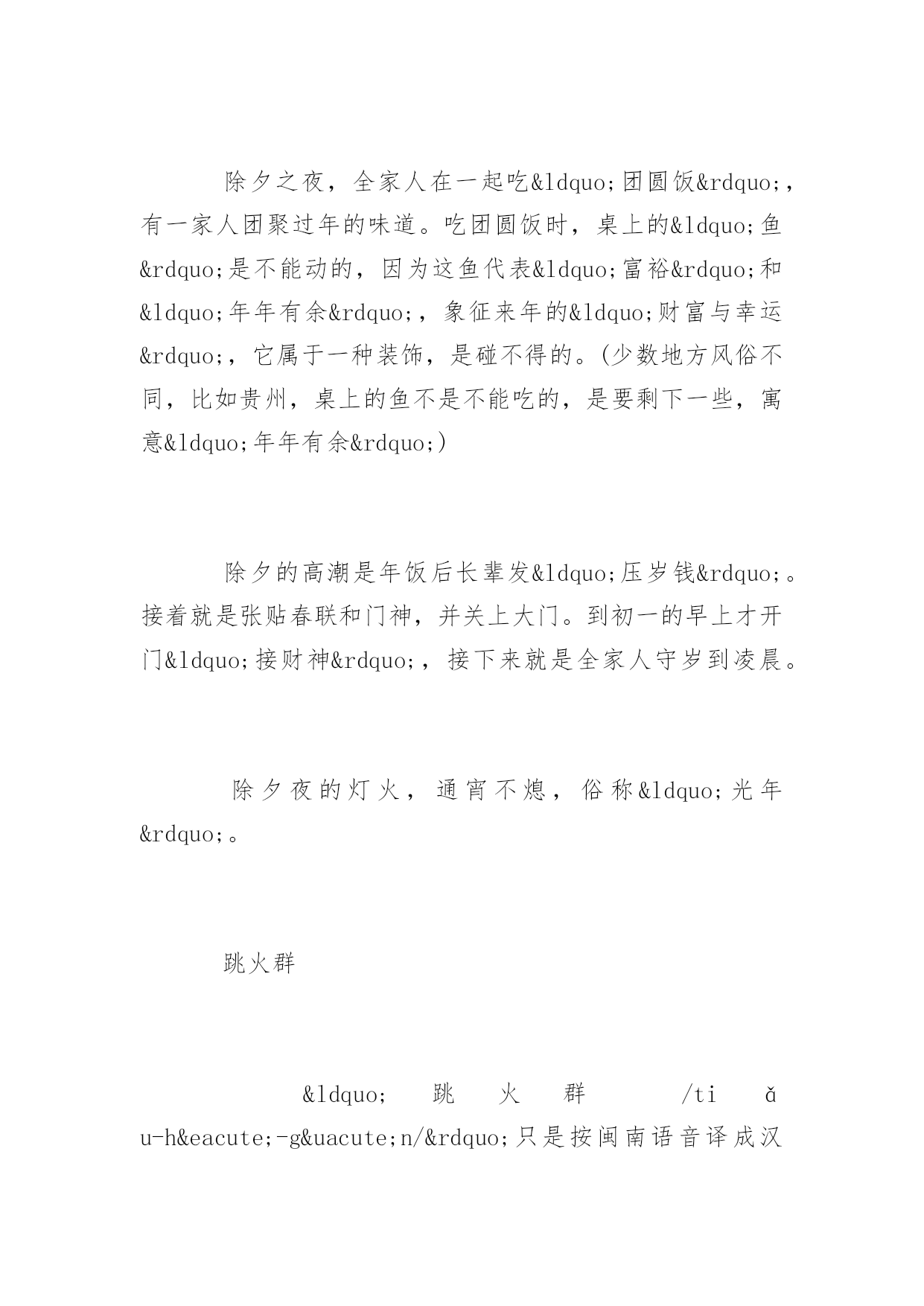 高考素材:除夕的相关传说2017年高考素材:关于除夕的相关传说大全导语:除夕,又称大年夜、除夜、岁除、大晦日,是农历一年最后一天的晚上,即春节前一天晚。农历十二月多为大月,有三十天,所以又称为大年三十、年三十、年三十晚、年三十夜。而十二月小月時为廿九日,有些地区又会改称二九暝。“除夕”中“除”字的本义是“去”,引申为“易”,即交替;“夕”字的本义是“日暮”,引申为“夜晚”。因而“除夕”便含有旧岁到次夕而除,明日即另换新...下面是小编整理的一些相关作文素材,欢迎查阅,谢谢。2017年高考素材:关于除夕的相关传说大全节日食俗在古代的农业社会里,大约自腊月初八以后,家庭主妇们就要忙着张罗过年的食品了。因为腌制腊味所需的时间较长,所以必须尽早准备,我国许多省份都有腌腊味的习俗,其中又以广东省的腊味最为著名。蒸年糕蒸年糕蒸年糕,年糕因为谐音“年高”,再加上有着变化多端的口味,几乎成了家家必备的应景食品。年糕的式样有方块状的黄、白年糕,象征着黄金、白银,寄寓新年发财的意思。年糕的口味因地而异。北京人喜食江米或黄米制成的红枣年糕、百果年糕和白年糕。河北人则喜欢在年糕中加入大枣、小红豆及绿豆等一起蒸食。山西北部在内蒙古等地,过年时习惯吃黄米粉油炸年糕,有的还包上豆沙、枣泥等馅,山东人则用黄米、红枣蒸年糕。北方的年糕以甜为主,或蒸或炸,也有人干脆沾糖吃。南方的年糕则甜咸兼具,例如苏州及宁波的年糕,以粳米制作,味道清淡。除了蒸、炸以外,还可以切片炒食或是煮汤。甜味的年糕以糯米粉加白糖、猪油、玫瑰、桂花、薄荷、素蓉等配料,做工精细,可以直接蒸食或是沾上蛋清油炸。真正过年的前一夜叫团圆夜,离家在外的游子都要不远千里万里赶回家来,全家人要围坐在一起包饺子过年,饺子的作法是先和面做成饺子皮,再用皮包上馅,馅的内容是五花八门,各种肉、蛋、海鲜、时令蔬菜等都可入馅,正统的饺子吃法,是清水煮熟,捞起后以调有醋、蒜末、香油的酱油为佐料沾着吃。也有炸饺子、烙饺子(锅贴)等吃法。因为和面的“和”字就是“合”的意思;饺子的“饺”和“交”谐音,“合”和“交”又有相聚之意,所以用饺子象征团聚合欢;又取更岁交子之意,非常吉利;此外,饺子因为形似元宝,过年时吃饺子,也带有“招财进宝”的吉祥含义。一家大小聚在一起包饺子,话新春,其乐融融。除夕是指每年农历腊月的最后一天的晚上,它与春节(正月初一)首尾相连。"除夕"中的"除"字是"去;易;交替"的意思,除夕的意思是"月穷岁尽",人们都要除旧部新,有旧岁至此而除,来年另换新岁的意思,是农历全年最后的一个晚上。故此期间的活动都围绕着除旧部新,消灾祈福为中心。周、秦时期每年将尽的时候,皇宫里要举行"大傩"的仪式,击鼓驱逐疫疠之鬼,称为"逐除",后又称除夕的前一天为小除,即小年夜;除夕为大除,即大年夜。除夕是一年中最使人留恋的一晚。除夕之夜,最为热闹、喧阗,天一抹黑,孩子们或者半大小伙子,早已拿着香火,东一声、西一响地放起鞭炮来了,胆大的放大炮仗,年幼的一只手捂着耳朵,远远地探着身子点,其他小孩两手捂着耳朵,紧张而又焦急地等待着……。此情此景,即使人到白头也都还能记得。节日禁忌除夕有很多的禁忌禁忌。如忌言鬼、死、杀等不吉字眼、忌打碎碗碟,忌恶声谩语,忌随地便溺,忌泼污水、灯油于地等。人们在大年三十到来时,一面欢度佳节,喜庆丰收,一面洗澡更衣、打扫卫生,以驱疫病、除恶鬼。尤其是在年夜饭时,有更多的禁忌。团圆饭团圆饭1、长辈给晚辈添饭加菜,如果吃饱了不想要,不能说“不要”,而是说“有了”;如果个别茶果吃完了,要说“吃兴了”或“太多了”,而不是直接说“没有了”……。这些吉利话是人们的“除夕功课”,大人要教孩子说,否则新年不顺。2、年夜饭就餐前,必须要先要准备供品祭祀祖先。请祖灵之前,家庭成员和物品必须齐全,否则就是说人不团圆、财不完整。祖灵请来之后,供桌两旁的座位,任何人不得占用,意为不能与祖先争座位;不得吵闹,更不