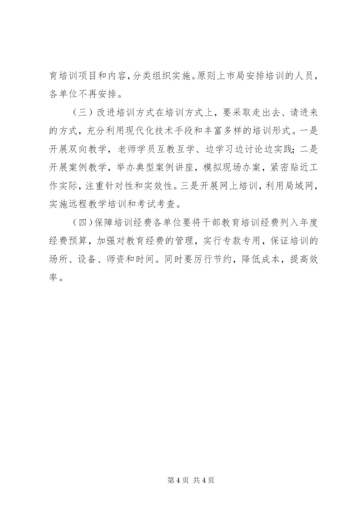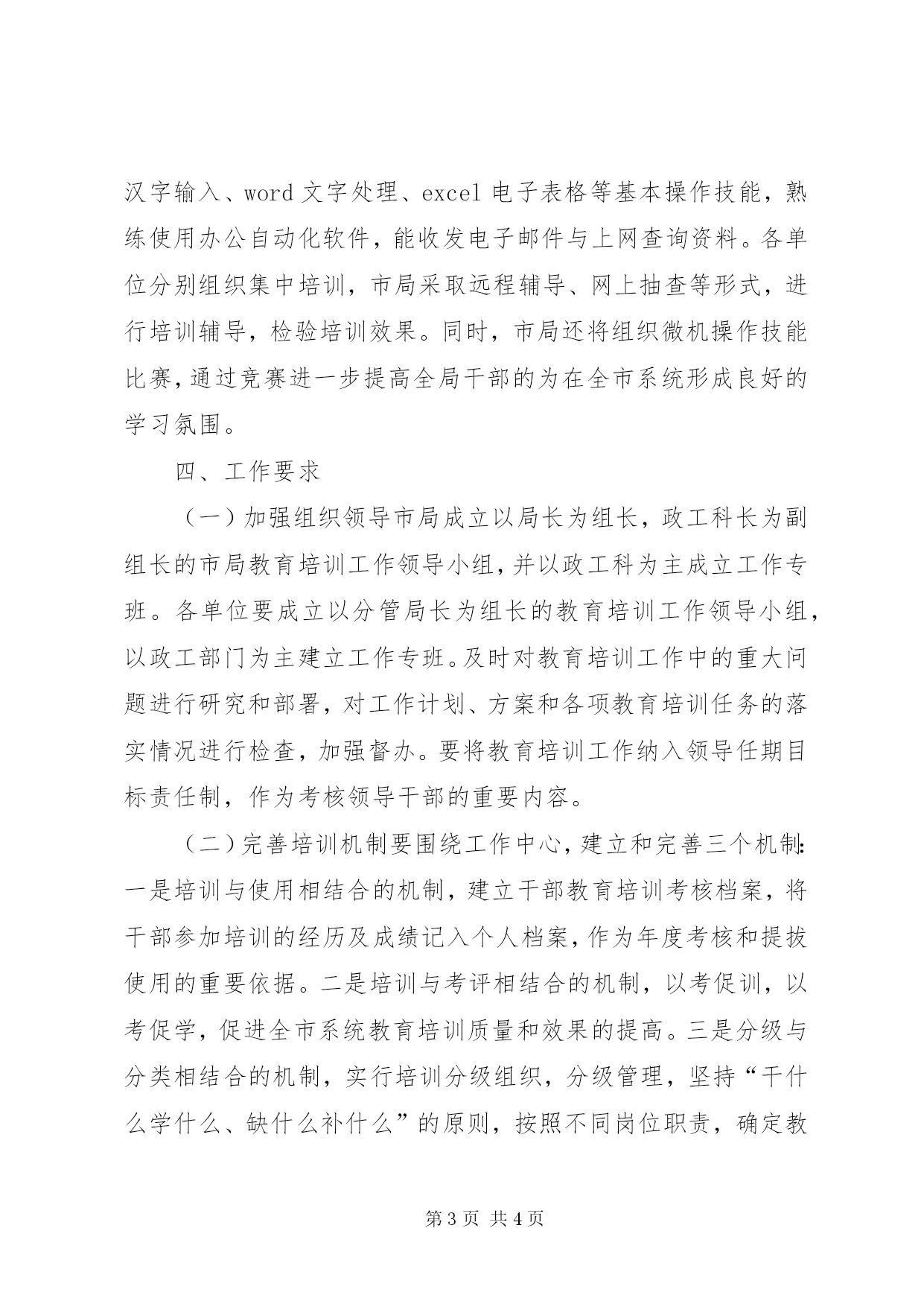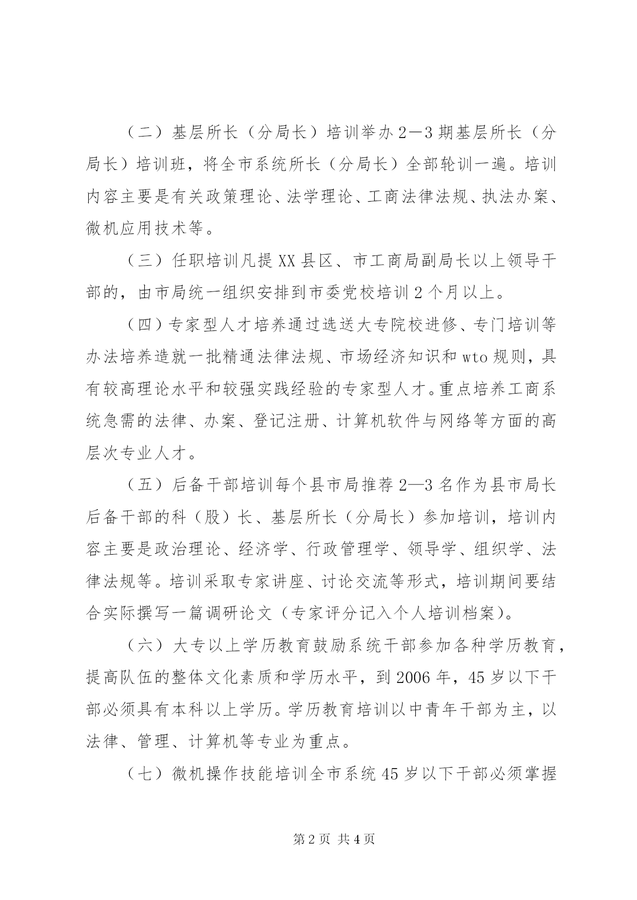 第PAGE\*Arabic\*MERGEFORMAT4页共NUMPAGES\*MERGEFORMAT4页工商局教育培训工作方案为了进一步加强全市系统干部教育培训工作,全面提高干部队伍整体素质,为新时期工商行政管理改革和发展提供人才支持,根据《省工商行政管理系统干部教育培训五年规划》的要求,结合实际制定本方案。一、指导思想全市系统干部教育培训工作以“三个代表”重要思想为指导,坚持理论联系实际,按需施教,学以致用,注重质量和实效的原则,全面提高干部队伍整体素质。二、总体目标着力培养和提高全市系统干部履行岗位职责、依法行政和维护市场秩序的能力,努力造就一支适应新时期工商行政管理改革和发展需要的高素质专业化的干部队伍。三、培训内容和工作要点(一)法律法规培训培训对象以一线执法人员为主,重点是注册登记审批、日常巡查监管和经检办案人员。培训内容为企业登记管理、市场监督管理、公平交易管理、广告监督管理、商标注册管理、个体私营经济管理以及执法行为规范等方面的法律法规,重点是《公司法》、《商标法》、《广告法》、《反不正当竞争法》、《消费者权益保护法》、《合同法》等6部基本法律。培训形式采取个人自学和集中培训相结合、最后进行书面考试的方法,市局统一安排培训课程,聘请专业教师,编选培训教材和题库。(二)基层所长(分局长)培训举办2-3期基层所长(分局长)培训班,将全市系统所长(分局长)全部轮训一遍。培训内容主要是有关政策理论、法学理论、工商法律法规、执法办案、微机应用技术等。(三)任职培训凡提XX县区、市工商局副局长以上领导干部的,由市局统一组织安排到市委党校培训2个月以上。(四)专家型人才培养通过选送大专院校进修、专门培训等办法培养造就一批精通法律法规、市场经济知识和wto规则,具有较高理论水平和较强实践经验的专家型人才。重点培养工商系统急需的法律、办案、登记注册、计算机软件与网络等方面的高层次专业人才。(五)后备干部培训每个县市局推荐2—3名作为县市局长后备干部的科(股)长、基层所长(分局长)参加培训,培训内容主要是政治理论、经济学、行政管理学、领导学、组织学、法律法规等。培训采取专家讲座、讨论交流等形式,培训期间要结合实际撰写一篇调研论文(专家评分记入个人培训档案)。(六)大专以上学历教育鼓励系统干部参加各种学历教育,提高队伍的整体文化素质和学历水平,到2006年,45岁以下干部必须具有本科以上学历。学历教育培训以中青年干部为主,以法律、管理、计算机等专业为重点。(七)微机操作技能培训全市系统45岁以下干部必须掌握汉字输入、word文字处理、excel电子表格等基本操作技能,熟练使用办公自动化软件,能收发电子邮件与上网查询资料。各单位分别组织集中培训,市局采取远程辅导、网上抽查等形式,进行培训辅导,检验培训效果。同时,市局还将组织微机操作技能比赛,通过竞赛进一步提高全局干部的为在全市系统形成良好的学习氛围。四、工作要求(一)加强组织领导市局成立以局长为组长,政工科长为副组长的市局教育培训工作领导小组,并以政工科为主成立工作专班。各单位要成立以分管局长为组长的教育培训工作领导小组,以政工部门为主建立工作专班。及时对教育培训工作中的重大问题进行研究和部署,对工作计划、方案和各项教育培训任务的落实情况进行检查,加强督办。要将教育培训工作纳入领导任期目标责任制,作为考核领导干部的重要内容。(二)完善培训机制要围绕工作中心,建立和完善三个机制:一是培训与使用相结合的机制,建立干部教育培训考核档案,将干部参加培训的经历及成绩记入个人档案,作为年度考核和提拔使用的重要依据。二是培训与考评相结合的机制,以考促训,以考促学,促进全市系统教育培训质量和效果的提高。三是分级与分类相结合的机制,实行培训分级组织,分级管理,坚持“干什么学什么、缺什么补什么”的原则,按照不同岗位职责,确定教育培训项目和内容,分类组织实施。原则上市局安排培训的人员,各单位不再安排。(三)改进培训方式在培训方式上,要采取走出去、请进来的方式,充分利用现代化技术手段和丰富多样的培训形式。一是开展双向教学,老师学员互教互学、边学习边讨论边实践;二是开展案例教学,举办典型案例讲座,模拟现场办案,紧密贴近工作实际,注重针对性和实效性。三是开展网上培训,利用局域网,实施远程教学培训和考试考查。(四)保障培训经费各单位要将干部教育培训经费列入年度经费预算,加强对教育经费的管理,实行专款专用,保证培训的场所、设备、师资和时间。同时要厉行节约,降低成本,提高效率。
