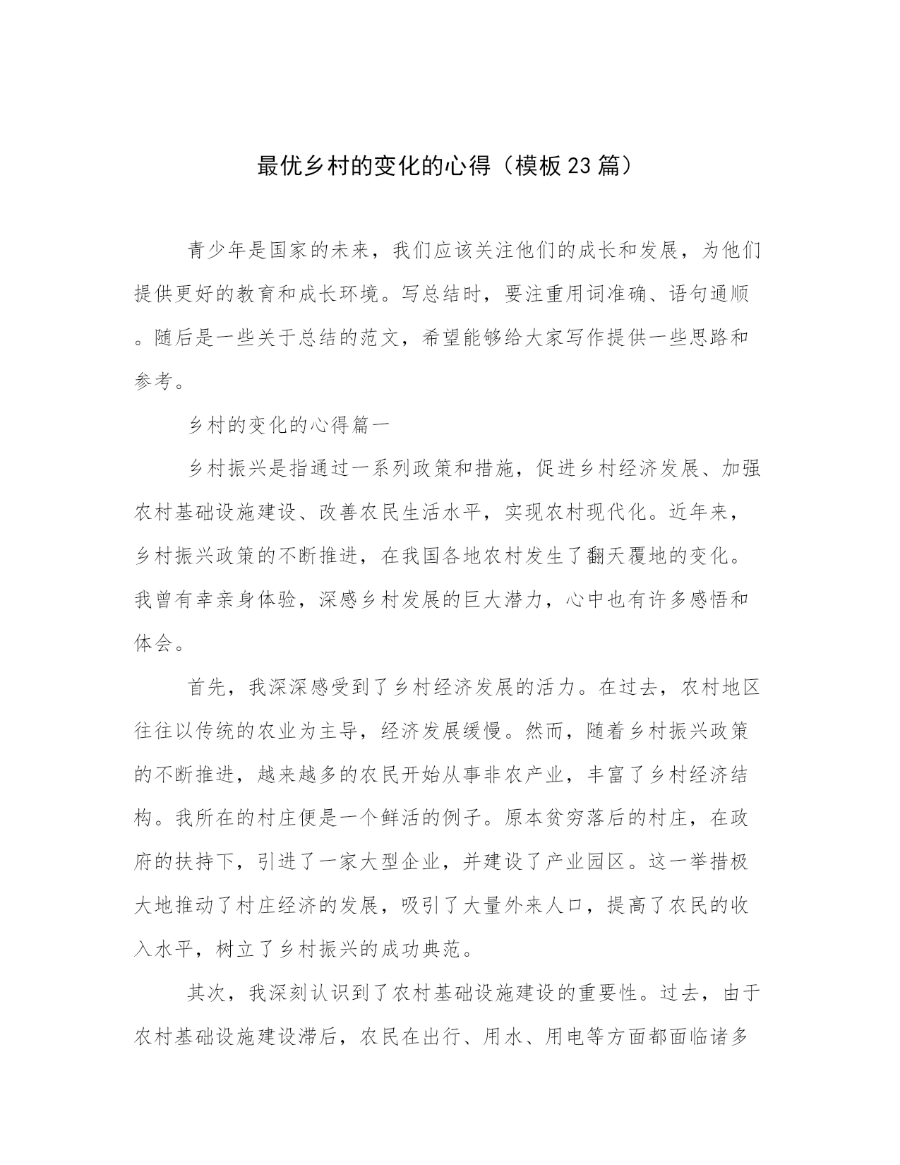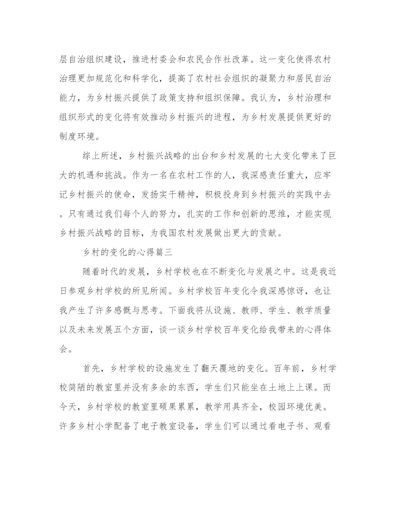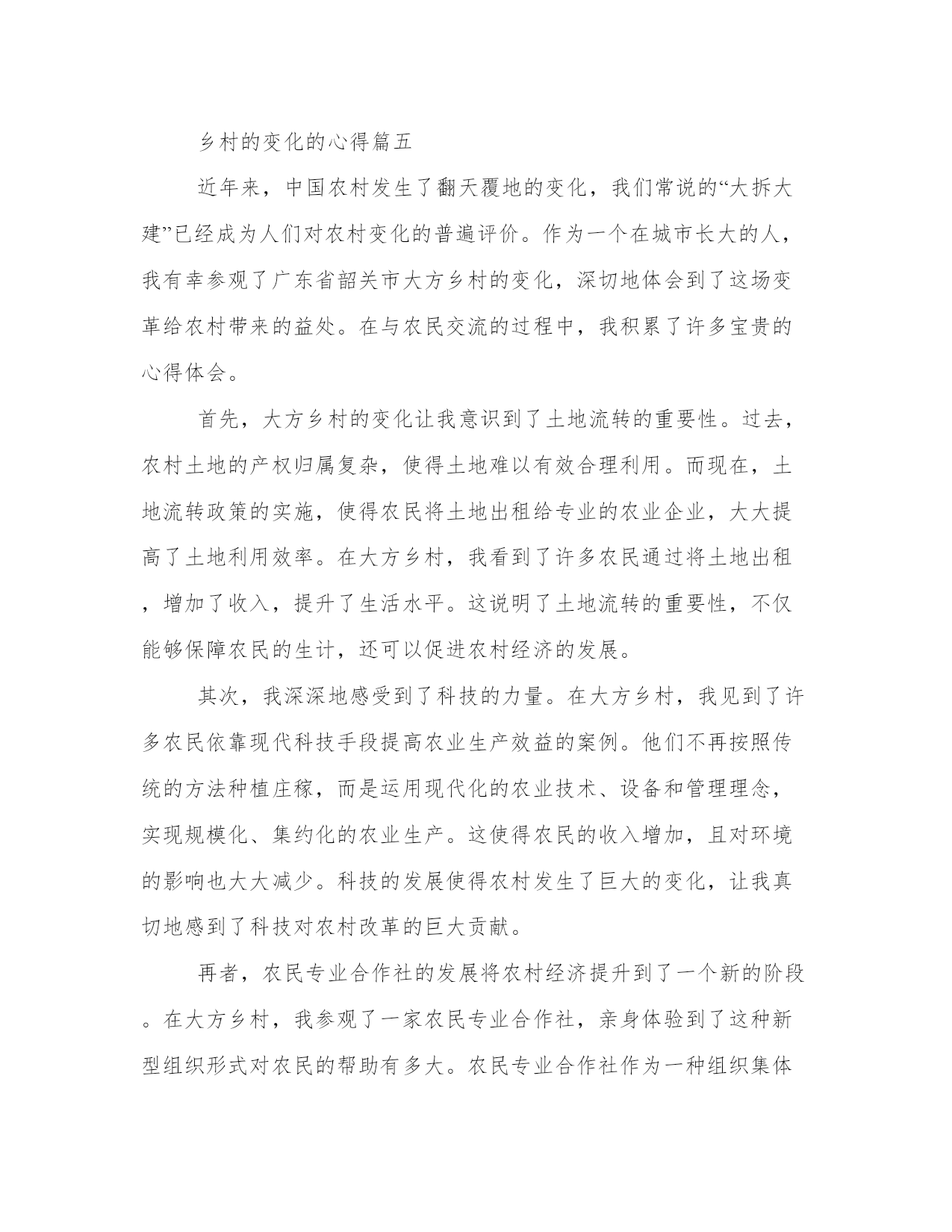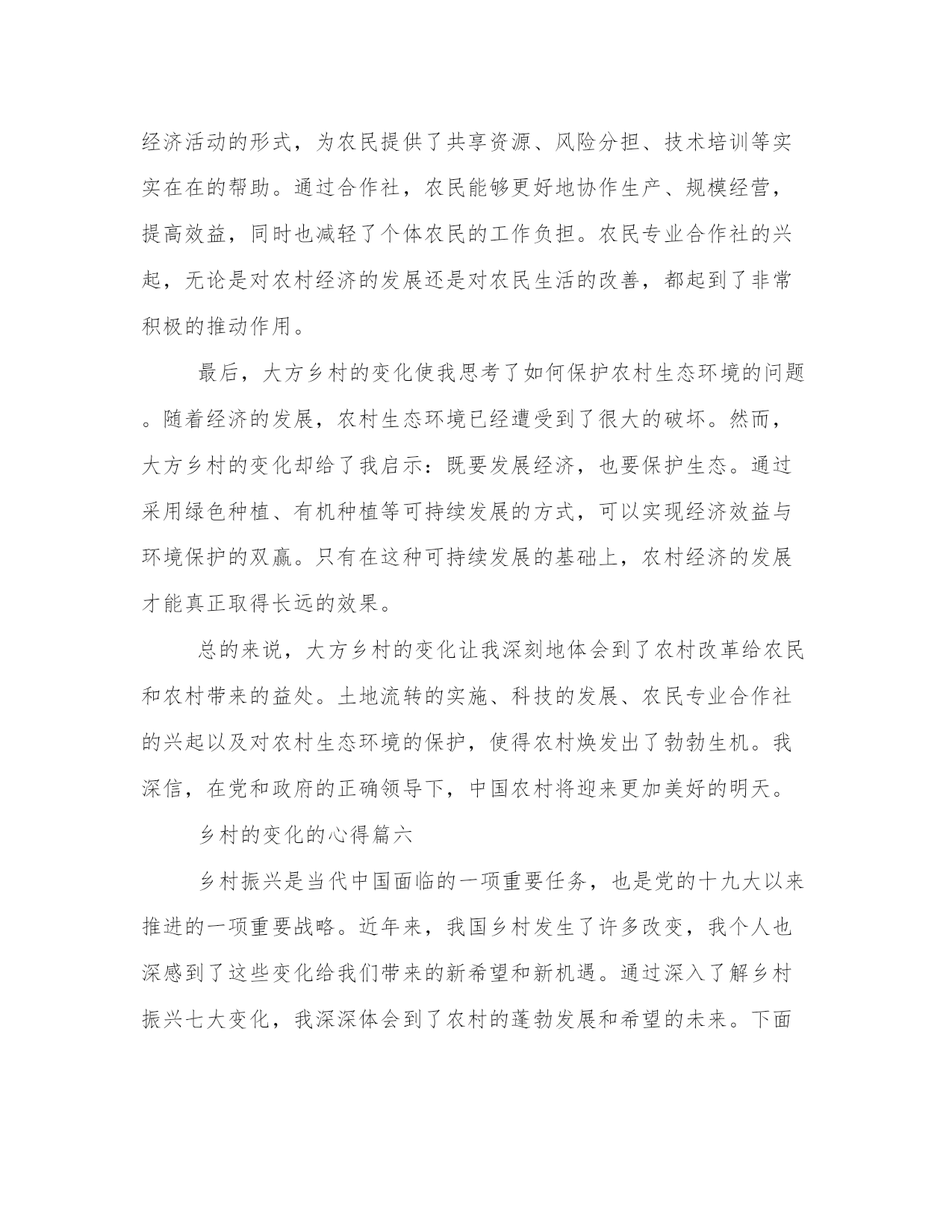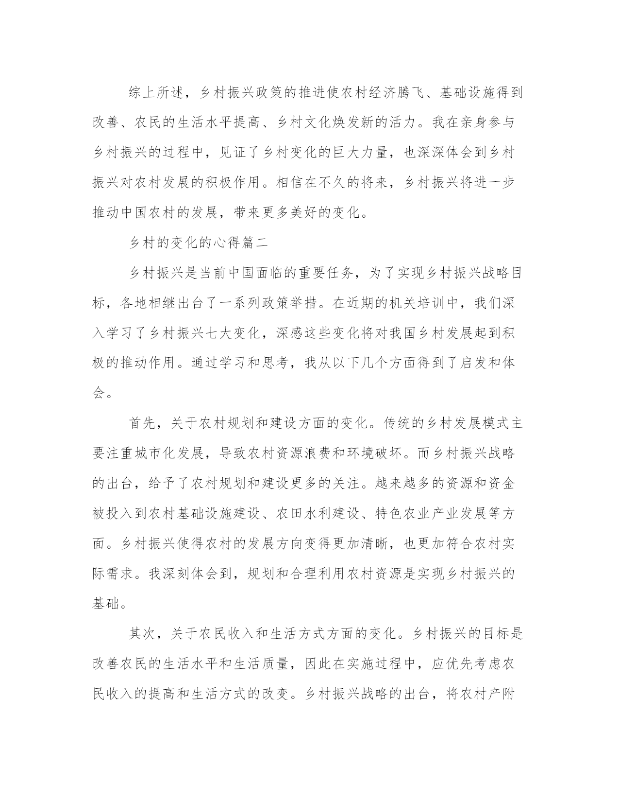 最优乡村的变化的心得(模板23篇)青少年是国家的未来,我们应该关注他们的成长和发展,为他们提供更好的教育和成长环境。写总结时,要注重用词准确、语句通顺。随后是一些关于总结的范文,希望能够给大家写作提供一些思路和参考。乡村的变化的心得篇一乡村振兴是指通过一系列政策和措施,促进乡村经济发展、加强农村基础设施建设、改善农民生活水平,实现农村现代化。近年来,乡村振兴政策的不断推进,在我国各地农村发生了翻天覆地的变化。我曾有幸亲身体验,深感乡村发展的巨大潜力,心中也有许多感悟和体会。首先,我深深感受到了乡村经济发展的活力。在过去,农村地区往往以传统的农业为主导,经济发展缓慢。然而,随着乡村振兴政策的不断推进,越来越多的农民开始从事非农产业,丰富了乡村经济结构。我所在的村庄便是一个鲜活的例子。原本贫穷落后的村庄,在政府的扶持下,引进了一家大型企业,并建设了产业园区。这一举措极大地推动了村庄经济的发展,吸引了大量外来人口,提高了农民的收入水平,树立了乡村振兴的成功典范。其次,我深刻认识到了农村基础设施建设的重要性。过去,由于农村基础设施建设滞后,农民在出行、用水、用电等方面都面临诸多困难。而如今,随着乡村振兴政策的实施,我所在的村庄改造了道路,铺设了自来水管道,而且还修建了农家乐、农村公共服务中心等设施。这些变化让我深刻体会到,良好的基础设施是乡村发展不可或缺的条件。它不仅方便了农民的生活,也为乡村吸引了更多的人气和资源,为农村经济的腾飞奠定了坚实的基础。再次,乡村振兴使农民的生活水平显著提高。在过去,由于农村经济发展滞后,农民的收入相对较低,生活水平也很困难。随着乡村振兴的推进,一系列扶持政策的实施,农民们的收入水平得到了极大提高。我所在村庄的例子不胜枚举。村庄经济的发展带动了农产品的销售市场,让农民赚到了钱。此外,为了提高农民的技能素质,政府还出台了一系列培训政策,使农民们的就业机会得到了拓宽。通过我自己的亲身经历,我深切感受到农民在乡村振兴下的生活质量得到了巨大提升。最后,乡村振兴让农村文化焕发新的活力。乡村是一个拥有悠久历史和深厚文化底蕴的地方。然而,在城市化的进程中,传统文化逐渐消失。而乡村振兴政策的实施,有力地推动了乡村文化的传承和弘扬。政府鼓励农民自建农家乐,提供良好的创业环境,让乡村旅游成为乡村发展的新亮点。我所在村庄的农家乐纷纷盛开,吸引了大量游客,让农民们通过发展乡村文化,实现了自身价值的提升。乡村振兴带来的文化繁荣,让人们更加了解和喜爱自己的乡村,也为传统文化的保护和传承注入了新的活力。综上所述,乡村振兴政策的推进使农村经济腾飞、基础设施得到改善、农民的生活水平提高、乡村文化焕发新的活力。我在亲身参与乡村振兴的过程中,见证了乡村变化的巨大力量,也深深体会到乡村振兴对农村发展的积极作用。相信在不久的将来,乡村振兴将进一步推动中国农村的发展,带来更多美好的变化。乡村的变化的心得篇二乡村振兴是当前中国面临的重要任务,为了实现乡村振兴战略目标,各地相继出台了一系列政策举措。在近期的机关培训中,我们深入学习了乡村振兴七大变化,深感这些变化将对我国乡村发展起到积极的推动作用。通过学习和思考,我从以下几个方面得到了启发和体会。首先,关于农村规划和建设方面的变化。传统的乡村发展模式主要注重城市化发展,导致农村资源浪费和环境破坏。而乡村振兴战略的出台,给予了农村规划和建设更多的关注。越来越多的资源和资金被投入到农村基础设施建设、农田水利建设、特色农业产业发展等方面。乡村振兴使得农村的发展方向变得更加清晰,也更加符合农村实际需求。我深刻体会到,规划和合理利用农村资源是实现乡村振兴的基础。其次,关于农民收入和生活方式方面的变化。乡村振兴的目标是改善农民的生活水平和生活质量,因此在实施过程中,应优先考虑农民收入的提高和生活方式的改变。乡村振兴战略的出台,将农村产附着在土地上的传统观念打破,提倡“村集体经济+农民个体经济”的发展模式。这一变化为农民创业提供了更多的机会和平台,鼓励他们通过开展农产品加工、乡村旅游、特色小镇建设等活动,提高农民收入和生活质量。我深感乡村振兴战略改变了农民的创业观念,使他们更加积极主动地参与乡村发展。第三,关于乡村文化和教育方面的变化。在乡村振兴战略中,注重传承和弘扬乡村文化是一个重要的发展方向。通过建设乡土文化宣传教育基地、培养农民文化工作队伍等方式,加强了对乡村文化分析和传承的力度。同时,乡村小学教育也受到更多的关注和支持,乡村学校得以改善办学条件,提高教育质量。乡村振兴战略的出台使得乡村文化和教育得到了更好的保护和发展,我深感这是乡村振兴的重要动力。第四,关于农产品质量和乡村环境方面的变化。乡村振兴战略明确提出了保护农产品安全和环境保护的重要任务。乡村振兴将注重提高农产品质量,加强