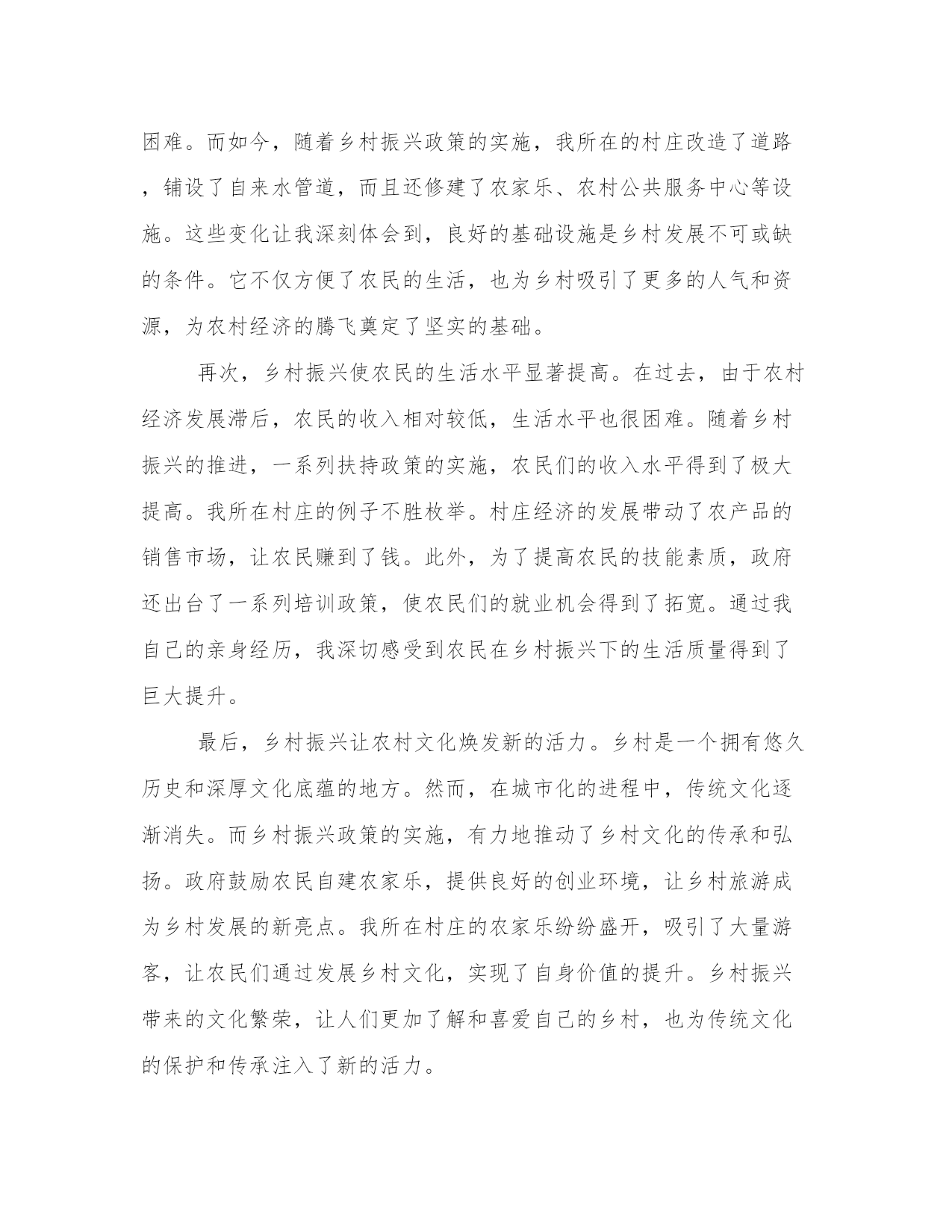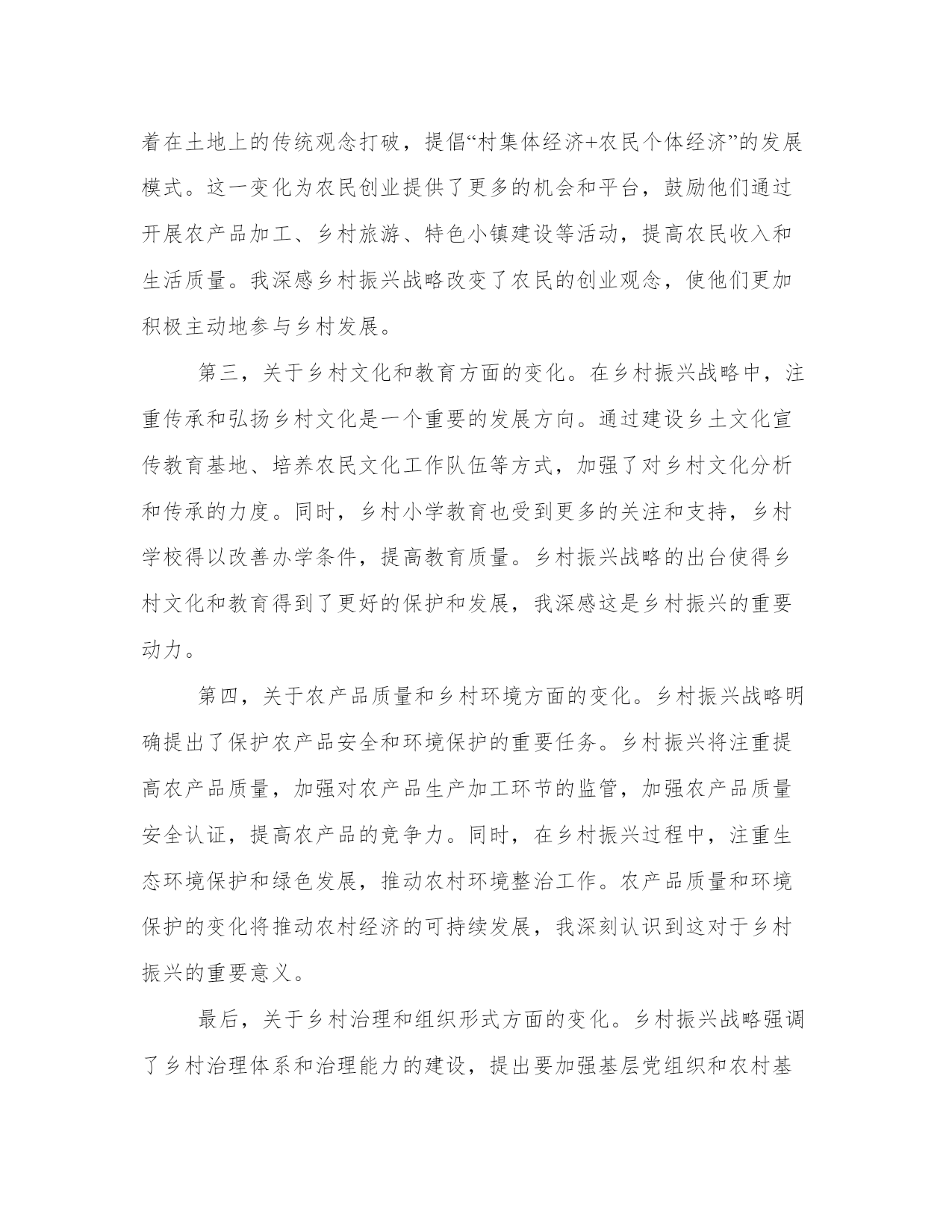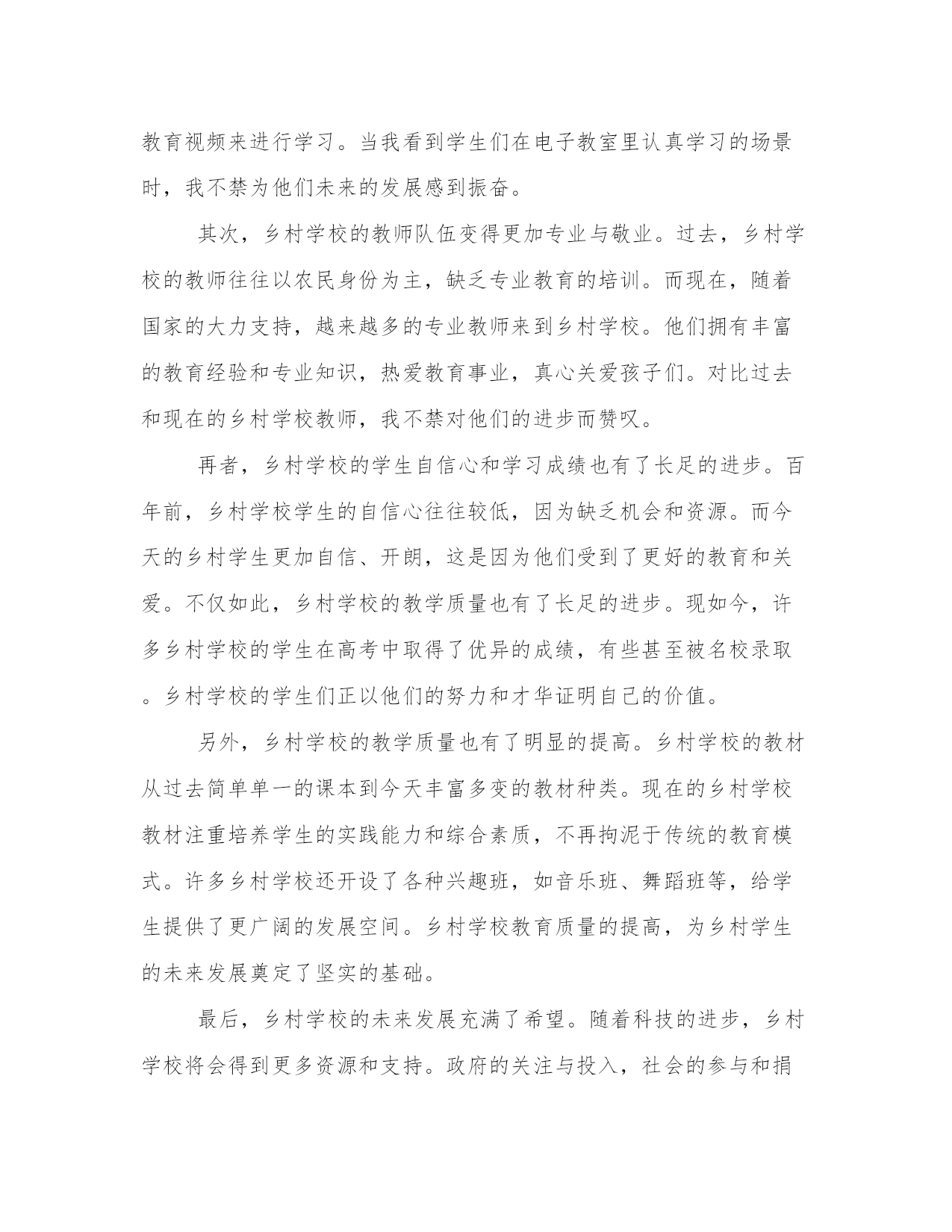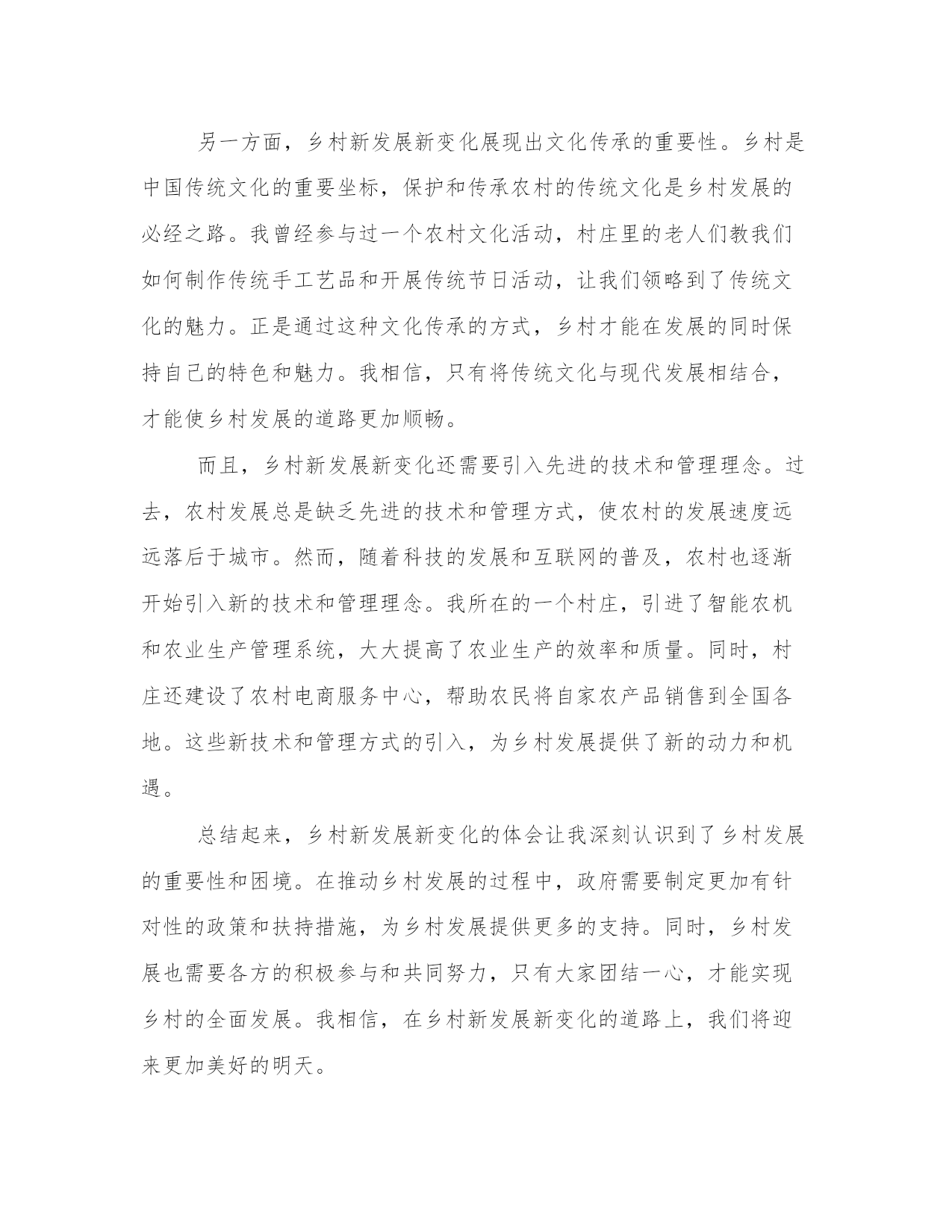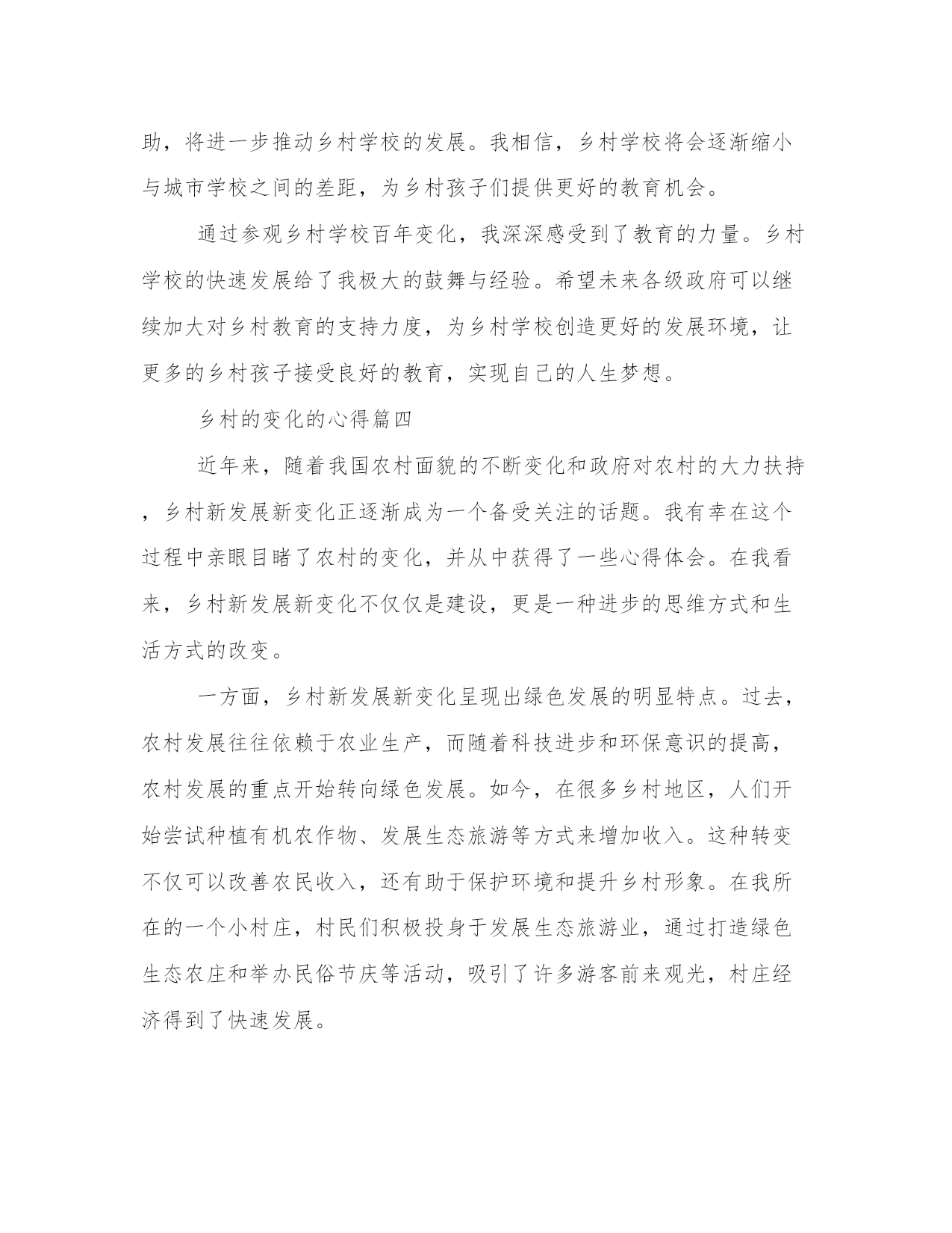 最优乡村的变化的心得(模板23篇)青少年是国家的未来,我们应该关注他们的成长和发展,为他们提供更好的教育和成长环境。写总结时,要注重用词准确、语句通顺。随后是一些关于总结的范文,希望能够给大家写作提供一些思路和参考。乡村的变化的心得篇一乡村振兴是指通过一系列政策和措施,促进乡村经济发展、加强农村基础设施建设、改善农民生活水平,实现农村现代化。近年来,乡村振兴政策的不断推进,在我国各地农村发生了翻天覆地的变化。我曾有幸亲身体验,深感乡村发展的巨大潜力,心中也有许多感悟和体会。首先,我深深感受到了乡村经济发展的活力。在过去,农村地区往往以传统的农业为主导,经济发展缓慢。然而,随着乡村振兴政策的不断推进,越来越多的农民开始从事非农产业,丰富了乡村经济结构。我所在的村庄便是一个鲜活的例子。原本贫穷落后的村庄,在政府的扶持下,引进了一家大型企业,并建设了产业园区。这一举措极大地推动了村庄经济的发展,吸引了大量外来人口,提高了农民的收入水平,树立了乡村振兴的成功典范。其次,我深刻认识到了农村基础设施建设的重要性。过去,由于农村基础设施建设滞后,农民在出行、用水、用电等方面都面临诸多困难。而如今,随着乡村振兴政策的实施,我所在的村庄改造了道路,铺设了自来水管道,而且还修建了农家乐、农村公共服务中心等设施。这些变化让我深刻体会到,良好的基础设施是乡村发展不可或缺的条件。它不仅方便了农民的生活,也为乡村吸引了更多的人气和资源,为农村经济的腾飞奠定了坚实的基础。再次,乡村振兴使农民的生活水平显著提高。在过去,由于农村经济发展滞后,农民的收入相对较低,生活水平也很困难。随着乡村振兴的推进,一系列扶持政策的实施,农民们的收入水平得到了极大提高。我所在村庄的例子不胜枚举。村庄经济的发展带动了农产品的销售市场,让农民赚到了钱。此外,为了提高农民的技能素质,政府还出台了一系列培训政策,使农民们的就业机会得到了拓宽。通过我自己的亲身经历,我深切感受到农民在乡村振兴下的生活质量得到了巨大提升。最后,乡村振兴让农村文化焕发新的活力。乡村是一个拥有悠久历史和深厚文化底蕴的地方。然而,在城市化的进程中,传统文化逐渐消失。而乡村振兴政策的实施,有力地推动了乡村文化的传承和弘扬。政府鼓励农民自建农家乐,提供良好的创业环境,让乡村旅游成为乡村发展的新亮点。我所在村庄的农家乐纷纷盛开,吸引了大量游客,让农民们通过发展乡村文化,实现了自身价值的提升。乡村振兴带来的文化繁荣,让人们更加了解和喜爱自己的乡村,也为传统文化的保护和传承注入了新的活力。综上所述,乡村振兴政策的推进使农村经济腾飞、基础设施得到改善、农民的生活水平提高、乡村文化焕发新的活力。我在亲身参与乡村振兴的过程中,见证了乡村变化的巨大力量,也深深体会到乡村振兴对农村发展的积极作用。相信在不久的将来,乡村振兴将进一步推动中国农村的发展,带来更多美好的变化。乡村的变化的心得篇二乡村振兴是当前中国面临的重要任务,为了实现乡村振兴战略目标,各地相继出台了一系列政策举措。在近期的机关培训中,我们深入学习了乡村振兴七大变化,深感这些变化将对我国乡村发展起到积极的推动作用。通过学习和思考,我从以下几个方面得到了启发和体会。首先,关于农村规划和建设方面的变化。传统的乡村发展模式主要注重城市化发展,导致农村资源浪费和环境破坏。而乡村振兴战略的出台,给予了农村规划和建设更多的关注。越来越多的资源和资金被投入到农村基础设施建设、农田水利建设、特色农业产业发展等方面。乡村振兴使得农村的发展方向变得更加清晰,也更加符合农村实际需求。我深刻体会到,规划和合理利用农村资源是实现乡村振兴的基础。其次,关于农民收入和生活方式方面的变化。乡村振兴的目标是改善农民的生活水平和生活质量,因此在实施过程中,应优先考虑农民收入的提高和生活方式的改变。乡村振兴战略的出台,将农村产附着在土地上的传统观念打破,提倡“村集体经济+农民个体经济”的发展模式。这一变化为农民创业提供了更多的机会和平台,鼓励他们通过开展农产品加工、乡村旅游、特色小镇建设等活动,提高农民收入和生活质量。我深感乡村振兴战略改变了农民的创业观念,使他们更加积极主动地参与乡村发展。第三,关于乡村文化和教育方面的变化。在乡村振兴战略中,注重传承和弘扬乡村文化是一个重要的发展方向。通过建设乡土文化宣传教育基地、培养农民文化工作队伍等方式,加强了对乡村文化分析和传承的力度。同时,乡村小学教育也受到更多的关注和支持,乡村学校得以改善办学条件,提高教育质量。乡村振兴战略的出台使得乡村文化和教育得到了更好的保护和发展,我深感这是乡村振兴的重要动力。第四,关于农产品质量和乡村环境方面的变化。乡村振兴战略明确提出了保护农产品安全和环境保护的重要任务。乡村振兴将注重提高农产品质量,加强