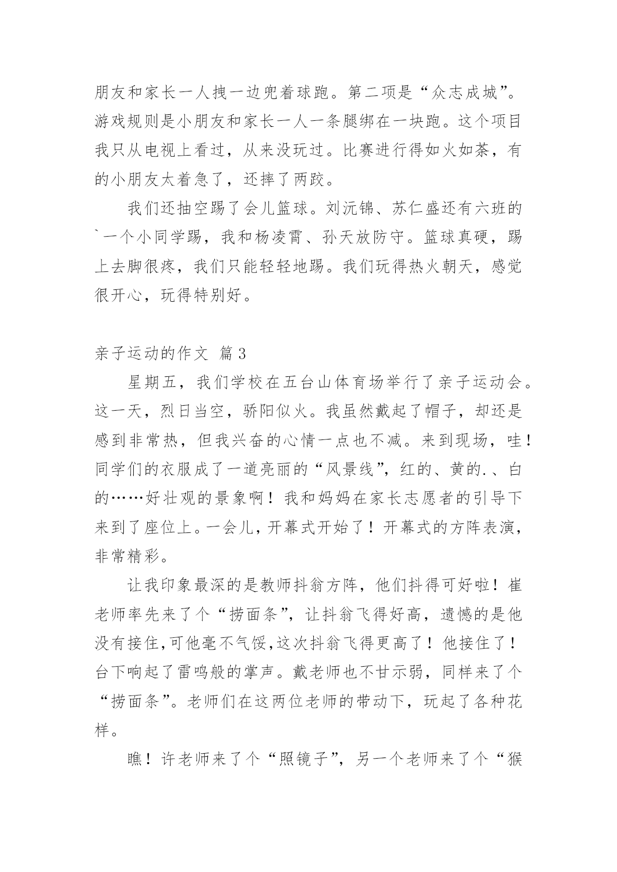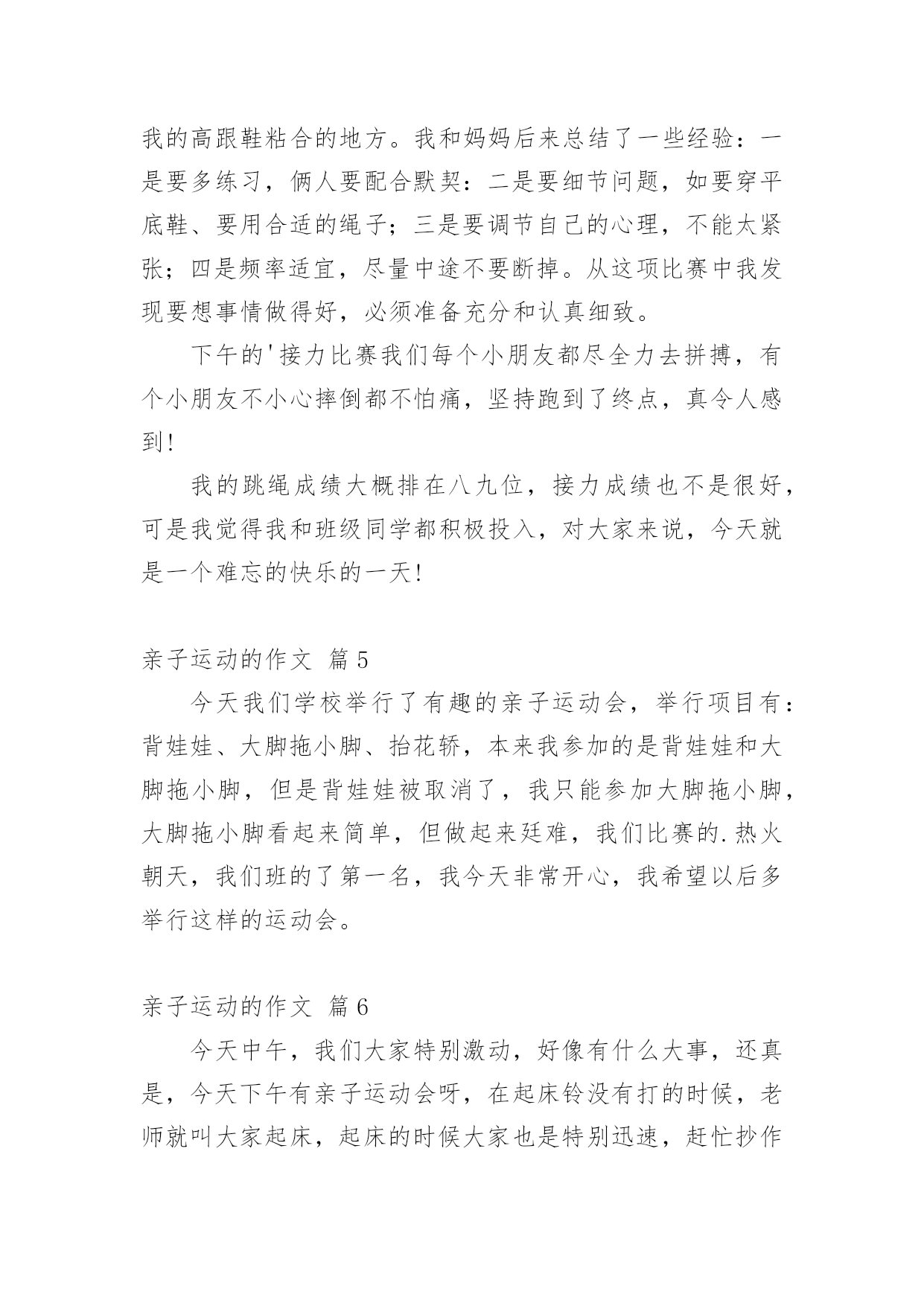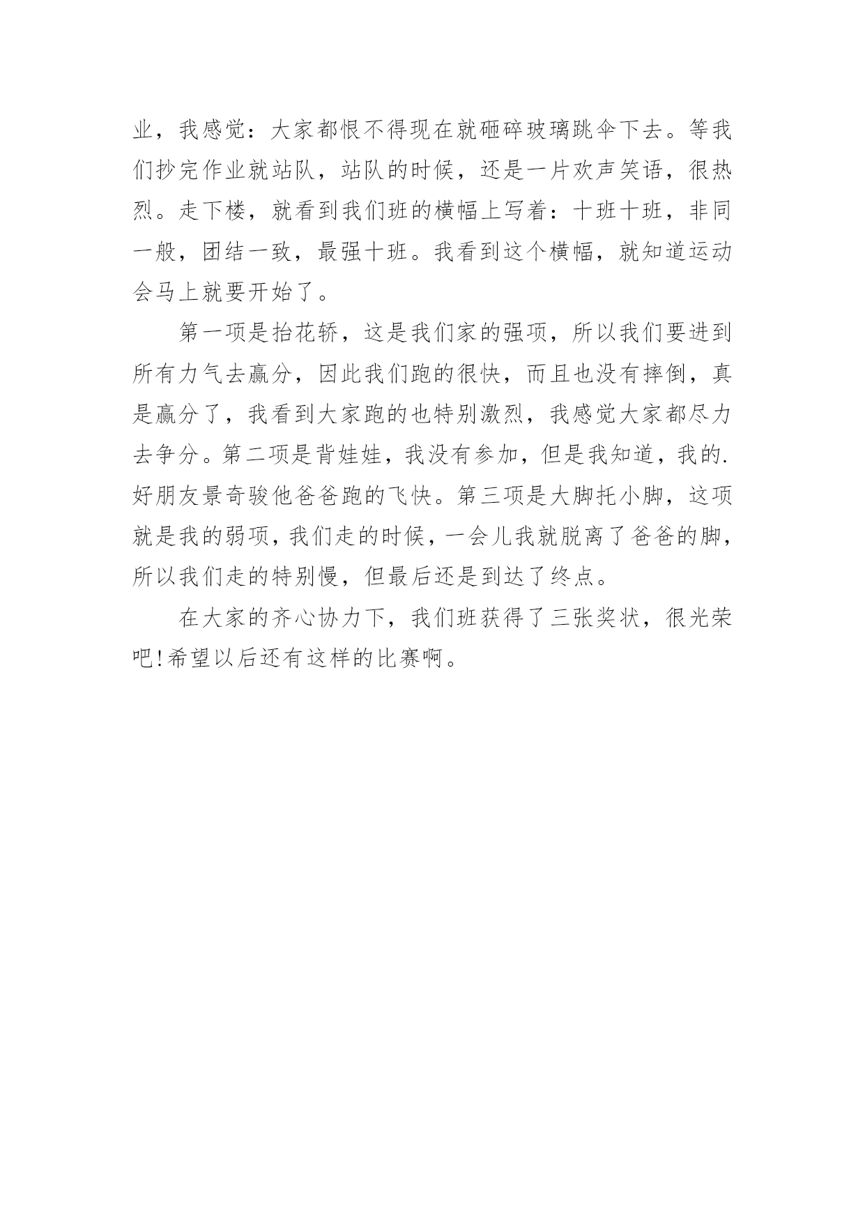 亲子运动的作文有关亲子运动的作文集合六篇在平时的学习、工作或生活中,大家都跟作文打过交道吧,借助作文人们可以反映客观事物、表达思想感情、传递知识信息。那要怎么写好作文呢?以下是小编收集整理的亲子运动的作文6篇,希望能够帮助到大家。亲子运动的作文篇1今天下午一年级举行了一场亲子运动会。共有三项,第一项背娃娃,第二项抬花轿,第三项大脚拖小脚。在老师的指挥下,运动会有条不紊的开着。我和妈妈参加的是第三项,我们耐心的等待着,不一会第三项开始了,妈妈拖着我的.脚,刚走了一会妈妈拖不住了,我们就摔了一跤,不过我们很快就怕起来,就接着往前走,终于到了对面。整个游戏好紧张,不过很开心。就这样结束了。亲子运动的作文篇2期待已久的亲子运动会终于到来了,我第一个跑到教室外面,然后我们排队去了操场。我看见我妈妈和好多家长都在操场上。我们比赛了两个项目。第一项是“齐心协力”。谷老师在我们队伍前面放了一张垫子,垫子上放了两个篮球,由小朋友和家长一人拽一边兜着球跑。第二项是“众志成城”。游戏规则是小朋友和家长一人一条腿绑在一块跑。这个项目我只从电视上看过,从来没玩过。比赛进行得如火如荼,有的小朋友太着急了,还摔了两跤。我们还抽空踢了会儿篮球。刘沅锦、苏仁盛还有六班的`一个小同学踢,我和杨凌霄、孙天放防守。篮球真硬,踢上去脚很疼,我们只能轻轻地踢。我们玩得热火朝天,感觉很开心,玩得特别好。亲子运动的作文篇3星期五,我们学校在五台山体育场举行了亲子运动会。这一天,烈日当空,骄阳似火。我虽然戴起了帽子,却还是感到非常热,但我兴奋的心情一点也不减。来到现场,哇!同学们的衣服成了一道亮丽的“风景线”,红的、黄的.、白的……好壮观的景象啊!我和妈妈在家长志愿者的引导下来到了座位上。一会儿,开幕式开始了!开幕式的方阵表演,非常精彩。让我印象最深的是教师抖翁方阵,他们抖得可好啦!崔老师率先来了个“捞面条”,让抖翁飞得好高,遗憾的是他没有接住,可他毫不气馁,这次抖翁飞得更高了!他接住了!台下响起了雷鸣般的掌声。戴老师也不甘示弱,同样来了个“捞面条”。老师们在这两位老师的带动下,玩起了各种花样。瞧!许老师来了个“照镜子”,另一个老师来了个“猴子爬树”……开幕式进入了高潮!在大家的掌声中,开幕式结束了。令人期待的运球接力赛开始了,我们班参加比赛的同学、家长像离弦的箭一样快速奔跑着。就要到我了,我的心提到了嗓子眼,到我了!我像脱了膛的子弹,快速冲向下一位家长。听着同学们的阵阵加油喝彩声,我不敢有一丝疏忽怠慢。啊!终于到了!我大口喘着粗气。虽然只是几秒钟,但我也紧张到了极点。最后我们获得了第二名!亲子运动会结束了,我们恋恋不舍地离开了五台山,我喜欢亲子运动会!亲子运动的作文篇4今天是一个快乐并充满活力的一天,因为今天是我读小学所经历的第一次运动会。一大早,妈妈跟我准备好东西就急匆匆志跑到学校,我们俩气喘吁吁踏着铃声,进教室,总算没迟到。换好鞋子,拿好风车,排着整齐的队伍出发啦!等啊等,终于轮到我们一(3)班了,进场时我一点都不紧张,唱着歌,踏着整齐的步子,雄纠纠地走过主席台,最后喊起了口号:“毛虫部落,超越自我,拼搏向止,闪耀飞翔!”主持人的话语特别富有感染力,使我们都觉得超激动,大家不由想在比赛中发挥自己最好的水平。有一个班级最有意思:在唱完歌后,全班同学同时把汽球放飞,一只只气球争先恐后轻盈地飞向天空,哇!真美观啊!我跳绳比赛的时候,刚开始时都表现得挺好的,但是后面不知怎么回事,总是绊到绳子,哦,原来是绳子总是勾到我的高跟鞋粘合的地方。我和妈妈后来总结了一些经验:一是要多练习,俩人要配合默契:二是要细节问题,如要穿平底鞋、要用合适的绳子;三是要调节自己的心理,不能太紧张;四是频率适宜,尽量中途不要断掉。从这项比赛中我发现要想事情做得好,必须准备充分和认真细致。下午的'接力比赛我们每个小朋友都尽全力去拼搏,有个小朋友不小心摔倒都不怕痛,坚持跑到了终点,真令人感到!我的跳绳成绩大概排在八九位,接力成绩也不是很好,可是我觉得我和班级同学都积极投入,对大家来说,今天就是一个难忘的快乐的一天!亲子运动的作文篇5今天我们学校举行了有趣的亲子运动会,举行项目有:背娃娃、大脚拖小脚、抬花轿,本来我参加的是背娃娃和大脚拖小脚,但是背娃娃被取消了,我只能参加大脚拖小脚,大脚拖小脚看起来简单,但做起来廷难,我们比赛的.热火朝天,我们班的了第一名,我今天非常开心,我希望以后多举行这样的运动会。亲子运动的作文篇6今天中午,我们大家特别激动,好像有什么大事,还真是,今天下午有亲子运动会呀,在起床铃没有打的时候,老师就叫大家起床,起床的时候大家也是特别迅速,赶忙抄作业,我感觉:大家都恨不得现在就砸碎玻璃跳伞下去。等我们抄完作业就站队,站队的时候,还是一片欢声笑语,很热烈。走下楼,就看到我们班的横幅上写着