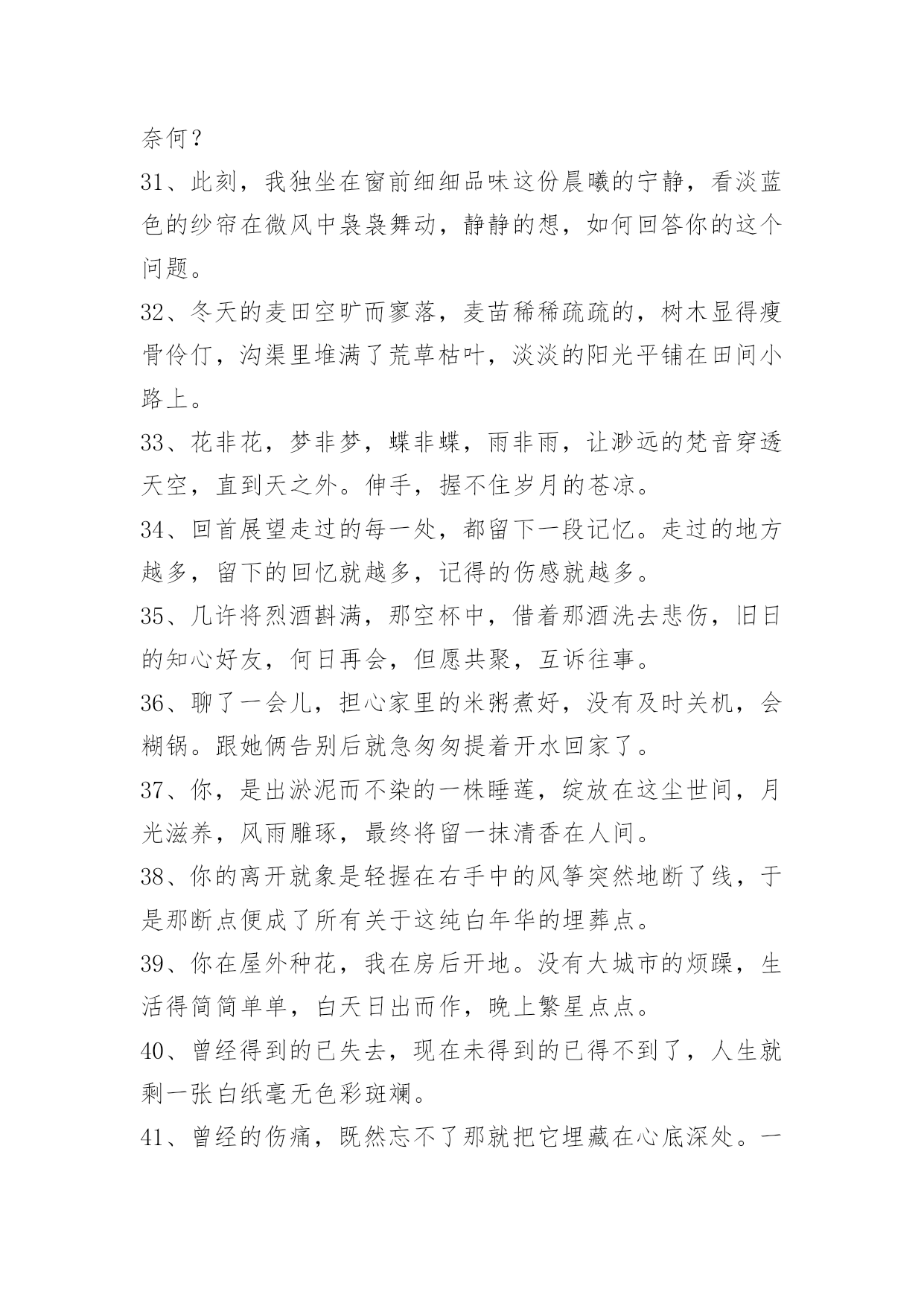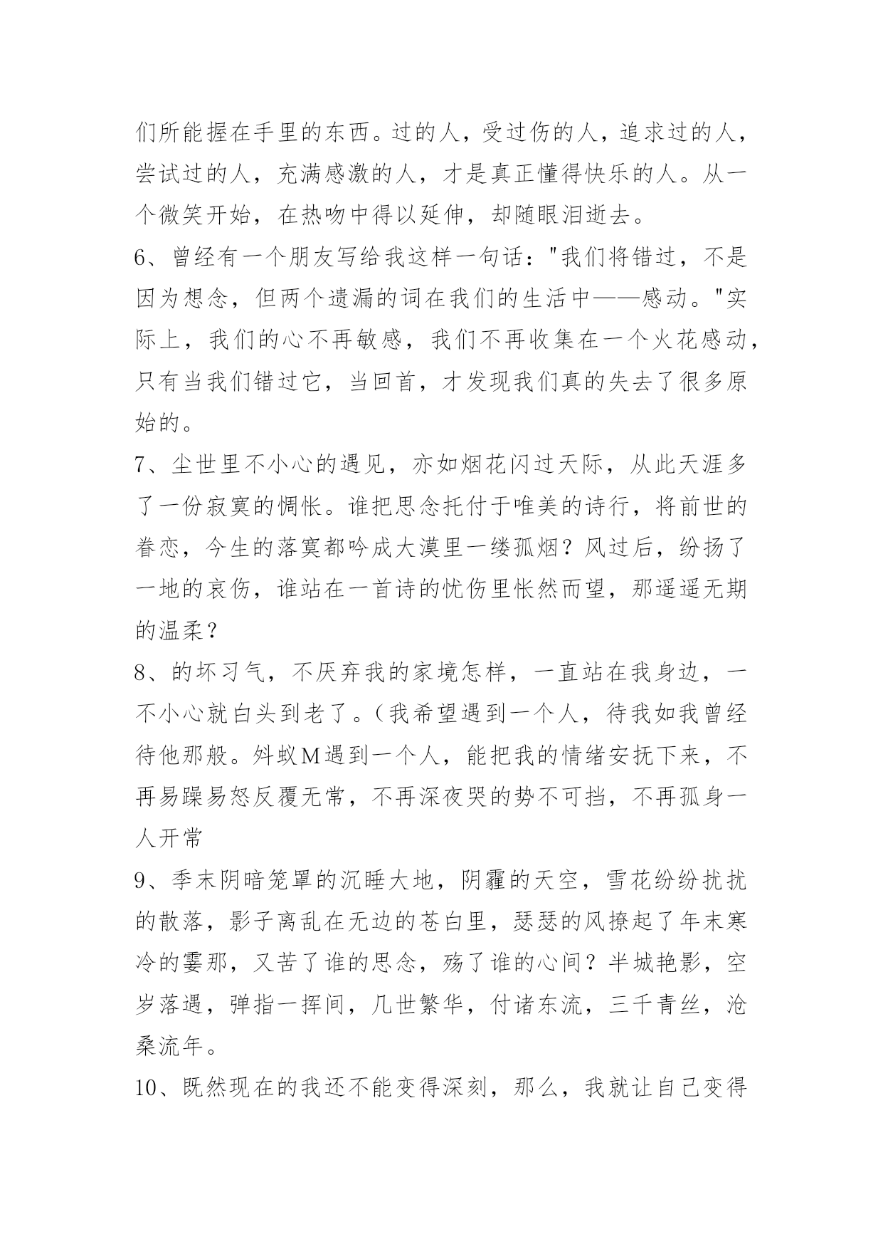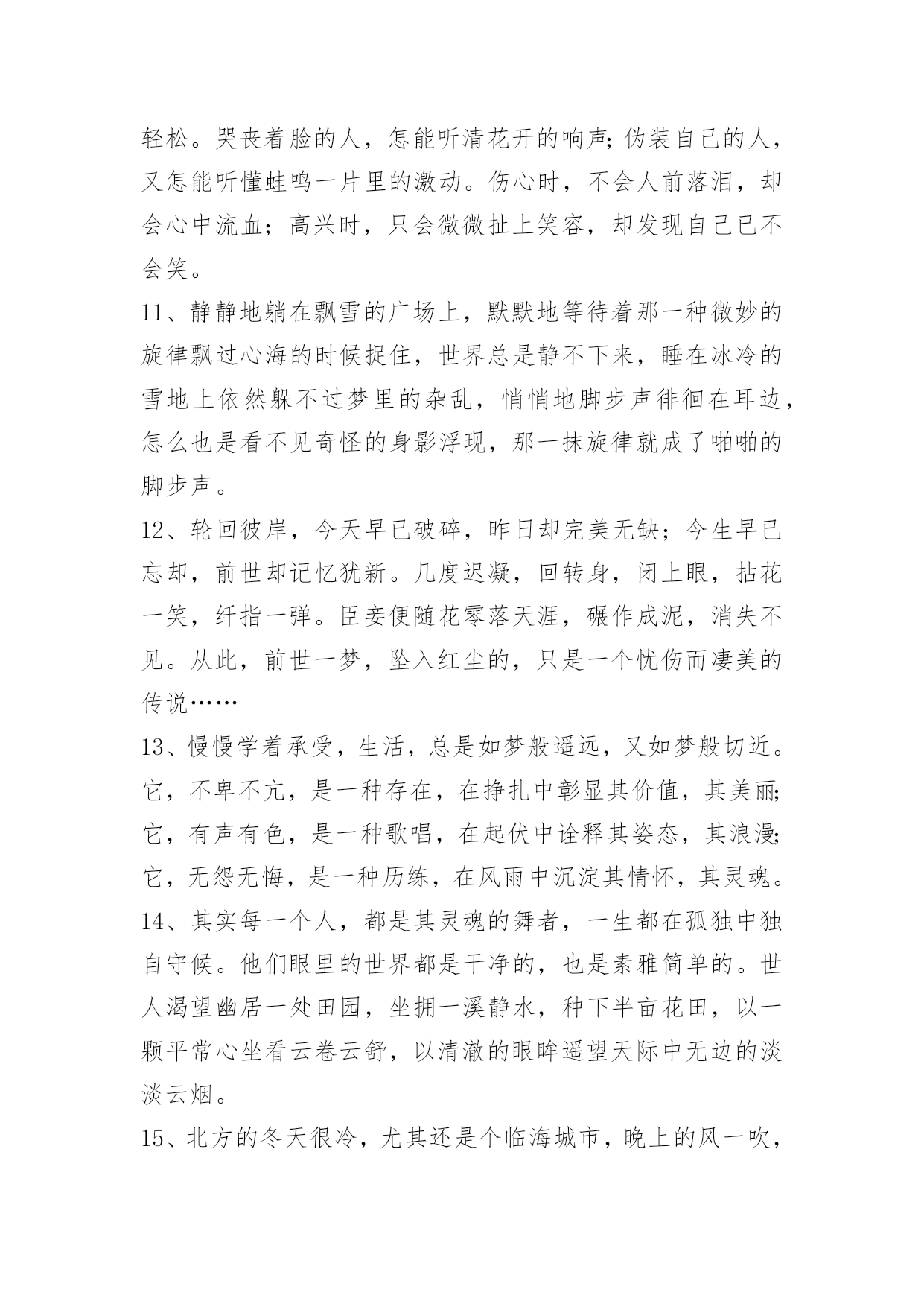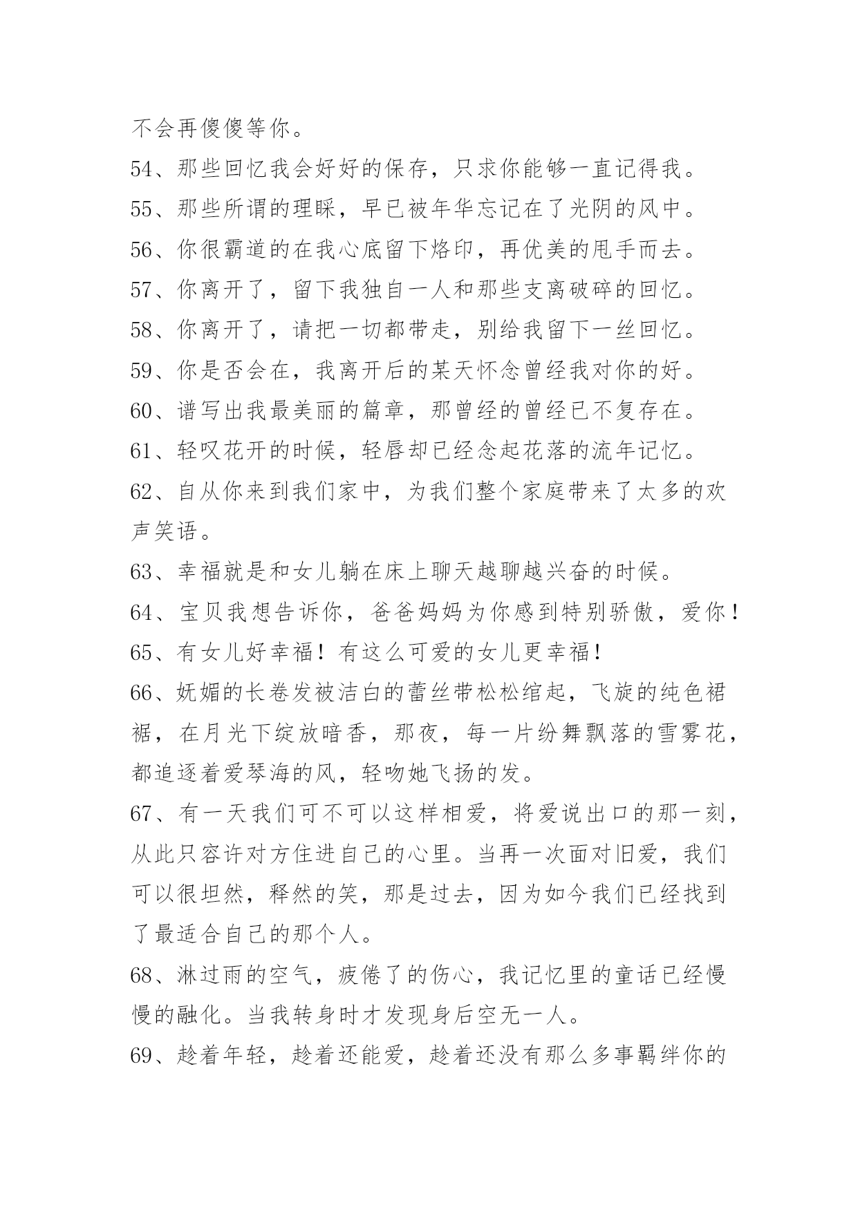 女生唯美句子84条有关女生唯美句子集合84条那些曾经以为过不去的坎,也都跌跌撞撞的过来了。下面是小编收集整理的女生唯美句子84条,一起来欣赏吧。1、春夜喜雨,干干的大地刚刚经历了洗礼,一切都将是新的,从高到低,从远及近,都一抹的新,新的芽,新的叶,新的瓣,新的蕊,新的梦,一切都可以重新开始,一切又可以把现实变成一个个美丽梦。2、回忆是一场前世的美梦,醉了今生痴儿那如寒谭般清澈的眼眸;回忆中的那一抹抹暖,含着一丝的浅喜,亦有一丝的浅忧,犹如那一朵朵的深谷幽兰,素雅清香却带着深沉的忧伤,在尘世之外旖旎生香。3、我寂寞寂寞就好,这时候谁都别来安慰拥抱。让我一个人去痛到受不了,伤到快疯掉。不了就还好。寂寞寂寞就好,你真的不用来我回忆里微笑。就不相信我会笨到忘不了,赖着不放掉。4、人生如茶、岁月静好,蓦然回首,才发现品茶品得亦是心境。穷也好,富也好,得也好,失也好,都是过眼云烟、时光荏苒,茶浓茶淡,且品且珍惜;人来人往,且行且祈愿。喝了这一杯茶,不管昨天、今天、明天,心若豁然,便如晴天。5、最快乐的人不是最完美的人,他们只是充分地利用了他们所能握在手里的东西。过的人,受过伤的人,追求过的人,尝试过的人,充满感激的人,才是真正懂得快乐的人。从一个微笑开始,在热吻中得以延伸,却随眼泪逝去。6、曾经有一个朋友写给我这样一句话:"我们将错过,不是因为想念,但两个遗漏的词在我们的生活中——感动。"实际上,我们的心不再敏感,我们不再收集在一个火花感动,只有当我们错过它,当回首,才发现我们真的失去了很多原始的。7、尘世里不小心的遇见,亦如烟花闪过天际,从此天涯多了一份寂寞的惆怅。谁把思念托付于唯美的诗行,将前世的眷恋,今生的落寞都吟成大漠里一缕孤烟?风过后,纷扬了一地的哀伤,谁站在一首诗的忧伤里怅然而望,那遥遥无期的温柔?8、的坏习气,不厌弃我的家境怎样,一直站在我身边,一不小心就白头到老了。(我希望遇到一个人,待我如我曾经待他那般。斘蚁M遇到一个人,能把我的情绪安抚下来,不再易躁易怒反覆无常,不再深夜哭的势不可挡,不再孤身一人开常9、季末阴暗笼罩的沉睡大地,阴霾的天空,雪花纷纷扰扰的散落,影子离乱在无边的苍白里,瑟瑟的风撩起了年末寒冷的霎那,又苦了谁的思念,殇了谁的心间?半城艳影,空岁落遇,弹指一挥间,几世繁华,付诸东流,三千青丝,沧桑流年。10、既然现在的我还不能变得深刻,那么,我就让自己变得轻松。哭丧着脸的人,怎能听清花开的响声;伪装自己的人,又怎能听懂蛙鸣一片里的激动。伤心时,不会人前落泪,却会心中流血;高兴时,只会微微扯上笑容,却发现自己已不会笑。11、静静地躺在飘雪的广场上,默默地等待着那一种微妙的旋律飘过心海的时候捉住,世界总是静不下来,睡在冰冷的雪地上依然躲不过梦里的杂乱,悄悄地脚步声徘徊在耳边,怎么也是看不见奇怪的身影浮现,那一抹旋律就成了啪啪的脚步声。12、轮回彼岸,今天早已破碎,昨日却完美无缺;今生早已忘却,前世却记忆犹新。几度迟凝,回转身,闭上眼,拈花一笑,纤指一弹。臣妾便随花零落天涯,碾作成泥,消失不见。从此,前世一梦,坠入红尘的,只是一个忧伤而凄美的传说……13、慢慢学着承受,生活,总是如梦般遥远,又如梦般切近。它,不卑不亢,是一种存在,在挣扎中彰显其价值,其美丽;它,有声有色,是一种歌唱,在起伏中诠释其姿态,其浪漫;它,无怨无悔,是一种历练,在风雨中沉淀其情怀,其灵魂。14、其实每一个人,都是其灵魂的舞者,一生都在孤独中独自守候。他们眼里的世界都是干净的,也是素雅简单的。世人渴望幽居一处田园,坐拥一溪静水,种下半亩花田,以一颗平常心坐看云卷云舒,以清澈的眼眸遥望天际中无边的淡淡云烟。15、北方的冬天很冷,尤其还是个临海城市,晚上的风一吹,就象是刀子一样在人们身上横行肆虐,街上多的是埋头走路匆匆忙忙的路人,谁都没有停下脚步,抬头望一望这座夜晚中忙碌的小城市。16、匆匆行进的步履,总觉得自己每天都很忙。见着行色匆匆的行人,朋友见了面也称自己很忙。忙是否让我们来不及一声问候;忙是否让我们忽略了身边的良辰美景,我们只是留给了时光的遗憾。17、等有一天我们都老了,那个时候会明白,今生所有的遇到都是命运给我们最好的礼物。感恩生命的存在,且豁达明了的生活。待到花开的瞬间,岁月仍记得,你来过,得到过,拥有过,珍惜过。18、人生是一趟单程旅行,重要的不是终点而是过程;记得带上发现美的眼睛,你才会不虚此行;还要懂得珍惜你的拥有,因为错过的永远无法回头。19、窗是被动的,门是主动的。只不过让我们朝外瞥一眼外面的情景,而门允许我们来临和离去。果它不能这样做,也就成为窗或墙了。20、大道至简,应从容自然。由与克制都是相对的,你克制自己的同时,你也获得了自由。些失去自由的人,往往是因为不能克制自己。21、曾经以为,最美的夕阳,不过是那染红了半边
