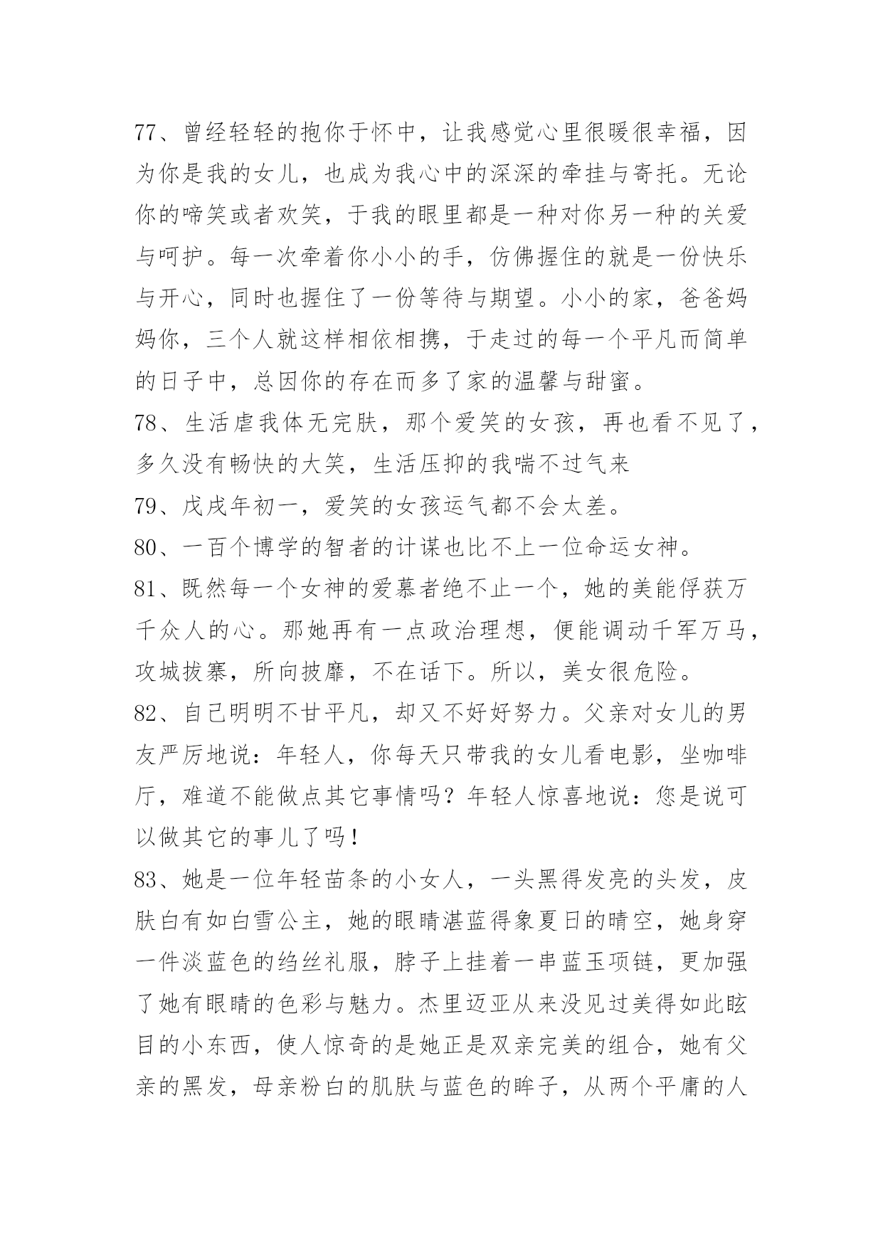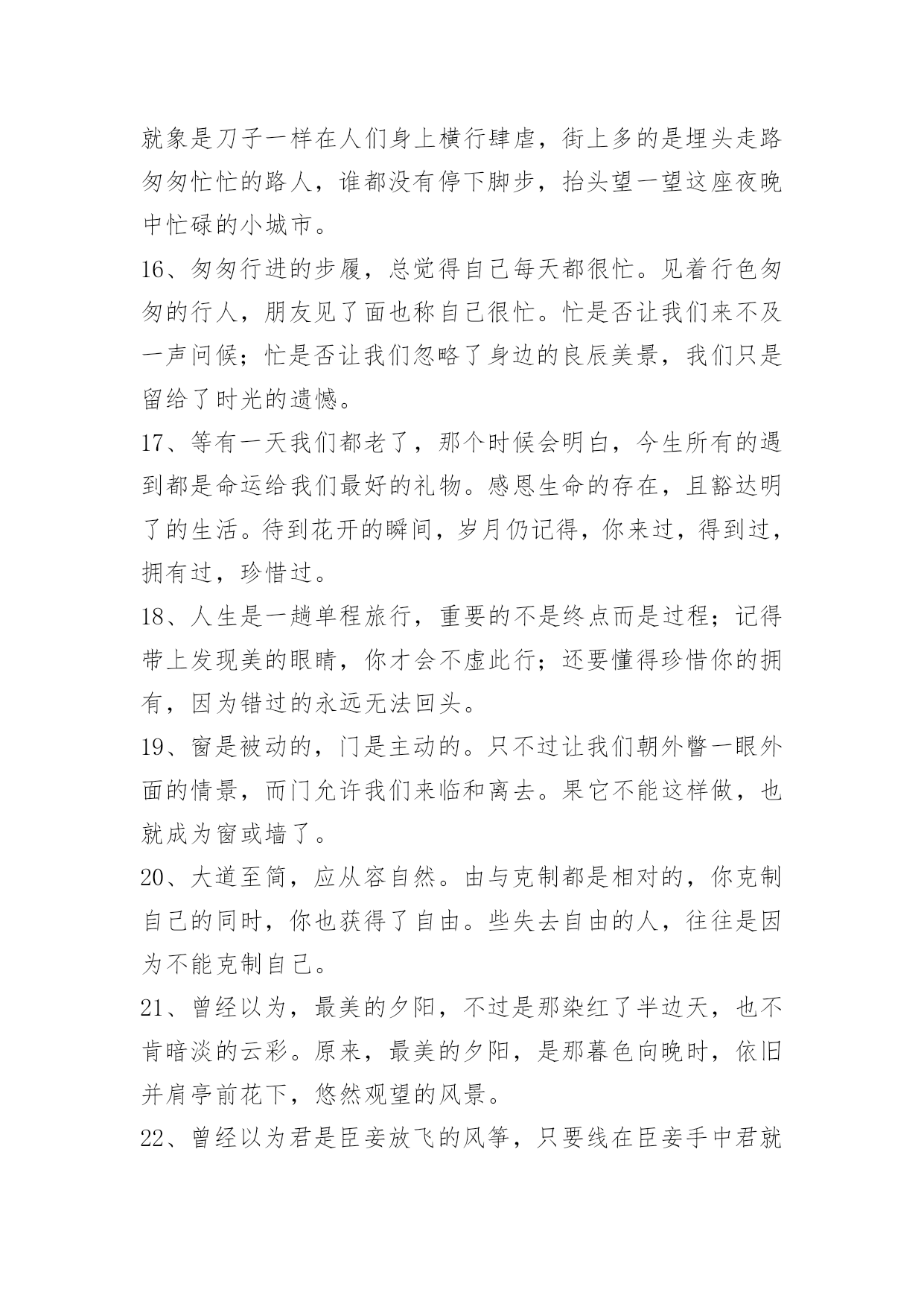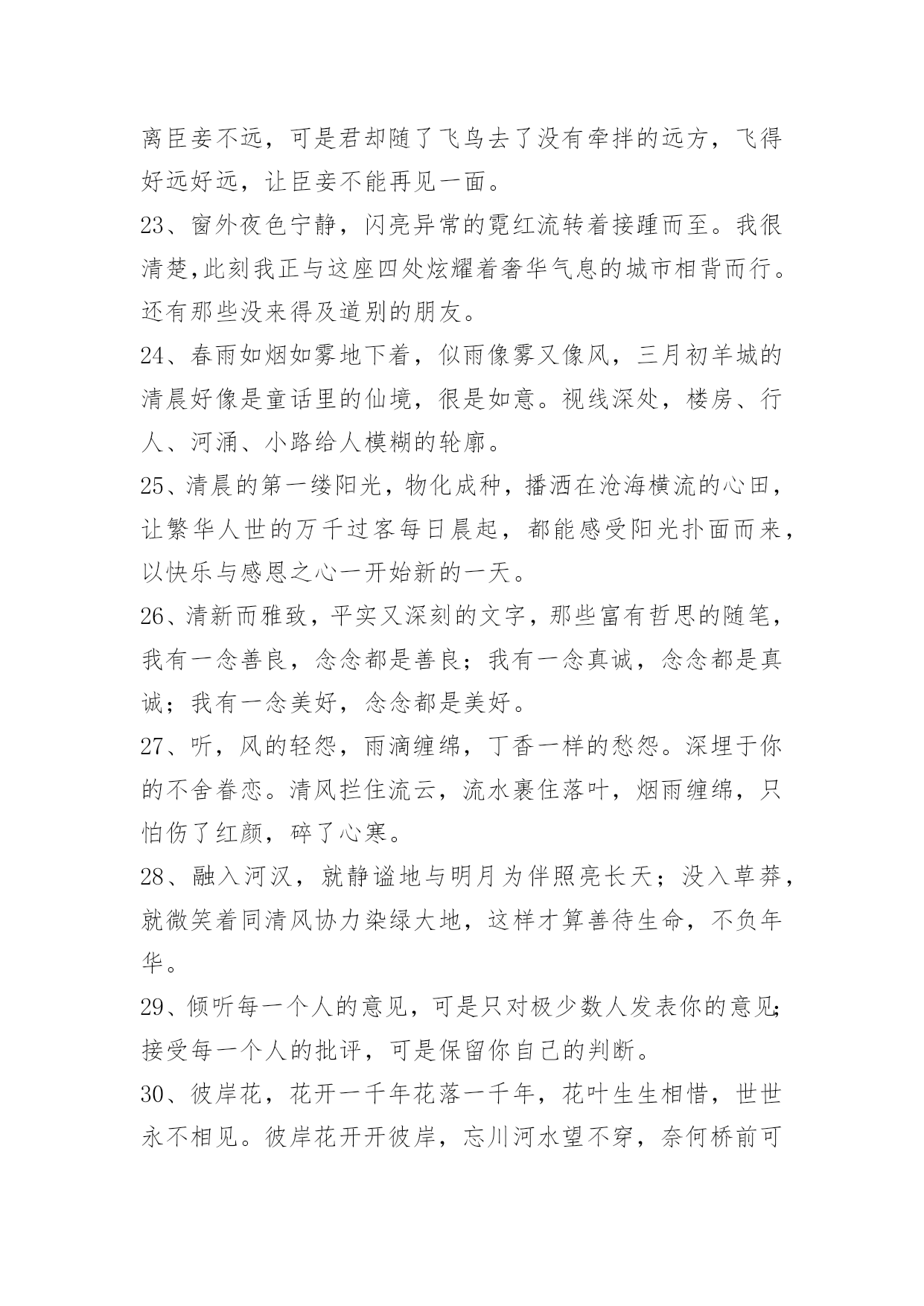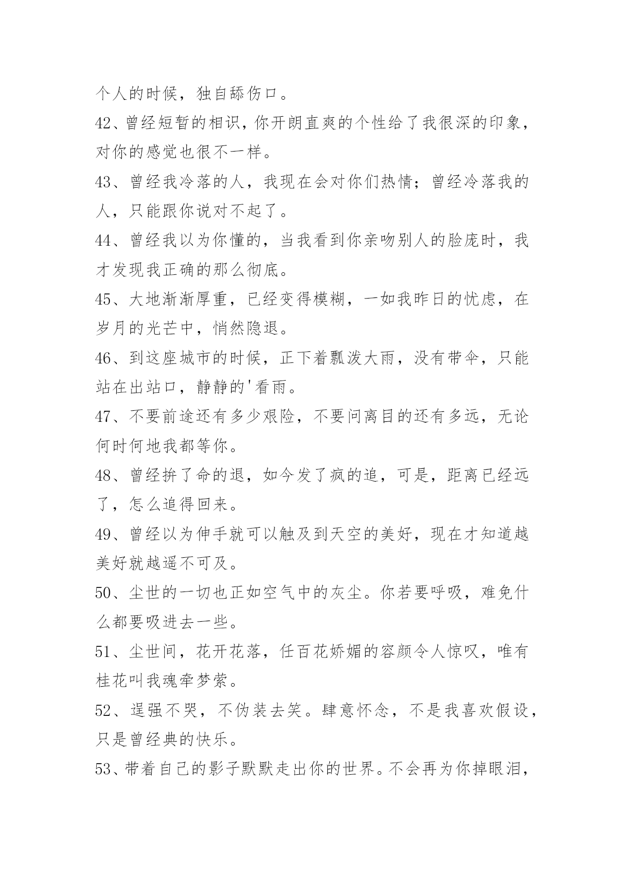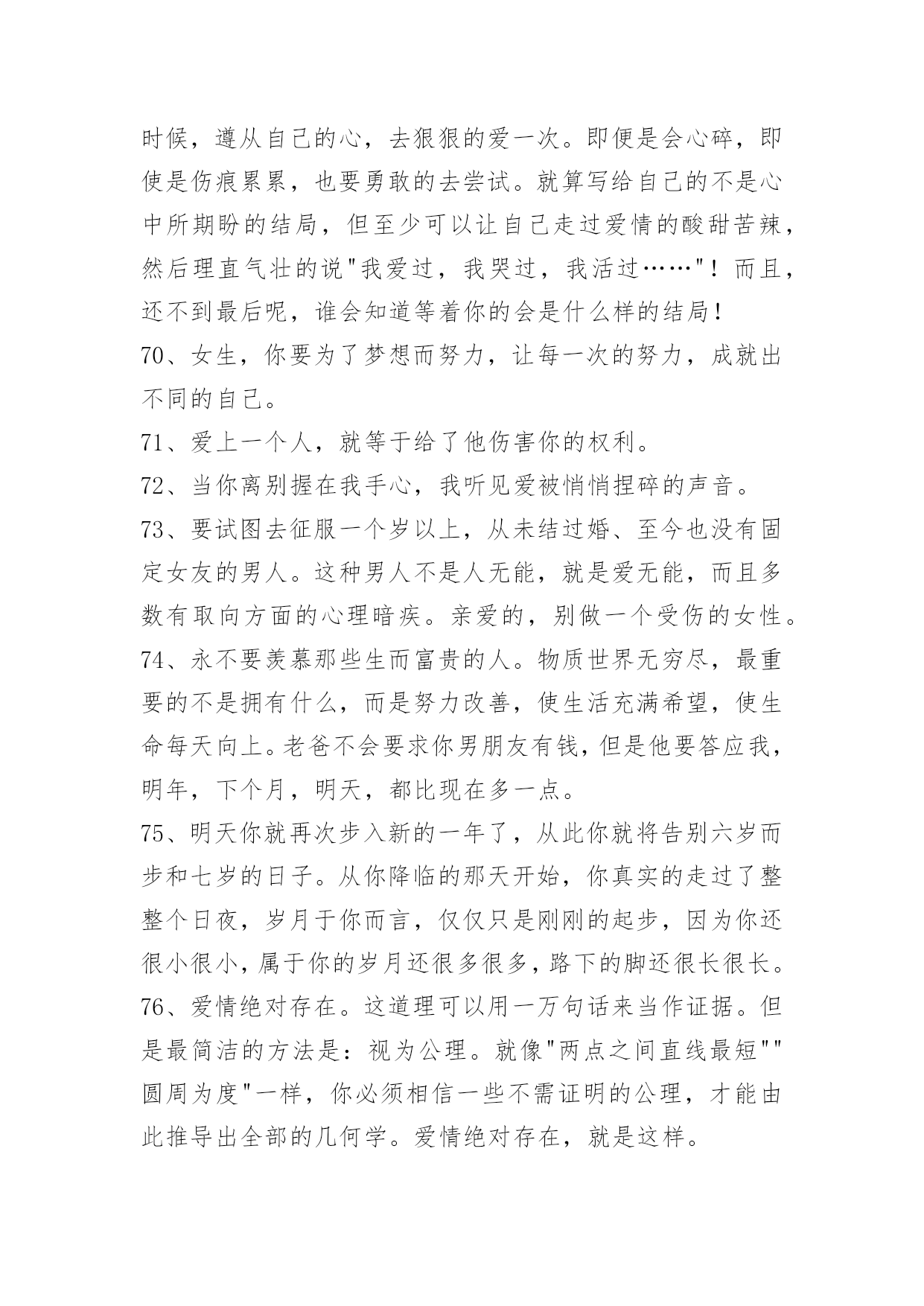 女生唯美句子84条有关女生唯美句子集合84条那些曾经以为过不去的坎,也都跌跌撞撞的过来了。下面是小编收集整理的女生唯美句子84条,一起来欣赏吧。1、春夜喜雨,干干的大地刚刚经历了洗礼,一切都将是新的,从高到低,从远及近,都一抹的新,新的芽,新的叶,新的瓣,新的蕊,新的梦,一切都可以重新开始,一切又可以把现实变成一个个美丽梦。2、回忆是一场前世的美梦,醉了今生痴儿那如寒谭般清澈的眼眸;回忆中的那一抹抹暖,含着一丝的浅喜,亦有一丝的浅忧,犹如那一朵朵的深谷幽兰,素雅清香却带着深沉的忧伤,在尘世之外旖旎生香。3、我寂寞寂寞就好,这时候谁都别来安慰拥抱。让我一个人去痛到受不了,伤到快疯掉。不了就还好。寂寞寂寞就好,你真的不用来我回忆里微笑。就不相信我会笨到忘不了,赖着不放掉。4、人生如茶、岁月静好,蓦然回首,才发现品茶品得亦是心境。穷也好,富也好,得也好,失也好,都是过眼云烟、时光荏苒,茶浓茶淡,且品且珍惜;人来人往,且行且祈愿。喝了这一杯茶,不管昨天、今天、明天,心若豁然,便如晴天。5、最快乐的人不是最完美的人,他们只是充分地利用了他们所能握在手里的东西。过的人,受过伤的人,追求过的人,尝试过的人,充满感激的人,才是真正懂得快乐的人。从一个微笑开始,在热吻中得以延伸,却随眼泪逝去。6、曾经有一个朋友写给我这样一句话:"我们将错过,不是因为想念,但两个遗漏的词在我们的生活中——感动。"实际上,我们的心不再敏感,我们不再收集在一个火花感动,只有当我们错过它,当回首,才发现我们真的失去了很多原始的。7、尘世里不小心的遇见,亦如烟花闪过天际,从此天涯多了一份寂寞的惆怅。谁把思念托付于唯美的诗行,将前世的眷恋,今生的落寞都吟成大漠里一缕孤烟?风过后,纷扬了一地的哀伤,谁站在一首诗的忧伤里怅然而望,那遥遥无期的温柔?8、的坏习气,不厌弃我的家境怎样,一直站在我身边,一不小心就白头到老了。(我希望遇到一个人,待我如我曾经待他那般。斘蚁M遇到一个人,能把我的情绪安抚下来,不再易躁易怒反覆无常,不再深夜哭的势不可挡,不再孤身一人开常9、季末阴暗笼罩的沉睡大地,阴霾的天空,雪花纷纷扰扰的散落,影子离乱在无边的苍白里,瑟瑟的风撩起了年末寒冷的霎那,又苦了谁的思念,殇了谁的心间?半城艳影,空岁落遇,弹指一挥间,几世繁华,付诸东流,三千青丝,沧桑流年。10、既然现在的我还不能变得深刻,那么,我就让自己变得轻松。哭丧着脸的人,怎能听清花开的响声;伪装自己的人,又怎能听懂蛙鸣一片里的激动。伤心时,不会人前落泪,却会心中流血;高兴时,只会微微扯上笑容,却发现自己已不会笑。11、静静地躺在飘雪的广场上,默默地等待着那一种微妙的旋律飘过心海的时候捉住,世界总是静不下来,睡在冰冷的雪地上依然躲不过梦里的杂乱,悄悄地脚步声徘徊在耳边,怎么也是看不见奇怪的身影浮现,那一抹旋律就成了啪啪的脚步声。12、轮回彼岸,今天早已破碎,昨日却完美无缺;今生早已忘却,前世却记忆犹新。几度迟凝,回转身,闭上眼,拈花一笑,纤指一弹。臣妾便随花零落天涯,碾作成泥,消失不见。从此,前世一梦,坠入红尘的,只是一个忧伤而凄美的传说……13、慢慢学着承受,生活,总是如梦般遥远,又如梦般切近。它,不卑不亢,是一种存在,在挣扎中彰显其价值,其美丽;它,有声有色,是一种歌唱,在起伏中诠释其姿态,其浪漫;它,无怨无悔,是一种历练,在风雨中沉淀其情怀,其灵魂。14、其实每一个人,都是其灵魂的舞者,一生都在孤独中独自守候。他们眼里的世界都是干净的,也是素雅简单的。世人渴望幽居一处田园,坐拥一溪静水,种下半亩花田,以一颗平常心坐看云卷云舒,以清澈的眼眸遥望天际中无边的淡淡云烟。15、北方的冬天很冷,尤其还是个临海城市,晚上的风一吹,就象是刀子一样在人们身上横行肆虐,街上多的是埋头走路匆匆忙忙的路人,谁都没有停下脚步,抬头望一望这座夜晚中忙碌的小城市。16、匆匆行进的步履,总觉得自己每天都很忙。见着行色匆匆的行人,朋友见了面也称自己很忙。忙是否让我们来不及一声问候;忙是否让我们忽略了身边的良辰美景,我们只是留给了时光的遗憾。17、等有一天我们都老了,那个时候会明白,今生所有的遇到都是命运给我们最好的礼物。感恩生命的存在,且豁达明了的生活。待到花开的瞬间,岁月仍记得,你来过,得到过,拥有过,珍惜过。18、人生是一趟单程旅行,重要的不是终点而是过程;记得带上发现美的眼睛,你才会不虚此行;还要懂得珍惜你的拥有,因为错过的永远无法回头。19、窗是被动的,门是主动的。只不过让我们朝外瞥一眼外面的情景,而门允许我们来临和离去。果它不能这样做,也就成为窗或墙了。20、大道至简,应从容自然。由与克制都是相对的,你克制自己的同时,你也获得了自由。些失去自由的人,往往是因为不能克制自己。21、曾经以为,最美的夕阳,不过是那染红了半边