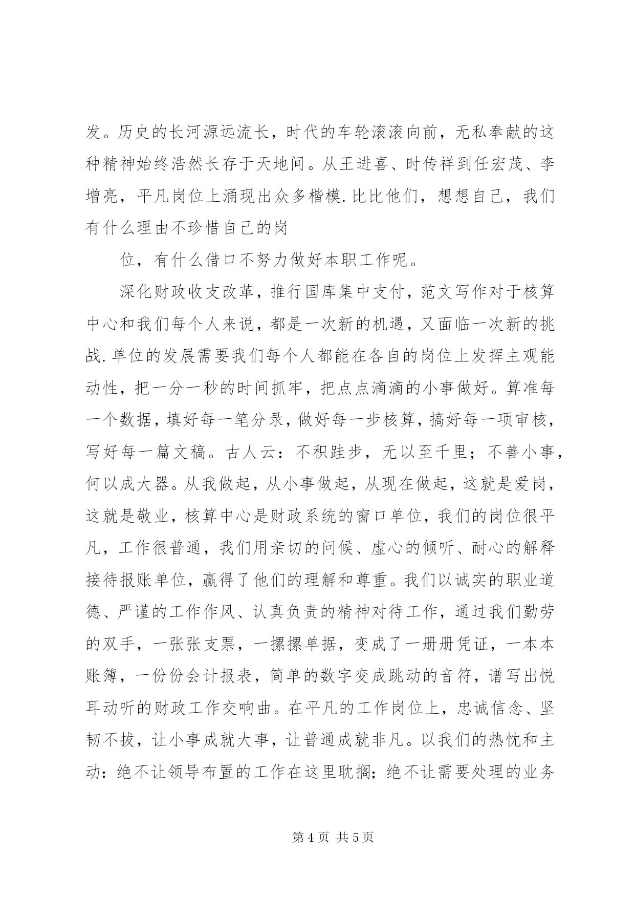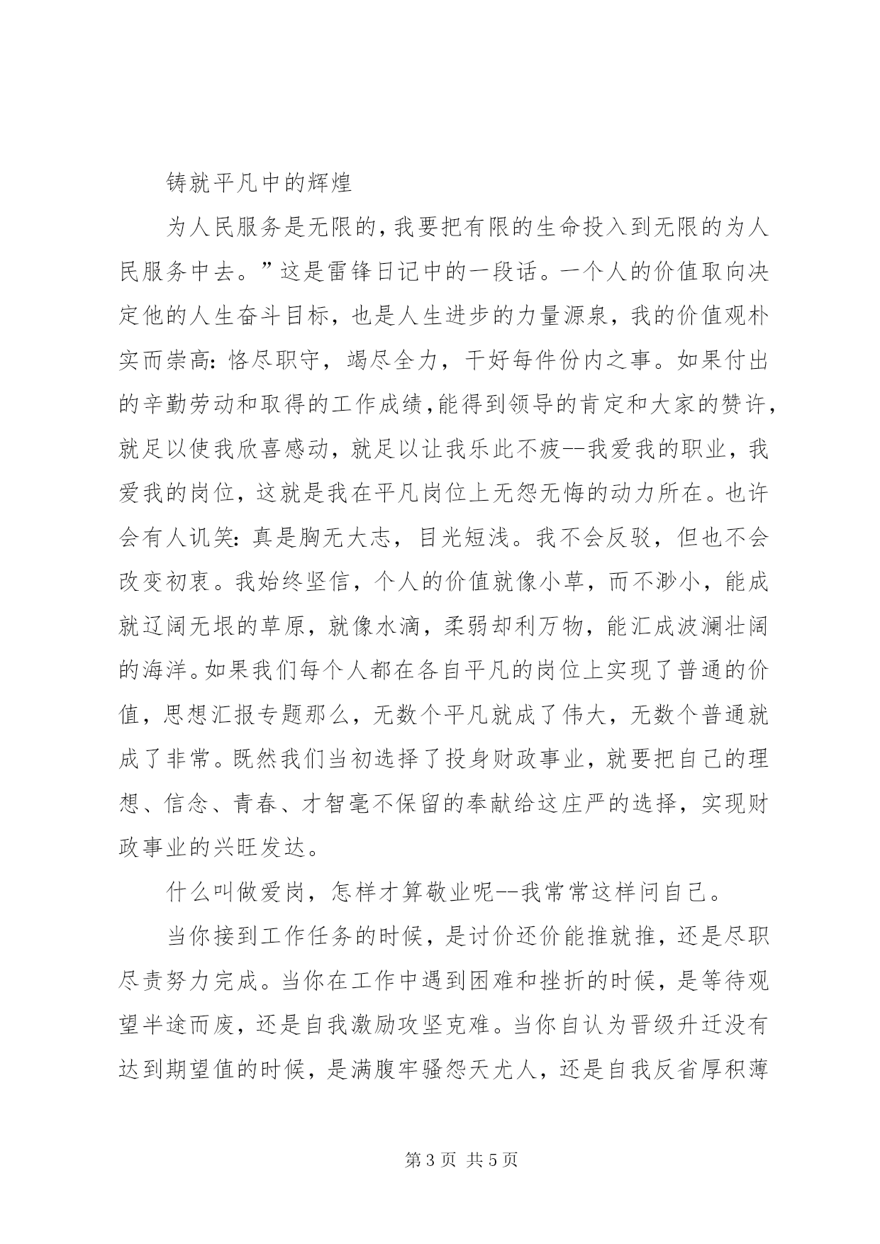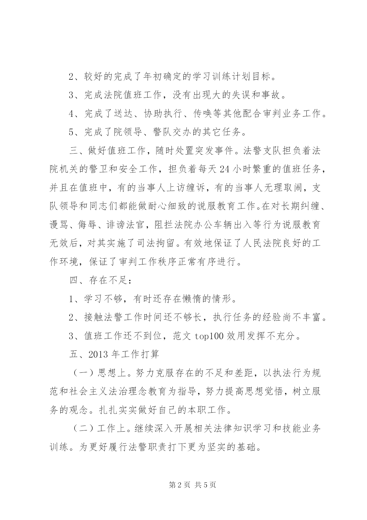 第PAGE\*Arabic\*MERGEFORMAT5页共NUMPAGES\*MERGEFORMAT5页司法警察年终工作总结我在法院法警大队工作这一年的时间了。虽然刚刚熟悉环境,但思想稳定,工作踏实认真,能主动克服困难,虚心求教,努力学习业务知识。较好地完成了本职工作和上级交办的各项任务。结合本部门的工作实际,认真开展各项工作,全面履行司法警察各项职责,坚决完成院长交办的事项,圆满完成了-年度工作任务。现总结如下:一、加强政治理论学习和业务技能学习,不断提高政治素质和业务素质在这一年中,我努力提高思想觉悟,树立全心全意为人民服务的观念。不管是在工作中还是在生活中都始终以一名共产党员的标准严格要求自己,以一名合格的人民警察的标准来履行职责、完成任务。在这一年中,我能认真学习,虚心向老同志请教,平时工作中、业余时间总是抓紧一切可以利用的时间学习业务知识,全面学习了业务相关的法律知识,提高了履行职责应具备的素质。二、2013年主要工作。2013年度,法警支队紧紧围绕院党组的中心工作,以“公正与效率”为主题,以“公正司法树形象”活动为载体,积极为审判工作服务,配合各部门努力完成全院各项工作任务和院领导交办的事项。1、最全面的范文参考写作网站严格按照各项要求完成了配合审判业务,值庭、押解、看管都没有出现大的失误。2、较好的完成了年初确定的学习训练计划目标。3、完成法院值班工作,没有出现大的失误和事故。4、完成了送达、协助执行、传唤等其他配合审判业务工作。5、完成了院领导、警队交办的其它任务。三、做好值班工作,随时处置突发事件。法警支队担负着法院机关的警卫和安全工作,担负着每天24小时繁重的值班任务,并且在值班中,有的当事人上访缠诉,有的当事人无理取闹,支队领导和同志们都能做耐心细致的说服教育工作。在对长期纠缠、谩骂、侮辱、诽谤法官,阻拦法院办公车辆出入等行为说服教育无效后,对其实施了司法拘留。有效地保证了人民法院良好的工作环境,保证了审判工作秩序正常有序进行。四、存在不足:1、学习不够,有时还存在懒惰的情形。2、接触法警工作时间还不够长,执行任务的经验尚不丰富。3、值班工作还不到位,范文top100效用发挥不充分。五、2013年工作打算(一)思想上。努力克服存在的不足和差距,以执法行为规范和社会主义法治理念教育为指导,努力提高思想觉悟,树立服务的观念。扎扎实实做好自己的本职工作。(二)工作上。继续深入开展相关法律知识学习和技能业务训练。为更好履行法警职责打下更为坚实的基础。铸就平凡中的辉煌为人民服务是无限的,我要把有限的生命投入到无限的为人民服务中去。”这是雷锋日记中的一段话。一个人的价值取向决定他的人生奋斗目标,也是人生进步的力量源泉,我的价值观朴实而崇高:恪尽职守,竭尽全力,干好每件份内之事。如果付出的辛勤劳动和取得的工作成绩,能得到领导的肯定和大家的赞许,就足以使我欣喜感动,就足以让我乐此不疲--我爱我的职业,我爱我的岗位,这就是我在平凡岗位上无怨无悔的动力所在。也许会有人讥笑:真是胸无大志,目光短浅。我不会反驳,但也不会改变初衷。我始终坚信,个人的价值就像小草,而不渺小,能成就辽阔无垠的草原,就像水滴,柔弱却利万物,能汇成波澜壮阔的海洋。如果我们每个人都在各自平凡的岗位上实现了普通的价值,思想汇报专题那么,无数个平凡就成了伟大,无数个普通就成了非常。既然我们当初选择了投身财政事业,就要把自己的理想、信念、青春、才智毫不保留的奉献给这庄严的选择,实现财政事业的兴旺发达。什么叫做爱岗,怎样才算敬业呢--我常常这样问自己。当你接到工作任务的时候,是讨价还价能推就推,还是尽职尽责努力完成。当你在工作中遇到困难和挫折的时候,是等待观望半途而废,还是自我激励攻坚克难。当你自认为晋级升迁没有达到期望值的时候,是满腹牢骚怨天尤人,还是自我反省厚积薄发。历史的长河源远流长,时代的车轮滚滚向前,无私奉献的这种精神始终浩然长存于天地间。从王进喜、时传祥到任宏茂、李增亮,平凡岗位上涌现出众多楷模.比比他们,想想自己,我们有什么理由不珍惜自己的岗位,有什么借口不努力做好本职工作呢。深化财政收支改革,推行国库集中支付,范文写作对于核算中心和我们每个人来说,都是一次新的机遇,又面临一次新的挑战.单位的发展需要我们每个人都能在各自的岗位上发挥主观能动性,把一分一秒的时间抓牢,把点点滴滴的小事做好。算准每一个数据,填好每一笔分录,做好每一步核算,搞好每一项审核,写好每一篇文稿。古人云:不积跬步,无以至千里;不善小事,何以成大器。从我做起,从小事做起,从现在做起,这就是爱岗,这就是敬业,核算中心是财政系统的窗口单位,我们的岗位很平凡,工作很普通,我们用亲切的问候、虚心的倾听、耐心的解释接待报账单位,赢得了他们的理解和尊重。我们以诚实的职业