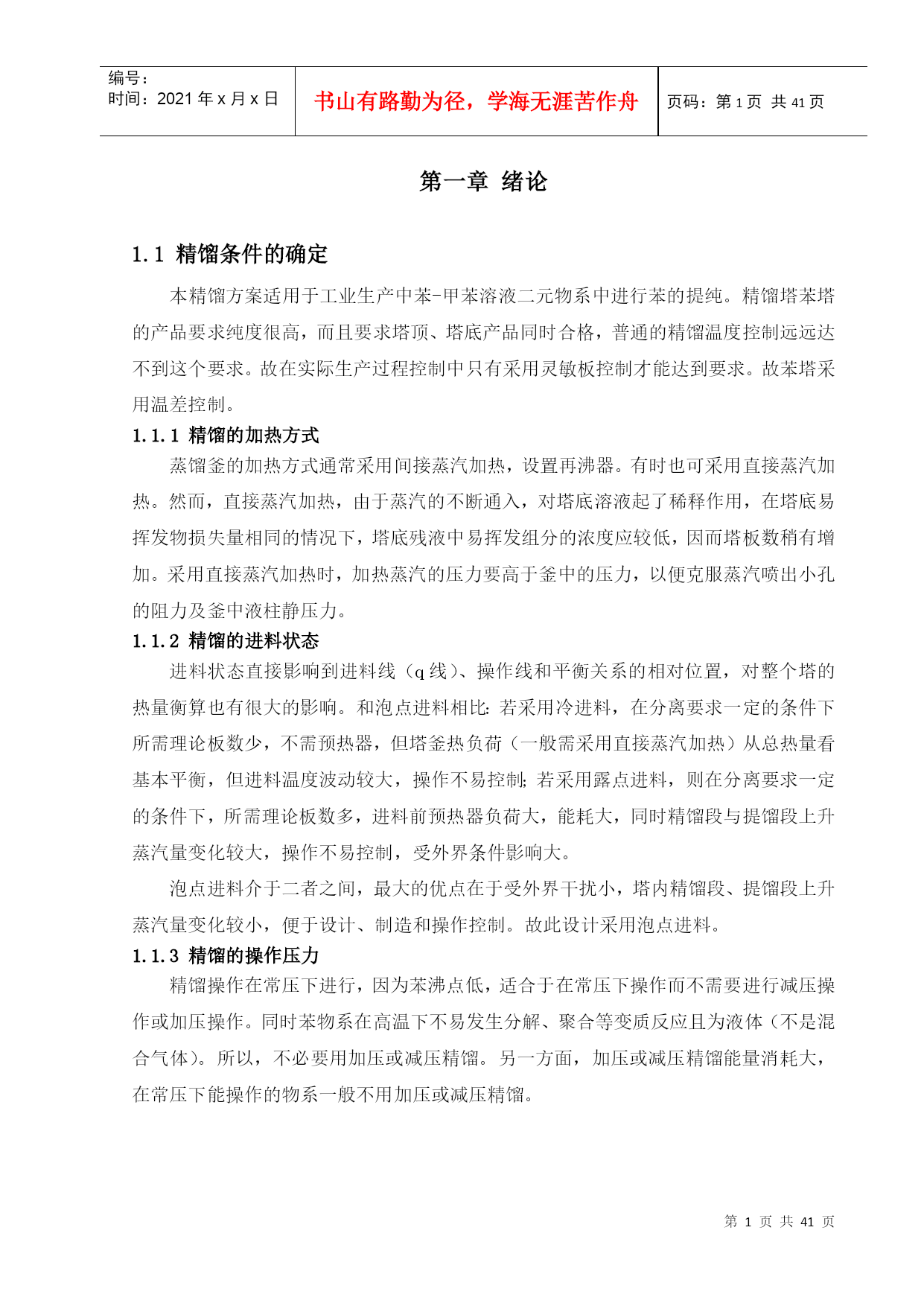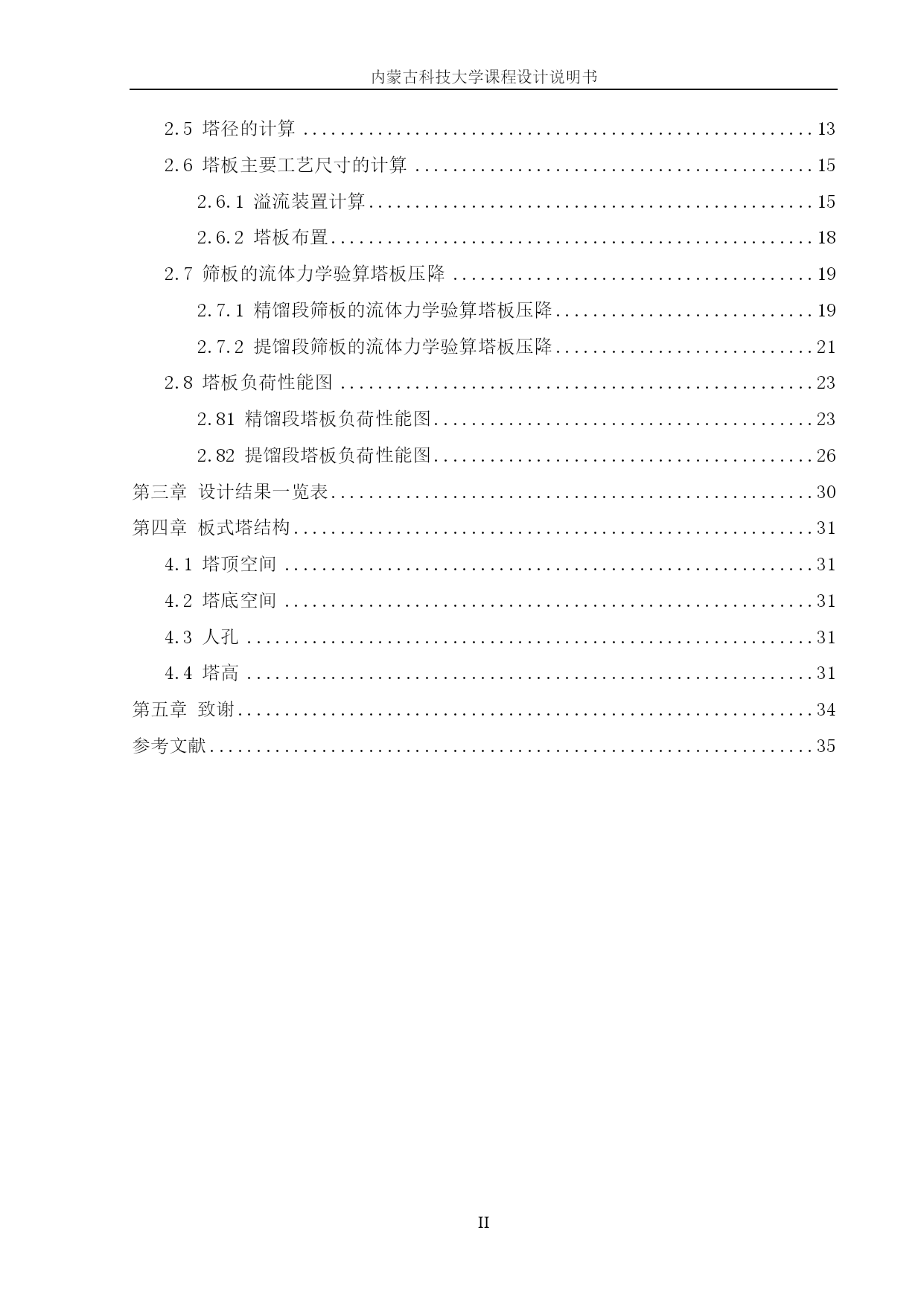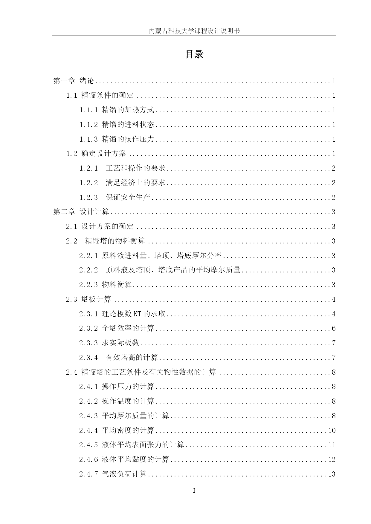 内蒙古科技大学课程设计说明书PAGE\*MERGEFORMATII资料前言化工原理课程设计是培养学生化工设计能力的重要教学环节,通过课程设计使我们初步掌握化工设计的基础知识、设计原则及方法;学会各种手册的使用方法及物理性质、化学性质的查找方法和技巧;掌握各种结果的校核,能画出工艺流程、塔板结构等图形。在设计过程中不仅要考虑理论上的可行性,还要考虑生产上的安全性、经济合理性。化工生产常需进行液体混合物的分离以达到提纯或回收有用组分的目的,精馏是利用液体混合物中各组分挥发度的不同并借助于多次部分汽化和部分冷凝达到轻重组分分离的方法。塔设备一般分为阶跃接触式和连续接触式两大类。前者的代表是板式塔,后者的代表则为填料塔。筛板塔和泡罩塔相比较具有下列特点:生产能力大于10.5%,板效率提高产量15%左右;而压降可降低30%左右;另外筛板塔结构简单,消耗金属少,塔板的造价可减少40%左右;安装容易,也便于清理检修。本次课程设计为年处理含苯质量分数36%的苯-甲苯混合液4万吨的筛板精馏塔设计,塔设备是化工、炼油生产中最重要的设备之一。它可使气(或汽)液或液液两相之间进行紧密接触,达到相际传质及传热的目的。在设计过程中应考虑到设计的精馏塔具有较大的生产能力满足工艺要求,另外还要有一定的潜力。节省能源,综合利用余热。经济合理,冷却水进出口温度的高低,一方面影响到冷却水用量。另一方面影响到所需传热面积的大小。即对操作费用和设备费用均有影响,因此设计是否合理的利用热能R等直接关系到生产过程的经济问题。PAGE\*MERGEFORMATII目录TOC\o"1-3"\h\uHYPERLINK\l_Toc32258第一章绪论PAGEREF_Toc322581HYPERLINK\l_Toc157141.1精馏条件的确定PAGEREF_Toc157141HYPERLINK\l_Toc186341.1.1精馏的加热方式PAGEREF_Toc186341HYPERLINK\l_Toc50371.1.2精馏的进料状态PAGEREF_Toc50371HYPERLINK\l_Toc201271.1.3精馏的操作压力PAGEREF_Toc201271HYPERLINK\l_Toc251241.2确定设计方案PAGEREF_Toc251241HYPERLINK\l_Toc217461.2.1工艺和操作的要求PAGEREF_Toc217462HYPERLINK\l_Toc177001.2.2满足经济上的要求PAGEREF_Toc177002HYPERLINK\l_Toc267981.2.3保证安全生产PAGEREF_Toc267982HYPERLINK\l_Toc30689第二章设计计算PAGEREF_Toc306893HYPERLINK\l_Toc67242.1设计方案的确定PAGEREF_Toc67243HYPERLINK\l_Toc191532.2精馏塔的物料衡算PAGEREF_Toc191533HYPERLINK\l_Toc69082.2.1原料液进料量、塔顶、塔底摩尔分率PAGEREF_Toc69083HYPERLINK\l_Toc190042.2.2原料液及塔顶、塔底产品的平均摩尔质量PAGEREF_Toc190043HYPERLINK\l_Toc198782.2.3物料衡算PAGEREF_Toc198783HYPERLINK\l_Toc324042.3塔板计算PAGEREF_Toc324044HYPERLINK\l_Toc154252.3.1理论板数NT的求取PAGEREF_Toc154254HYPERLINK\l_Toc201632.3.2全塔效率的计算PAGEREF_Toc201636HYPERLINK\l_Toc263632.3.3求实际板数PAGEREF_Toc263637HYPERLINK\l_Toc240722.3.4有效塔高的计算PAGEREF_Toc240727HYPERLINK\l_Toc278962.4精馏塔的工艺条件及有关物性数据的计算PAGEREF_Toc278968HYPERLINK\l_Toc26432.4.1操作压力的计算PAGEREF_Toc26438HYPERLINK\l_Toc83022.4.2操作温度的计算