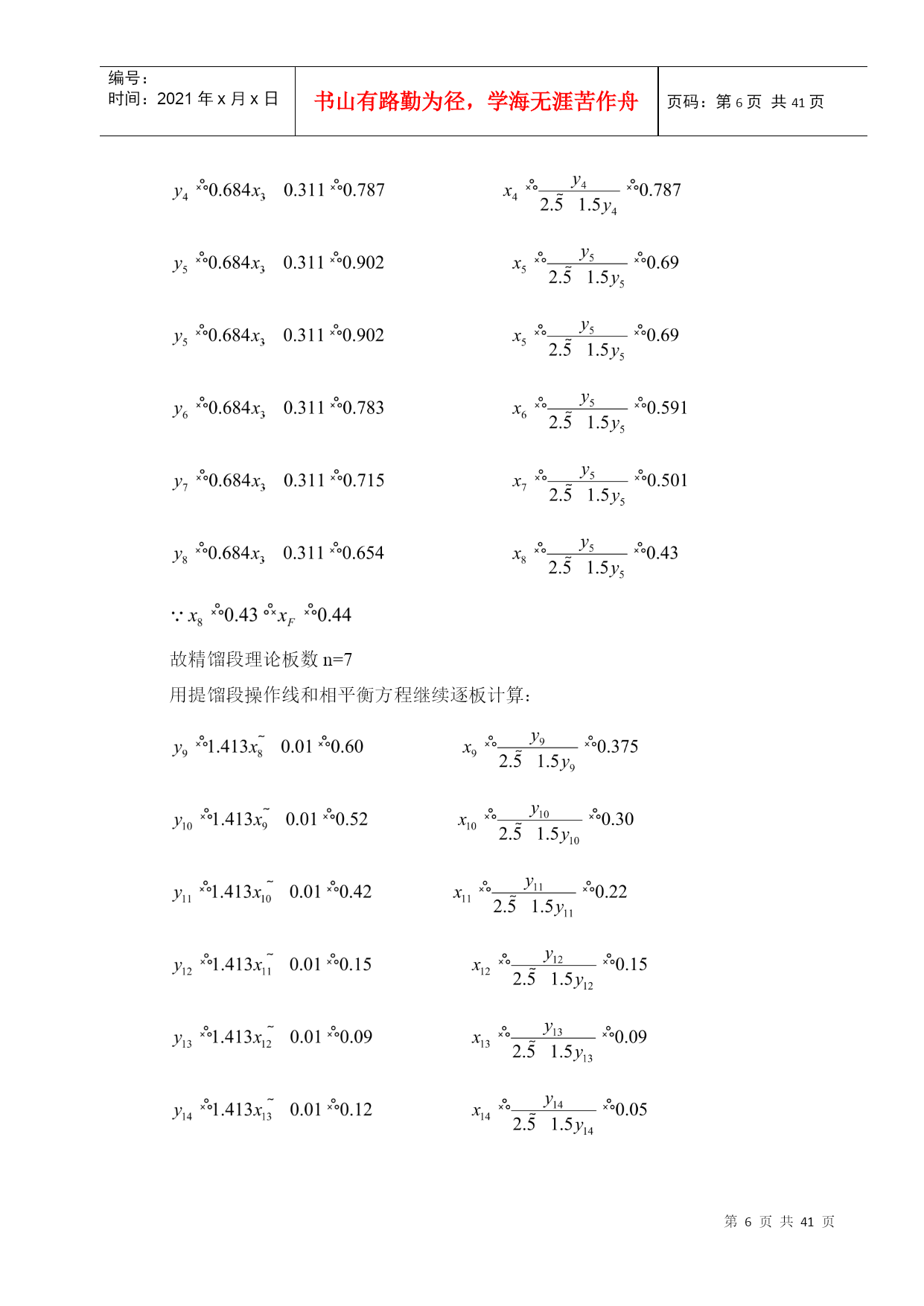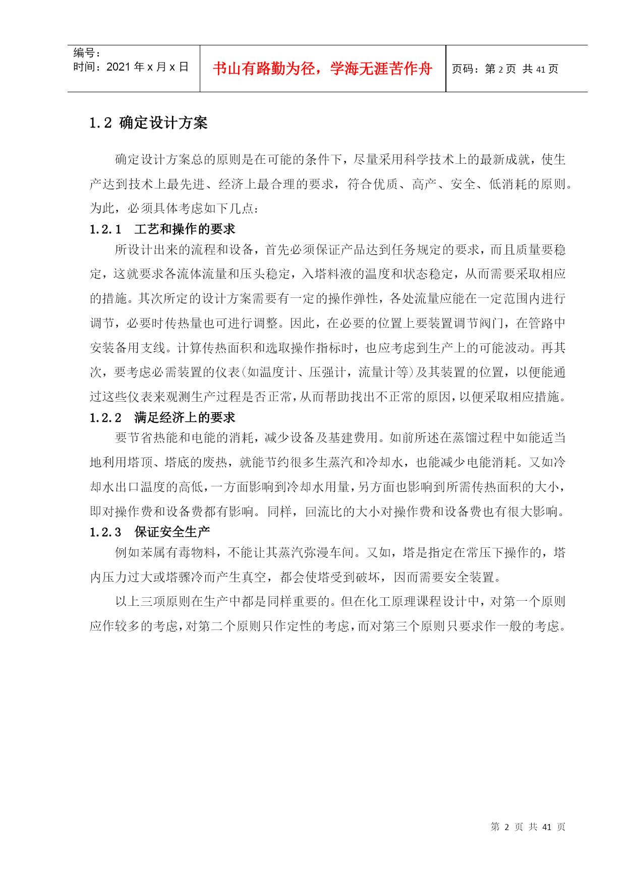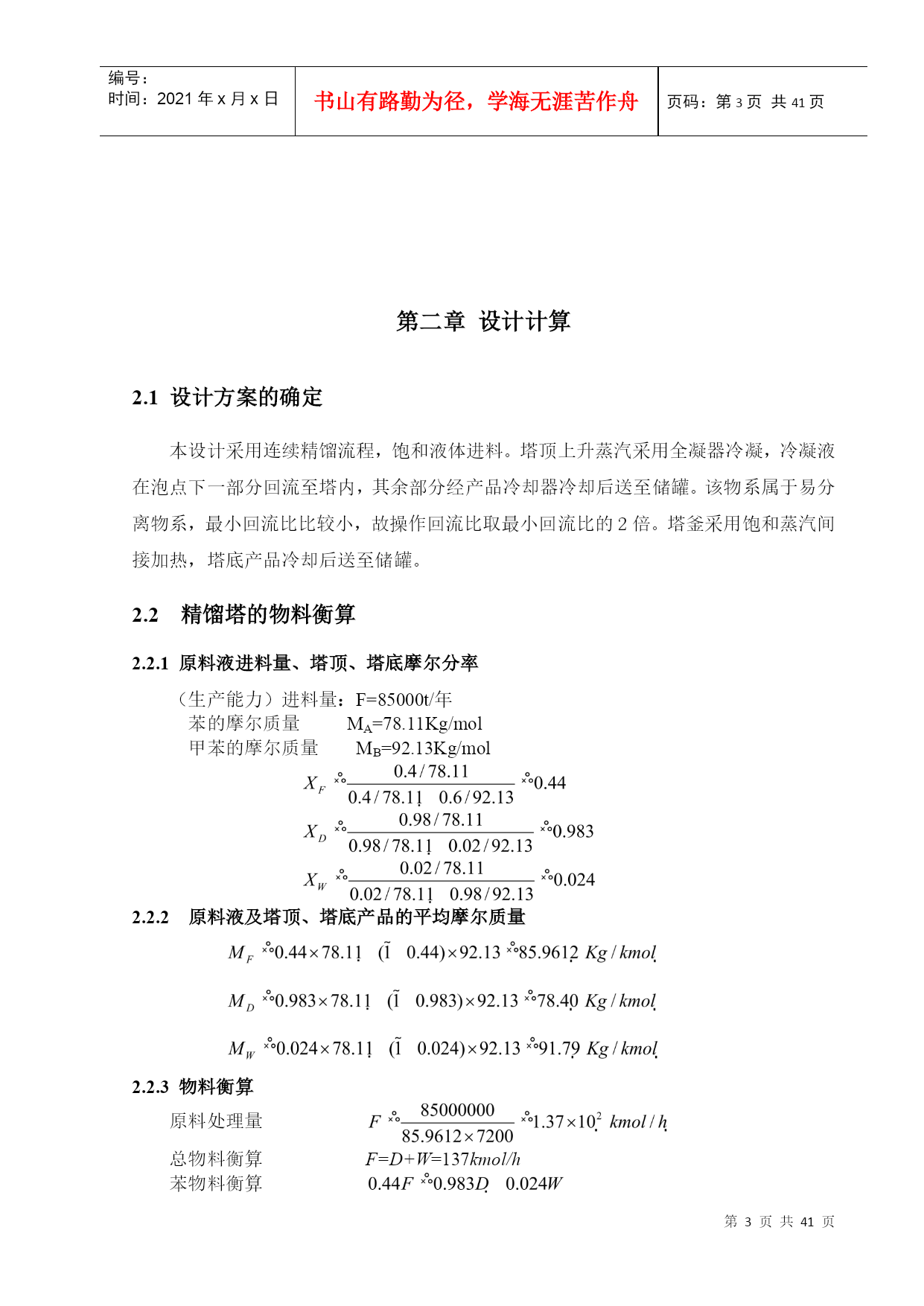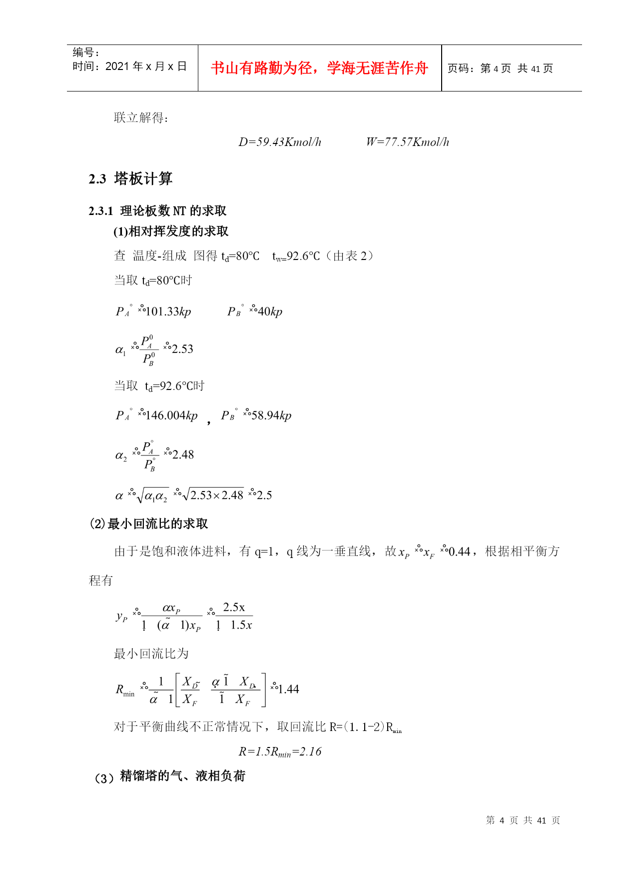 内蒙古科技大学课程设计说明书PAGE\*MERGEFORMATII资料前言化工原理课程设计是培养学生化工设计能力的重要教学环节,通过课程设计使我们初步掌握化工设计的基础知识、设计原则及方法;学会各种手册的使用方法及物理性质、化学性质的查找方法和技巧;掌握各种结果的校核,能画出工艺流程、塔板结构等图形。在设计过程中不仅要考虑理论上的可行性,还要考虑生产上的安全性、经济合理性。化工生产常需进行液体混合物的分离以达到提纯或回收有用组分的目的,精馏是利用液体混合物中各组分挥发度的不同并借助于多次部分汽化和部分冷凝达到轻重组分分离的方法。塔设备一般分为阶跃接触式和连续接触式两大类。前者的代表是板式塔,后者的代表则为填料塔。筛板塔和泡罩塔相比较具有下列特点:生产能力大于10.5%,板效率提高产量15%左右;而压降可降低30%左右;另外筛板塔结构简单,消耗金属少,塔板的造价可减少40%左右;安装容易,也便于清理检修。本次课程设计为年处理含苯质量分数36%的苯-甲苯混合液4万吨的筛板精馏塔设计,塔设备是化工、炼油生产中最重要的设备之一。它可使气(或汽)液或液液两相之间进行紧密接触,达到相际传质及传热的目的。在设计过程中应考虑到设计的精馏塔具有较大的生产能力满足工艺要求,另外还要有一定的潜力。节省能源,综合利用余热。经济合理,冷却水进出口温度的高低,一方面影响到冷却水用量。另一方面影响到所需传热面积的大小。即对操作费用和设备费用均有影响,因此设计是否合理的利用热能R等直接关系到生产过程的经济问题。PAGE\*MERGEFORMATII目录TOC\o"1-3"\h\uHYPERLINK\l_Toc32258第一章绪论PAGEREF_Toc322581HYPERLINK\l_Toc157141.1精馏条件的确定PAGEREF_Toc157141HYPERLINK\l_Toc186341.1.1精馏的加热方式PAGEREF_Toc186341HYPERLINK\l_Toc50371.1.2精馏的进料状态PAGEREF_Toc50371HYPERLINK\l_Toc201271.1.3精馏的操作压力PAGEREF_Toc201271HYPERLINK\l_Toc251241.2确定设计方案PAGEREF_Toc251241HYPERLINK\l_Toc217461.2.1工艺和操作的要求PAGEREF_Toc217462HYPERLINK\l_Toc177001.2.2满足经济上的要求PAGEREF_Toc177002HYPERLINK\l_Toc267981.2.3保证安全生产PAGEREF_Toc267982HYPERLINK\l_Toc30689第二章设计计算PAGEREF_Toc306893HYPERLINK\l_Toc67242.1设计方案的确定PAGEREF_Toc67243HYPERLINK\l_Toc191532.2精馏塔的物料衡算PAGEREF_Toc191533HYPERLINK\l_Toc69082.2.1原料液进料量、塔顶、塔底摩尔分率PAGEREF_Toc69083HYPERLINK\l_Toc190042.2.2原料液及塔顶、塔底产品的平均摩尔质量PAGEREF_Toc190043HYPERLINK\l_Toc198782.2.3物料衡算PAGEREF_Toc198783HYPERLINK\l_Toc324042.3塔板计算PAGEREF_Toc324044HYPERLINK\l_Toc154252.3.1理论板数NT的求取PAGEREF_Toc154254HYPERLINK\l_Toc201632.3.2全塔效率的计算PAGEREF_Toc201636HYPERLINK\l_Toc263632.3.3求实际板数PAGEREF_Toc263637HYPERLINK\l_Toc240722.3.4有效塔高的计算PAGEREF_Toc240727HYPERLINK\l_Toc278962.4精馏塔的工艺条件及有关物性数据的计算PAGEREF_Toc278968HYPERLINK\l_Toc26432.4.1操作压力的计算PAGEREF_Toc26438HYPERLINK\l_Toc83022.4.2操作温度的计算