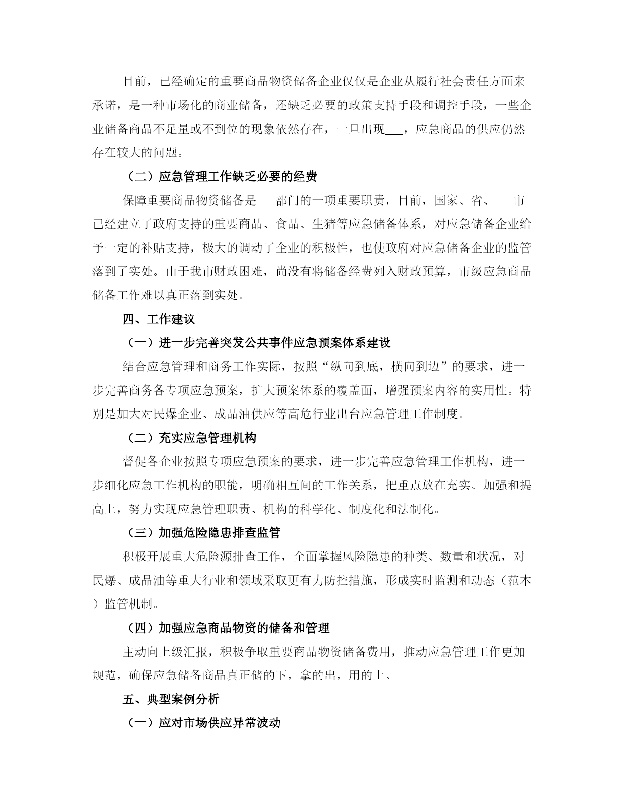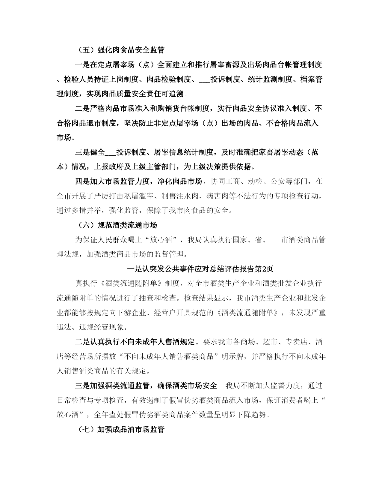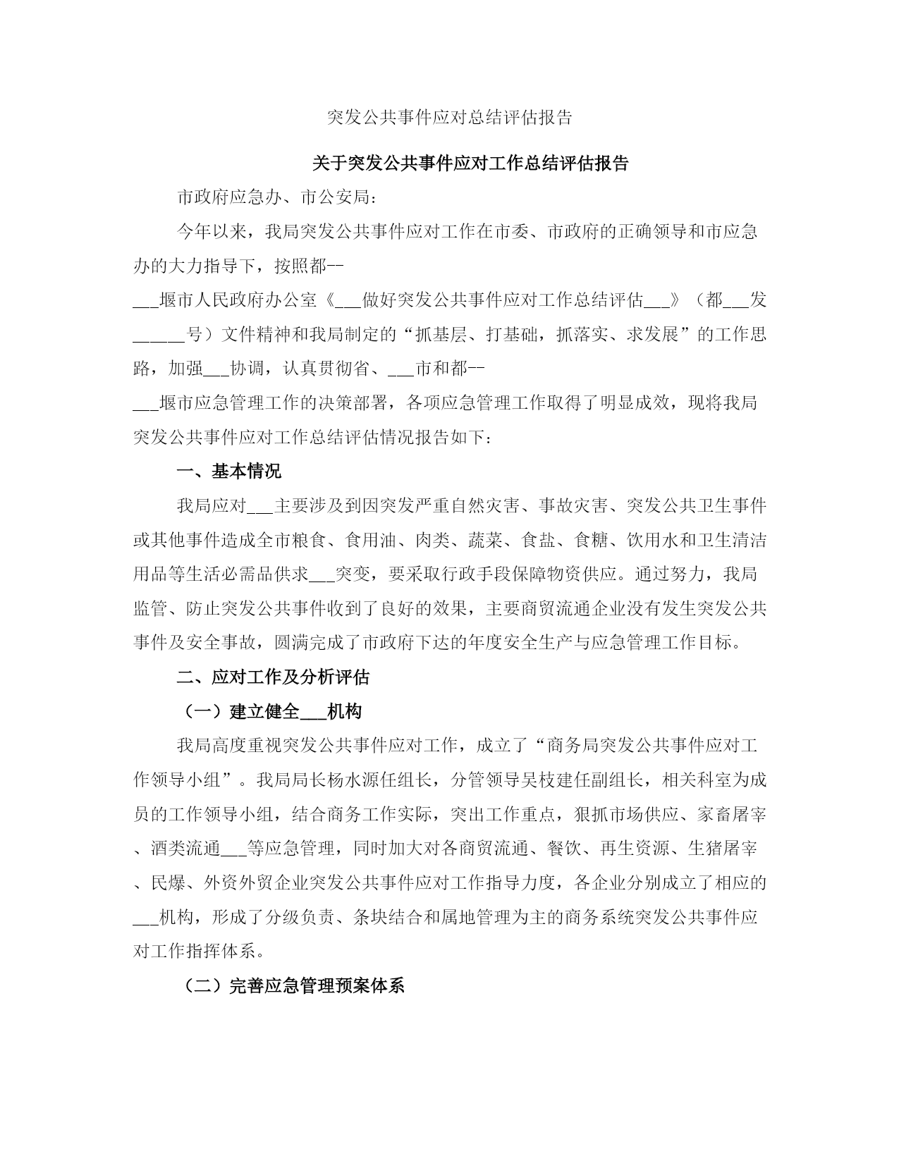 突发公共事件应对总结评估报告(完整版)文档资料可直接使用,可编辑,欢迎下载突发公共事件应对总结评估报告关于突发公共事件应对工作总结评估报告市政府应急办、市公安局:今年以来,我局突发公共事件应对工作在市委、市政府的正确领导和市应急办的大力指导下,按照都--___堰市人民政府办公室《___做好突发公共事件应对工作总结评估___》(都___发______号)文件精神和我局制定的“抓基层、打基础,抓落实、求发展”的工作思路,加强___协调,认真贯彻省、___市和都--___堰市应急管理工作的决策部署,各项应急管理工作取得了明显成效,现将我局突发公共事件应对工作总结评估情况报告如下:一、基本情况我局应对___主要涉及到因突发严重自然灾害、事故灾害、突发公共卫生事件或其他事件造成全市粮食、食用油、肉类、蔬菜、食盐、食糖、饮用水和卫生清洁用品等生活必需品供求___突变,要采取行政手段保障物资供应。通过努力,我局监管、防止突发公共事件收到了良好的效果,主要商贸流通企业没有发生突发公共事件及安全事故,圆满完成了市政府下达的年度安全生产与应急管理工作目标。二、应对工作及分析评估(一)建立健全___机构我局高度重视突发公共事件应对工作,成立了“商务局突发公共事件应对工作领导小组”。我局局长杨水源任组长,分管领导吴枝建任副组长,相关科室为成员的工作领导小组,结合商务工作实际,突出工作重点,狠抓市场供应、家畜屠宰、酒类流通___等应急管理,同时加大对各商贸流通、餐饮、再生资源、生猪屠宰、民爆、外资外贸企业突发公共事件应对工作指导力度,各企业分别成立了相应的___机构,形成了分级负责、条块结合和属地管理为主的商务系统突发公共事件应对工作指挥体系。(二)完善应急管理预案体系我局把强化应急预案体系建设作为抓好应急工作的基础,认真研究各类商务领域突发公共事件的发生和发展规律,加强调研,广泛征求意见,及时编制了商务局《突发社会安全事件应急预案》、《安全生产事故灾难应急预案》、《物资储备应急预案》、《自然灾害救助应急预案》、《生活必需品市场供应___应急预案》、《民用爆炸物品事故灾难应急预案》和《商务局应急管理制度》。这些应急预案从预警报告、应急启动、保障措施等方面做了详尽的规定,责任到人,程序清晰,为开展应急管理工作奠定了基础。(三)加强市场信息监测我局先后确定由予乐市场、荷花池市场、家美福超市、嘉诚购物、城市购物、郡守府等___余户重点企业为商务信息直报点,重点监测面粉、大米、食用油、肉类、蔬菜等重要生活必需品的库存数量、销售形势和价格走势等,定期上报市场商品供求监测统计数据,及时将重要商品销售流通分析材料上报政府及有关部门,为政府决策提供可靠的依据,这些措施为确保市场供应异常波动情况下保障市场供应创造了条件。(四)切实做好应急物资保障为切实保障___应急物资供应,结合商务工作特点,依据相关应急预案,进一步完善相关配套措施,加强市场监测。编制了《都--___堰市物资储备应急预案》和《都--___堰市生活必需品市场供应___应急预案》,确定由都--___堰市家美福超市、嘉诚购物中心、城市购物超市作为市级代储企业,由老邻居___家、红旗连锁___家、互惠超市___家、春熙商业___家、家美福超市___家,共计___家直营、加盟店作为乡镇级物资储备点。我市拟储备的救灾应急物资包括:速食食品(方便面、饼干、面包)、饮用水(纯净水、矿泉水)、日用品(卫生纸、毛巾、纸杯)、救灾用燃油(93汽油、0柴油)、其它物资(发电机、彩条布、应急照明灯、安全帽、电池、雨衣)等价值___余万元的救灾(应急)物资储备。积极协调生猪养殖规模企业、重点生猪屠宰企业建立市级猪肉应急储备基地,目前,已确定辉润屠宰、祥瑞肉类加工、新鑫生猪屠宰、兴旺家畜屠宰、真诚屠宰、忠祥屠宰、卉景公司___家规模屠宰加工企业为猪肉供应应急储备企业。(五)强化肉食品安全监管一是在定点屠宰场(点)全面建立和推行屠宰畜源及出场肉品台帐管理制度、检验人员持证上岗制度、肉品检验制度、___投诉制度、统计监测制度、档案管理制度,实现肉品质量安全责任可追溯。二是严格肉品市场准入和购销货台帐制度,实行肉品安全协议准入制度、不合格肉品退市制度,坚决防止非定点屠宰场(点)出场的肉品、不合格肉品流入市场。三是健全___投诉制度、屠宰信息统计制度,及时准确把家畜屠宰动态(范本)情况,上报政府及上级主管部门,为上级决策提供依据。四是加大市场监管力度,净化肉品市场。协同工商、动检、公安等部门,在全市开展了严厉打击私屠滥宰、制售注水肉、病害肉等不法行为的专项检查行动,通过多措并举,强化监管,保障了我市肉食品的安全。(六)规范酒类流通市场为保证人民群众喝上“放心酒”,我局认真执行国家、省、___市
