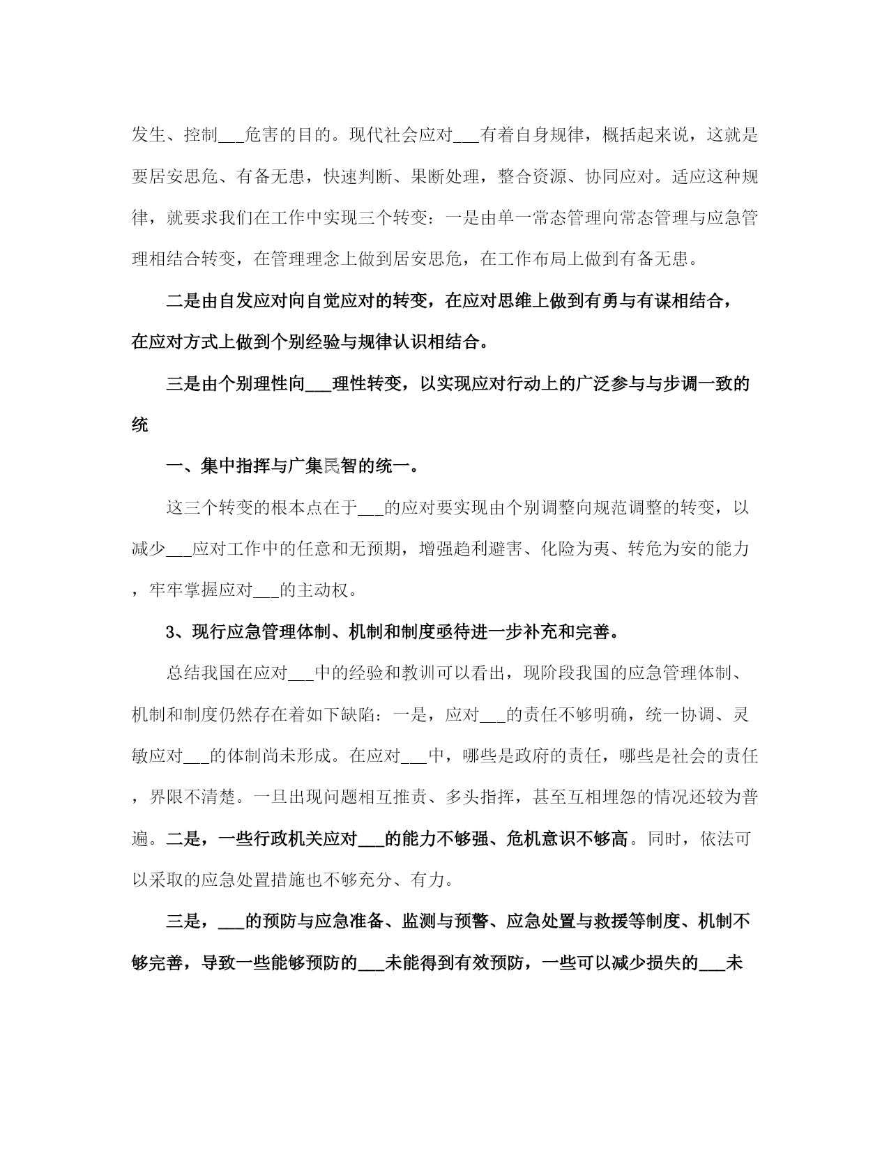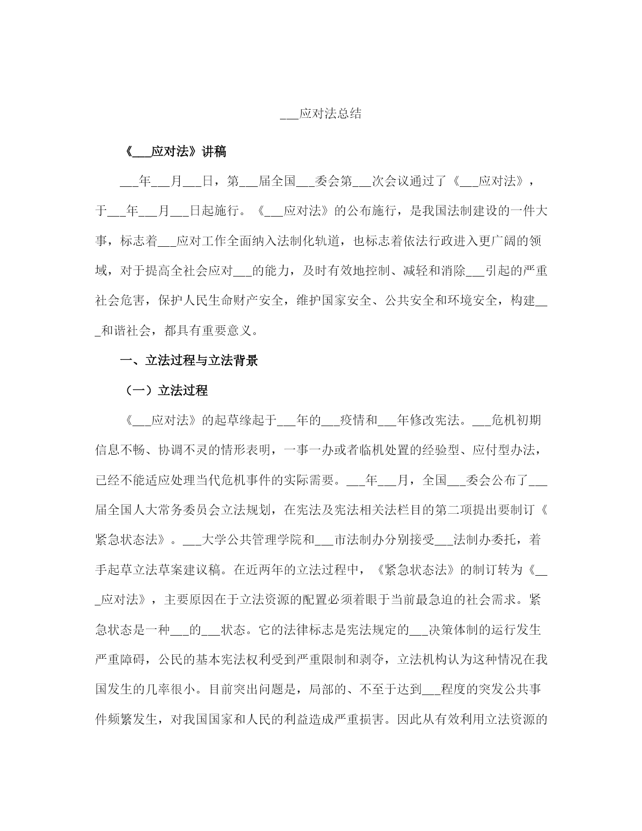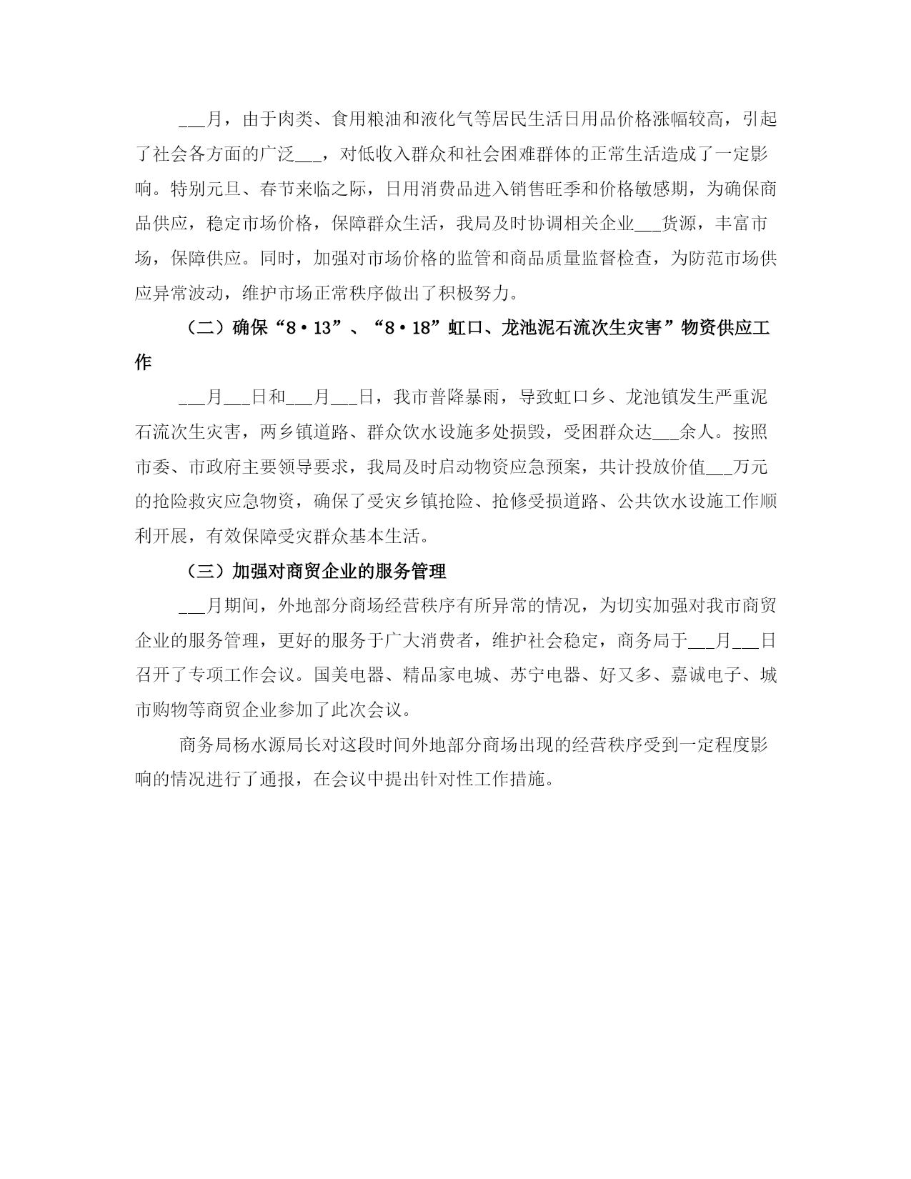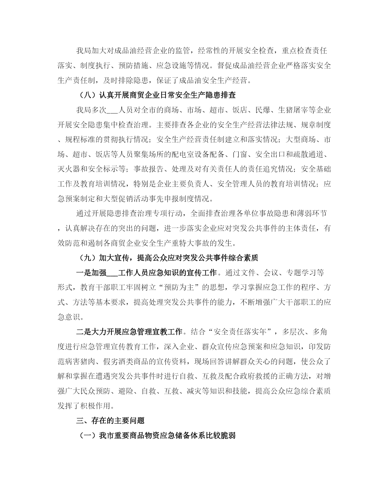 突发公共事件应对总结评估报告(完整版)文档资料可直接使用,可编辑,欢迎下载突发公共事件应对总结评估报告关于突发公共事件应对工作总结评估报告市政府应急办、市公安局:今年以来,我局突发公共事件应对工作在市委、市政府的正确领导和市应急办的大力指导下,按照都--___堰市人民政府办公室《___做好突发公共事件应对工作总结评估___》(都___发______号)文件精神和我局制定的“抓基层、打基础,抓落实、求发展”的工作思路,加强___协调,认真贯彻省、___市和都--___堰市应急管理工作的决策部署,各项应急管理工作取得了明显成效,现将我局突发公共事件应对工作总结评估情况报告如下:一、基本情况我局应对___主要涉及到因突发严重自然灾害、事故灾害、突发公共卫生事件或其他事件造成全市粮食、食用油、肉类、蔬菜、食盐、食糖、饮用水和卫生清洁用品等生活必需品供求___突变,要采取行政手段保障物资供应。通过努力,我局监管、防止突发公共事件收到了良好的效果,主要商贸流通企业没有发生突发公共事件及安全事故,圆满完成了市政府下达的年度安全生产与应急管理工作目标。二、应对工作及分析评估(一)建立健全___机构我局高度重视突发公共事件应对工作,成立了“商务局突发公共事件应对工作领导小组”。我局局长杨水源任组长,分管领导吴枝建任副组长,相关科室为成员的工作领导小组,结合商务工作实际,突出工作重点,狠抓市场供应、家畜屠宰、酒类流通___等应急管理,同时加大对各商贸流通、餐饮、再生资源、生猪屠宰、民爆、外资外贸企业突发公共事件应对工作指导力度,各企业分别成立了相应的___机构,形成了分级负责、条块结合和属地管理为主的商务系统突发公共事件应对工作指挥体系。(二)完善应急管理预案体系我局把强化应急预案体系建设作为抓好应急工作的基础,认真研究各类商务领域突发公共事件的发生和发展规律,加强调研,广泛征求意见,及时编制了商务局《突发社会安全事件应急预案》、《安全生产事故灾难应急预案》、《物资储备应急预案》、《自然灾害救助应急预案》、《生活必需品市场供应___应急预案》、《民用爆炸物品事故灾难应急预案》和《商务局应急管理制度》。这些应急预案从预警报告、应急启动、保障措施等方面做了详尽的规定,责任到人,程序清晰,为开展应急管理工作奠定了基础。(三)加强市场信息监测我局先后确定由予乐市场、荷花池市场、家美福超市、嘉诚购物、城市购物、郡守府等___余户重点企业为商务信息直报点,重点监测面粉、大米、食用油、肉类、蔬菜等重要生活必需品的库存数量、销售形势和价格走势等,定期上报市场商品供求监测统计数据,及时将重要商品销售流通分析材料上报政府及有关部门,为政府决策提供可靠的依据,这些措施为确保市场供应异常波动情况下保障市场供应创造了条件。(四)切实做好应急物资保障为切实保障___应急物资供应,结合商务工作特点,依据相关应急预案,进一步完善相关配套措施,加强市场监测。编制了《都--___堰市物资储备应急预案》和《都--___堰市生活必需品市场供应___应急预案》,确定由都--___堰市家美福超市、嘉诚购物中心、城市购物超市作为市级代储企业,由老邻居___家、红旗连锁___家、互惠超市___家、春熙商业___家、家美福超市___家,共计___家直营、加盟店作为乡镇级物资储备点。我市拟储备的救灾应急物资包括:速食食品(方便面、饼干、面包)、饮用水(纯净水、矿泉水)、日用品(卫生纸、毛巾、纸杯)、救灾用燃油(93汽油、0柴油)、其它物资(发电机、彩条布、应急照明灯、安全帽、电池、雨衣)等价值___余万元的救灾(应急)物资储备。积极协调生猪养殖规模企业、重点生猪屠宰企业建立市级猪肉应急储备基地,目前,已确定辉润屠宰、祥瑞肉类加工、新鑫生猪屠宰、兴旺家畜屠宰、真诚屠宰、忠祥屠宰、卉景公司___家规模屠宰加工企业为猪肉供应应急储备企业。(五)强化肉食品安全监管一是在定点屠宰场(点)全面建立和推行屠宰畜源及出场肉品台帐管理制度、检验人员持证上岗制度、肉品检验制度、___投诉制度、统计监测制度、档案管理制度,实现肉品质量安全责任可追溯。二是严格肉品市场准入和购销货台帐制度,实行肉品安全协议准入制度、不合格肉品退市制度,坚决防止非定点屠宰场(点)出场的肉品、不合格肉品流入市场。三是健全___投诉制度、屠宰信息统计制度,及时准确把家畜屠宰动态(范本)情况,上报政府及上级主管部门,为上级决策提供依据。四是加大市场监管力度,净化肉品市场。协同工商、动检、公安等部门,在全市开展了严厉打击私屠滥宰、制售注水肉、病害肉等不法行为的专项检查行动,通过多措并举,强化监管,保障了我市肉食品的安全。(六)规范酒类流通市场为保证人民群众喝上“放心酒”,我局认真执行国家、省、___市