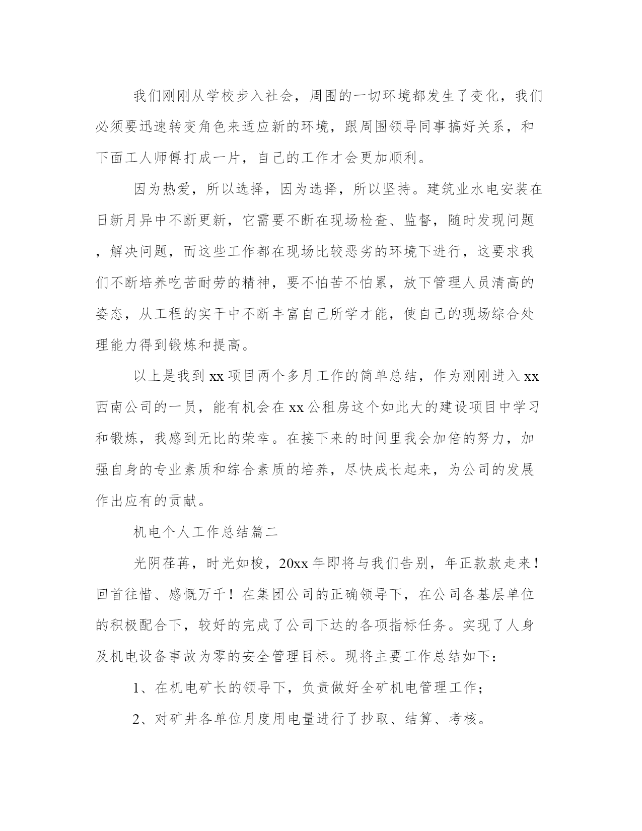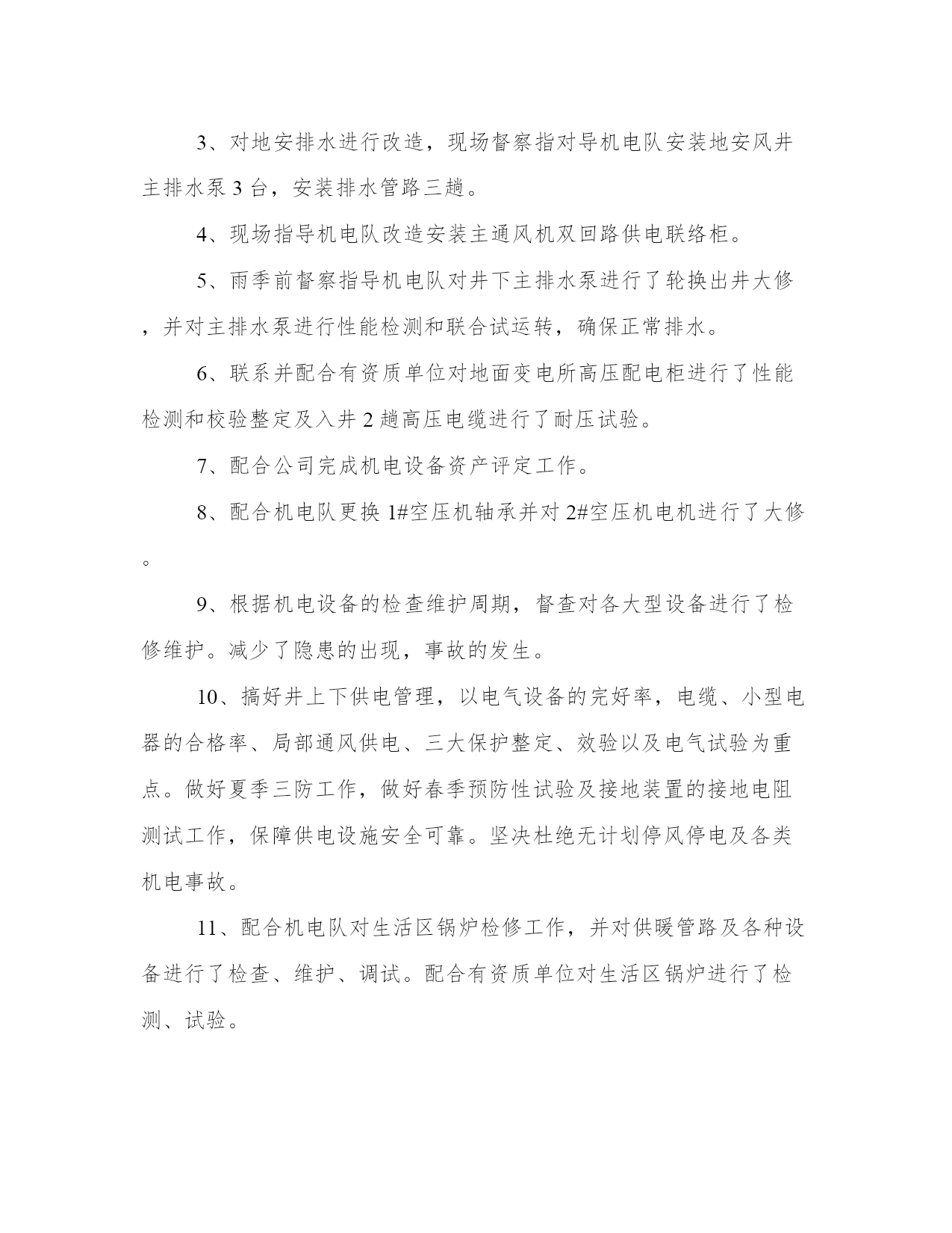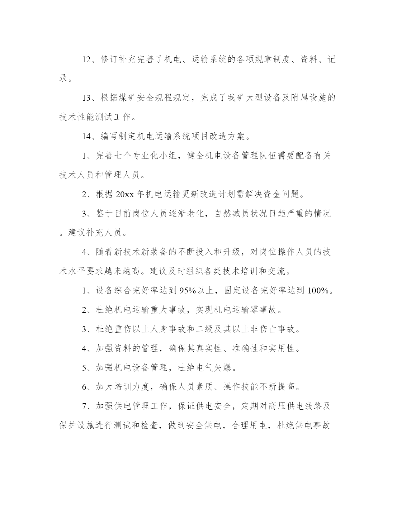 最新机电个人工作总结(精选18篇)总结是对某种工作实施结果的总鉴定和总结论,是对以往工作实践的一种理性认识。那么我们该如何写一篇较为完美的总结呢?以下我给大家整理了一些优质的总结范文,希望对大家能够有所帮助。机电个人工作总结篇一6月,既是大学生活的结束,又是憧憬美好未来的开始,来到xx西南公司,开始了我的第一份工作。经过几天短暂的培训,让我对公司的文化理念、公司的历史以及公司今后的发展方向有了更深入的认识。被分配到项目机电部,让我也渐渐明确了自己目前所处的位置,以及今后所要发展的方向。来到xx项目机电部已经四个多月了,回想这四个月的工作,主要有两个方面的感想,一是工作环境和领导的关怀,二是实践工作中对的自己考验。来到项目后我发现这是一个年轻化、纪律严明、管理有序、学习氛围及其浓厚的项目部。初来机电部报到的那天,机电部xx经理和我们新员工逐一交谈,那种促膝而谈的亲切,瞬间让我们仿佛成为了朋友,那种平易近人的口吻,也好似是一种师者的殷殷教导。我还清晰的记得她给我们勾画了这个行业的发展蓝图,让我对以后的工作有了更加具体的了解。建筑安装包括强弱电、给排水、消防、防雷基础接地、暖通等。很幸运的是,我来到这个工地的时候,差不多都还在做基础,所以可以从最防雷基础接地的学起,到最后能完整的经历一遍建筑安装工作,这对我来说,是受益匪浅的。现在各个楼栋都还在修主体,我们安装工作主要是防雷基础接地和线管和洞的预留预埋,这需要我们熟读图纸,和土建相互配合,共同完成。经过了一段时间的工作,让我感触最深的就是知识上的不足,当我在翻看图纸、查看图集时,才发现在大学所学的专业知识是多么微不足道,如何把理论知识与实践结合是我目前急需解决的问题。在施工现场的时候,很多前辈师傅也教会我们注意施工过程一些小的细节,在这个过程中受益匪浅,但我也知道还有许多的东西要去学习,在接下来的日子里,我要从以下的几个方面努力:一个人的成功与否,取决于一个人的态度。虽然我是刚刚毕业的大学生,但是在实际经验方面还有很多不足,要谦虚向他人请教,用积极乐观的思想去思考问题,时刻保持清醒的头脑。建筑安装工作涉及的知识面广,要学习的规范和图集也比较多,现场经验也很重要,要把两者结合起来,既要符合规范也要符合实际。此外,要学会摸索和总结,尤其是安装工作当中的线管预埋和隐蔽工程。在施工现场要多观察多学习,对于不理解的,及时做好记录,下来查证,争取工作越做越好。我们刚刚从学校步入社会,周围的一切环境都发生了变化,我们必须要迅速转变角色来适应新的环境,跟周围领导同事搞好关系,和下面工人师傅打成一片,自己的工作才会更加顺利。因为热爱,所以选择,因为选择,所以坚持。建筑业水电安装在日新月异中不断更新,它需要不断在现场检查、监督,随时发现问题,解决问题,而这些工作都在现场比较恶劣的环境下进行,这要求我们不断培养吃苦耐劳的精神,要不怕苦不怕累,放下管理人员清高的姿态,从工程的实干中不断丰富自己所学才能,使自己的现场综合处理能力得到锻炼和提高。以上是我到xx项目两个多月工作的简单总结,作为刚刚进入xx西南公司的一员,能有机会在xx公租房这个如此大的建设项目中学习和锻炼,我感到无比的荣幸。在接下来的时间里我会加倍的努力,加强自身的专业素质和综合素质的培养,尽快成长起来,为公司的发展作出应有的贡献。机电个人工作总结篇二光阴荏苒,时光如梭,20xx年即将与我们告别,年正款款走来!回首往惜、感慨万千!在集团公司的正确领导下,在公司各基层单位的积极配合下,较好的完成了公司下达的各项指标任务。实现了人身及机电设备事故为零的安全管理目标。现将主要工作总结如下:1、在机电矿长的领导下,负责做好全矿机电管理工作;2、对矿井各单位月度用电量进行了抄取、结算、考核。3、对地安排水进行改造,现场督察指对导机电队安装地安风井主排水泵3台,安装排水管路三趟。4、现场指导机电队改造安装主通风机双回路供电联络柜。5、雨季前督察指导机电队对井下主排水泵进行了轮换出井大修,并对主排水泵进行性能检测和联合试运转,确保正常排水。6、联系并配合有资质单位对地面变电所高压配电柜进行了性能检测和校验整定及入井2趟高压电缆进行了耐压试验。7、配合公司完成机电设备资产评定工作。8、配合机电队更换1#空压机轴承并对2#空压机电机进行了大修。9、根据机电设备的检查维护周期,督查对各大型设备进行了检修维护。减少了隐患的出现,事故的发生。10、搞好井上下供电管理,以电气设备的完好率,电缆、小型电器的合格率、局部通风供电、三大保护整定、效验以及电气试验为重点。做好夏季三防工作,做好春季预防性试验及接地装置的接地电阻测试工作,保障供电设施安全可靠。坚决杜绝无计划停风停电及各类机电事故。11、配合机电队对生活区锅炉检修工作